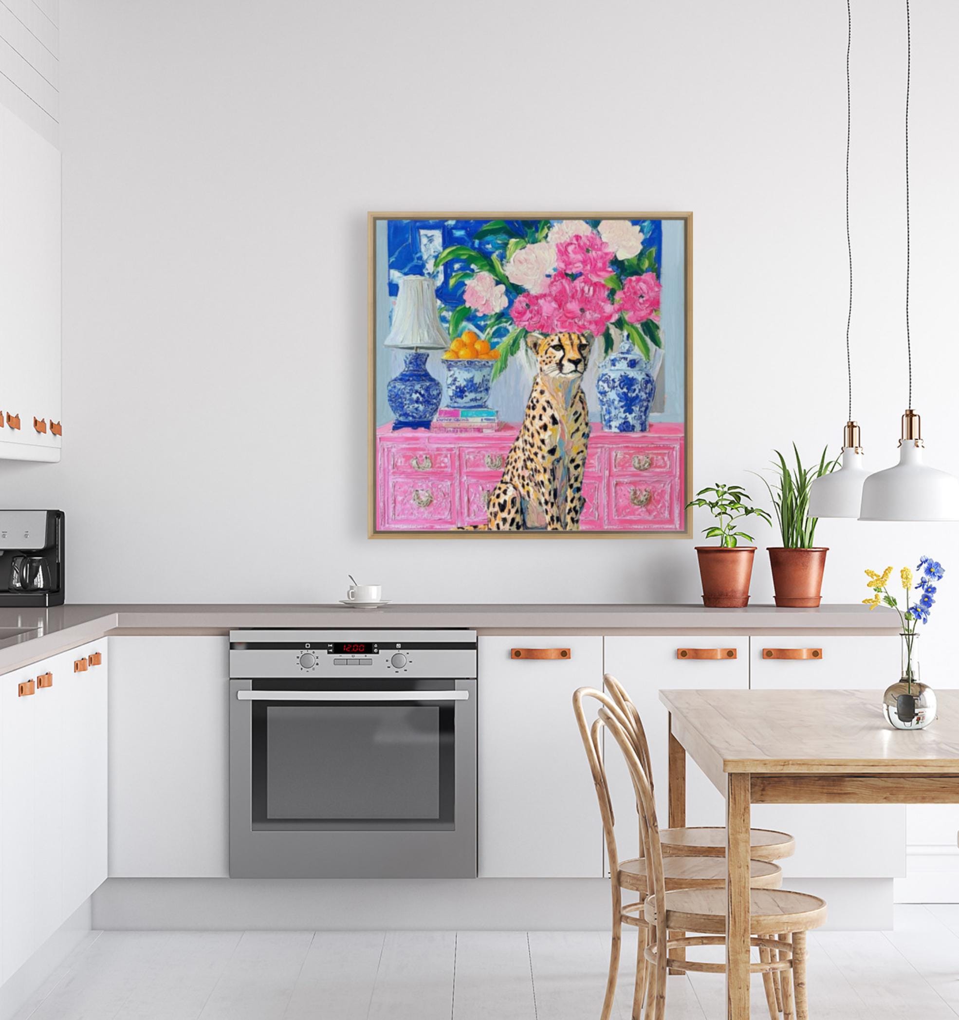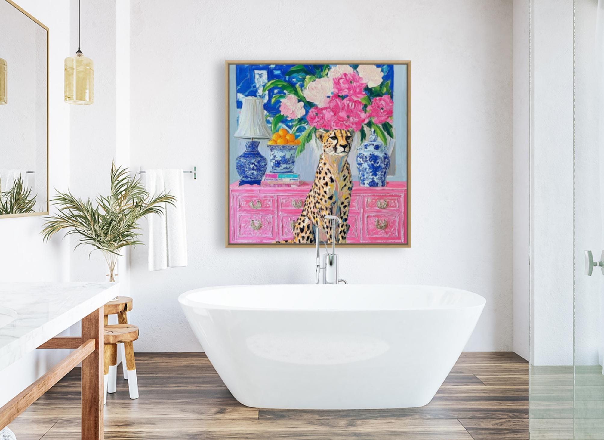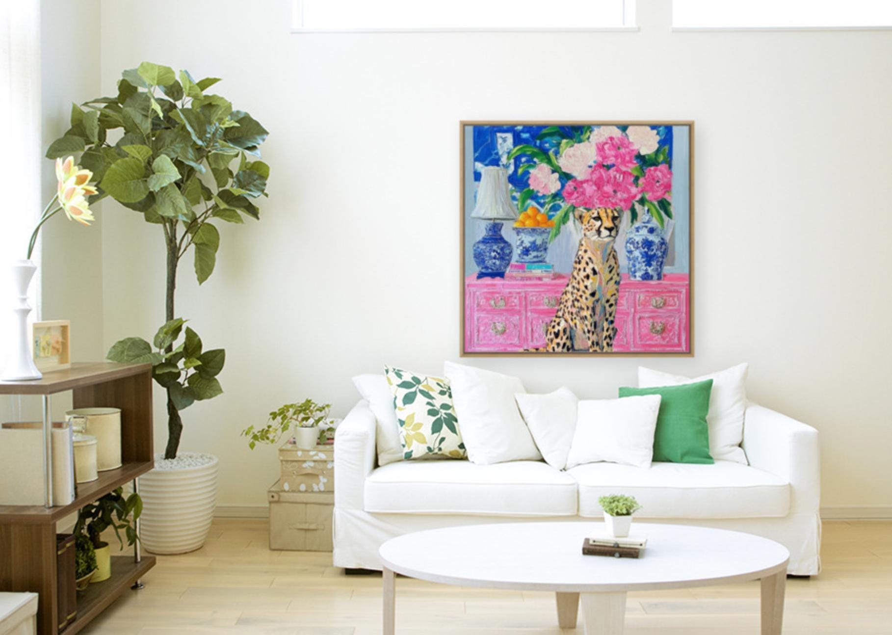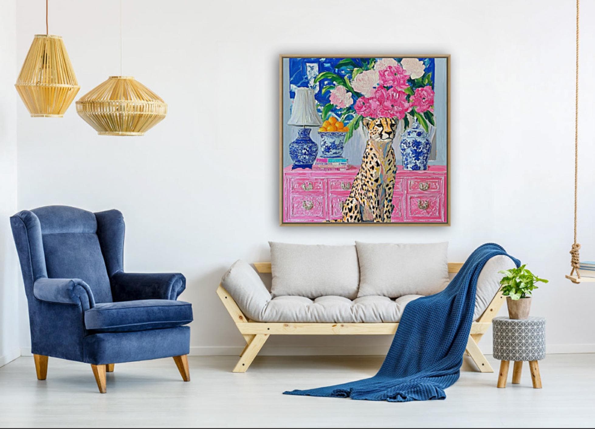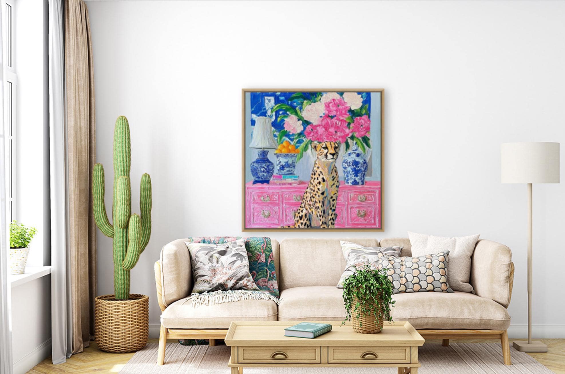 Grandmillennial art, Cheetah in preppy pink interior with ginger jars