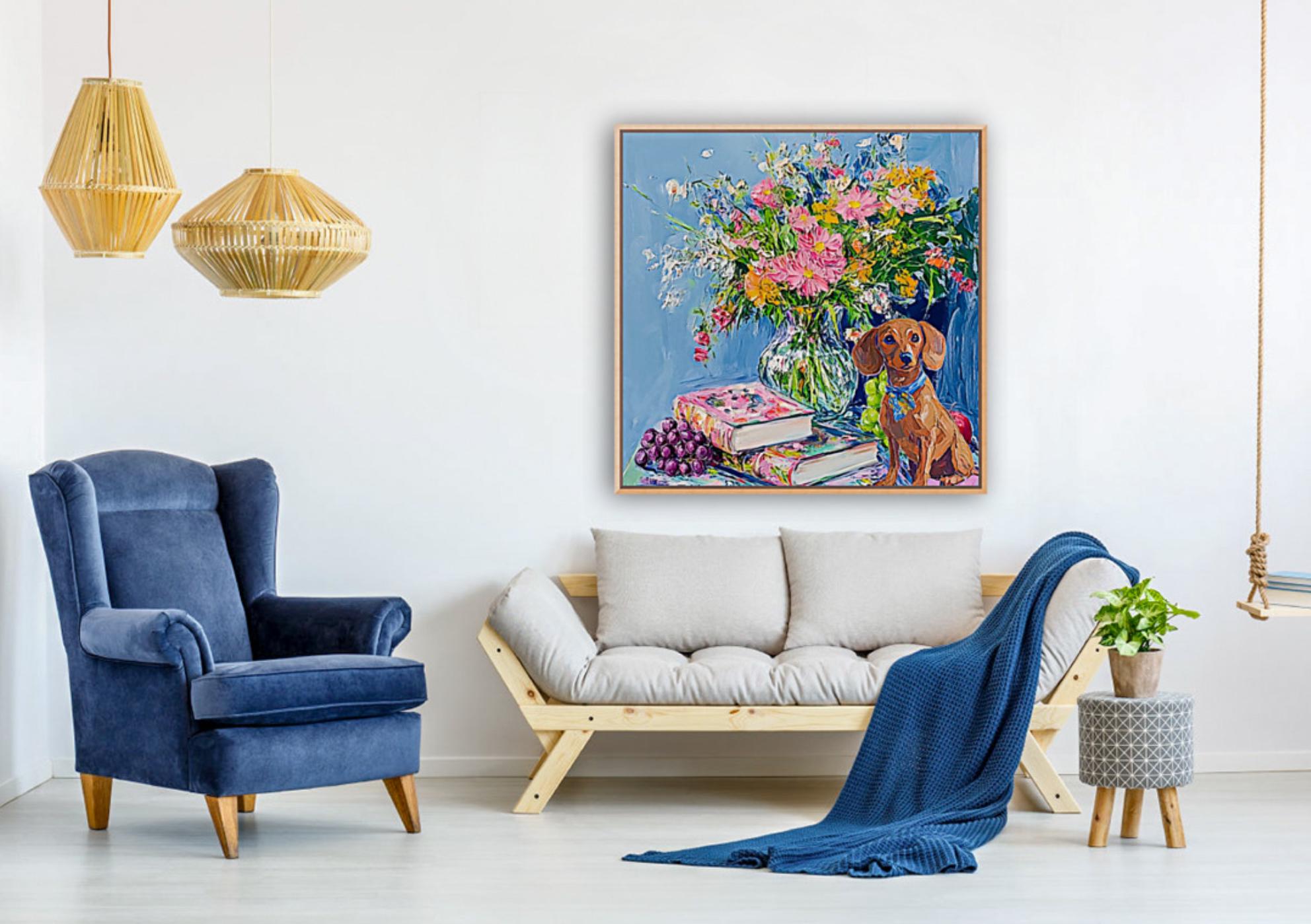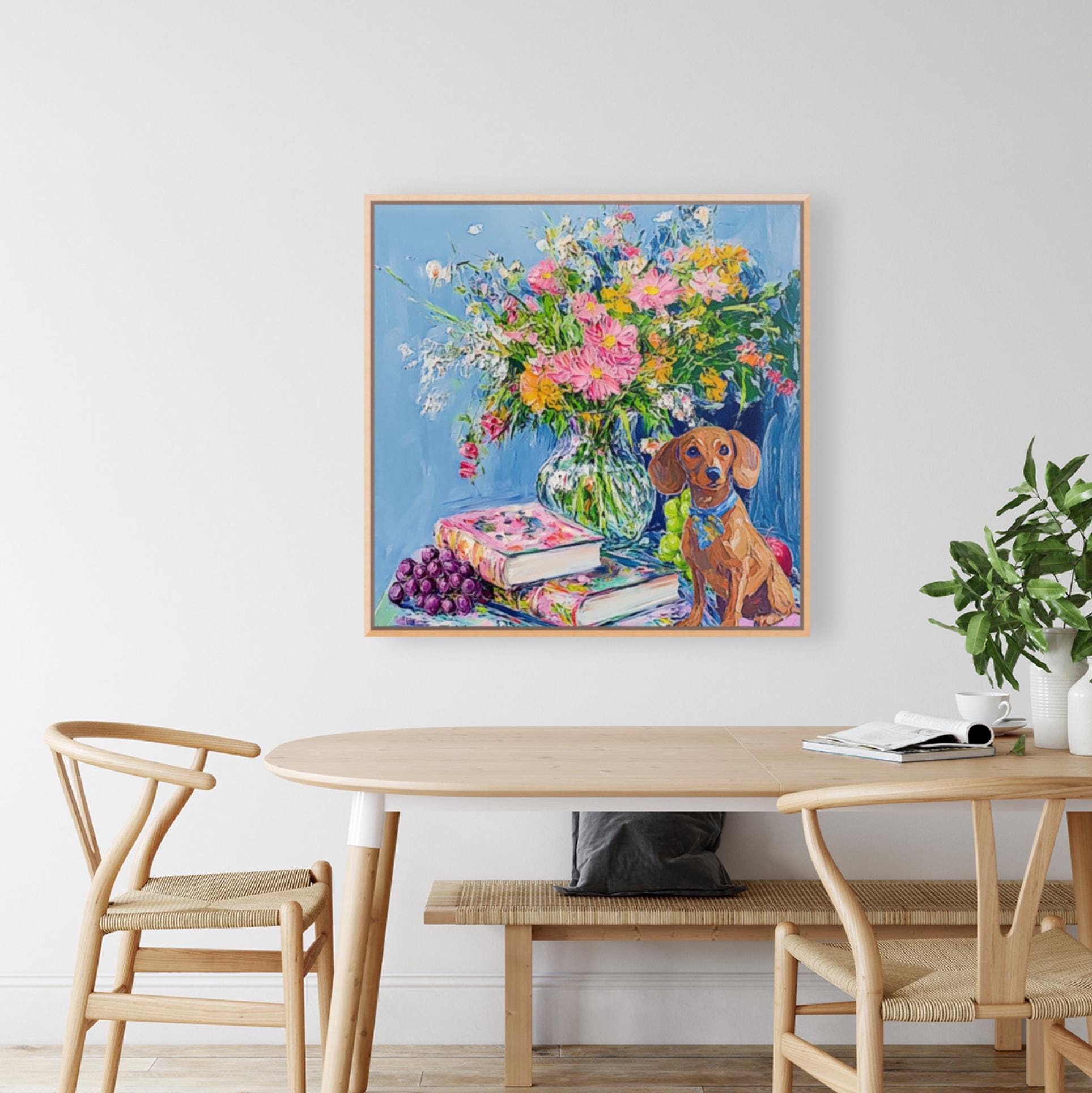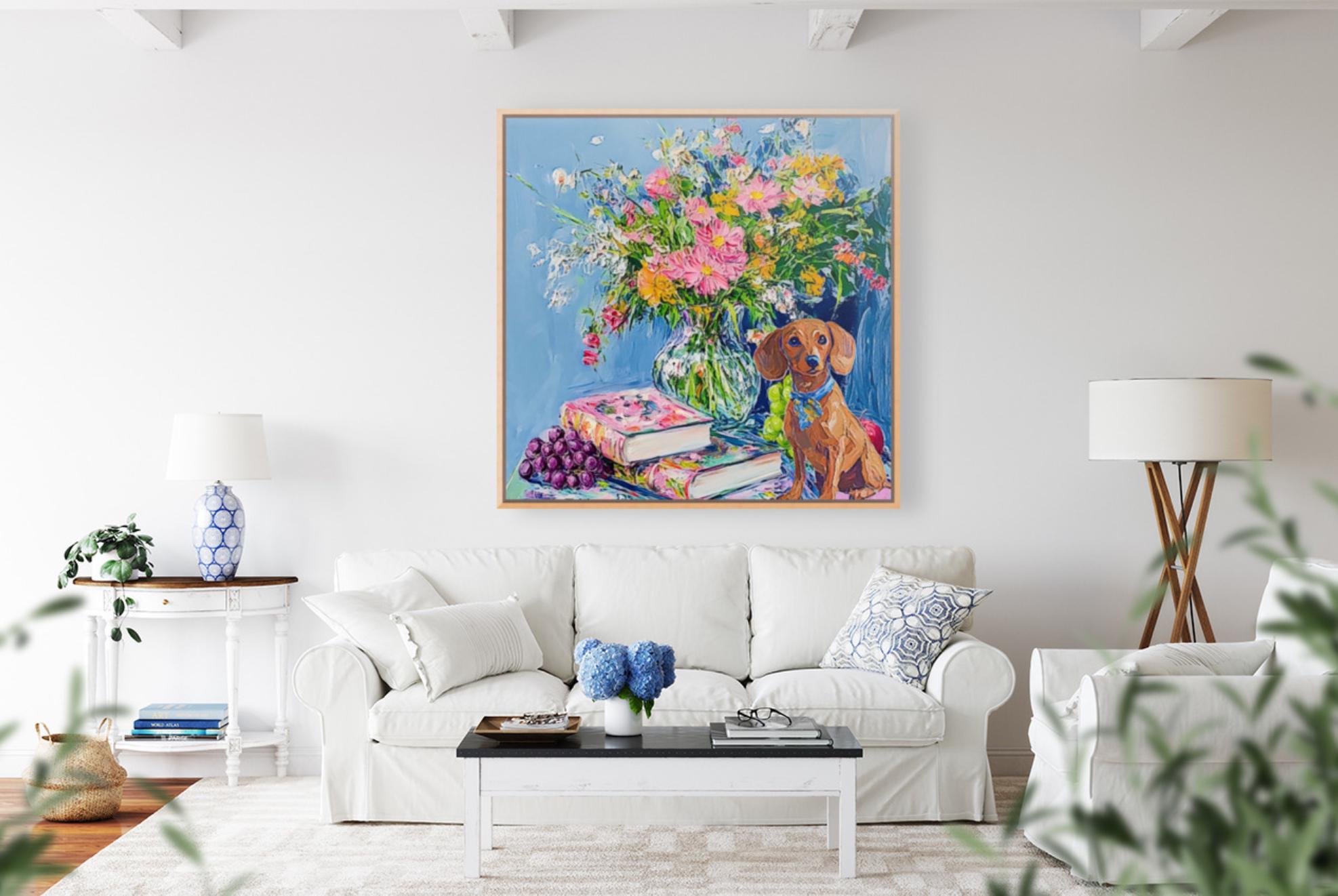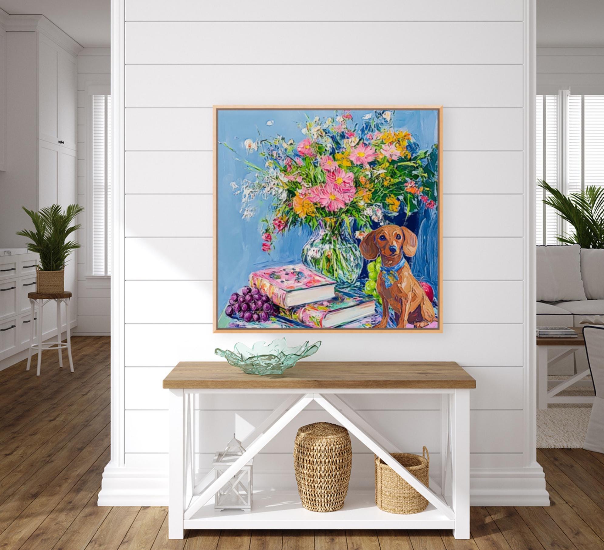 Grandmillennial art, Dachshund dog in preppy interior with wild flowers