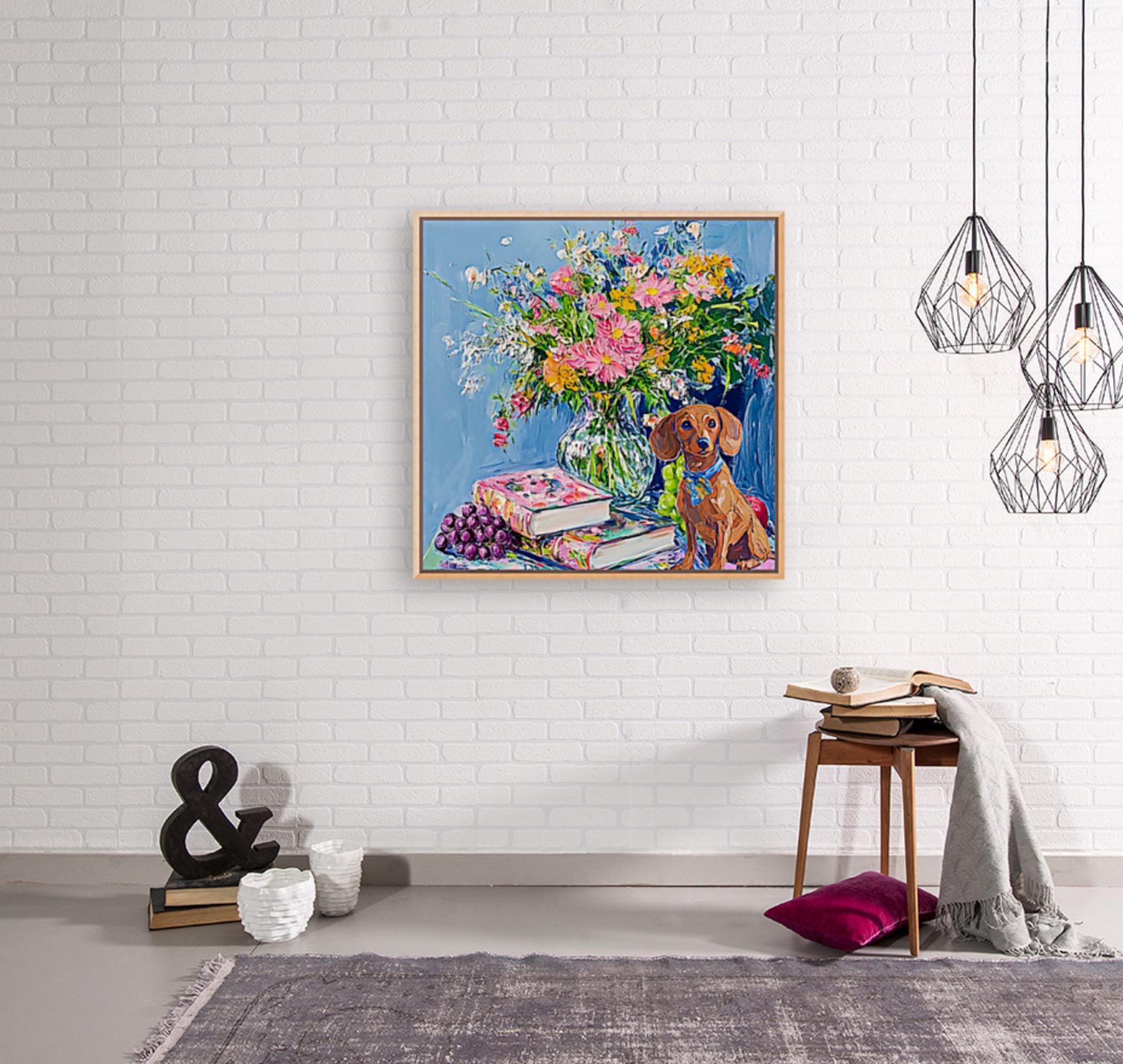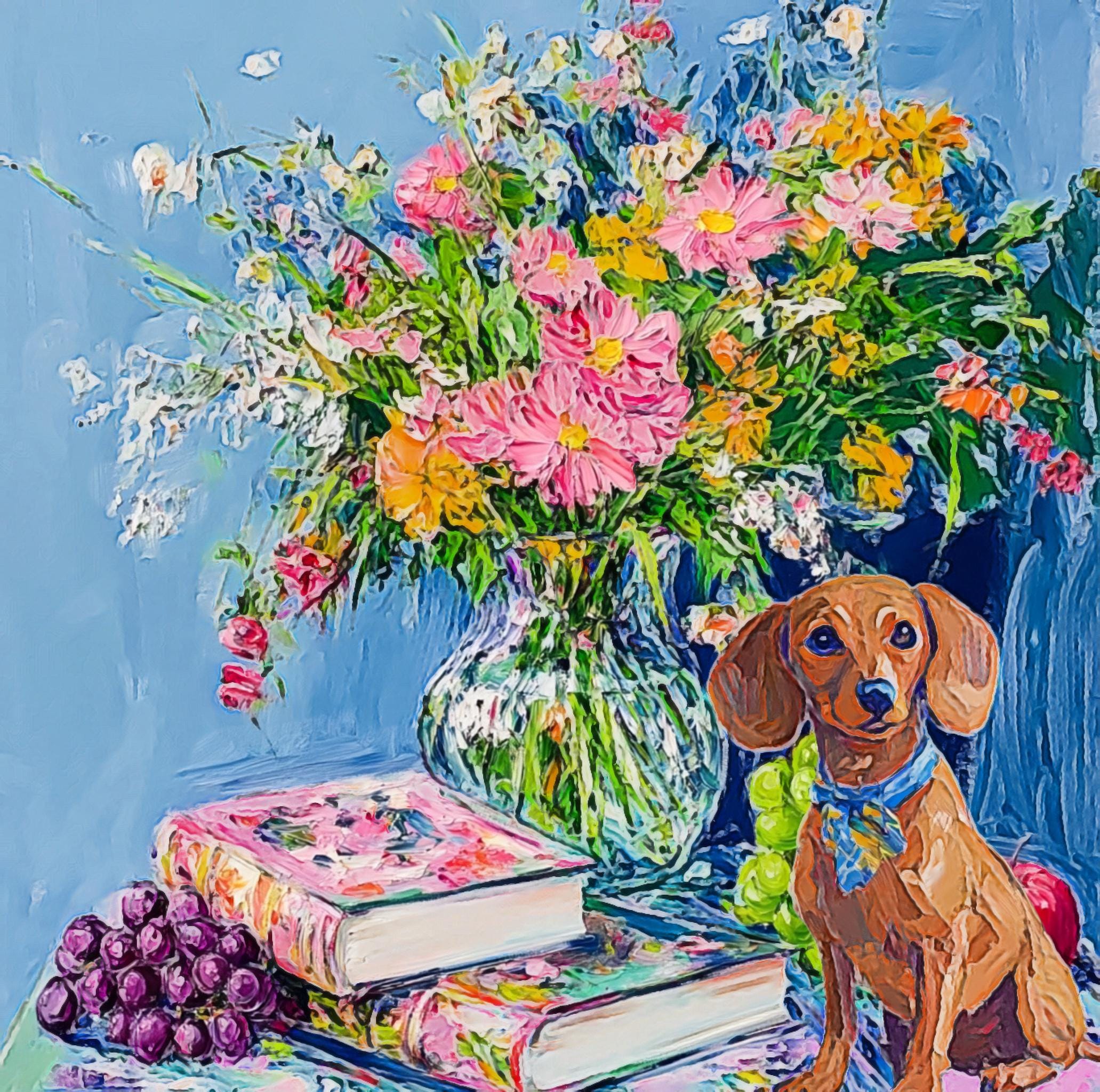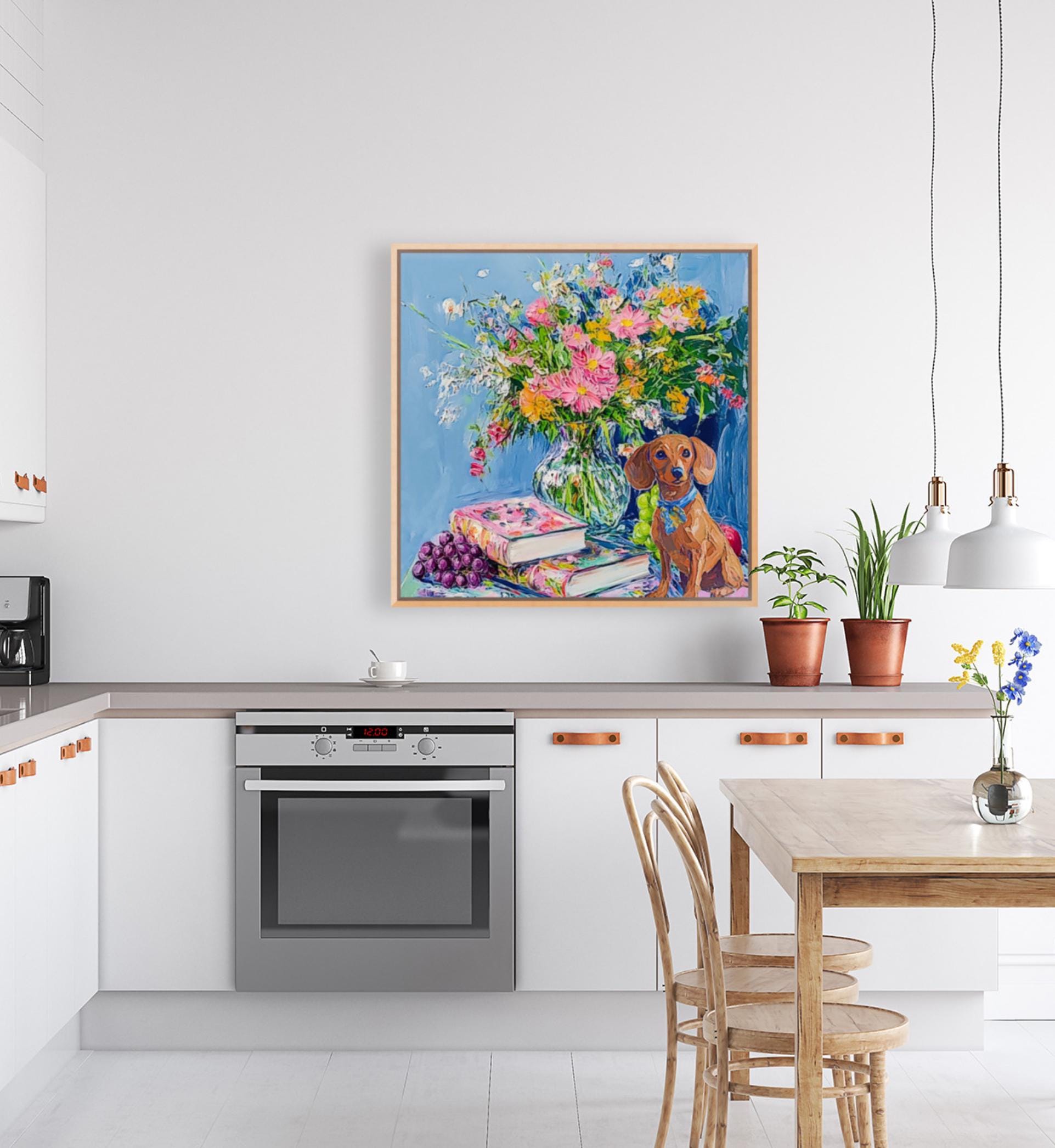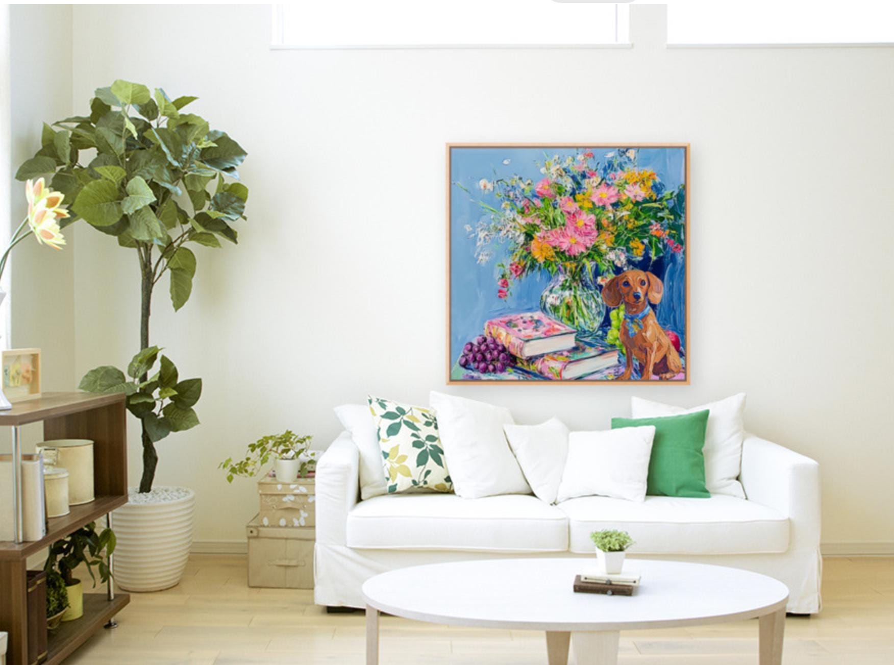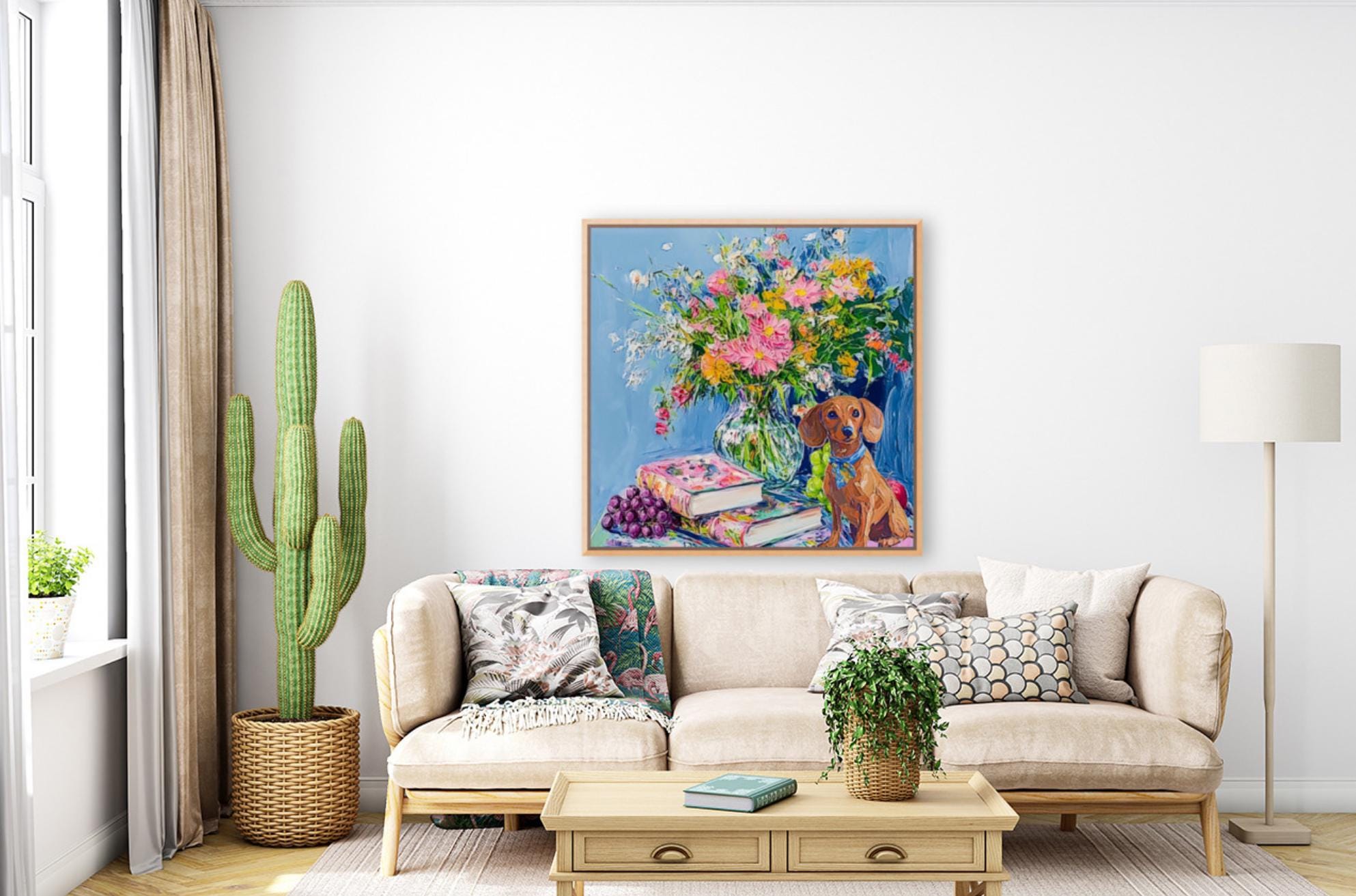 Grandmillennial art, Dachshund dog in preppy interior with wild flowers