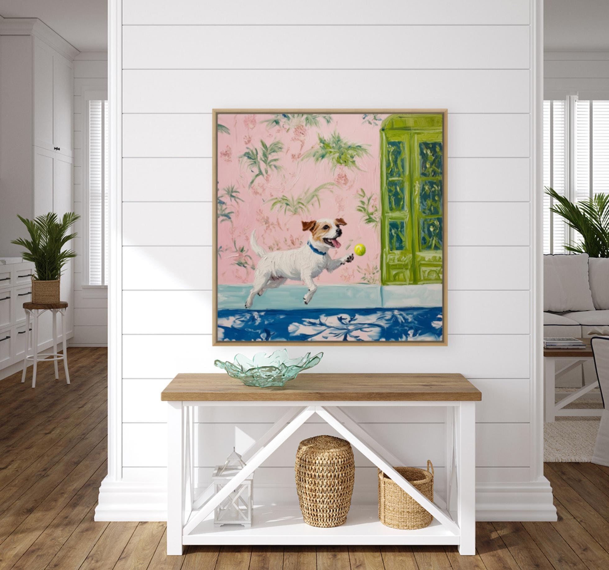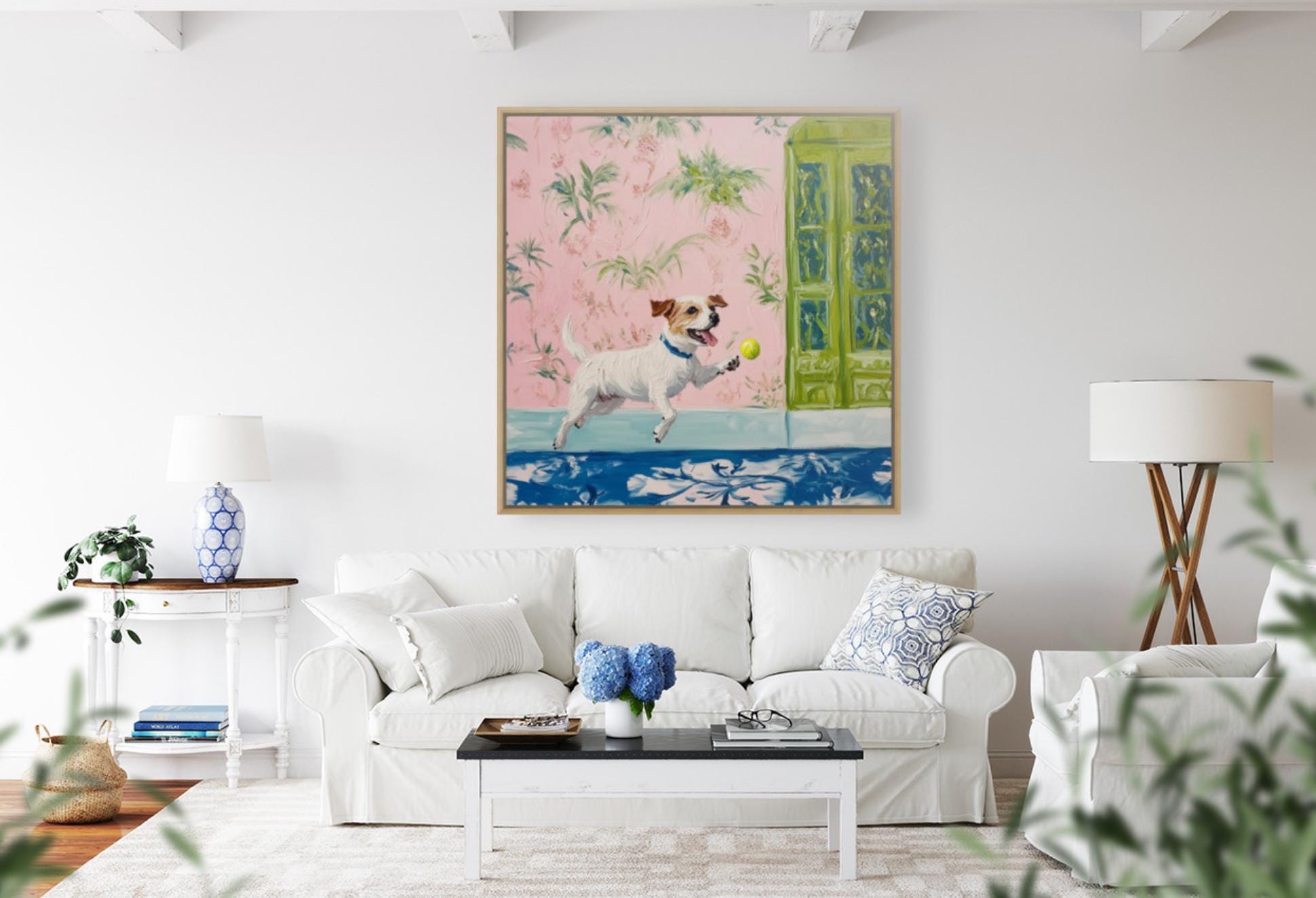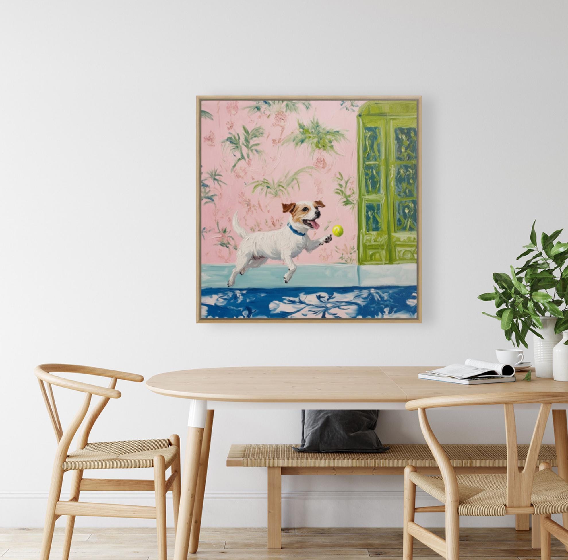 Grandmillennial art, Jack Russell chasing tennis ball in chinoiserie interior, oil painting