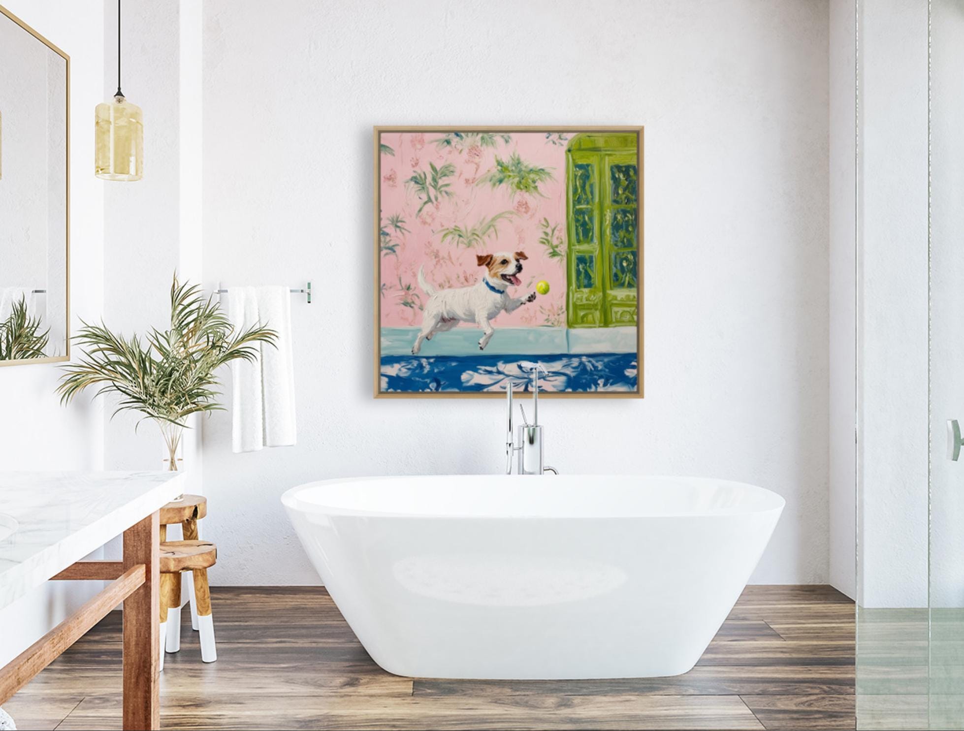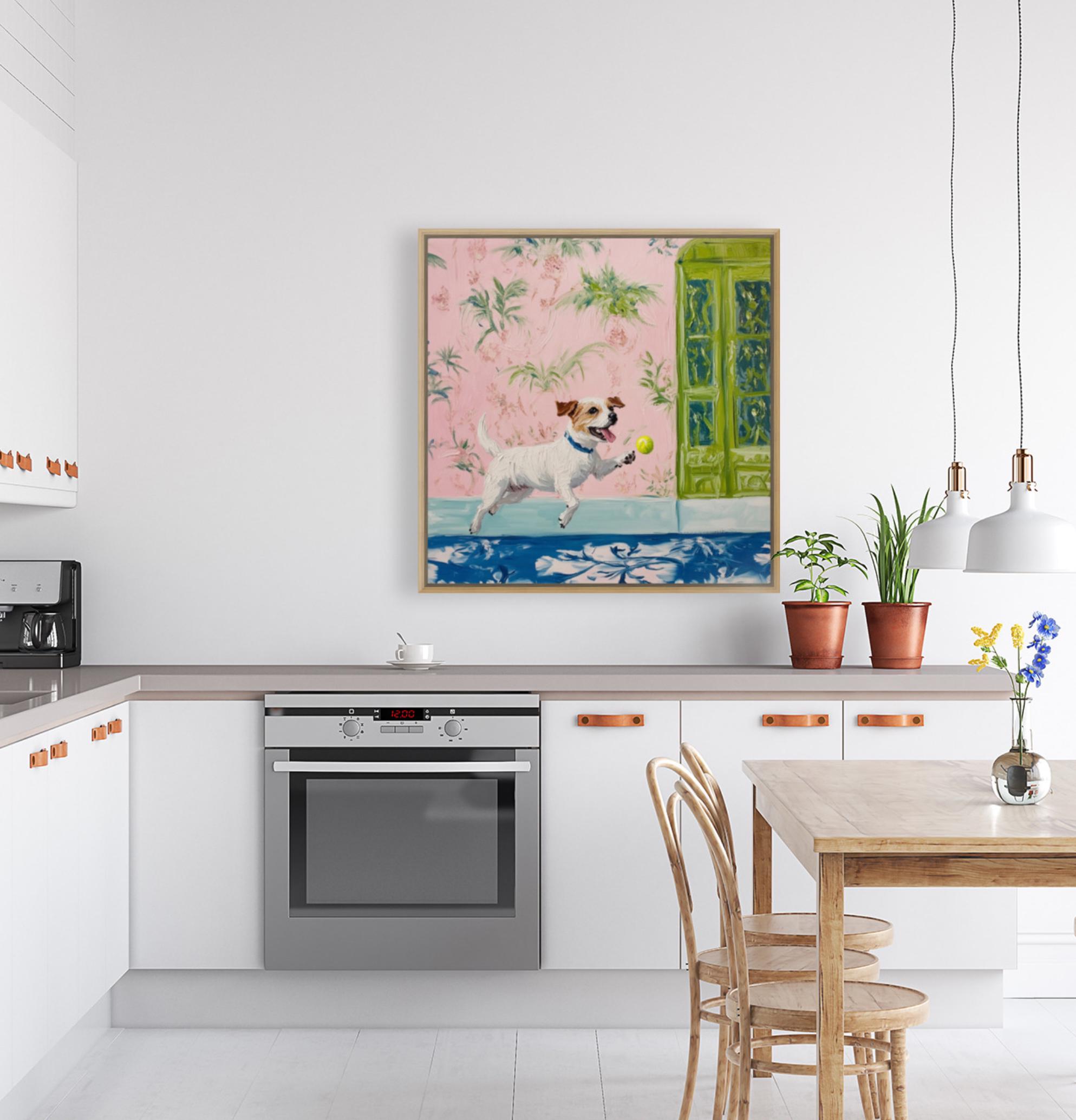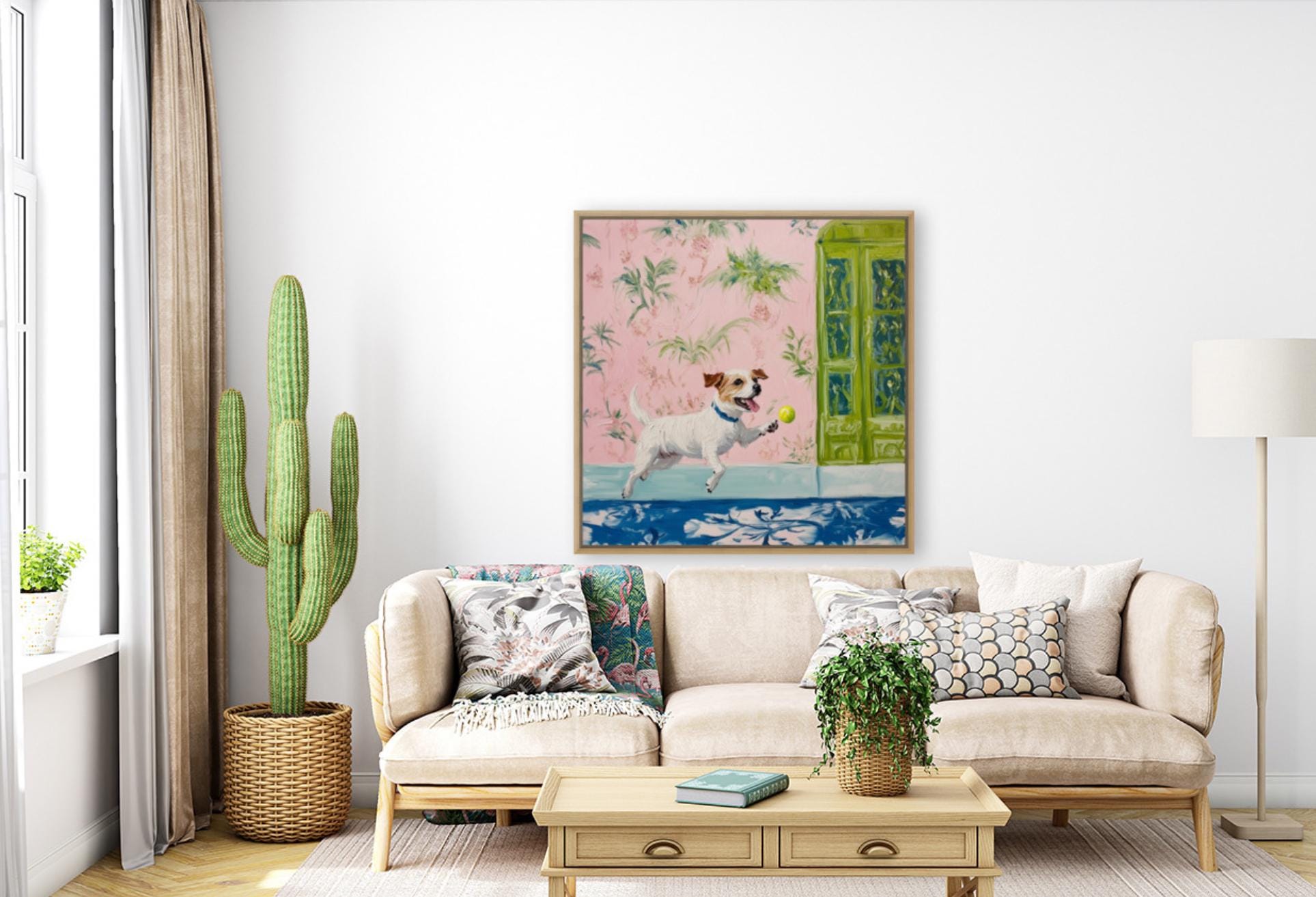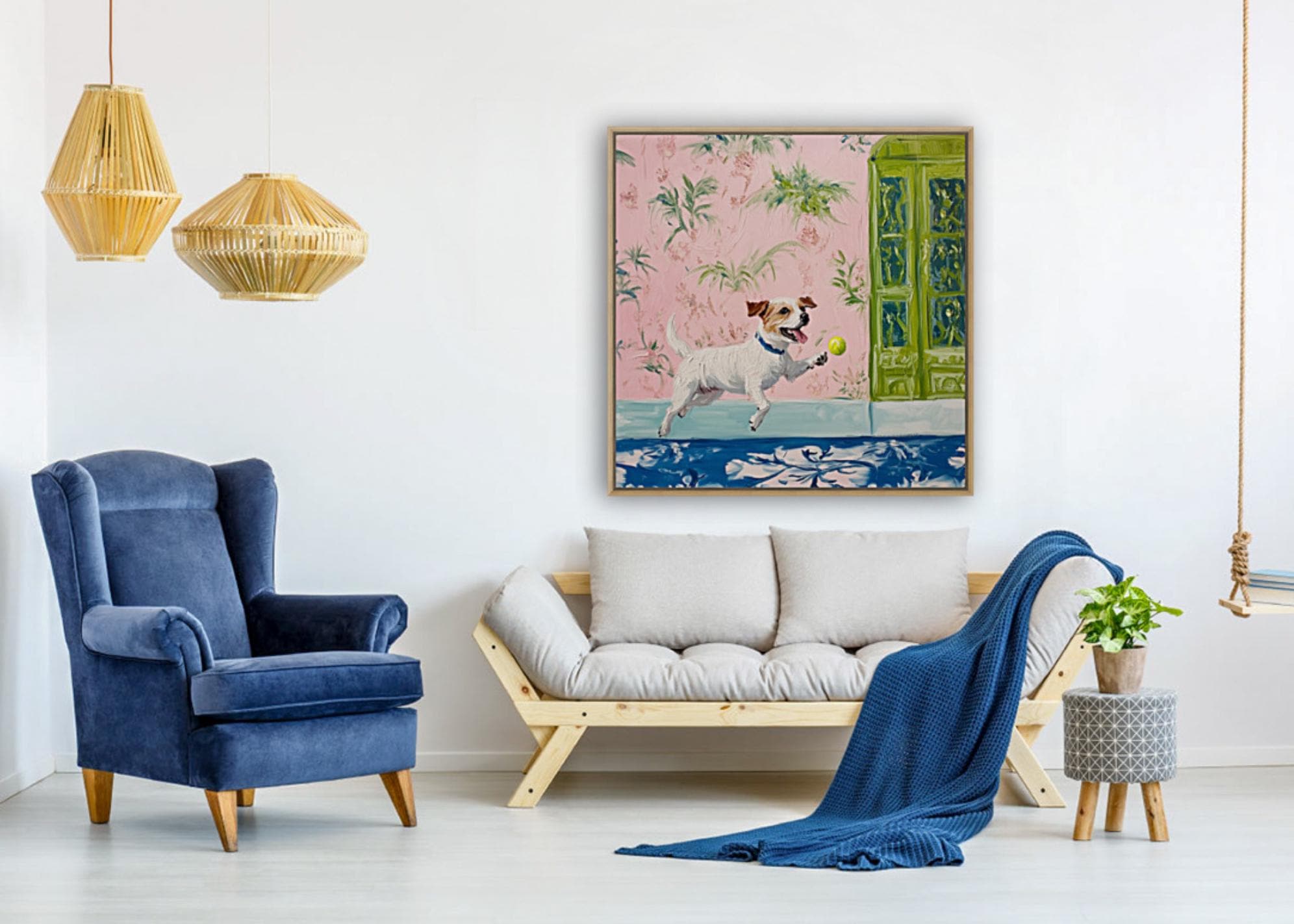 Grandmillennial art, Jack Russell chasing tennis ball in chinoiserie interior, oil painting