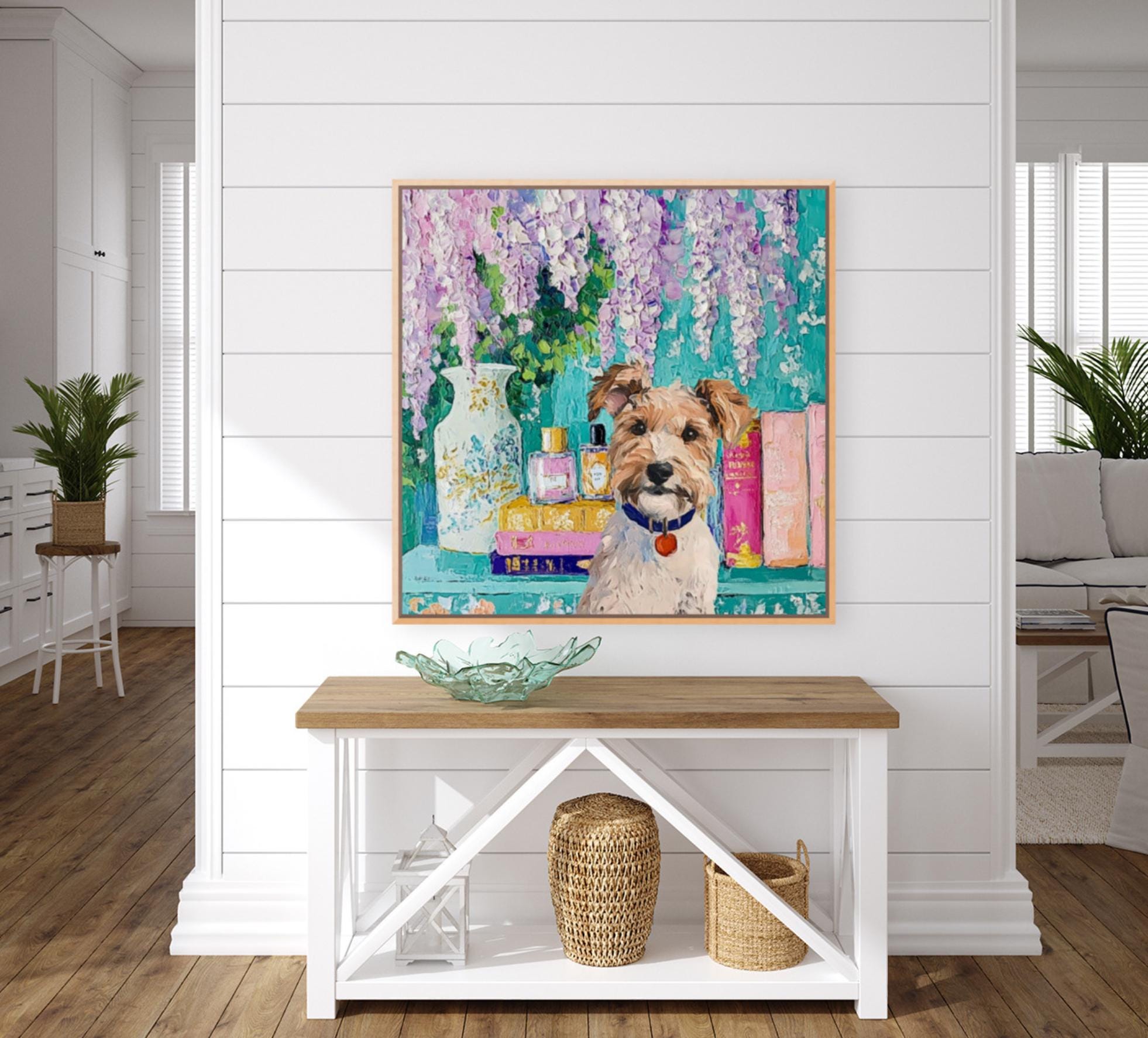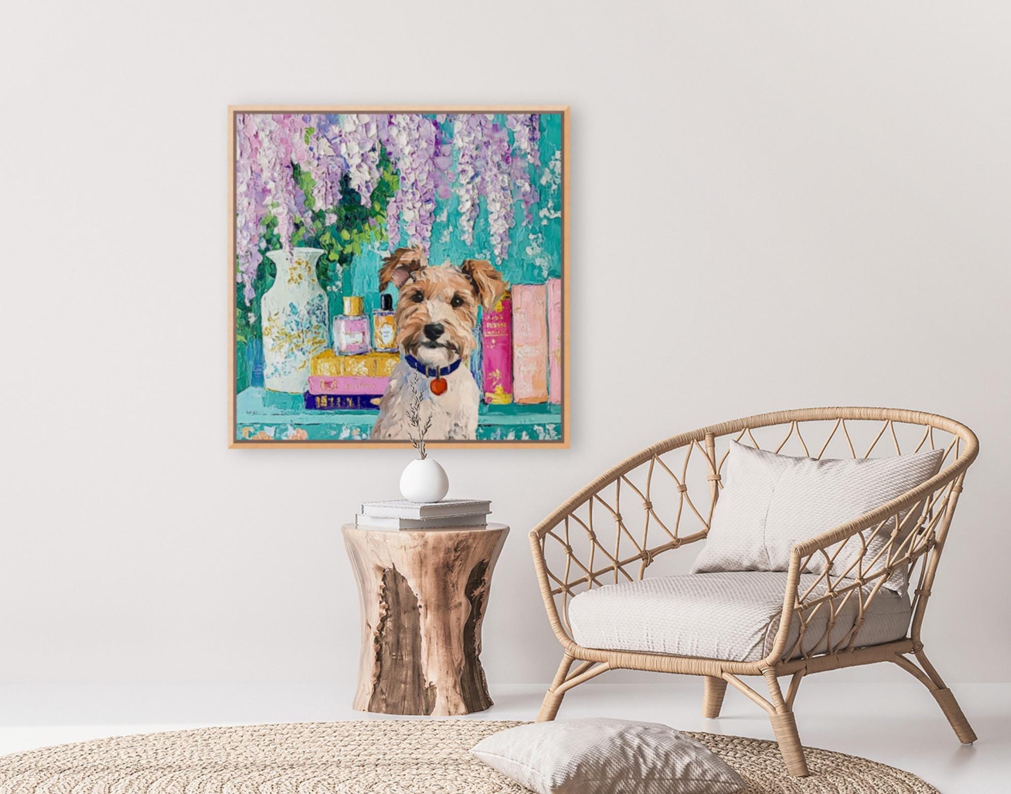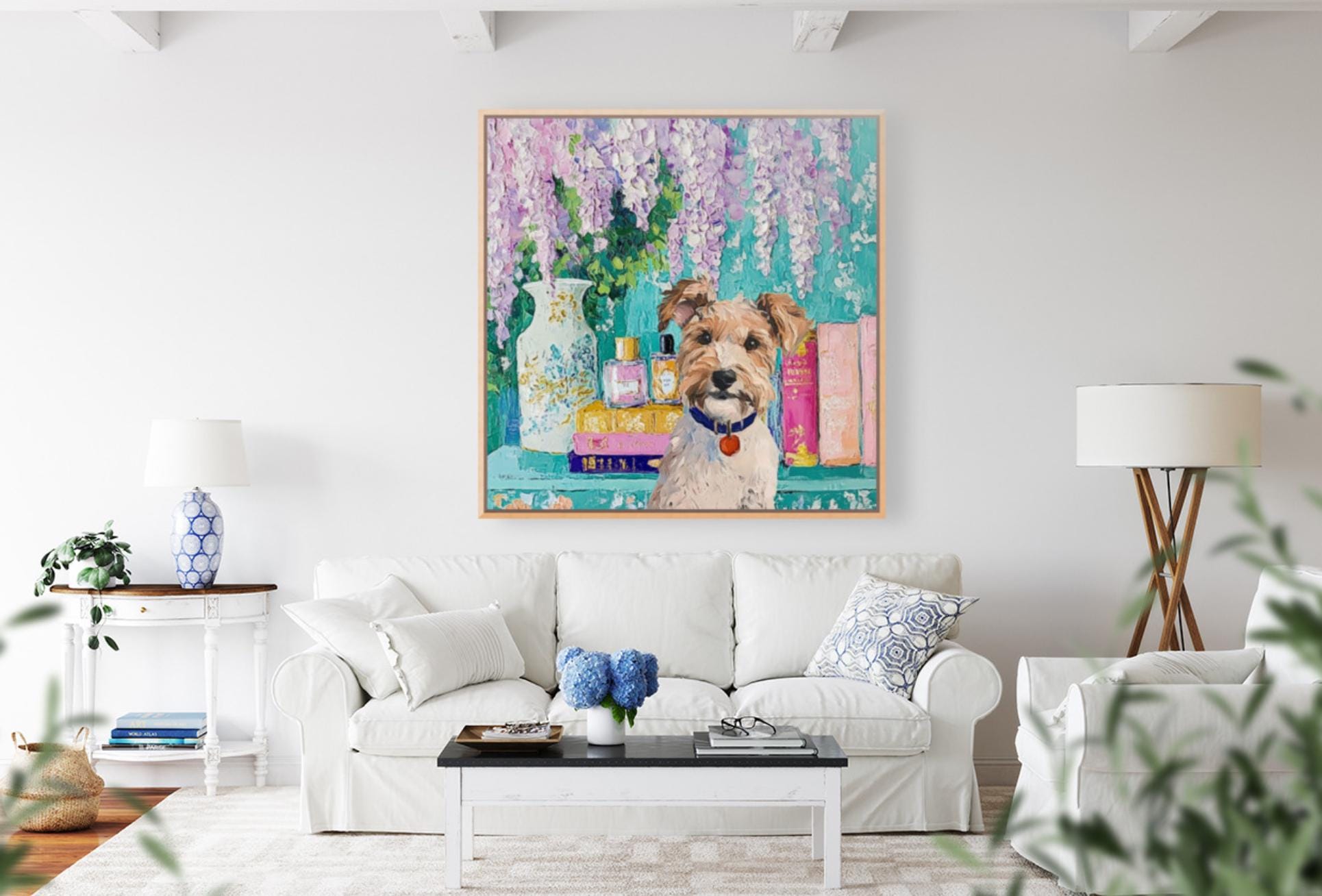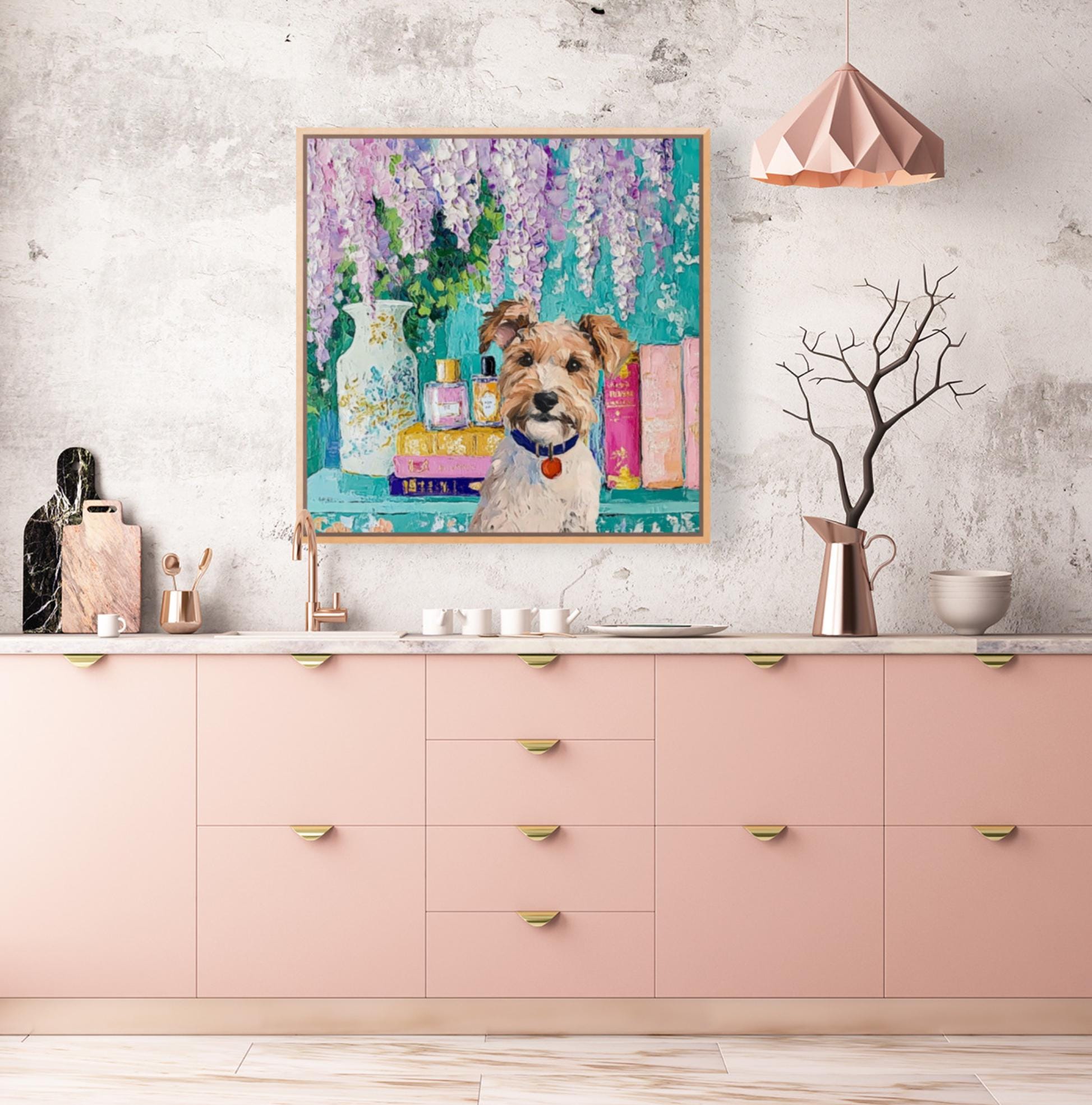 Grandmillennial art, Terrier in blue room with wisteria, whimsical dogs art