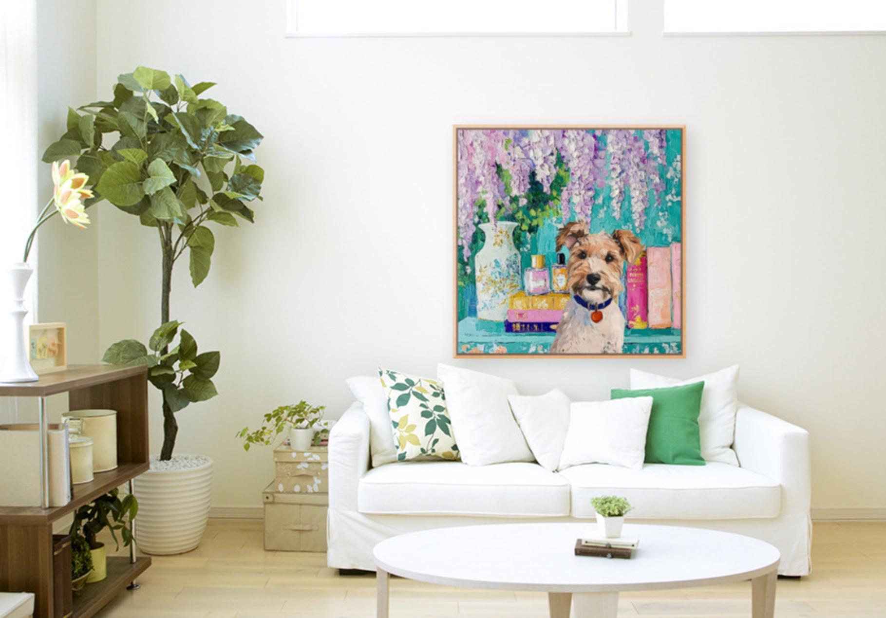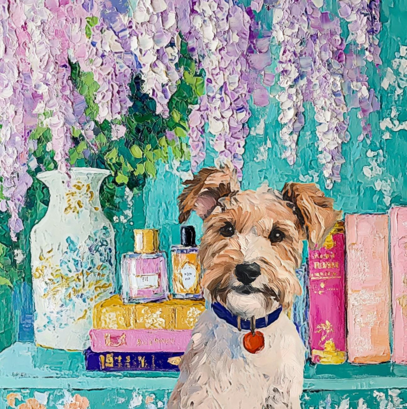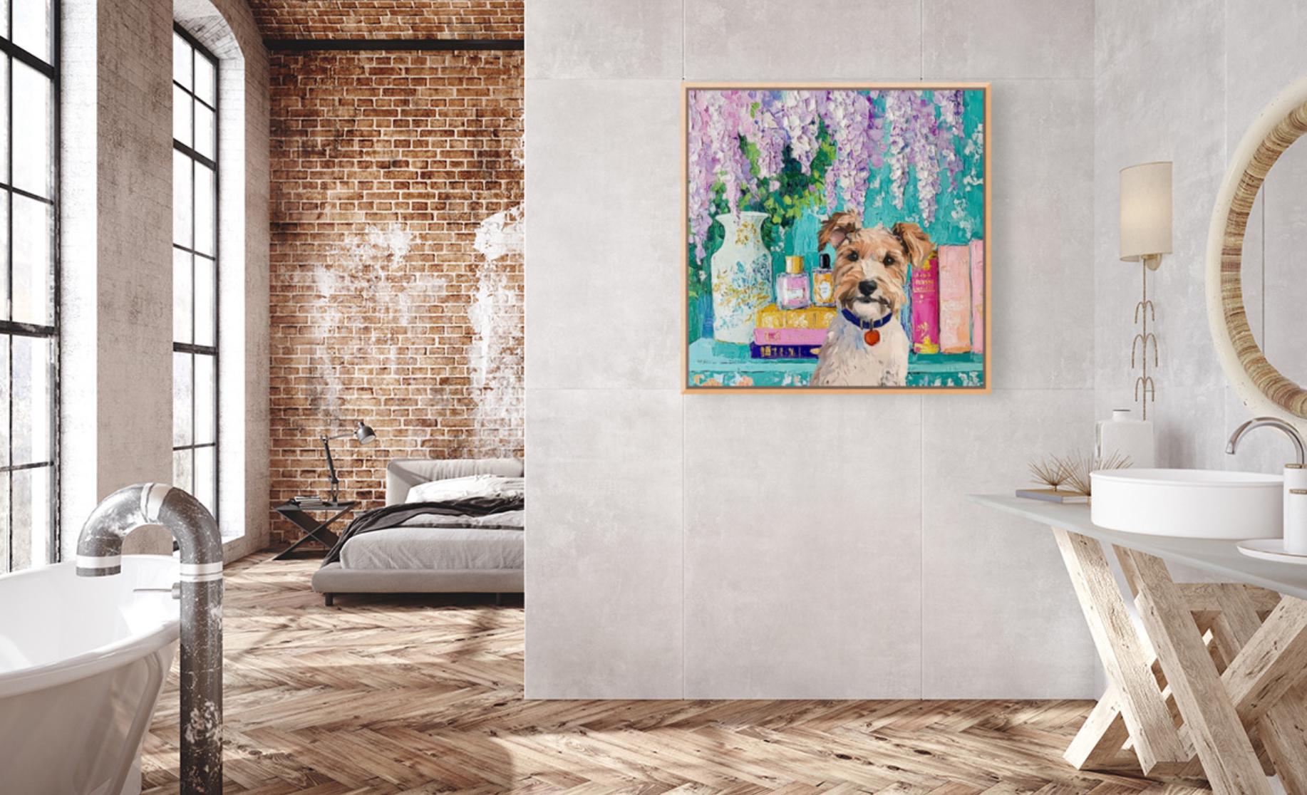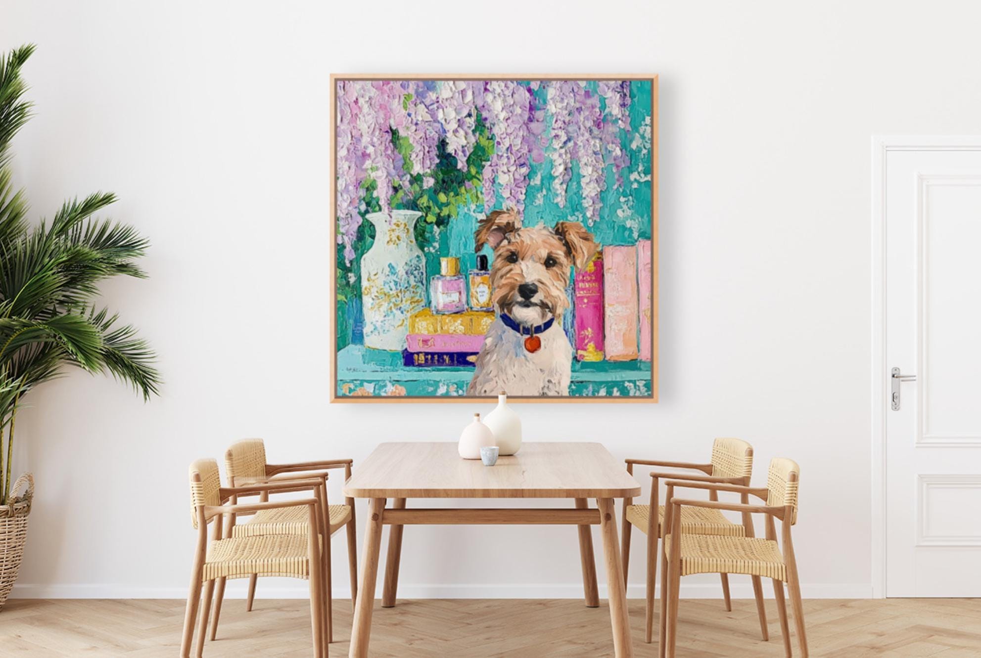 Grandmillennial art, Terrier in blue room with wisteria, whimsical dogs art