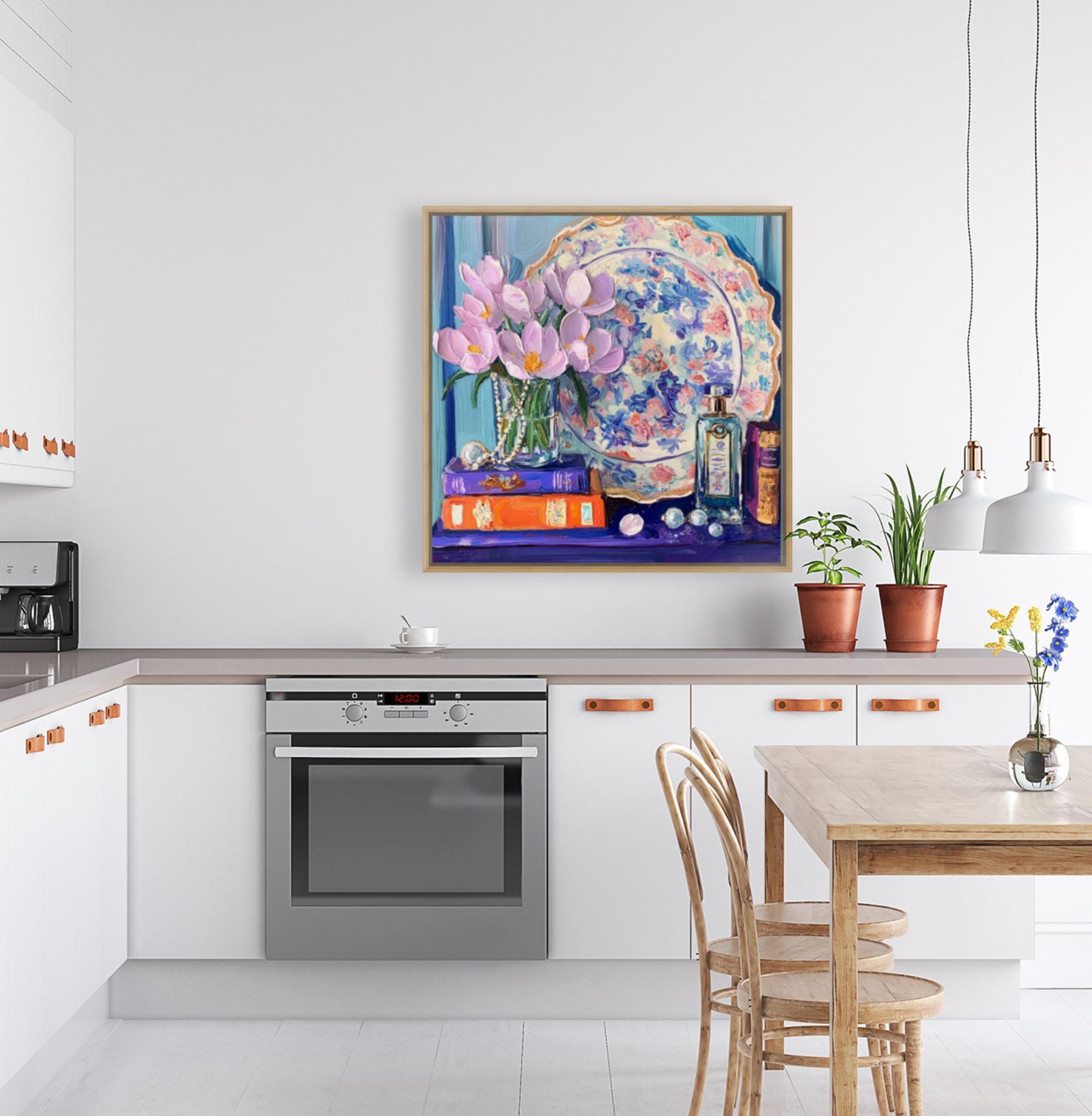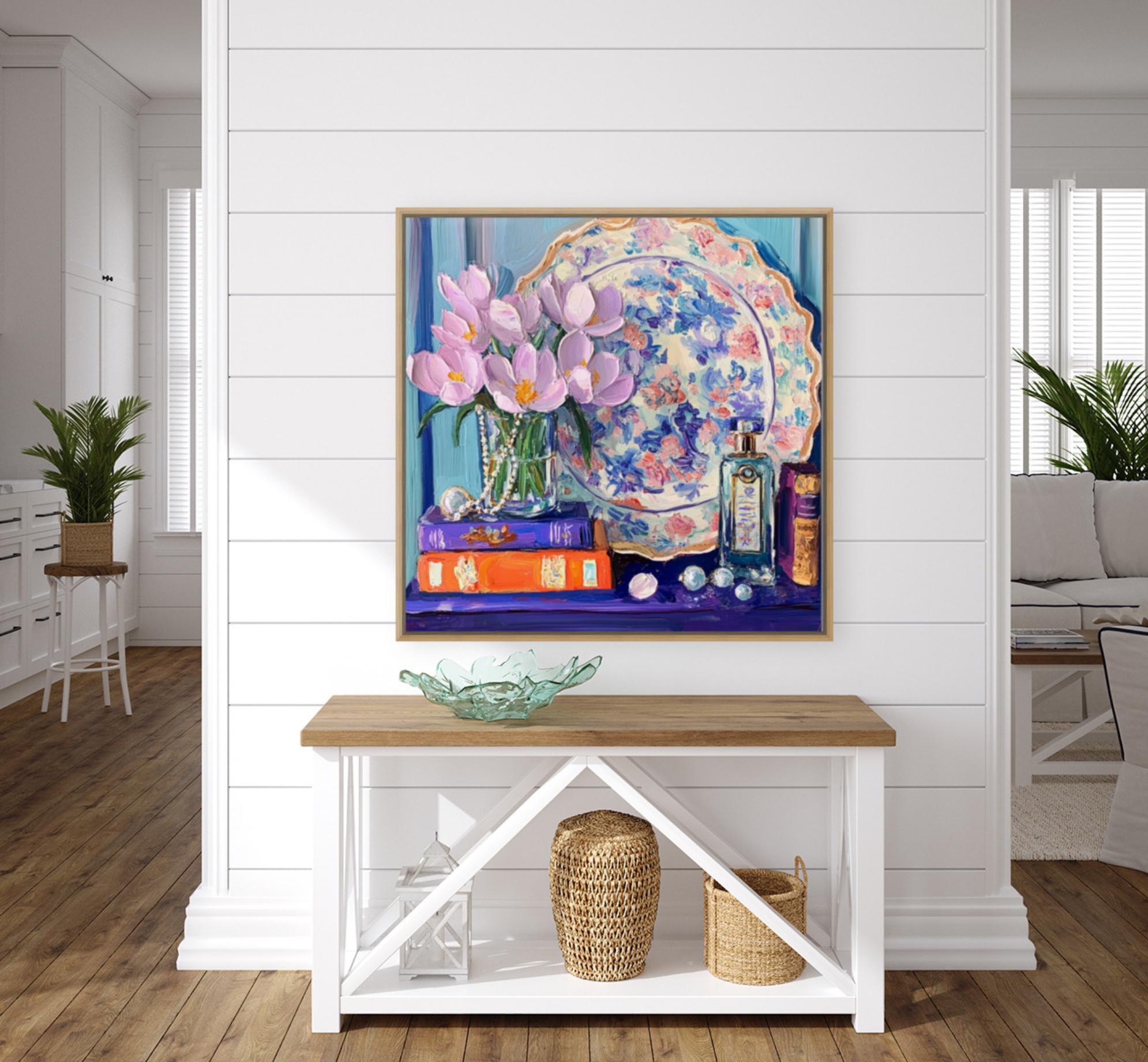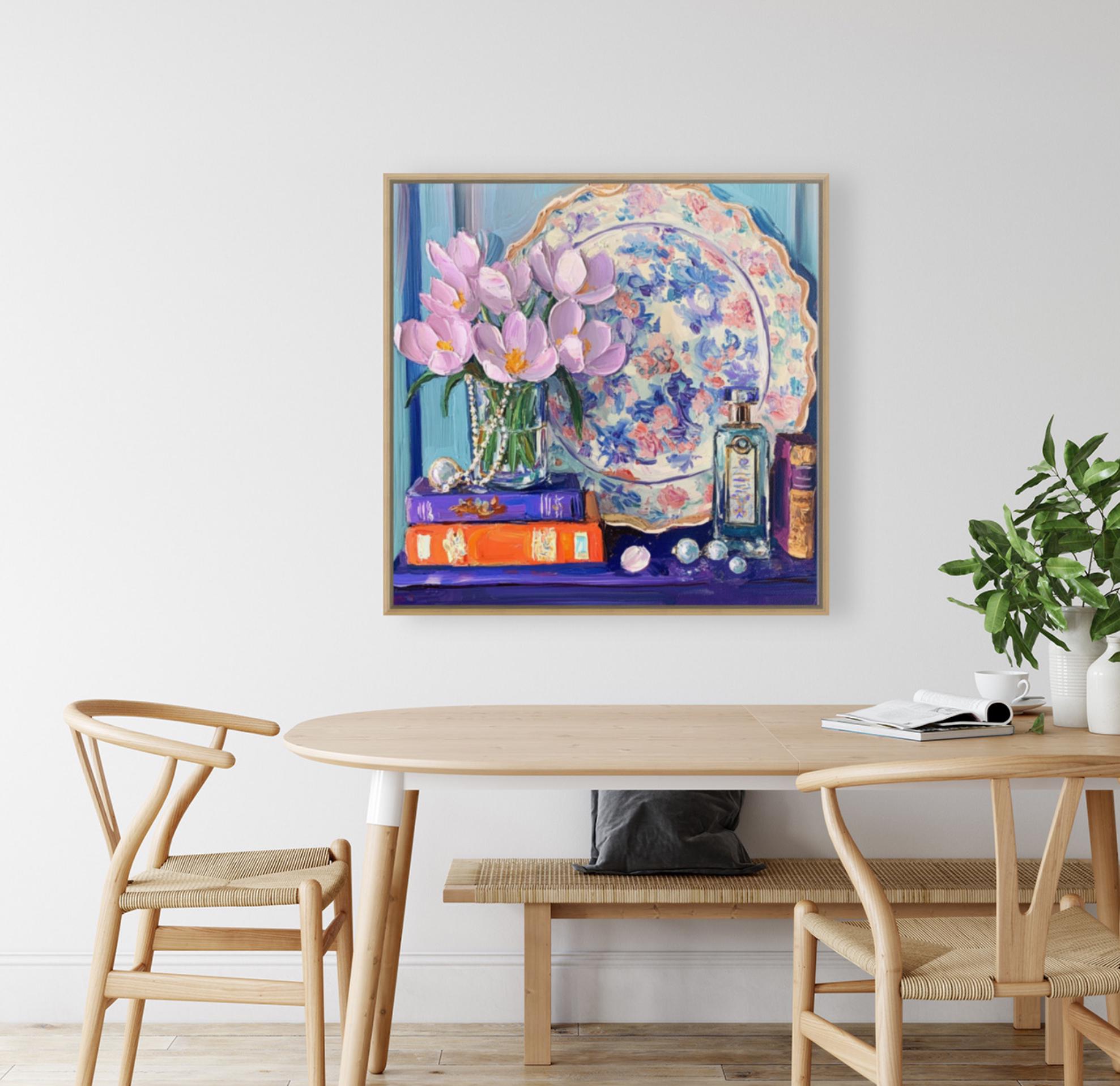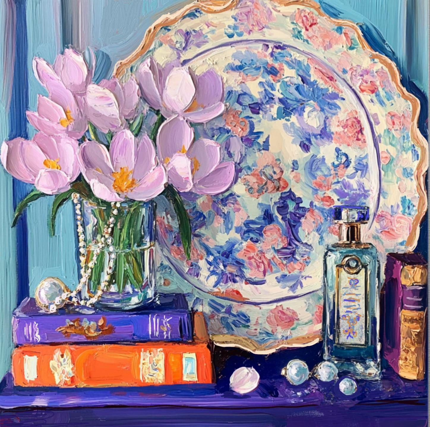 grandmillennial art, Still life with crocuses, pearls, books and chinoiserie plate, oil painting