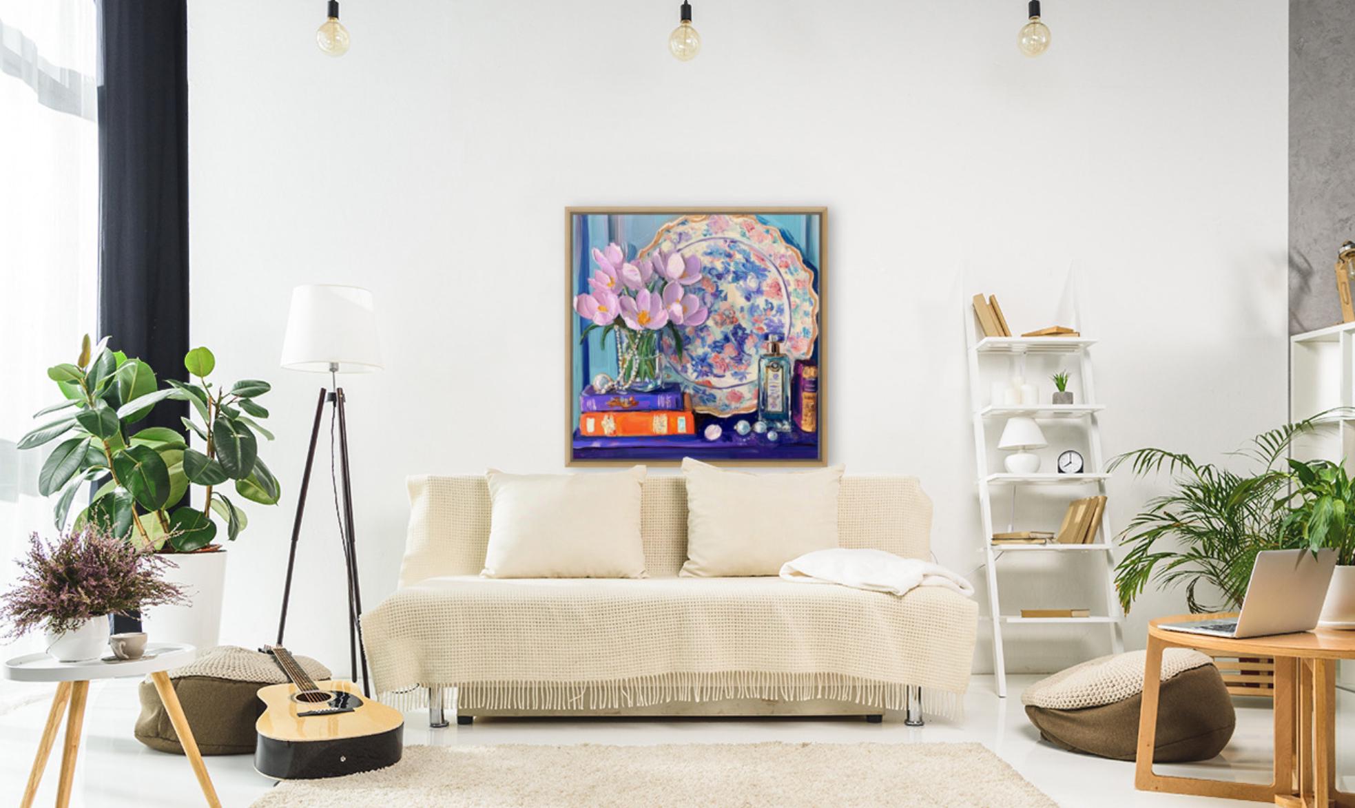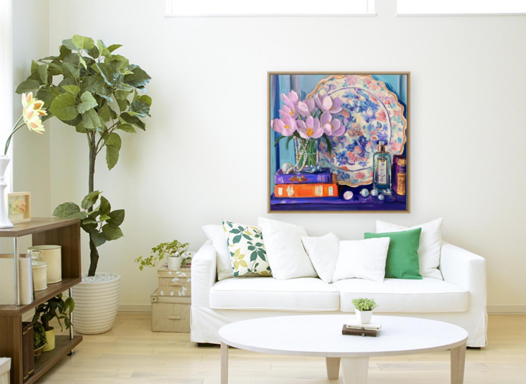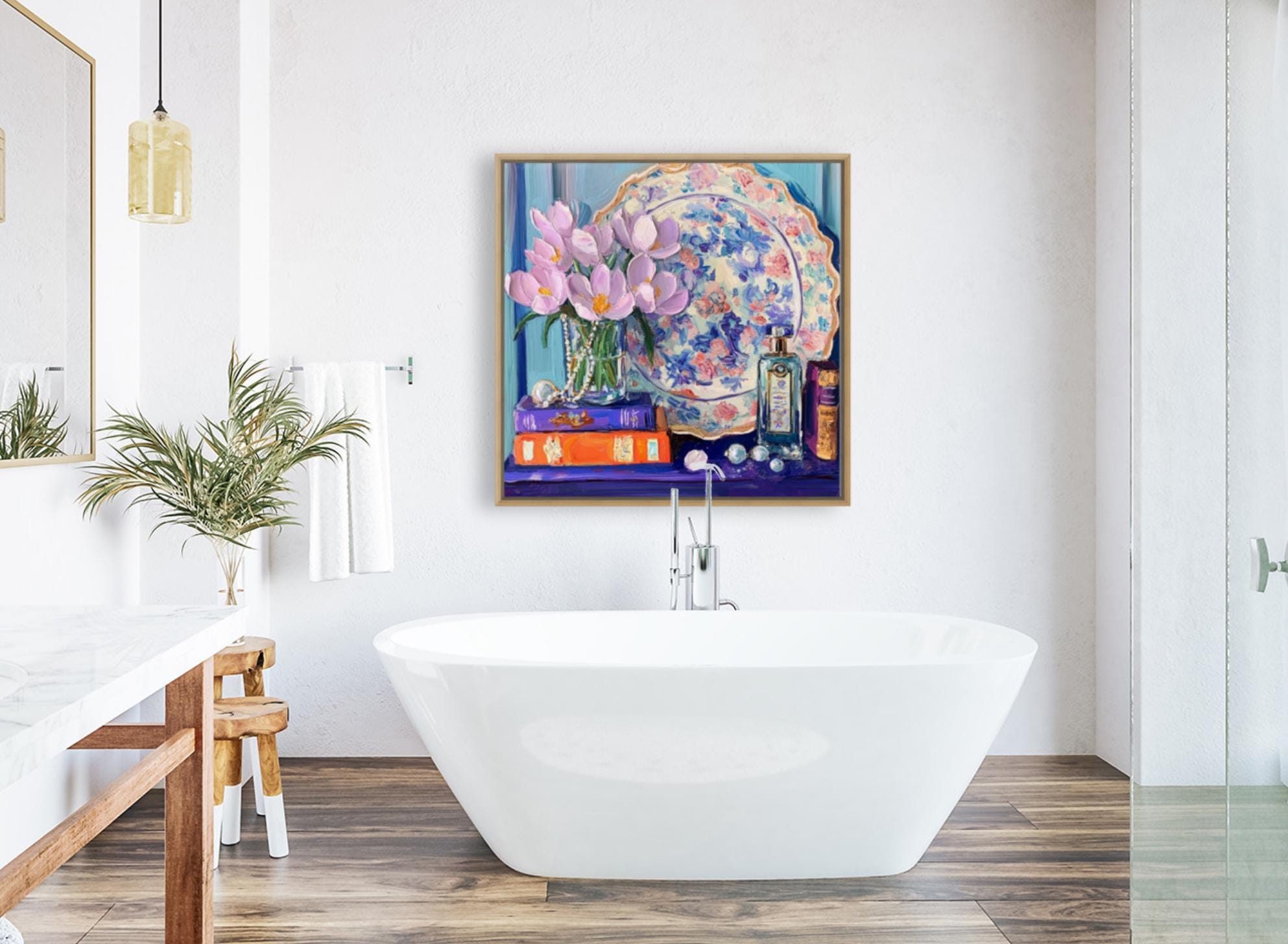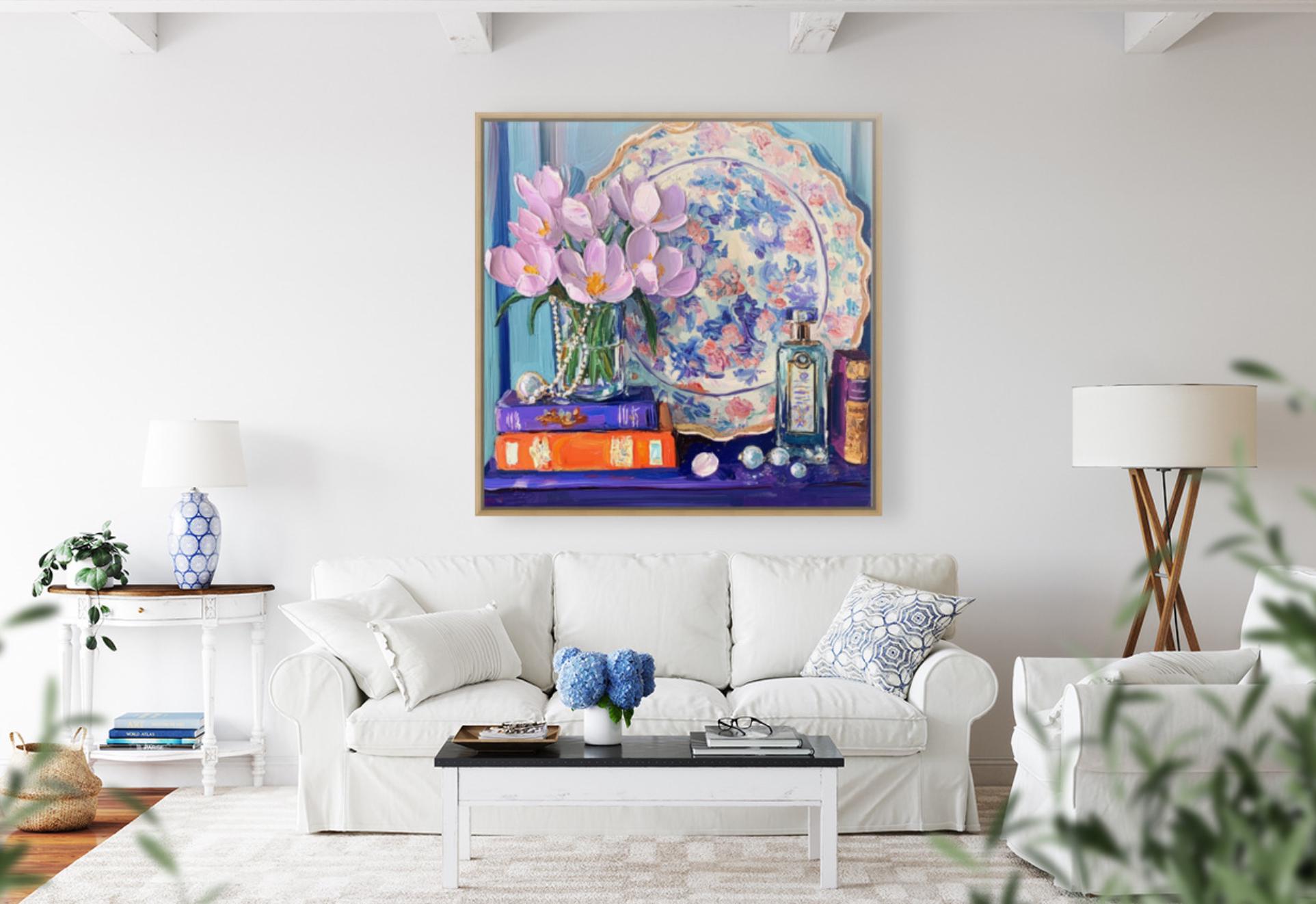 grandmillennial art, Still life with crocuses, pearls, books and chinoiserie plate, oil painting