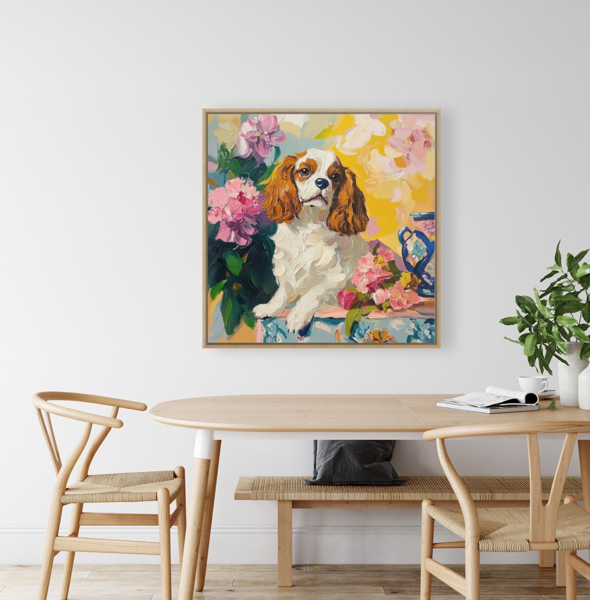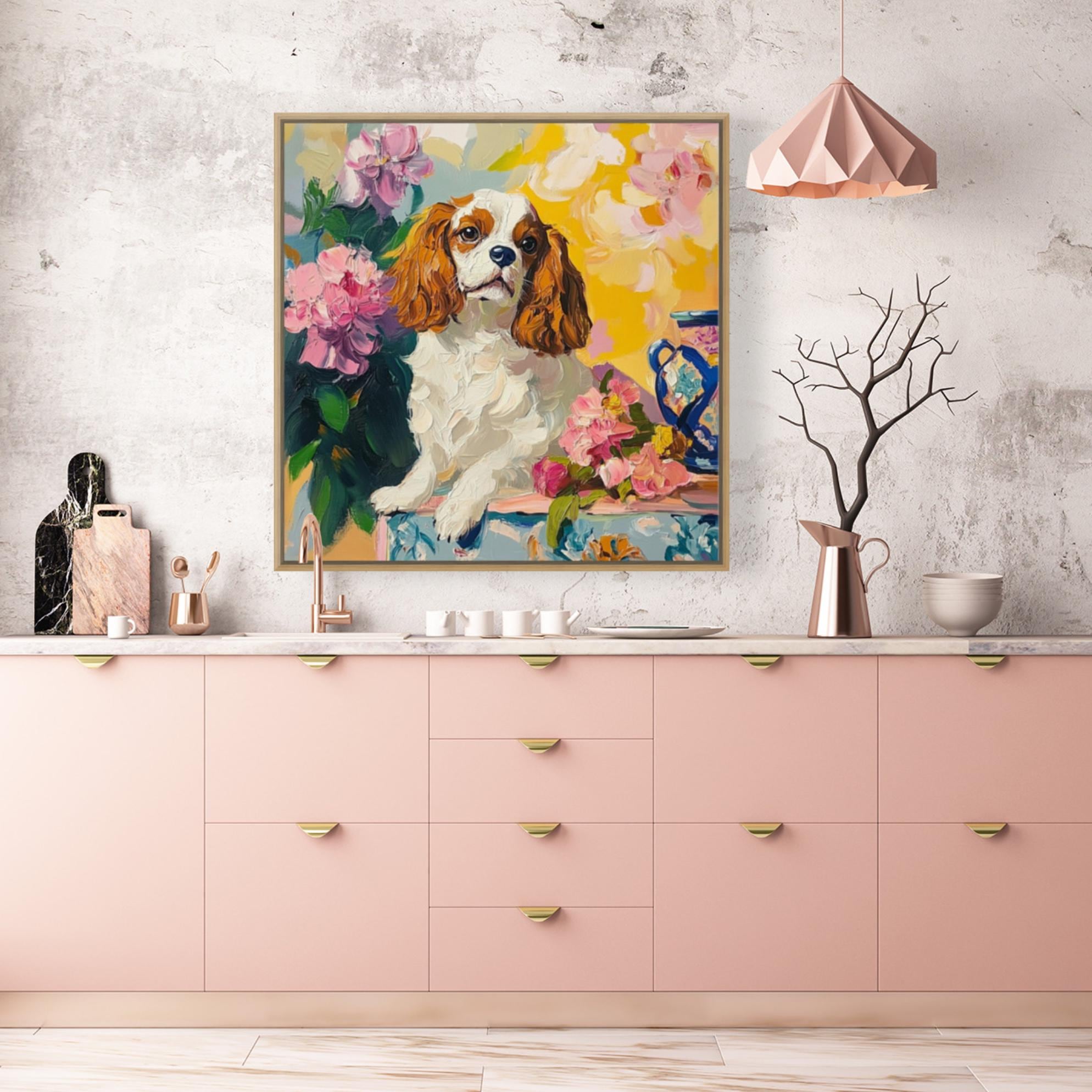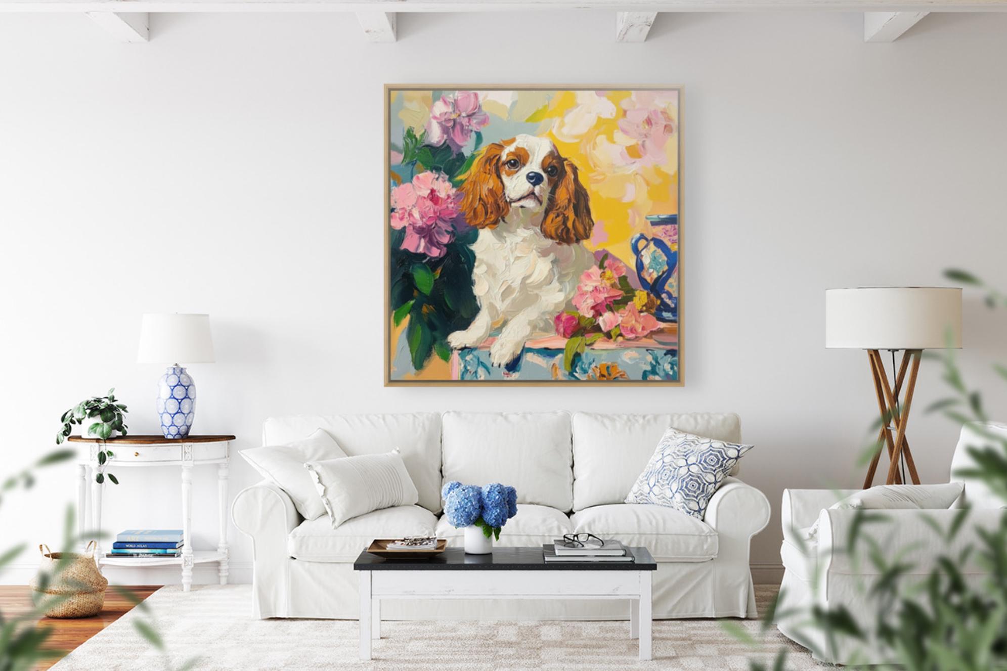 Grandmillennial art, King Charles Spaniel in Italian Landscape , whimsical dogs art
