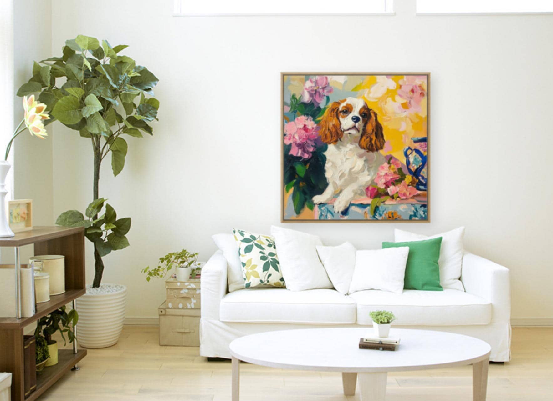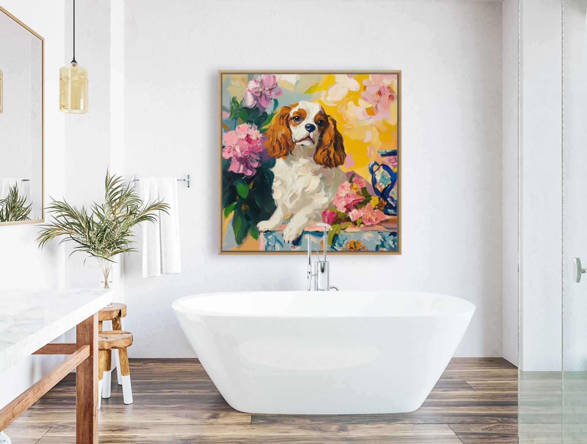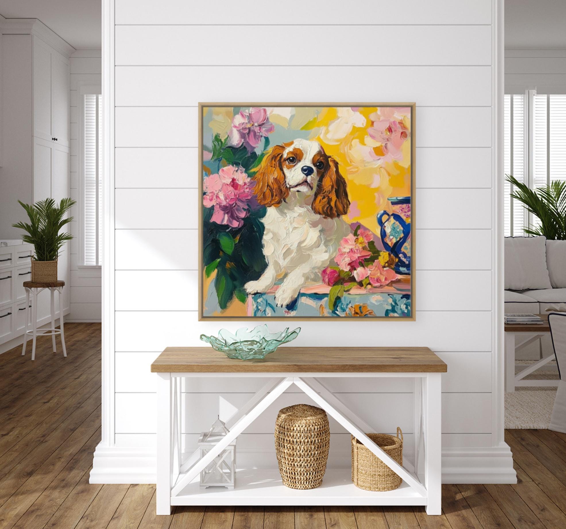 Grandmillennial art, King Charles Spaniel in Italian Landscape , whimsical dogs art