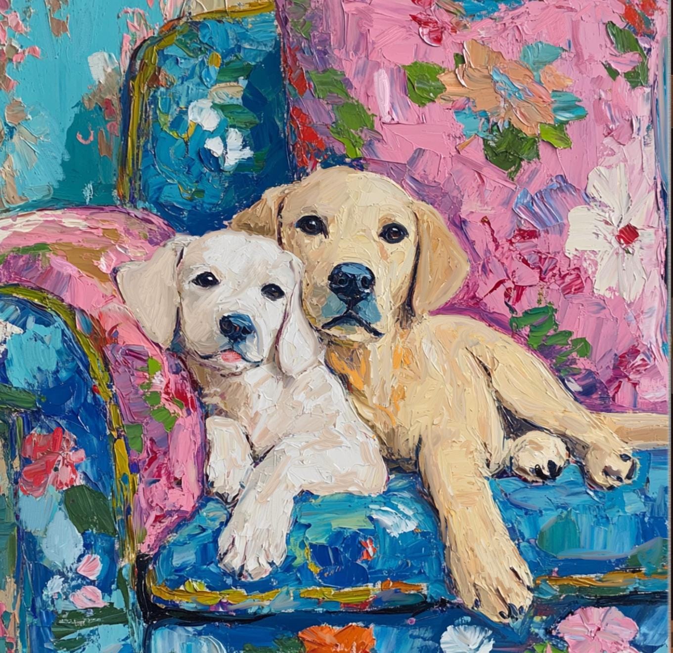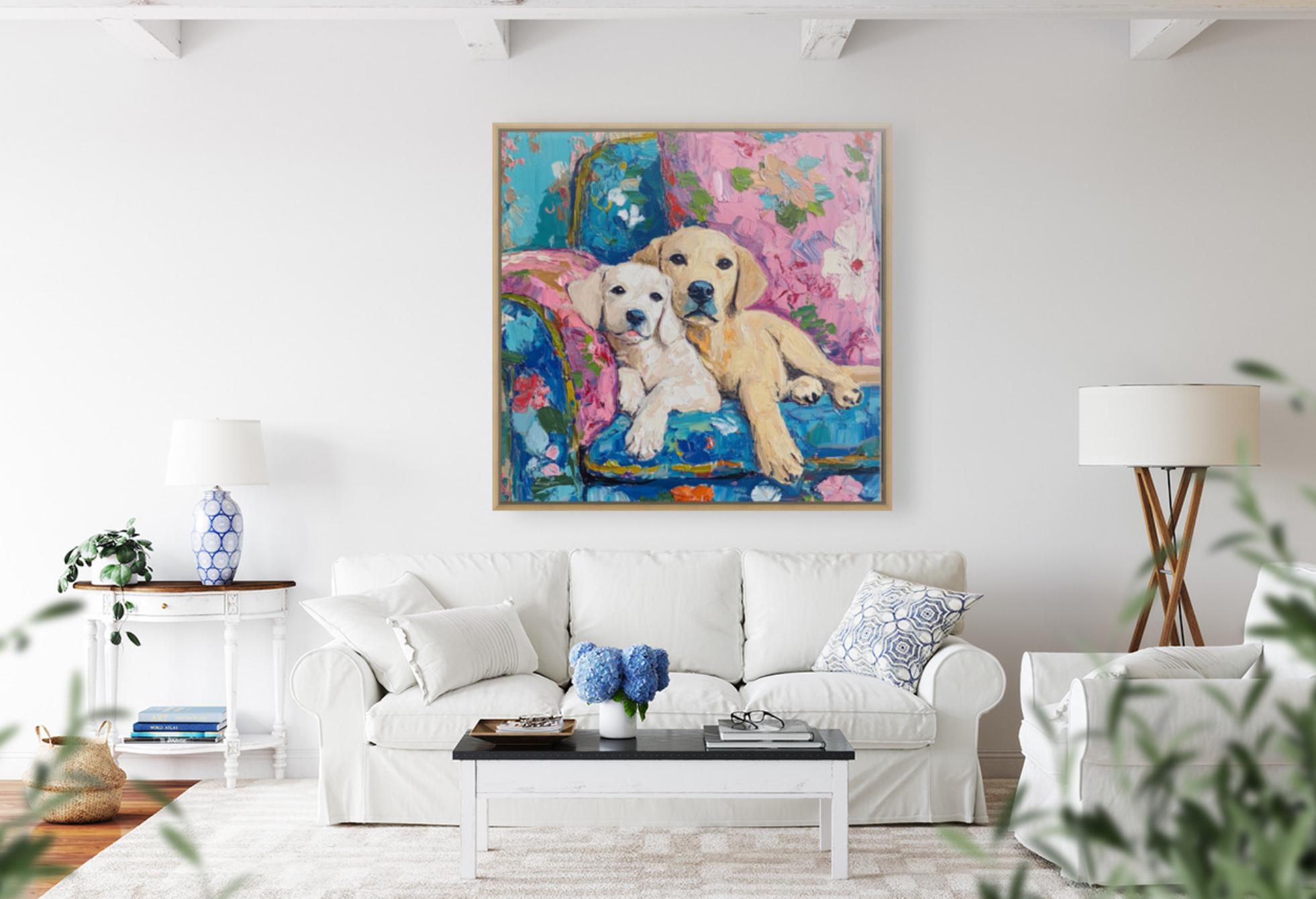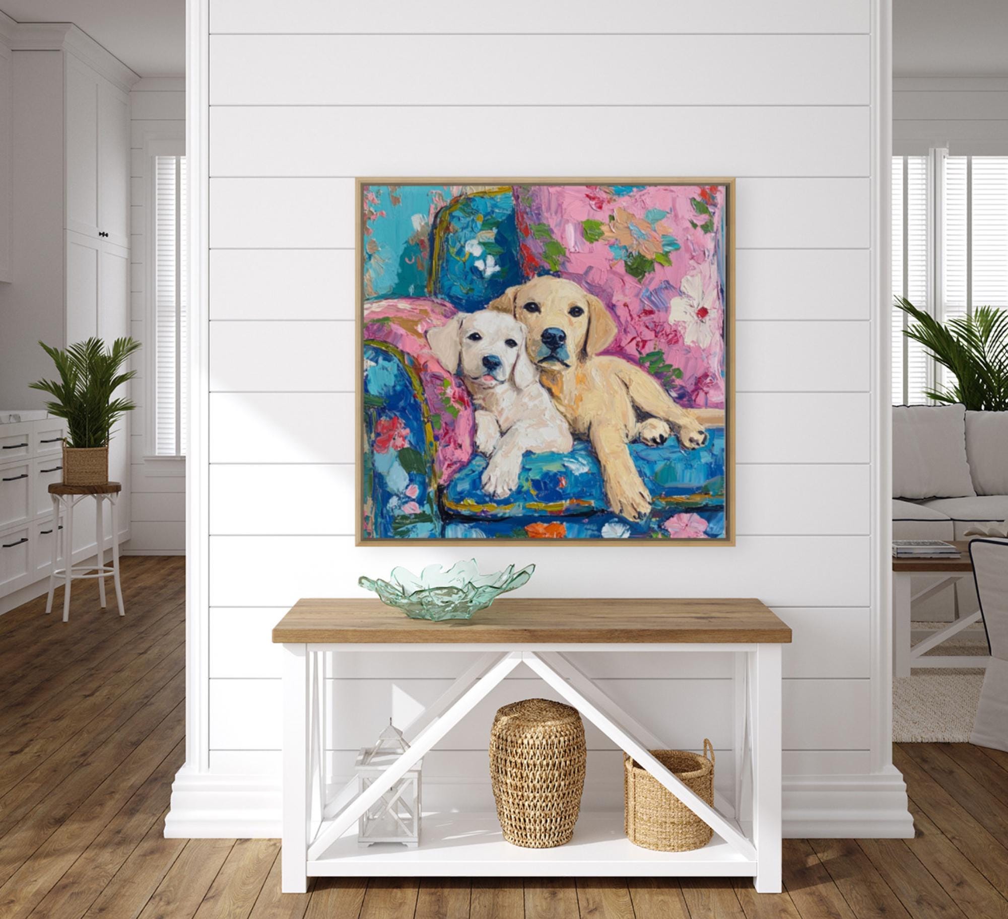 Grandmillennial art, Mother and Daughter in preppy chinoiserie interior, whimsical Labrador painting