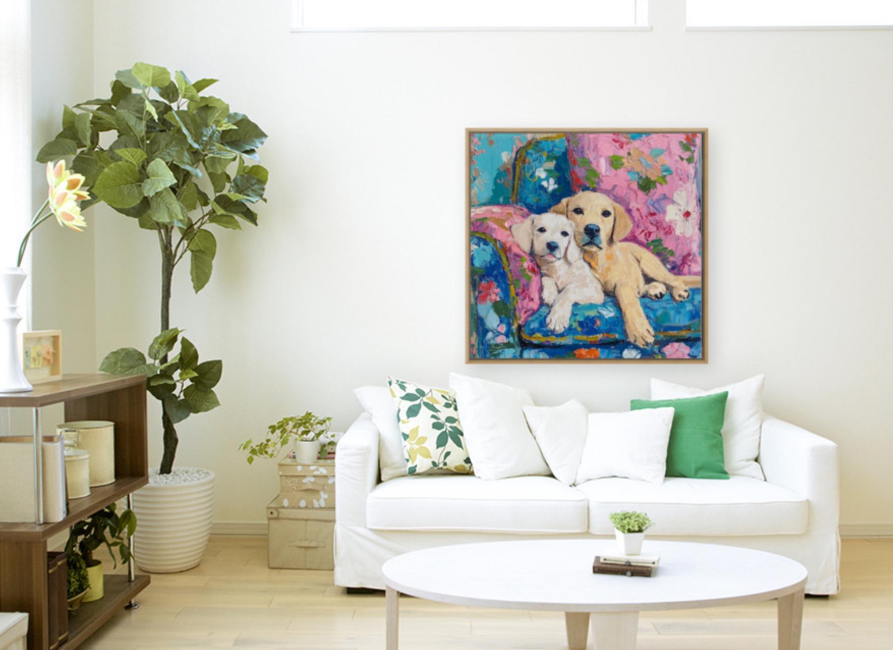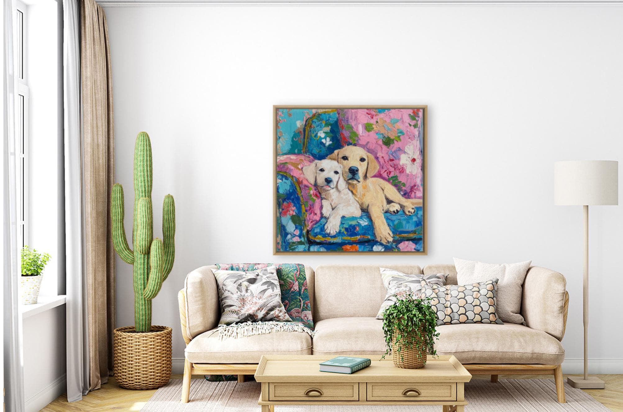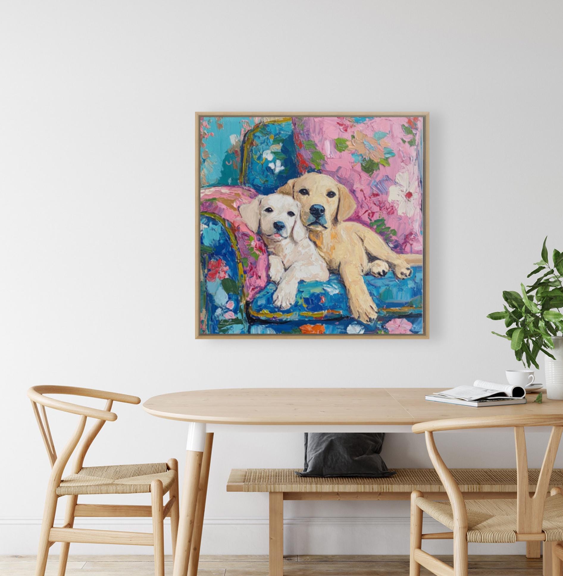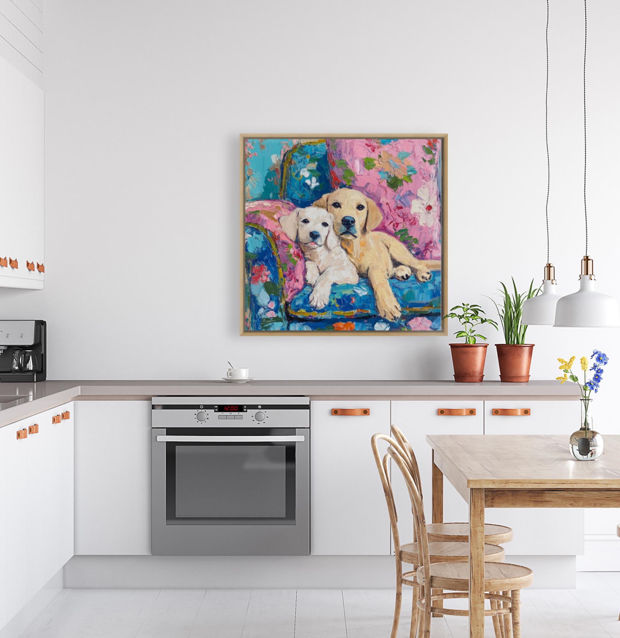 Grandmillennial art, Mother and Daughter in preppy chinoiserie interior, whimsical Labrador painting