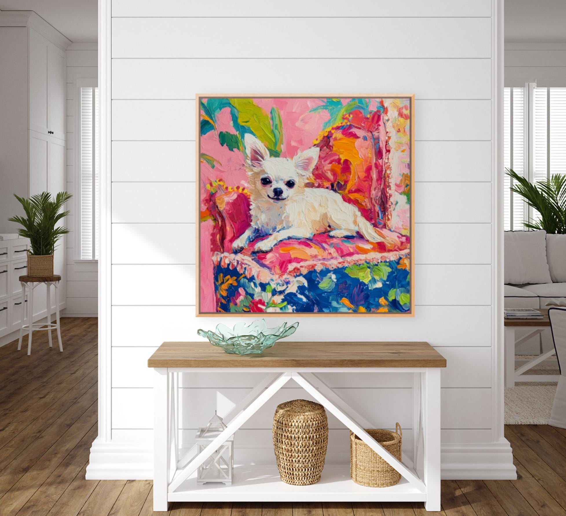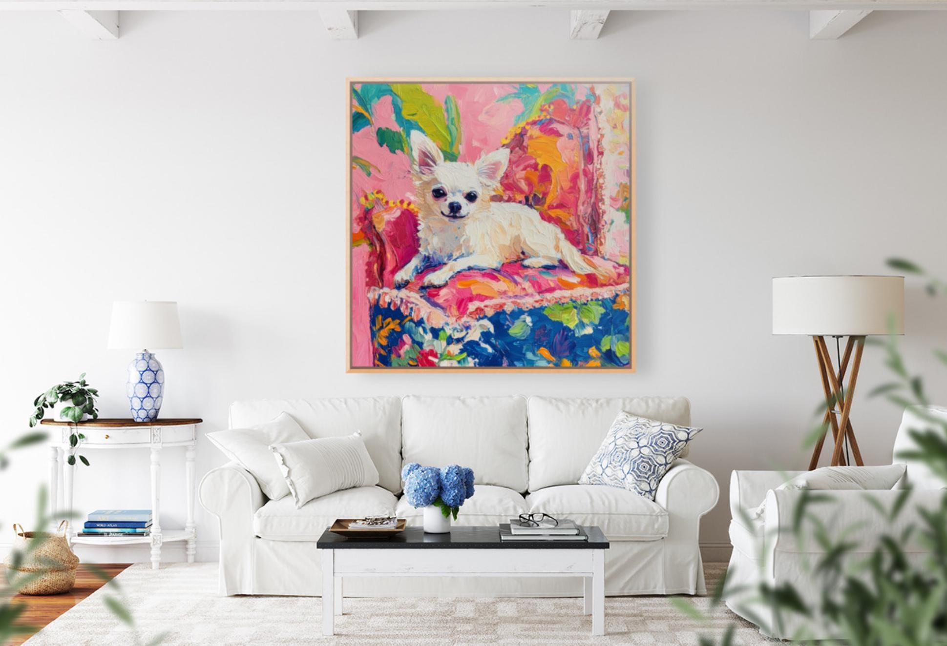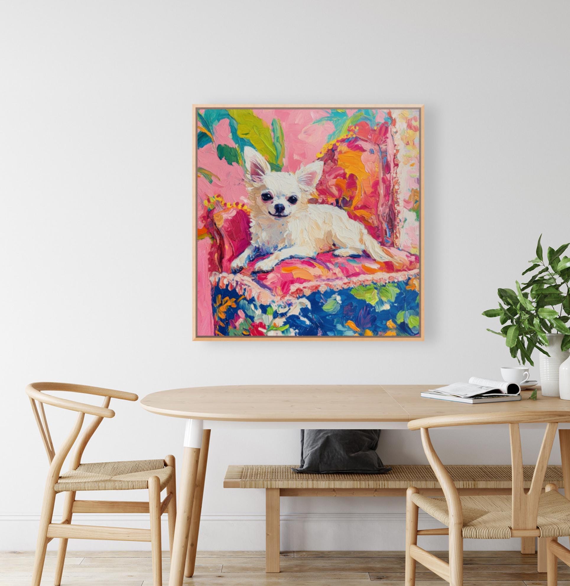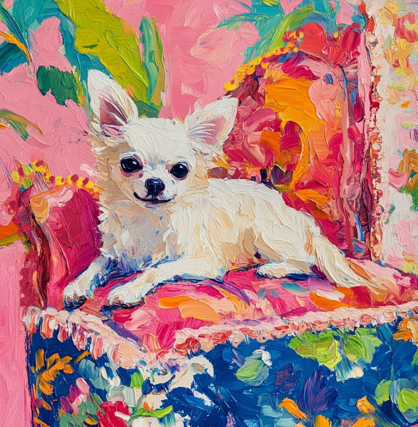 Grandmillennial art, White Chihuahua in preppy chinoiserie interior, whimsical dog art