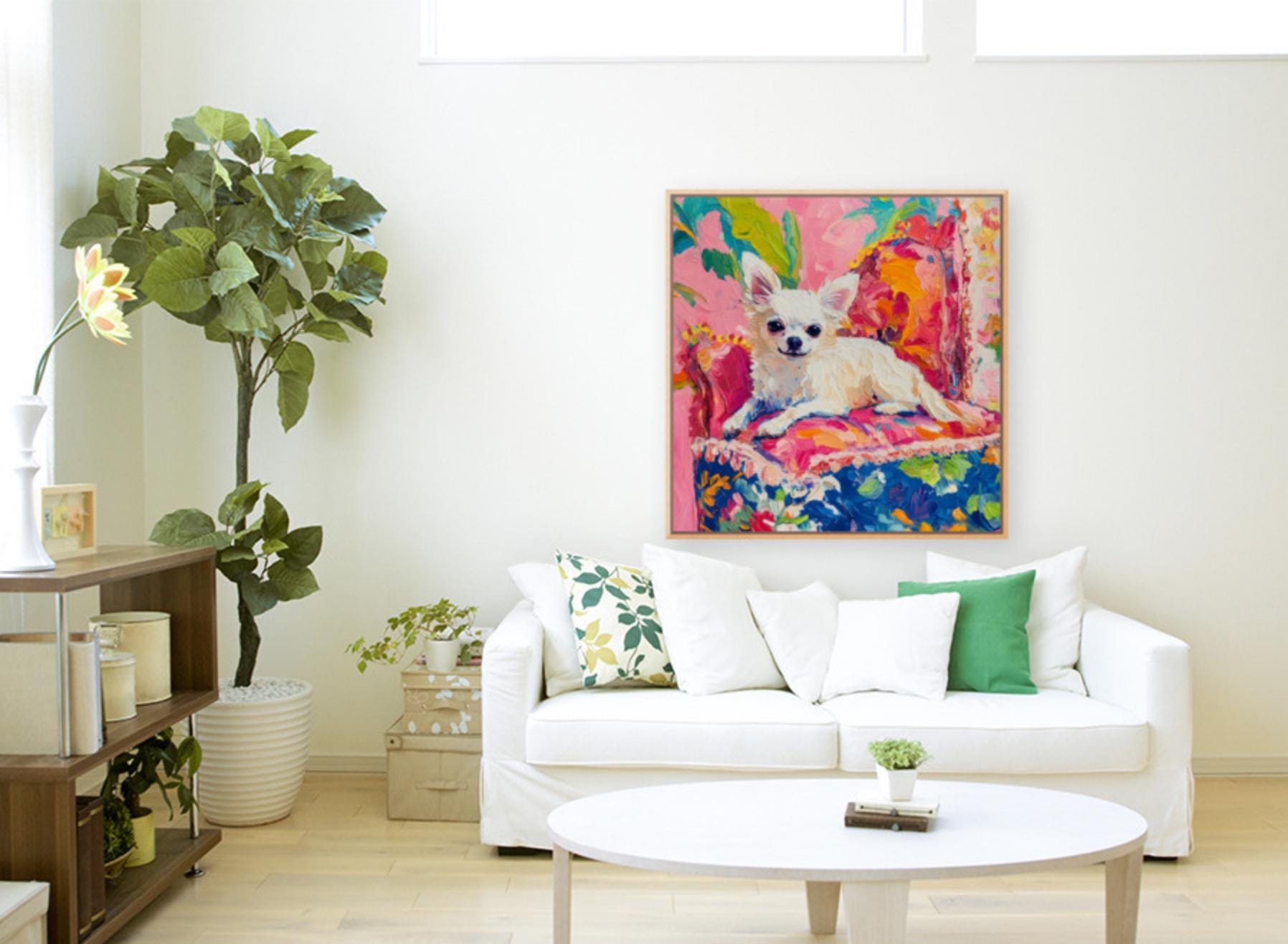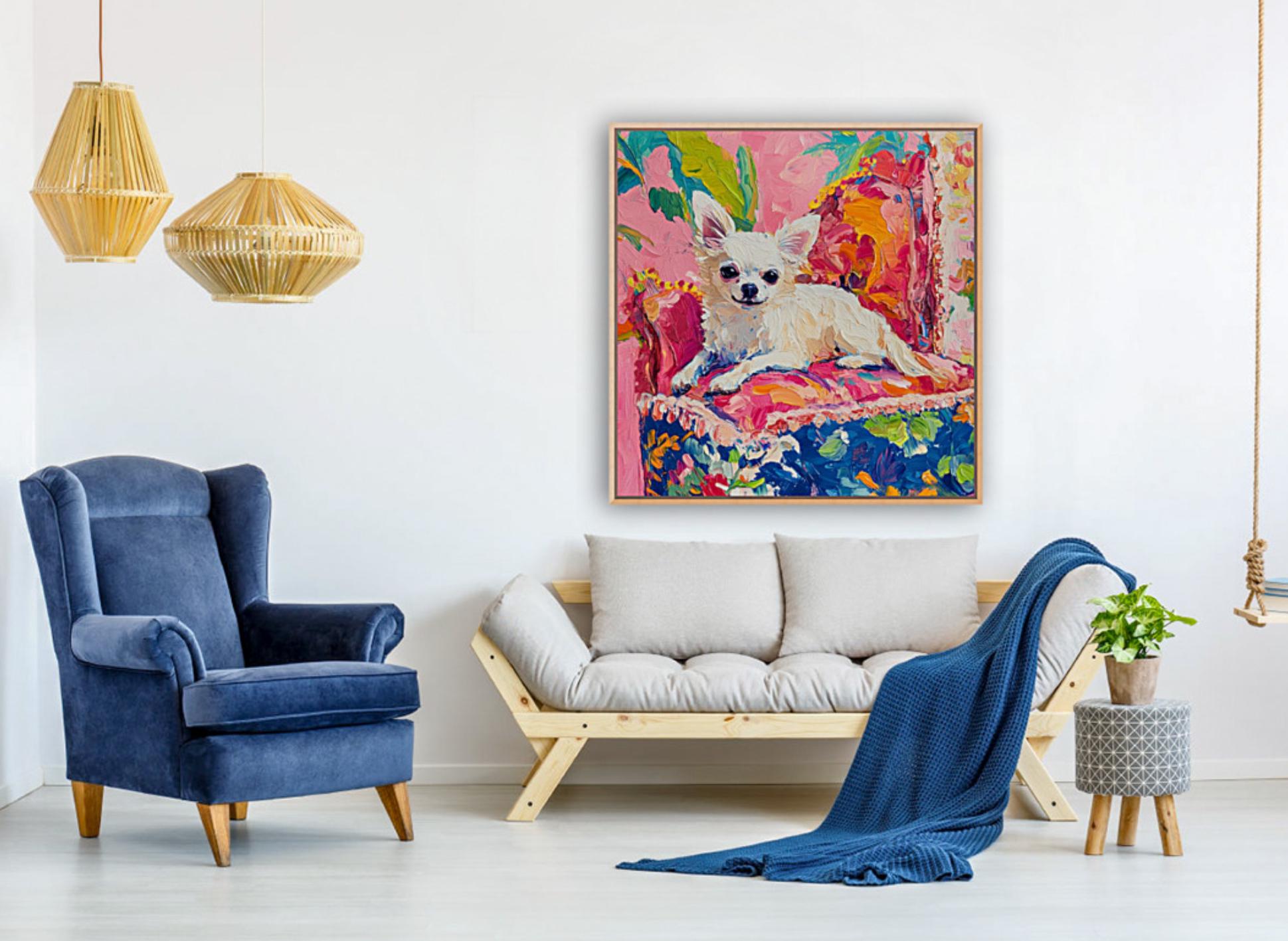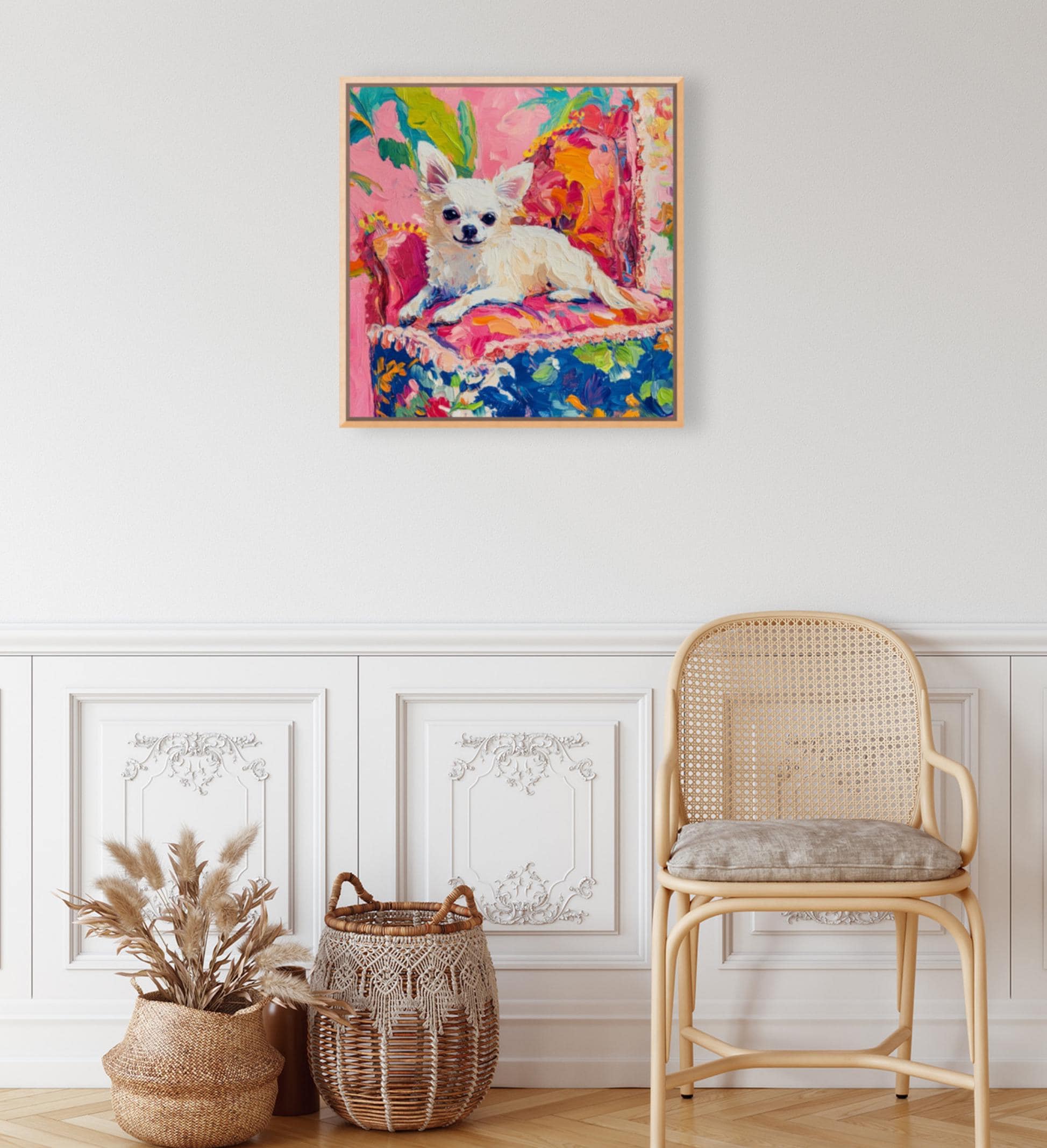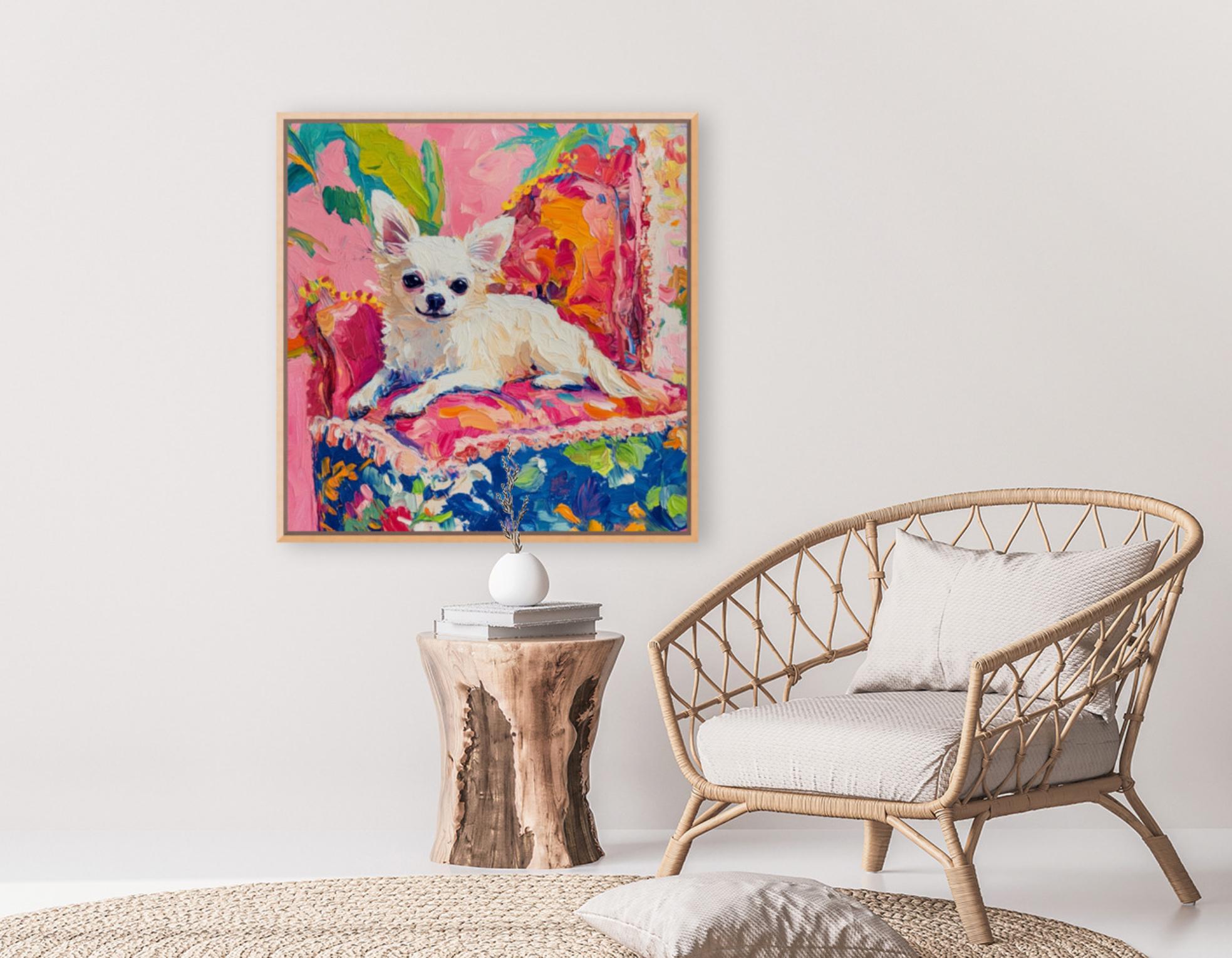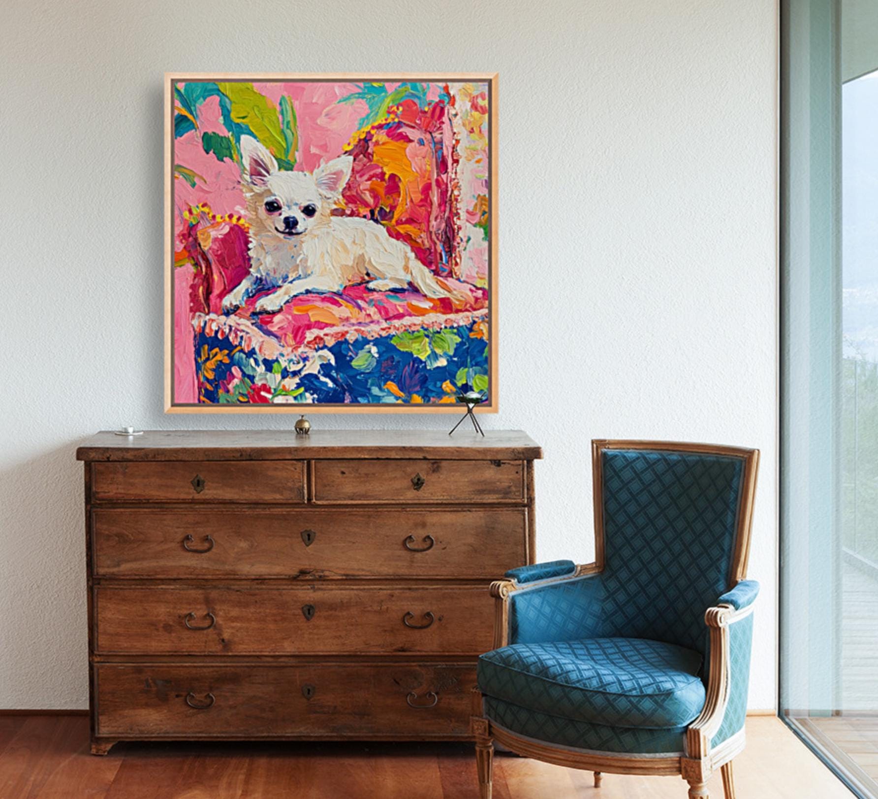 Grandmillennial art, White Chihuahua in preppy chinoiserie interior, whimsical dog art