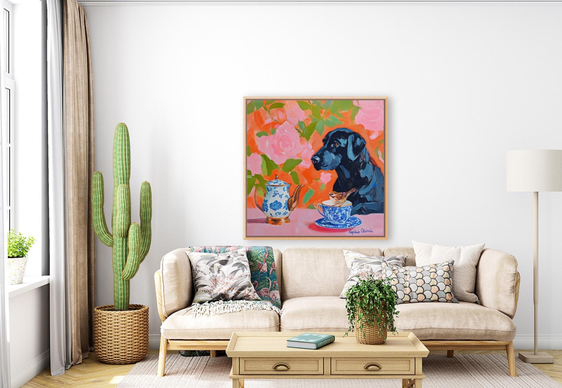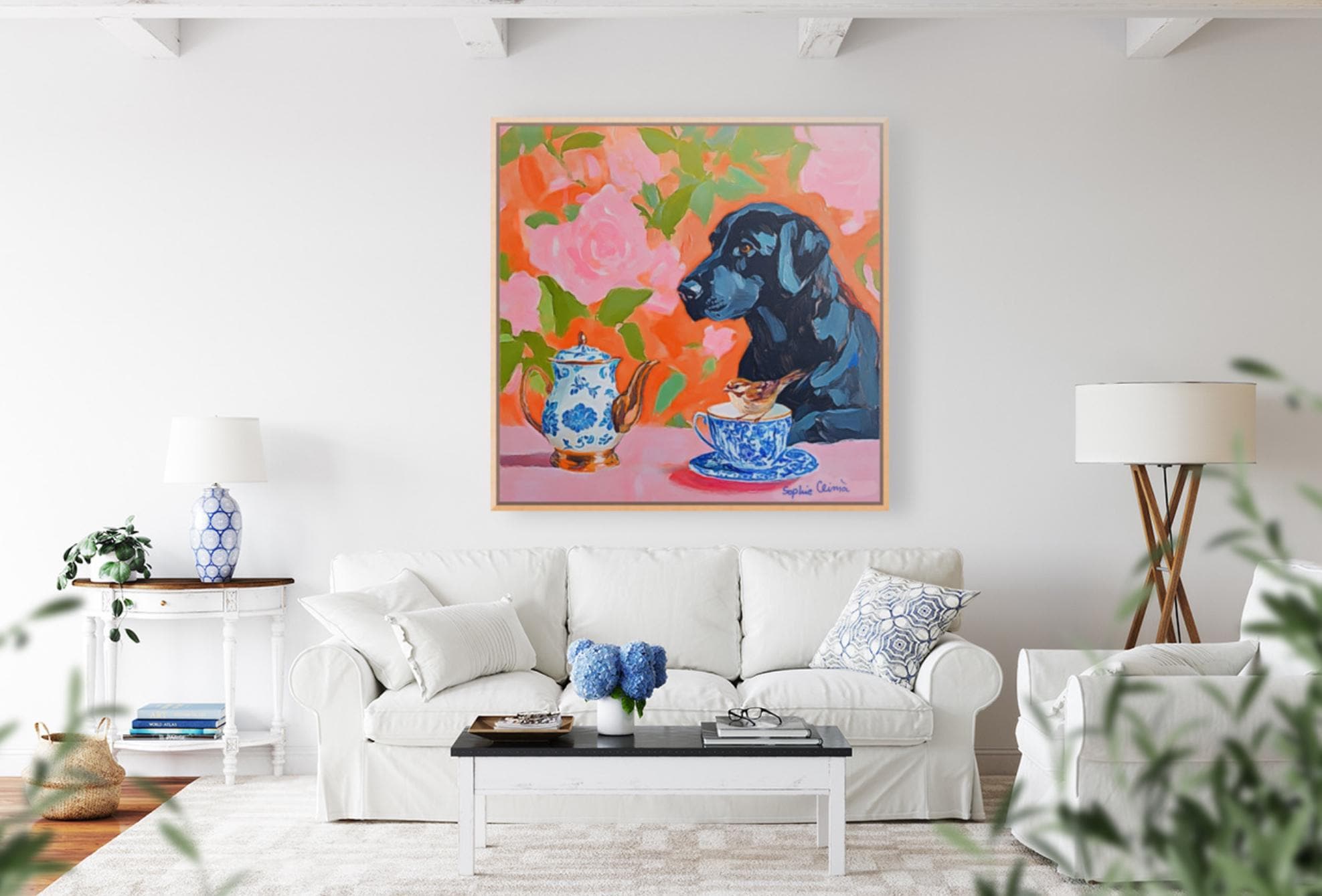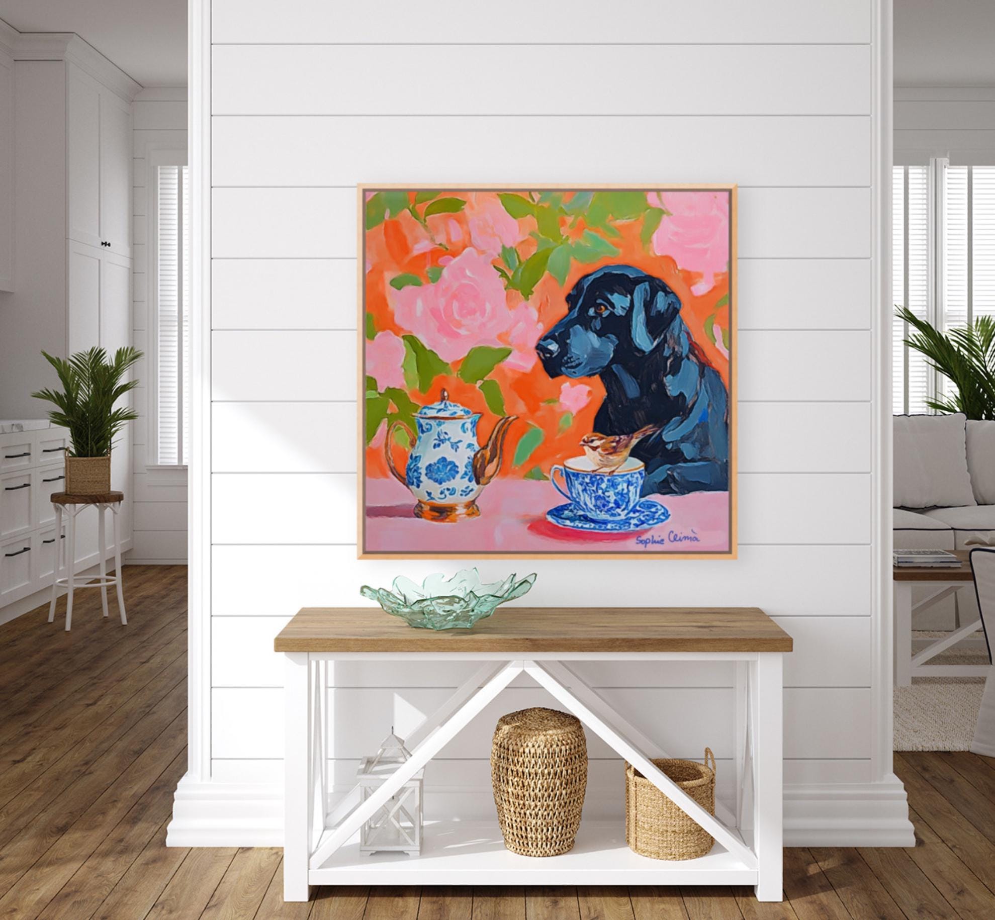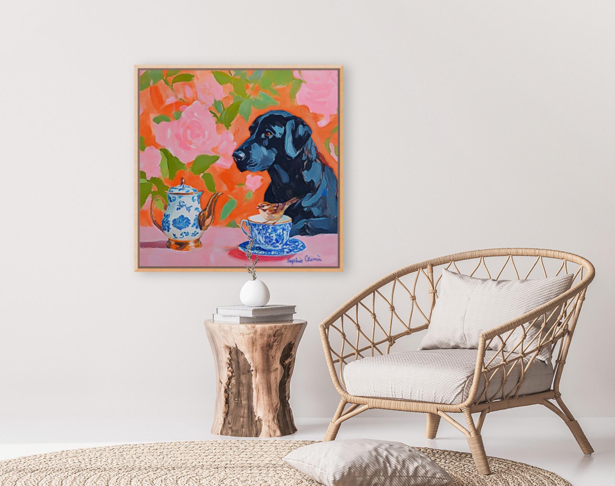 Grandmillennial art, Afternoon tea with a friend, whimsical Labrador art
