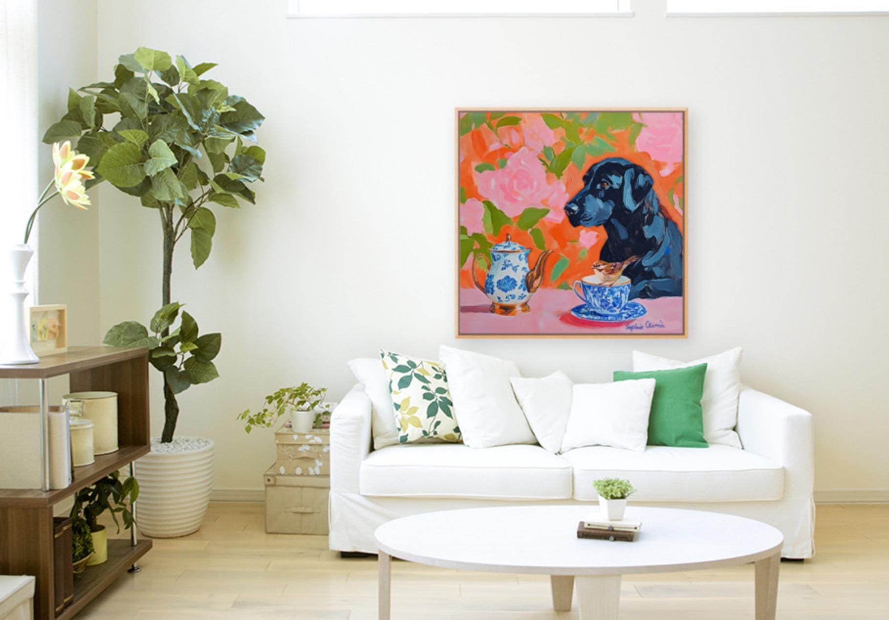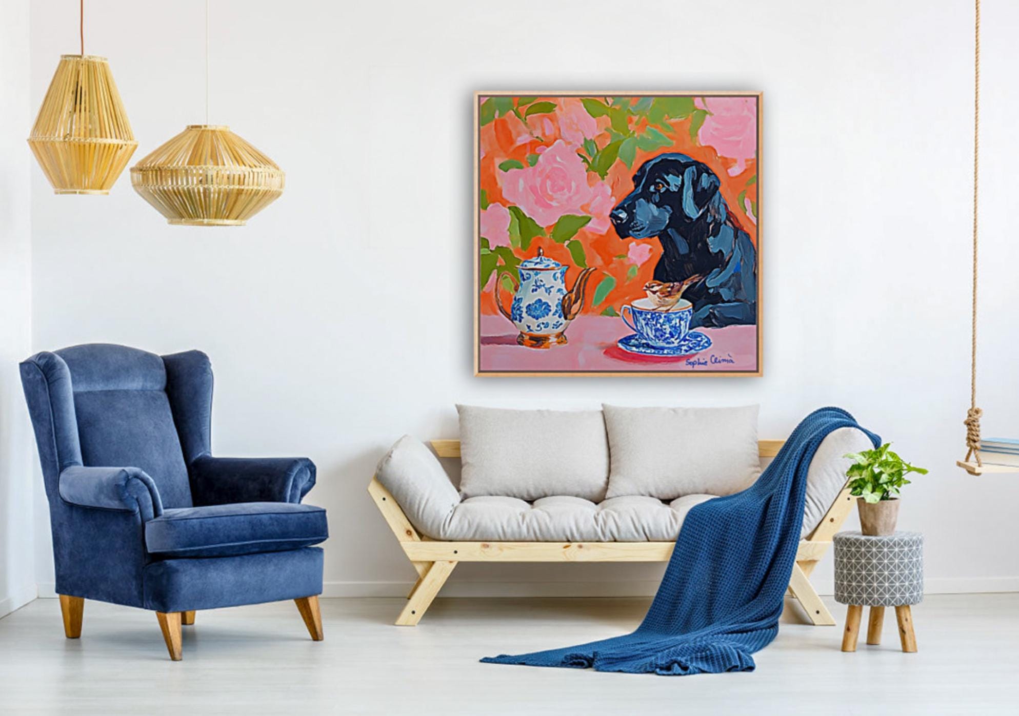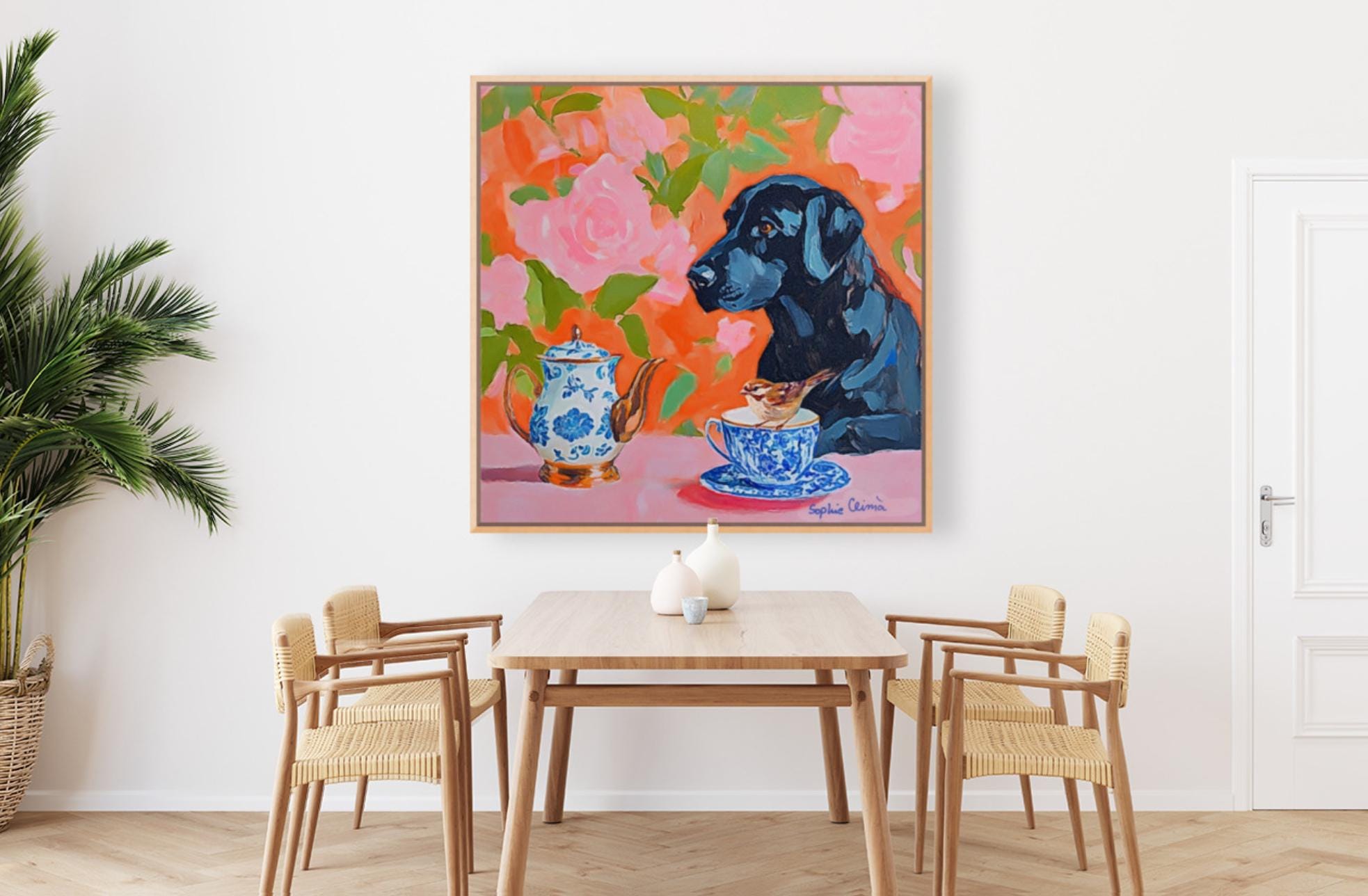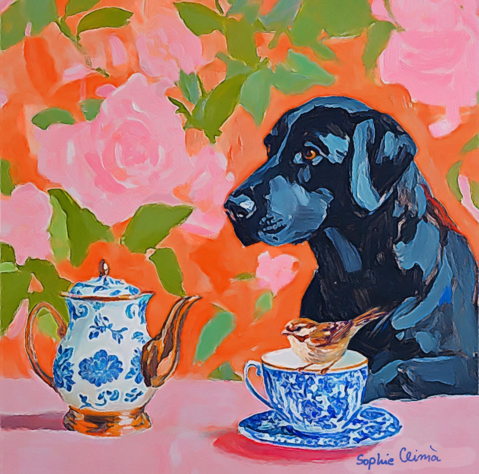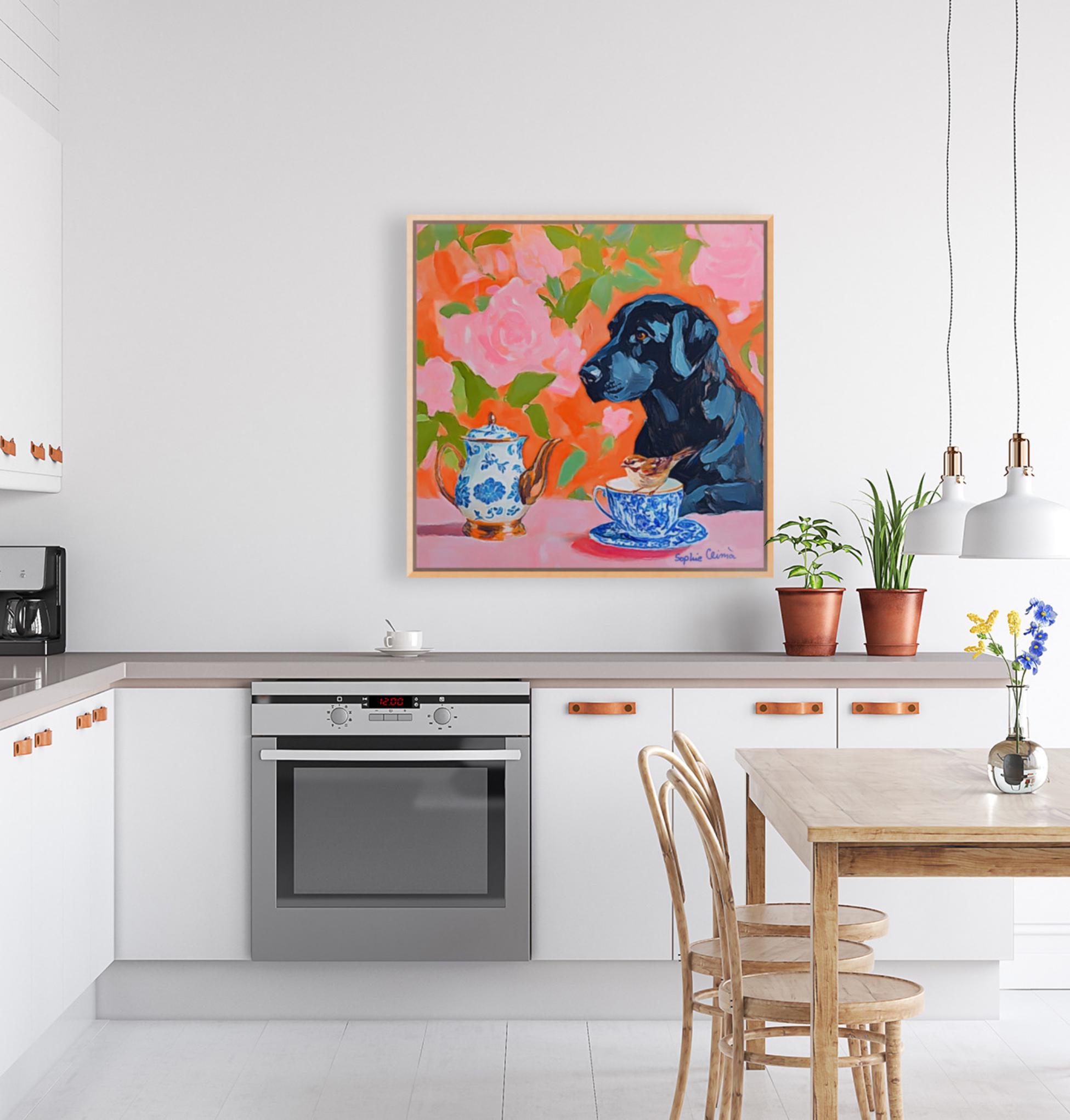 Grandmillennial art, Afternoon tea with a friend, whimsical Labrador art