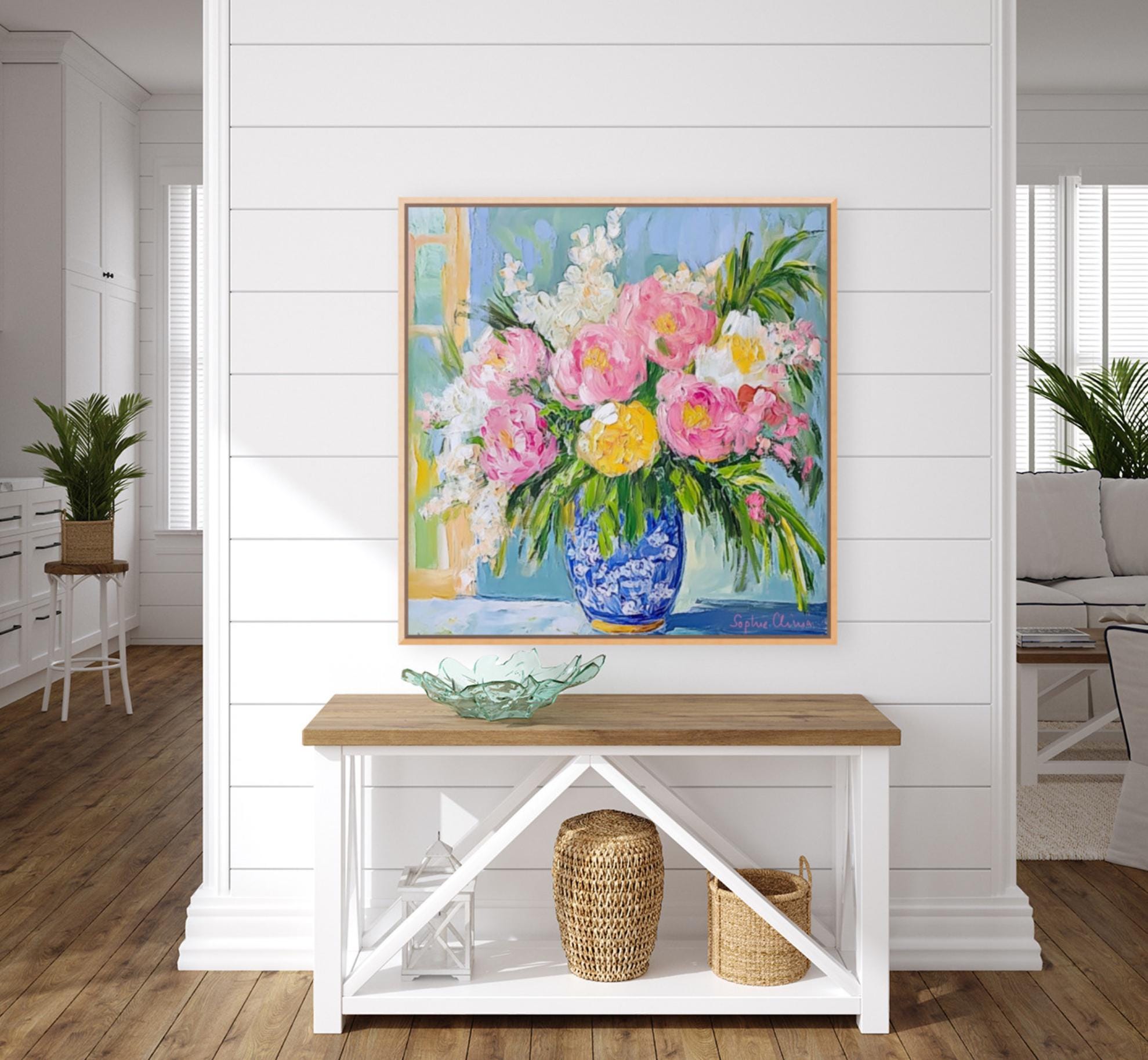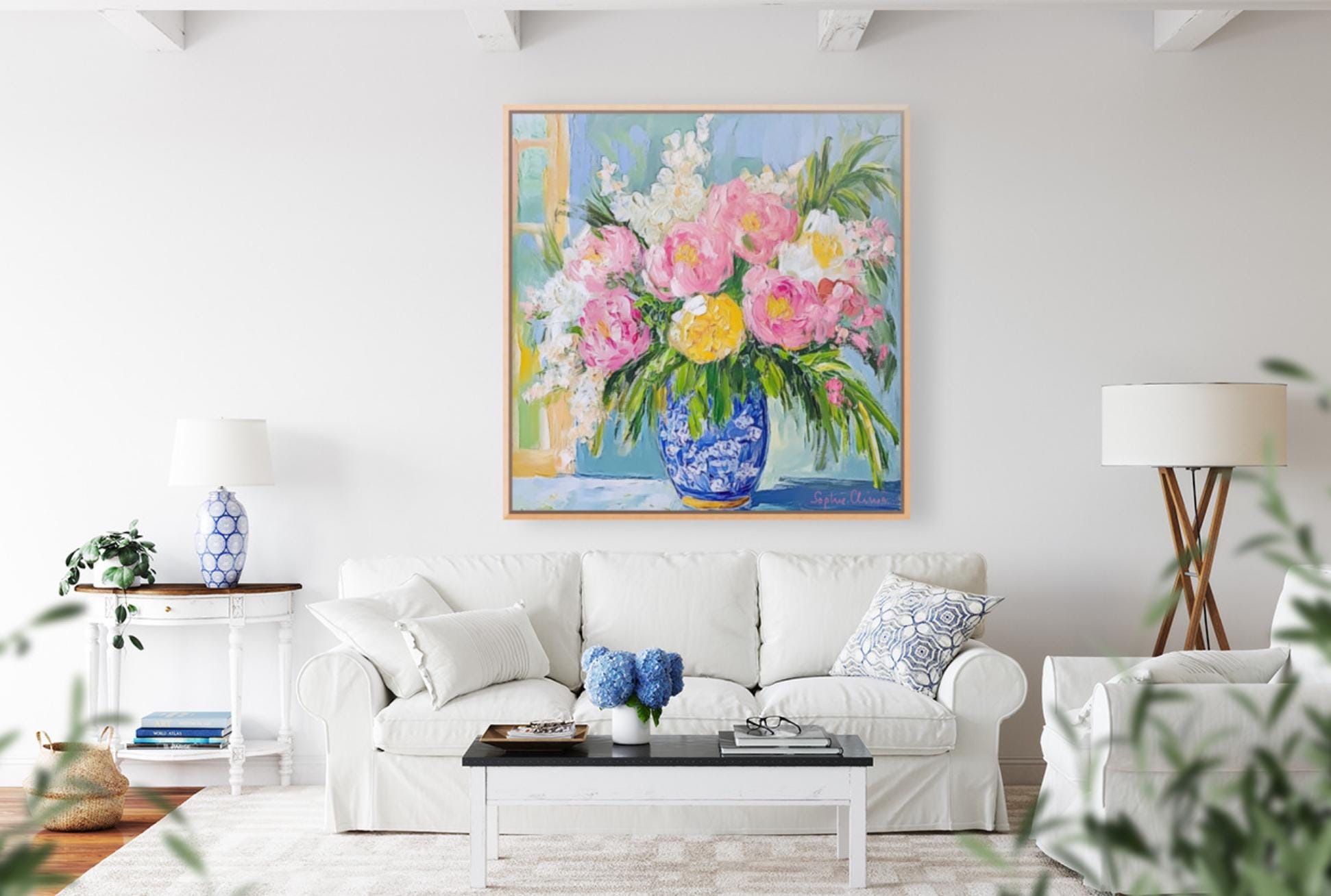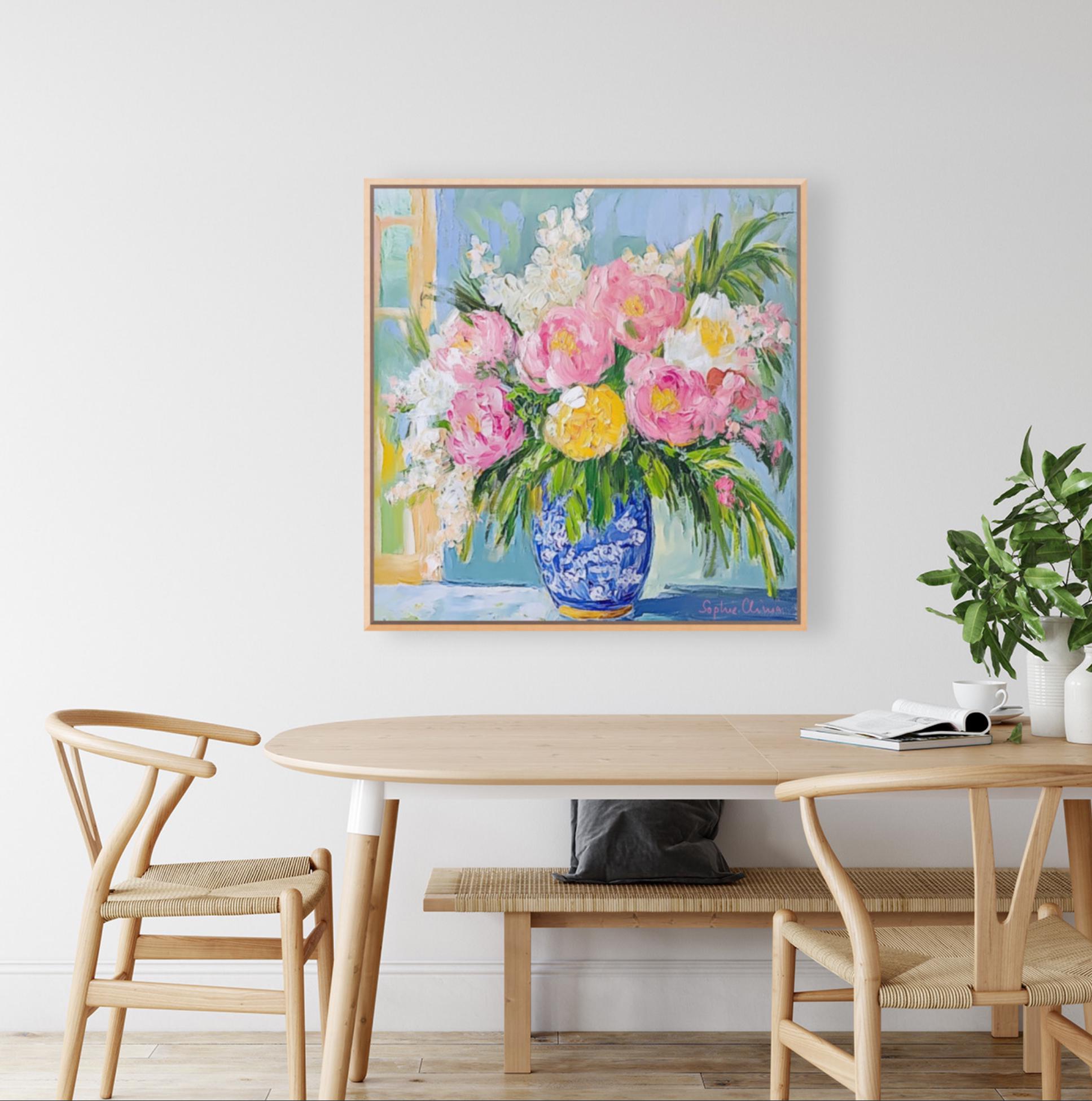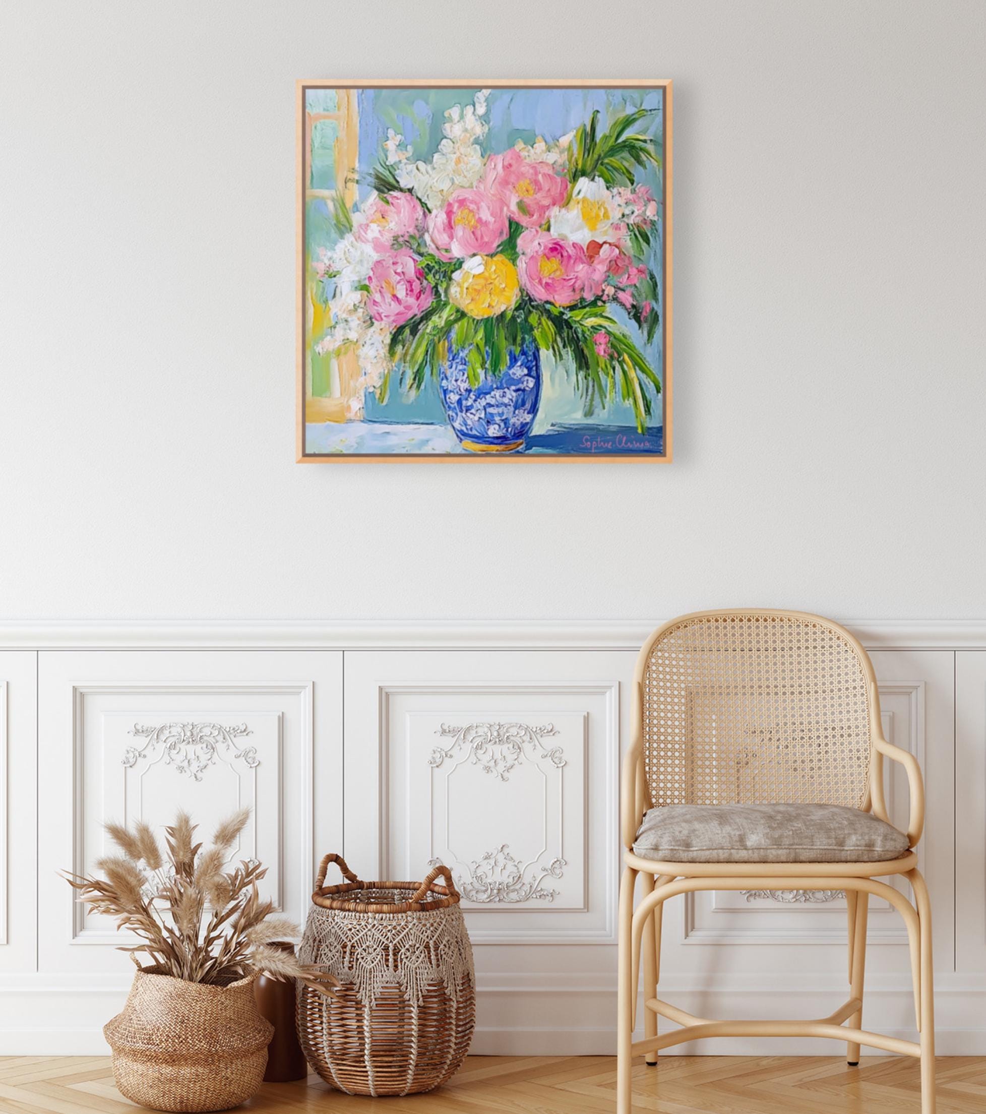 Peonies and cherry blossom, grandmillennial art, still life oil painting