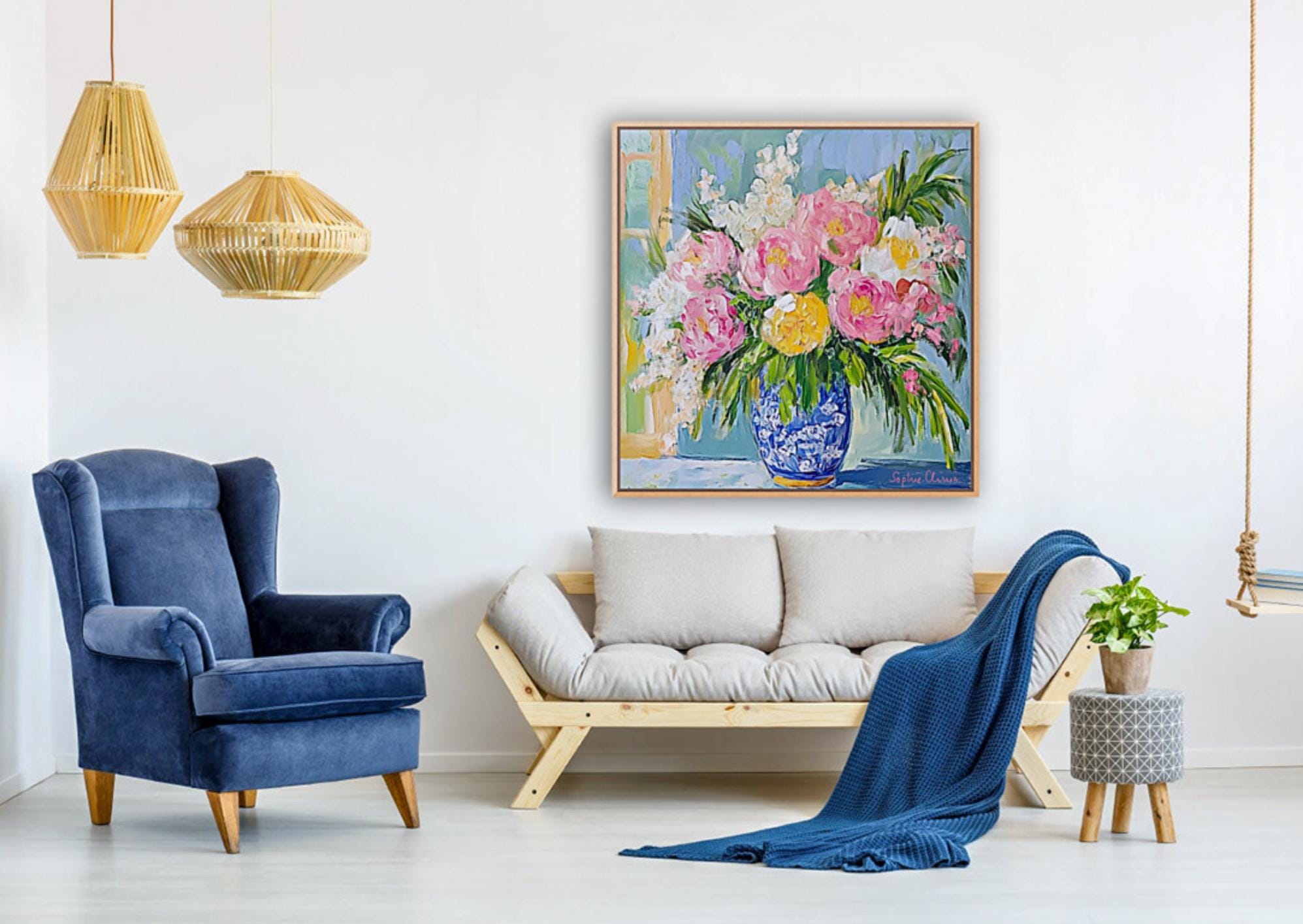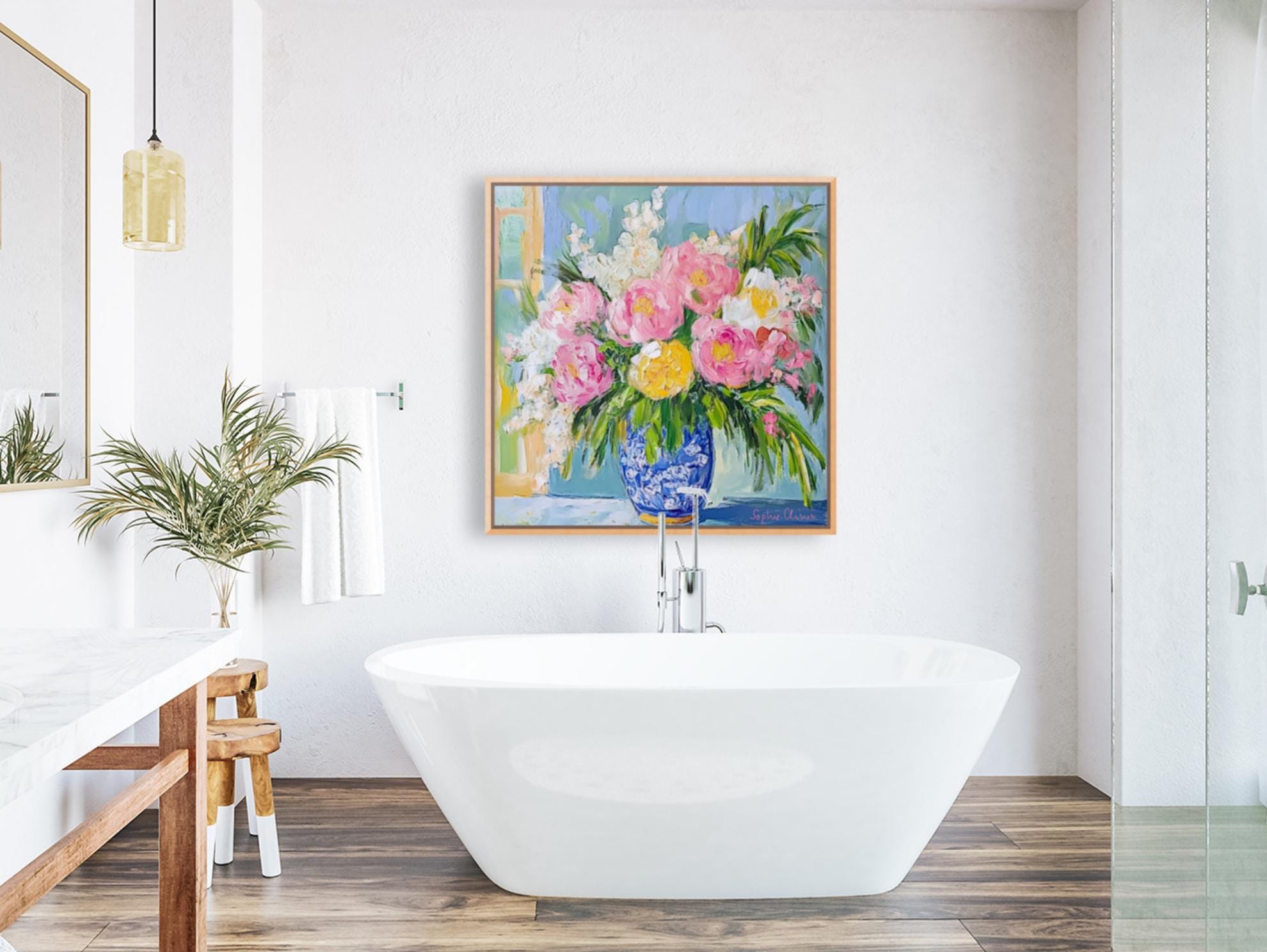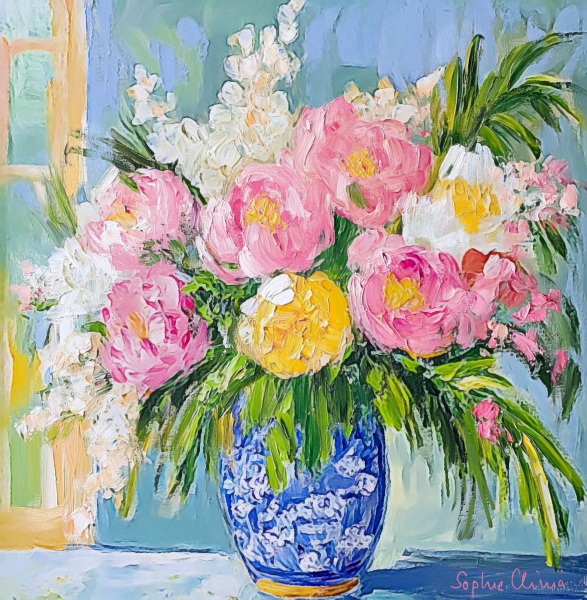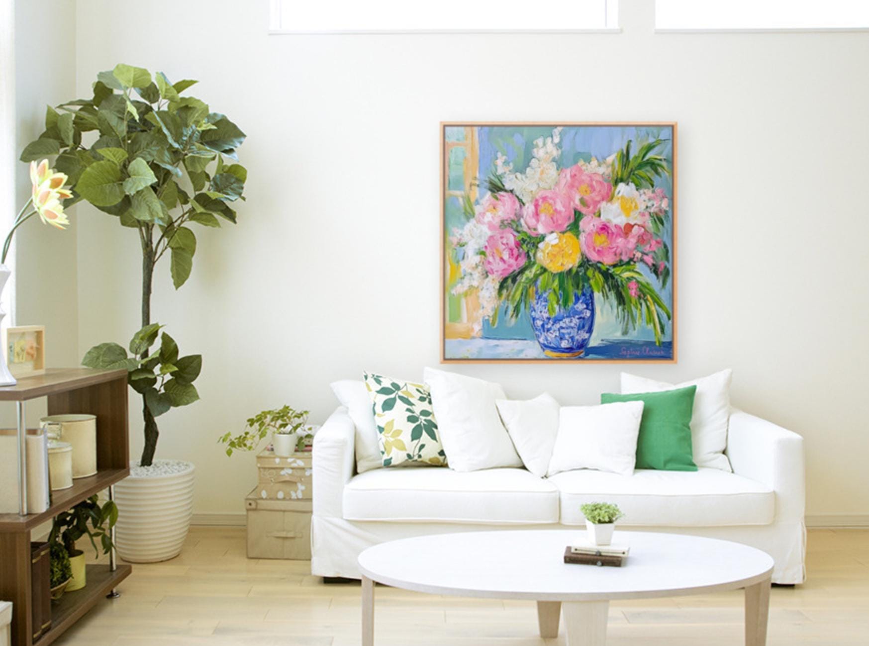Peonies and cherry blossom, grandmillennial art, still life oil painting