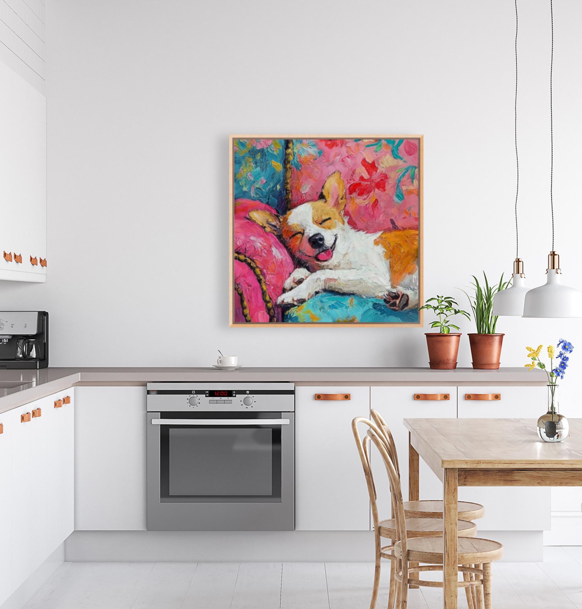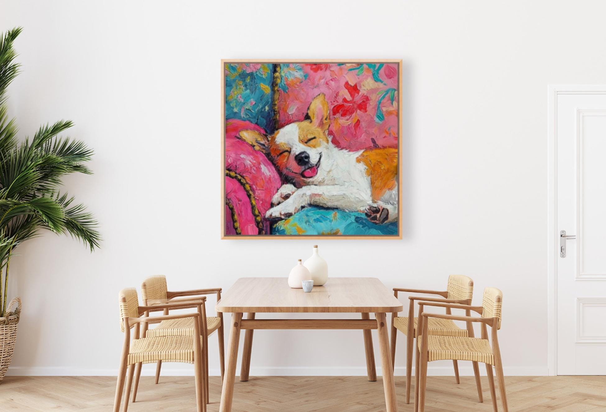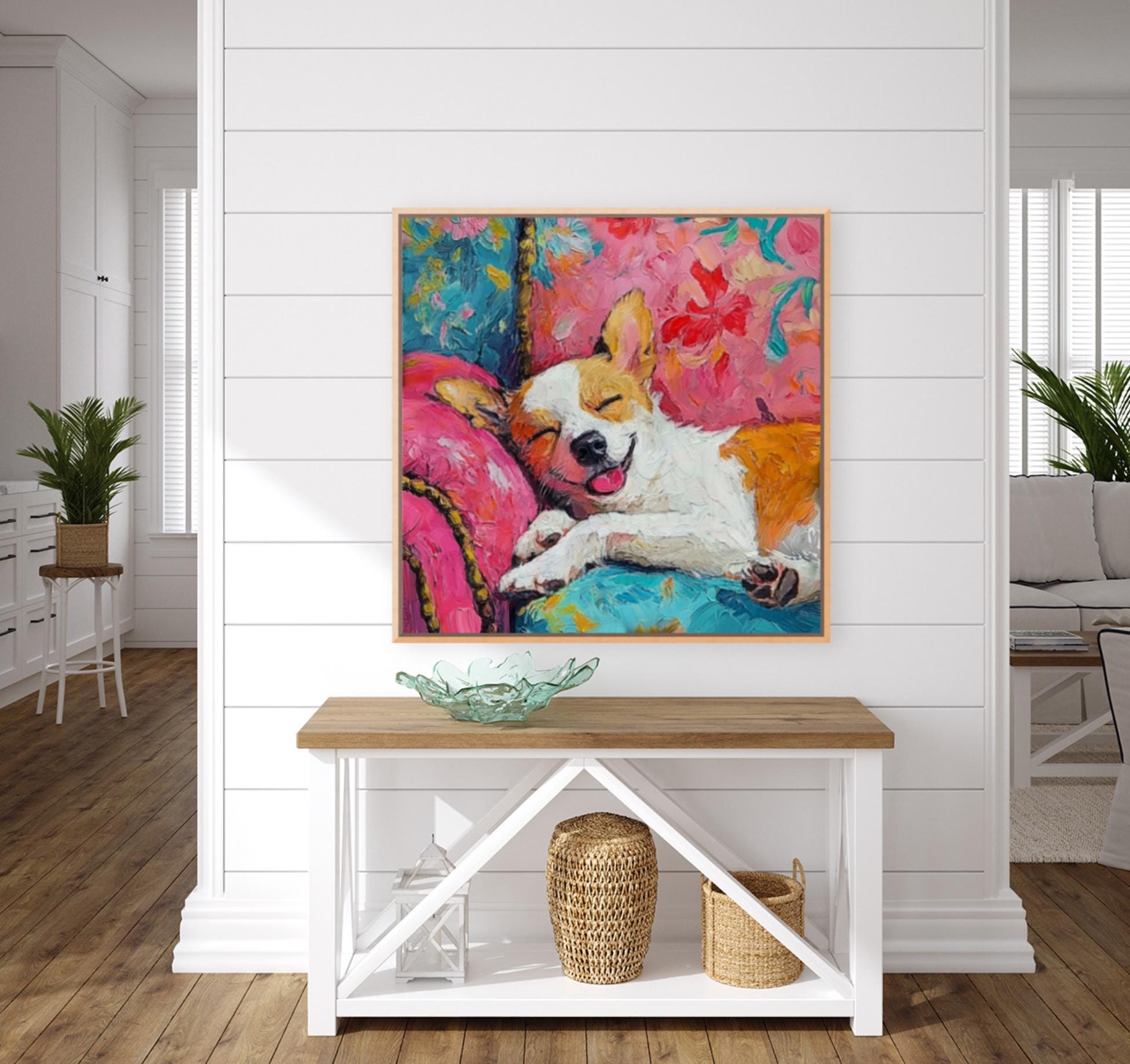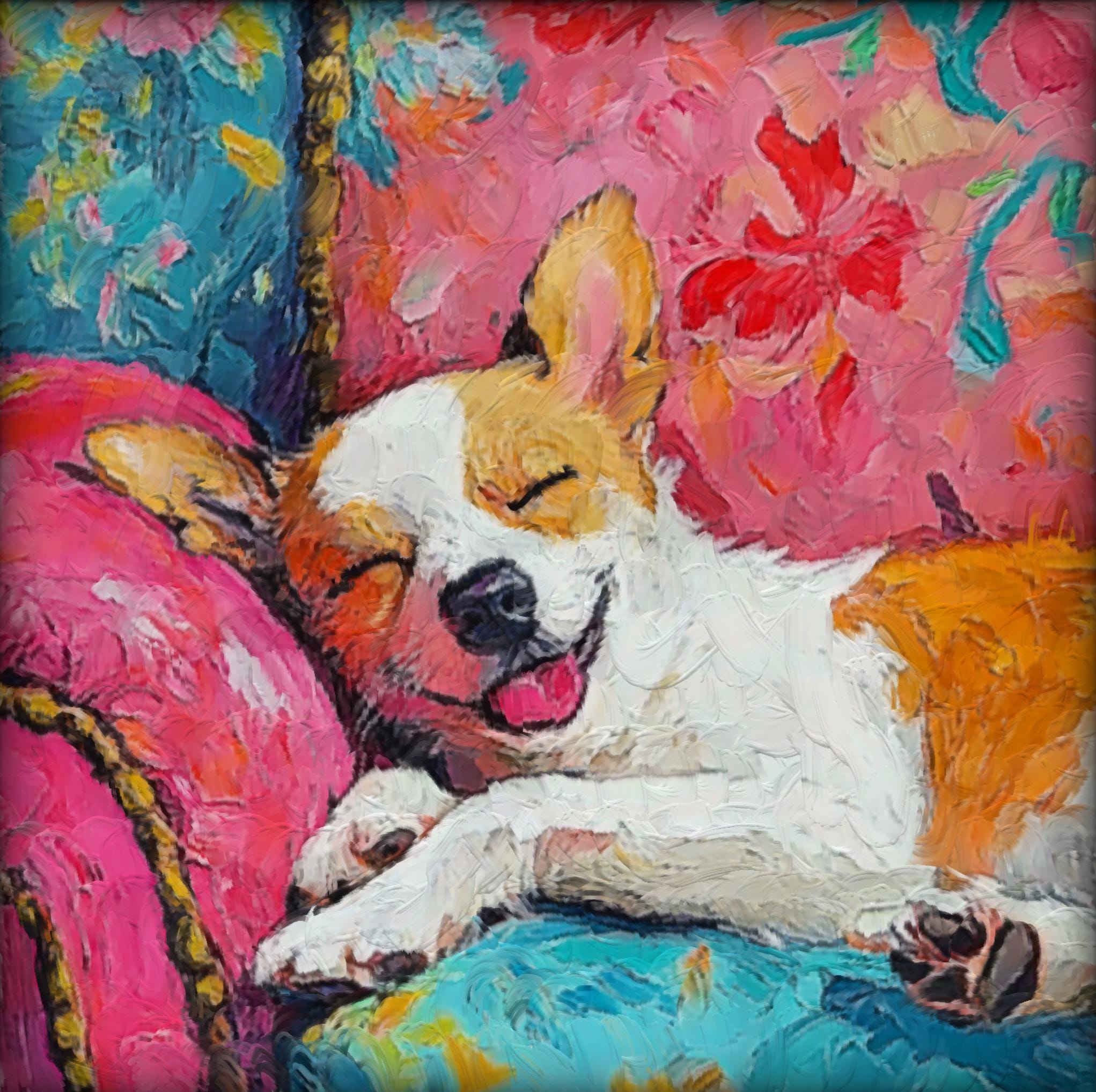 Grandmillennial art, A Sleeping Beauty, whimsical dog art