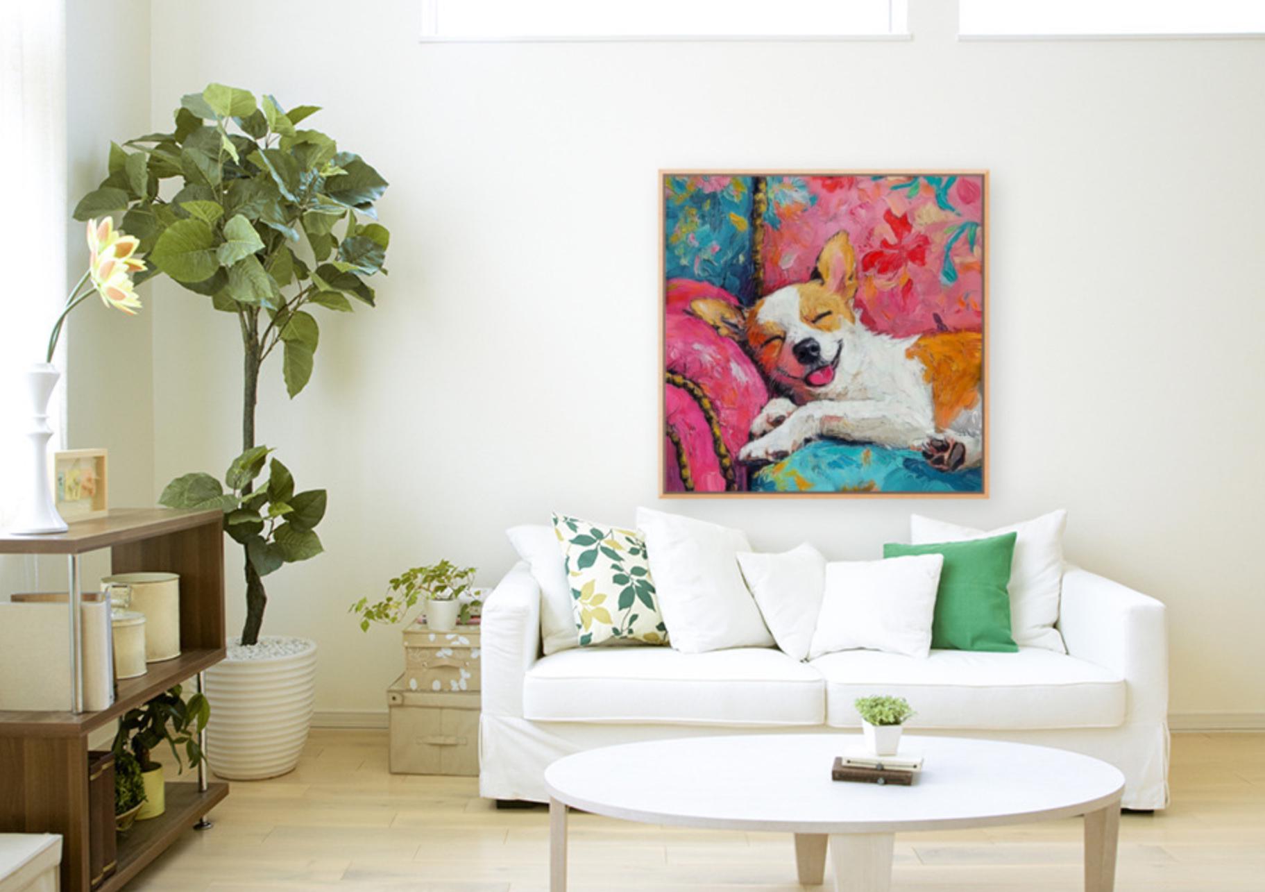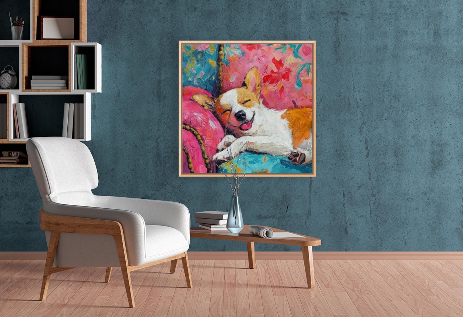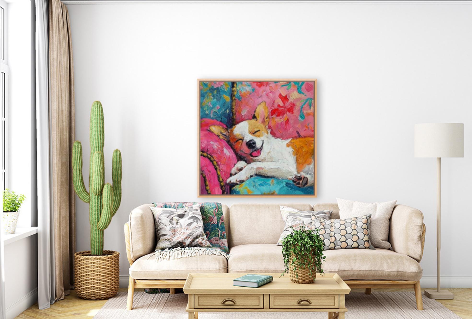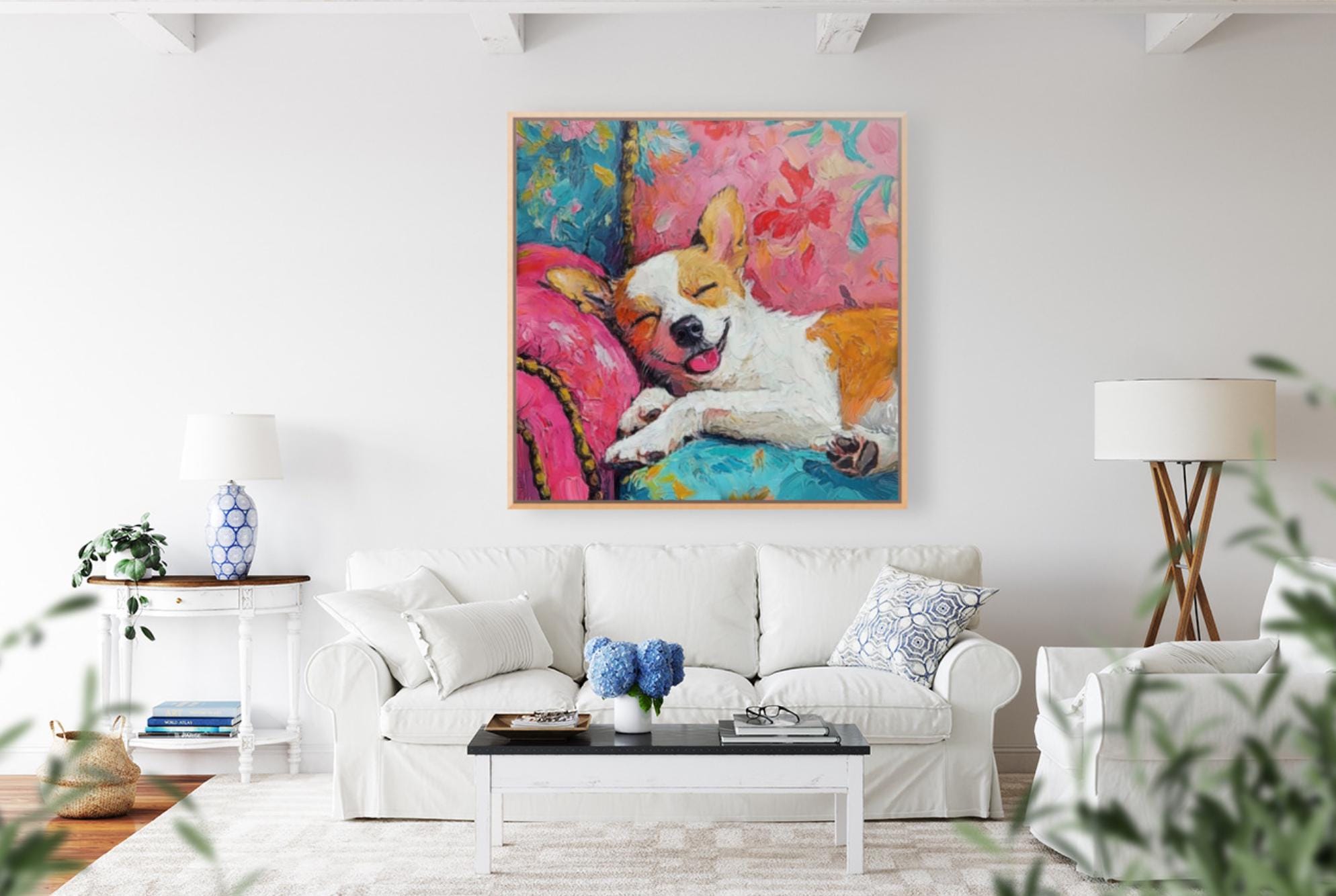 Grandmillennial art, A Sleeping Beauty, whimsical dog art