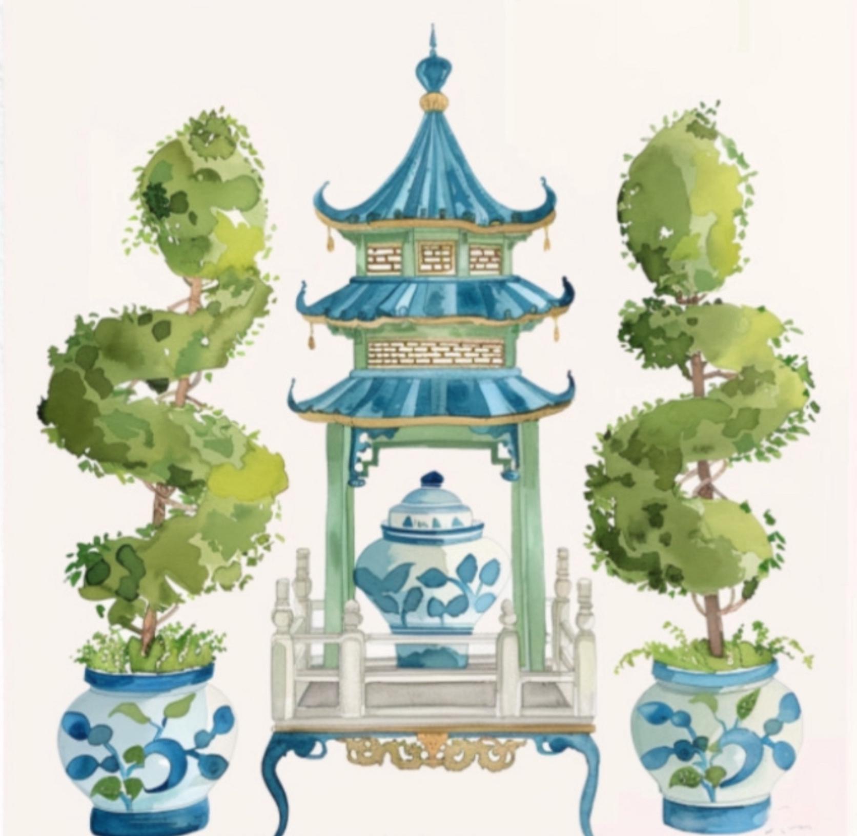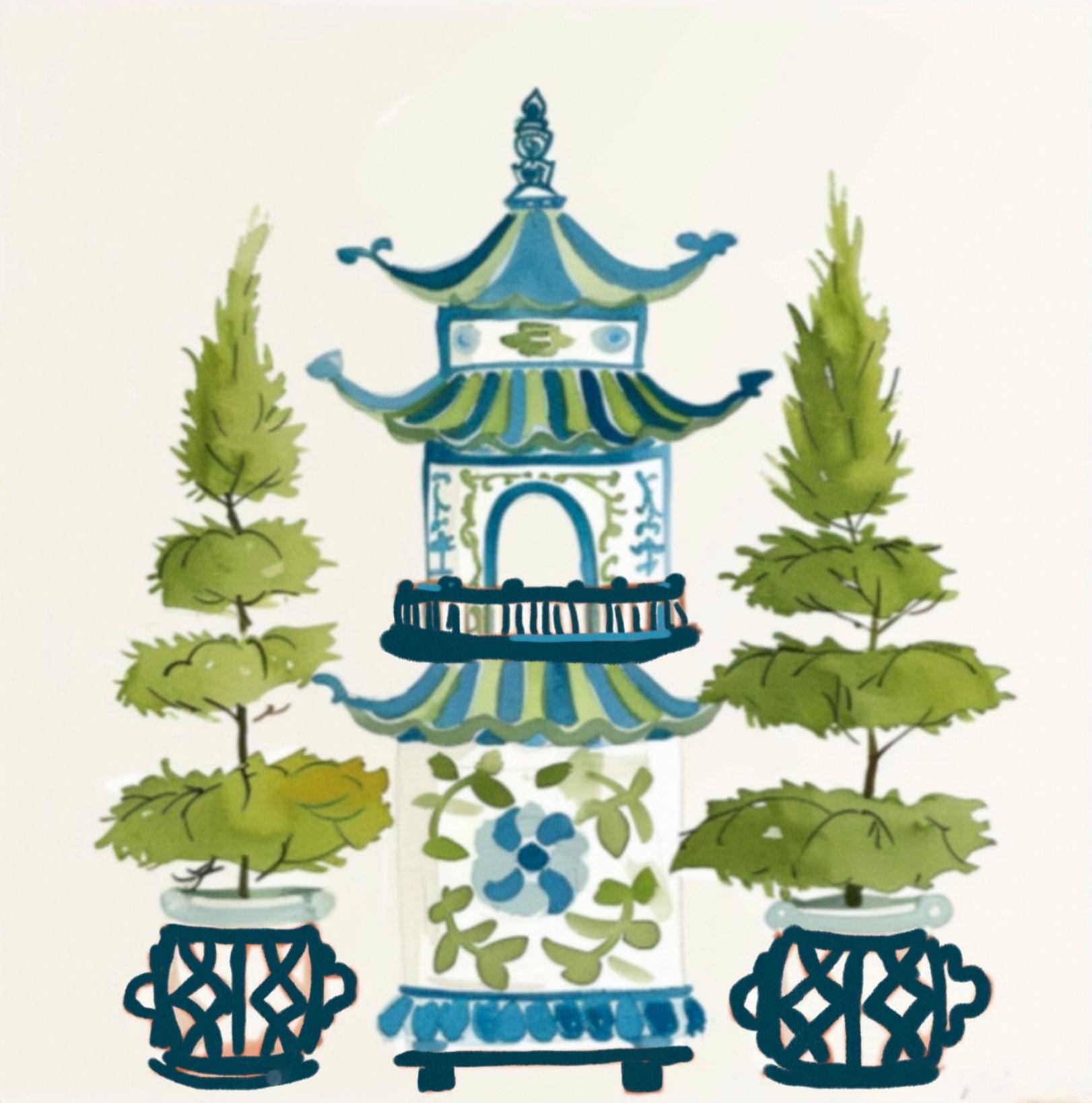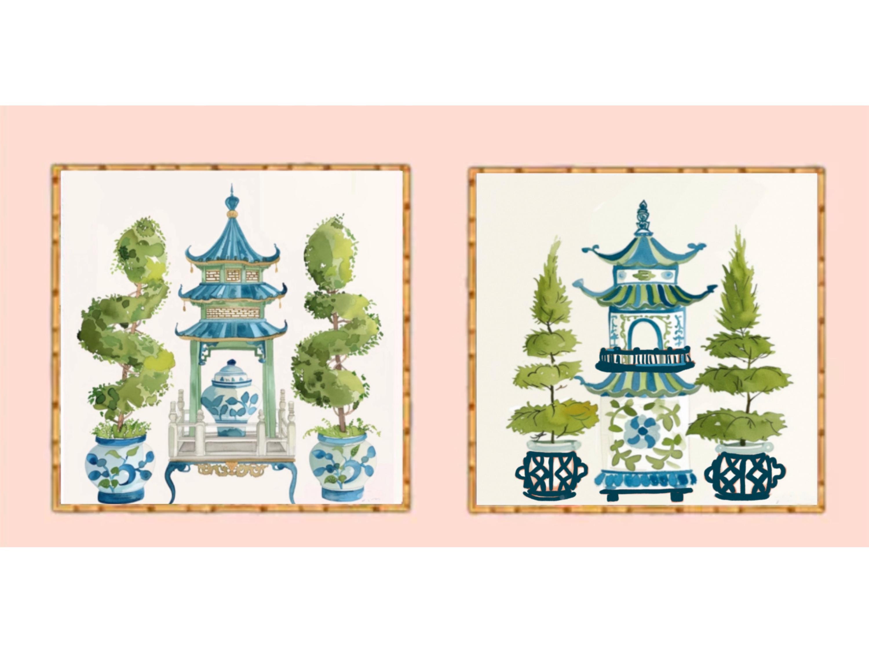 Chinoiserie Pagoda Art Prints, Topiary Garden, Set of 2