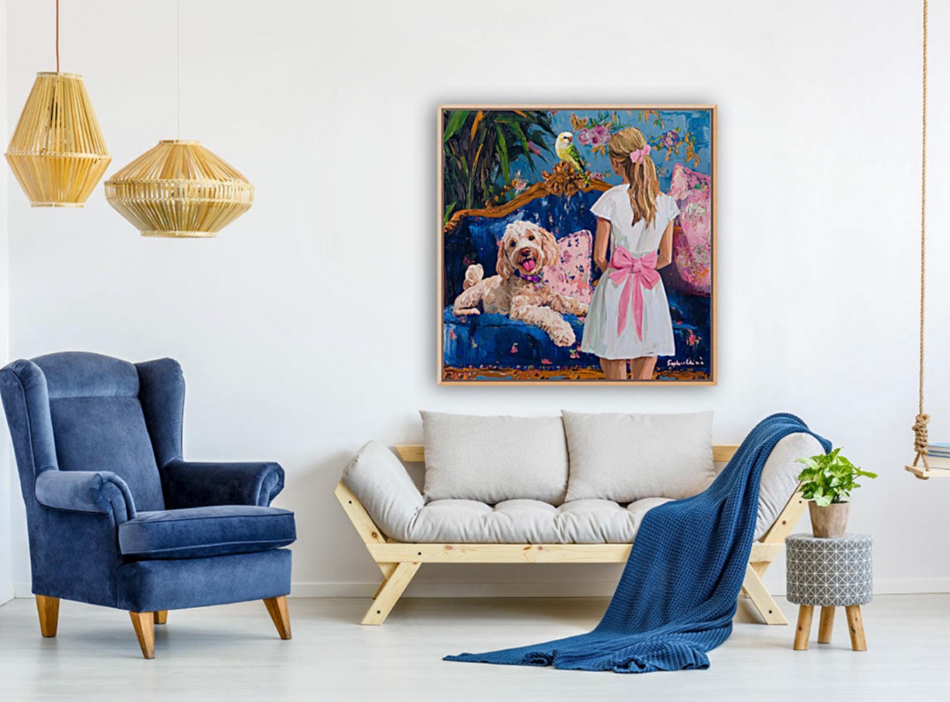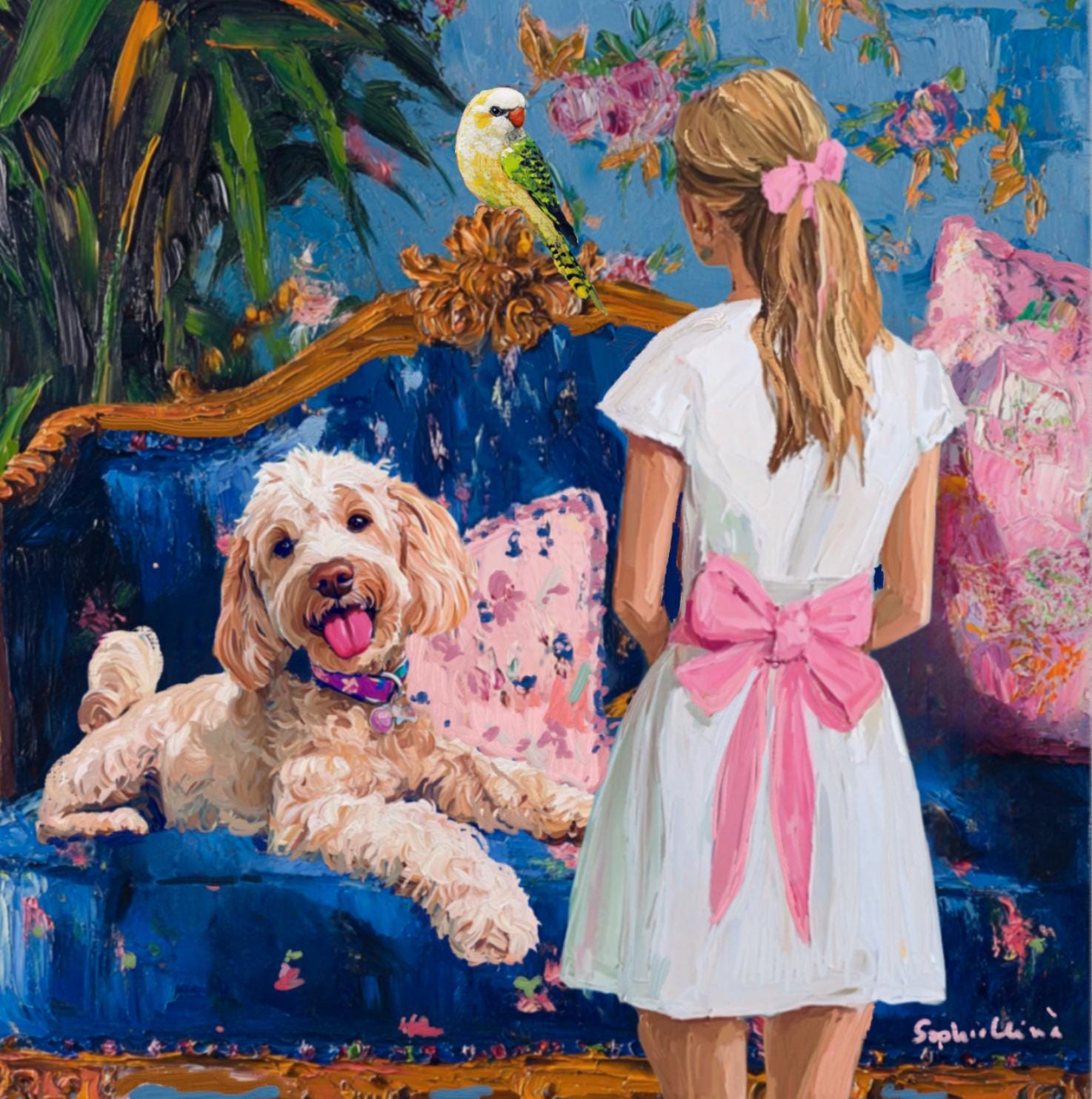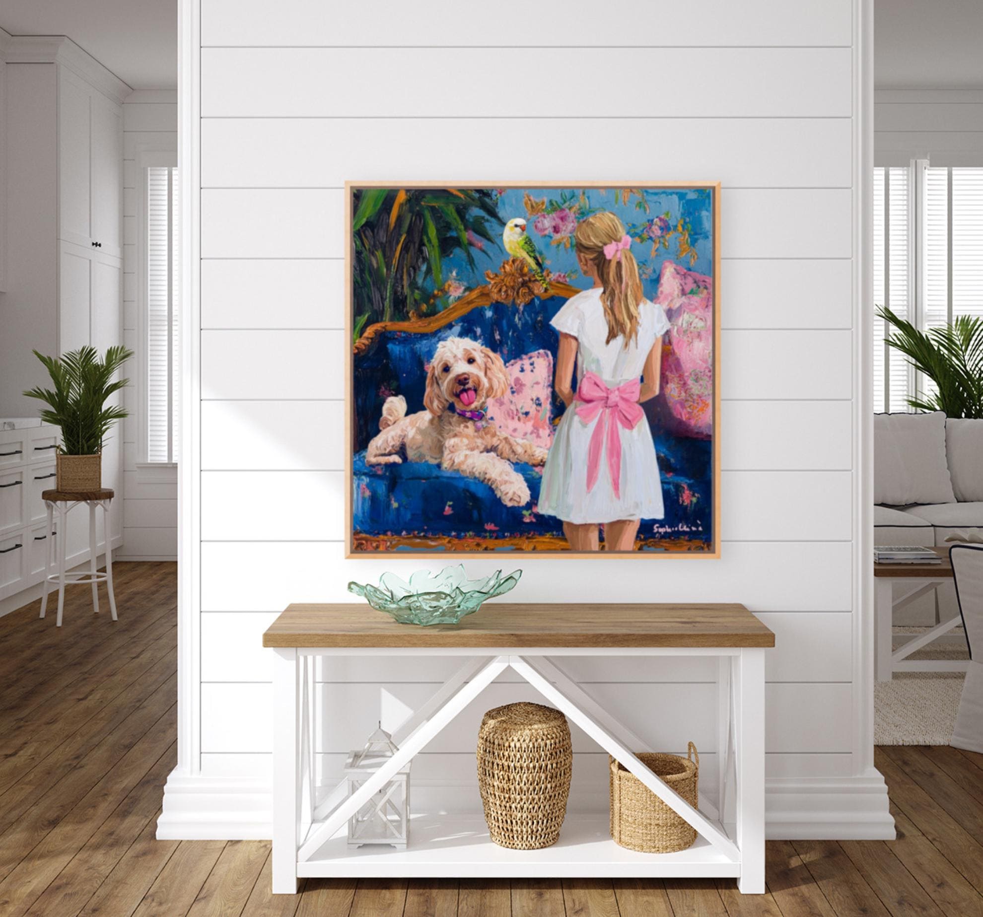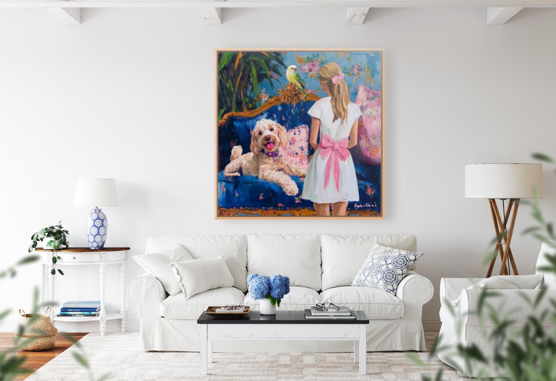 Grandmillennial art, Muddy paws on a blue sofa, preppy whimsical art