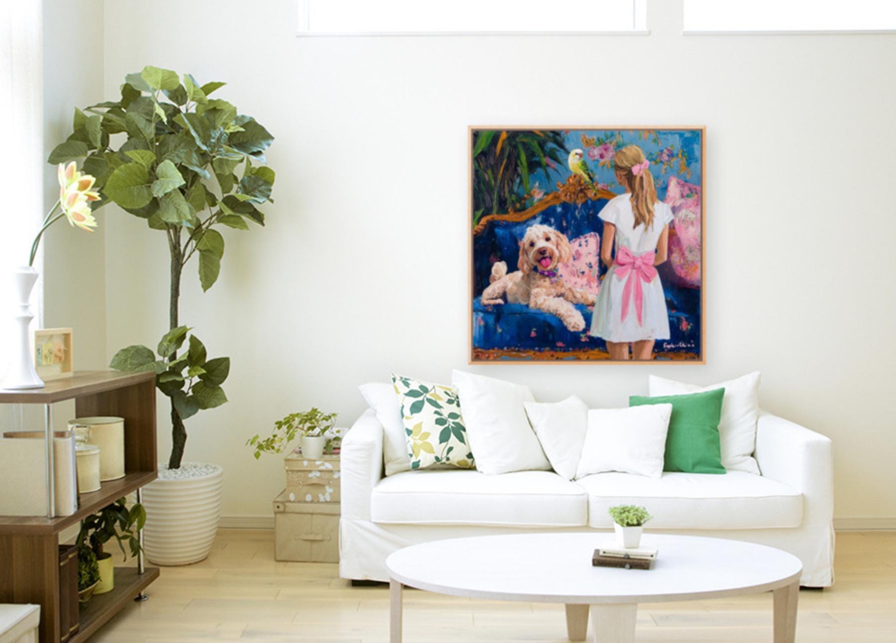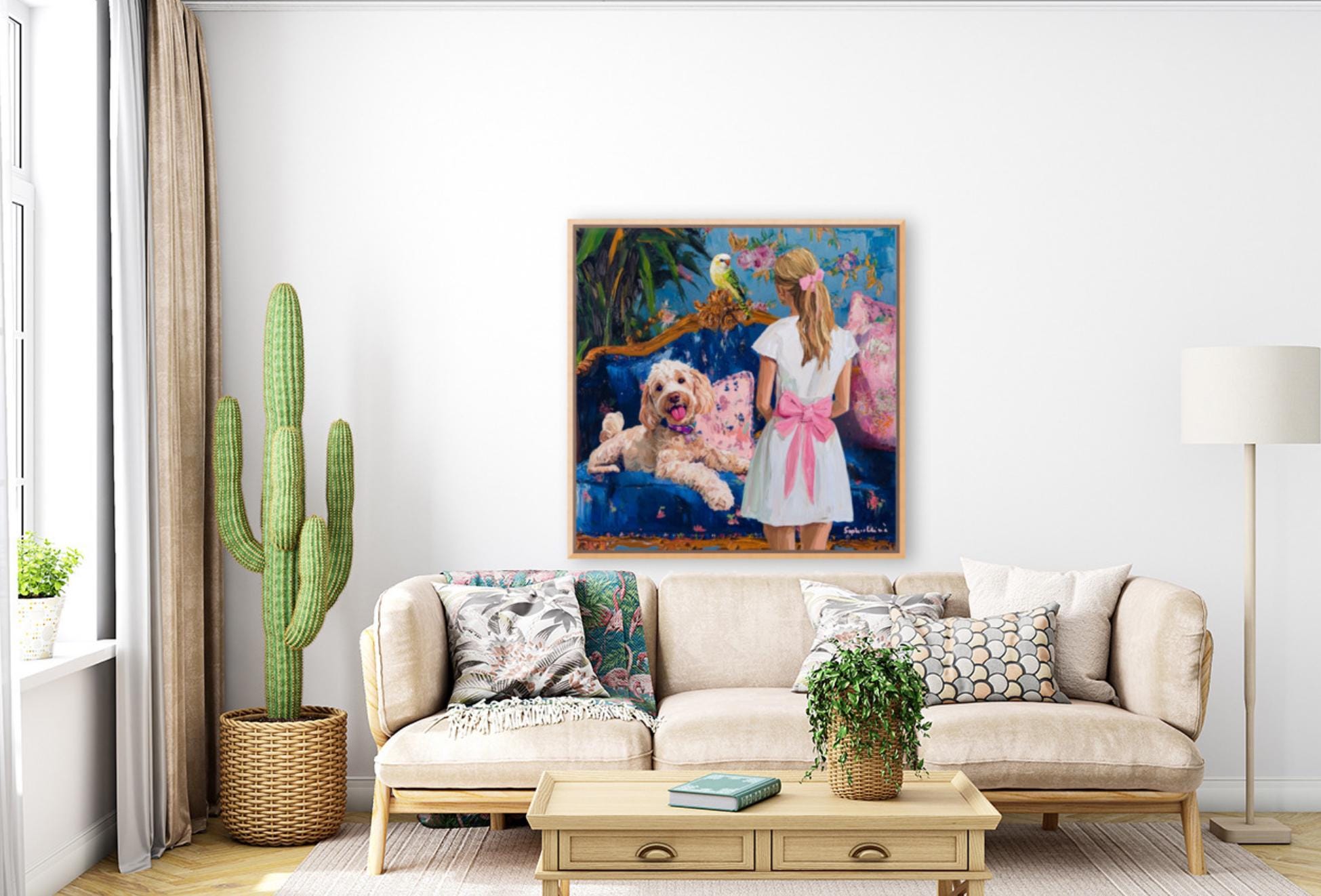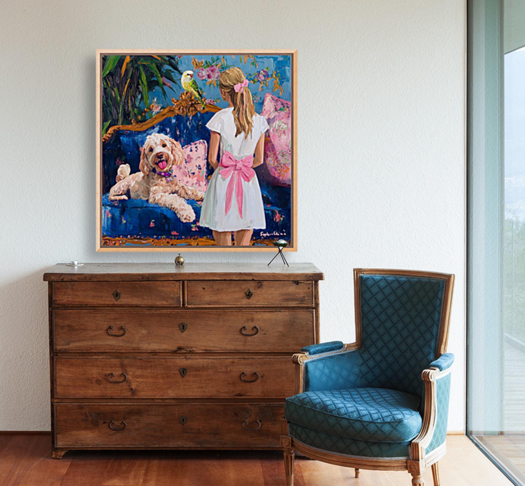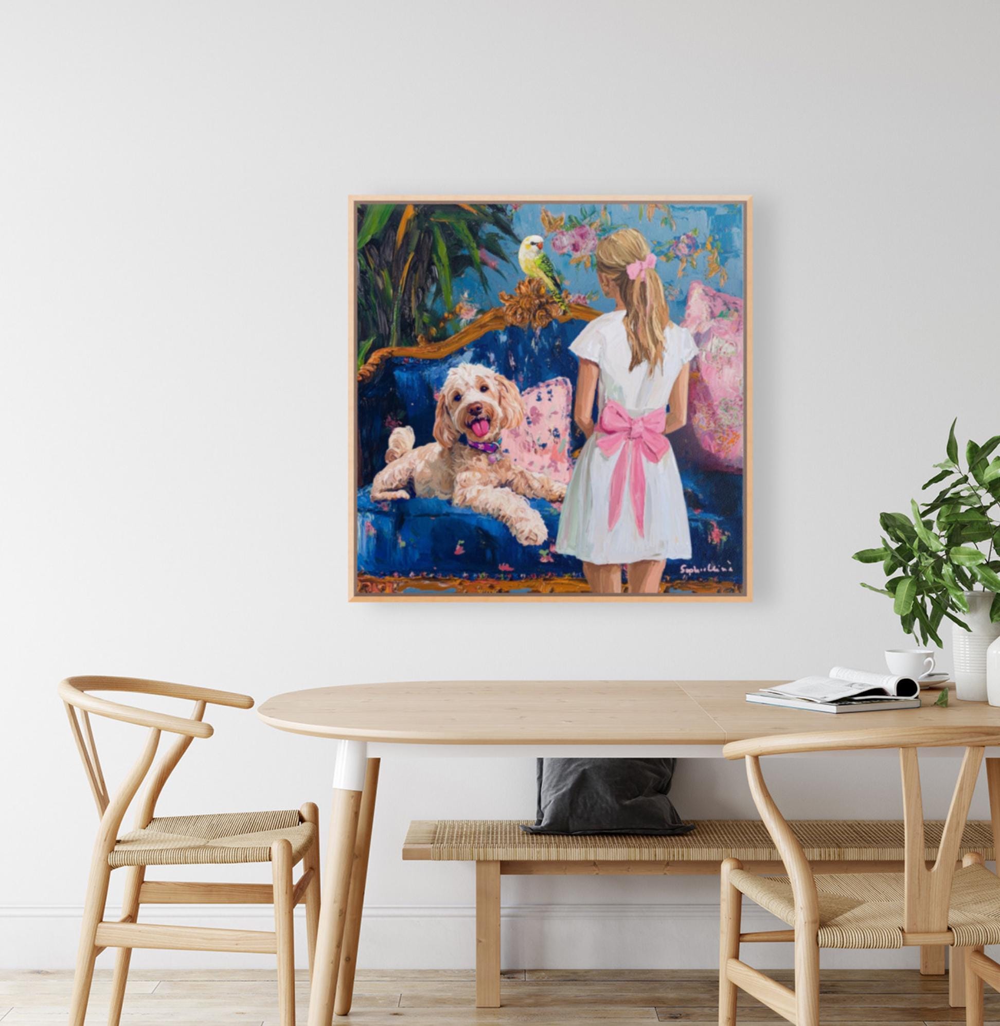 Grandmillennial art, Muddy paws on a blue sofa, preppy whimsical art
