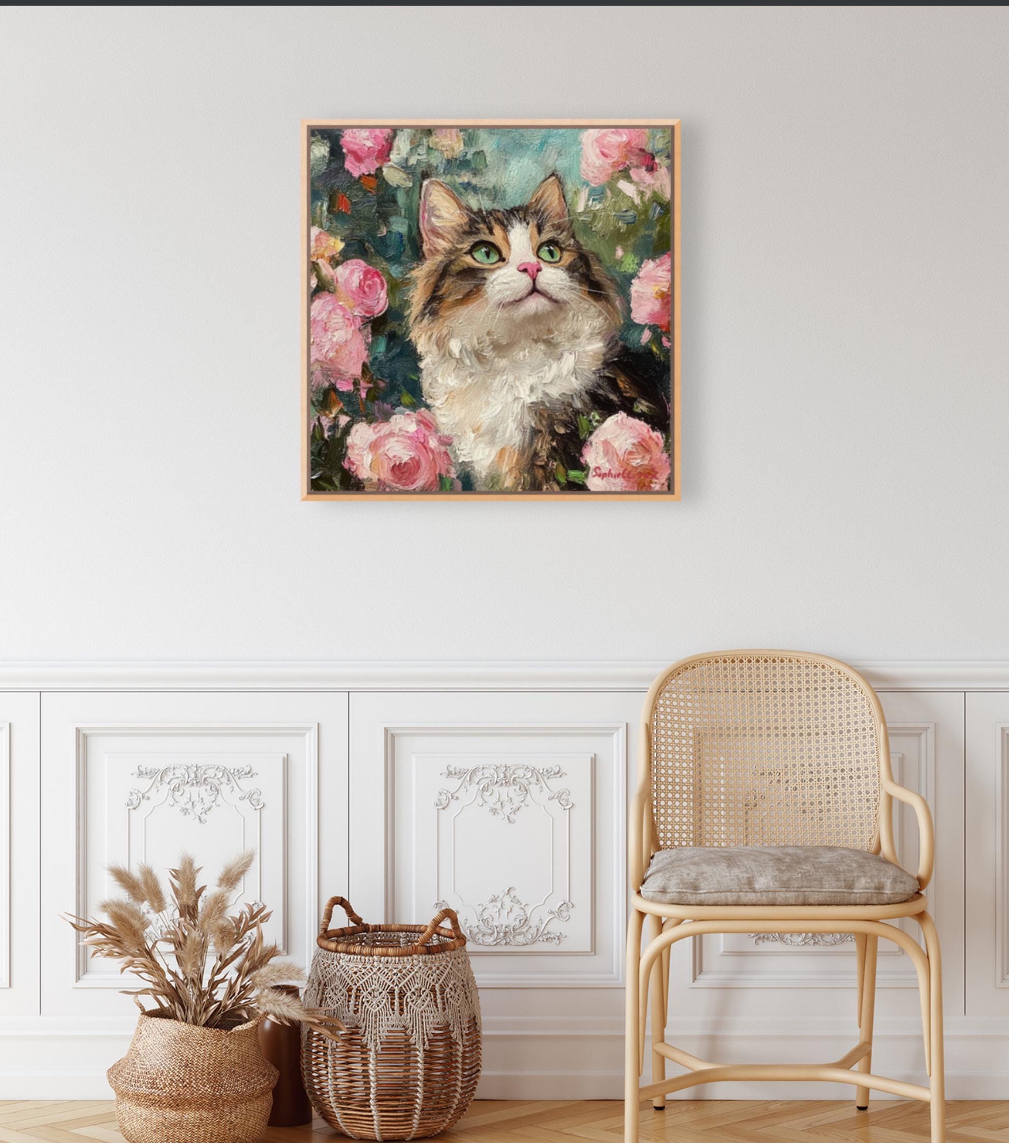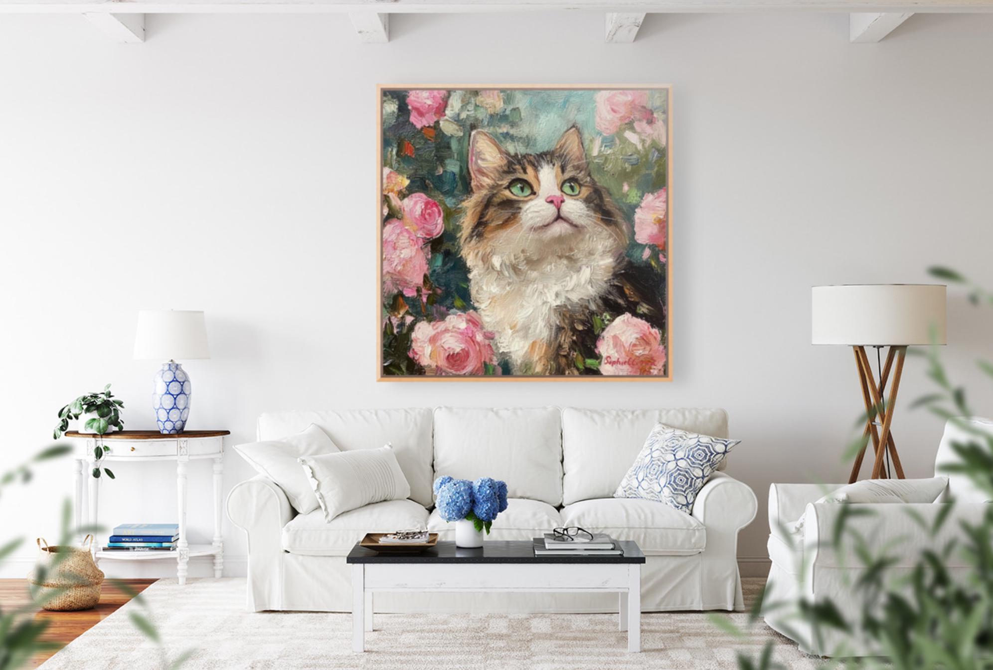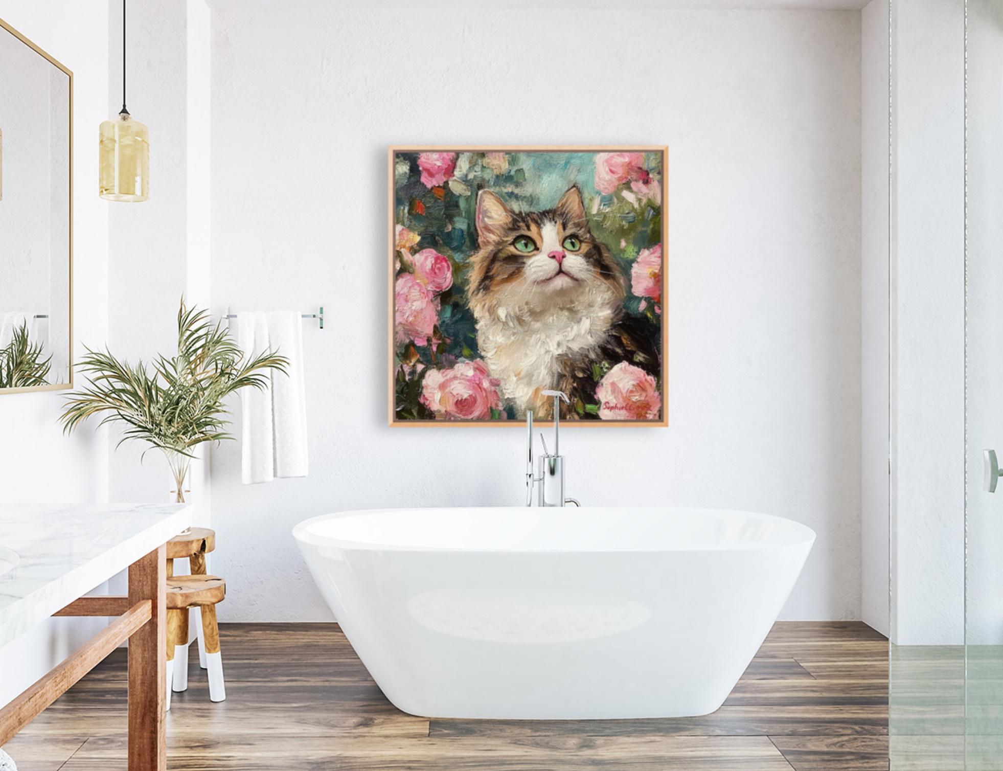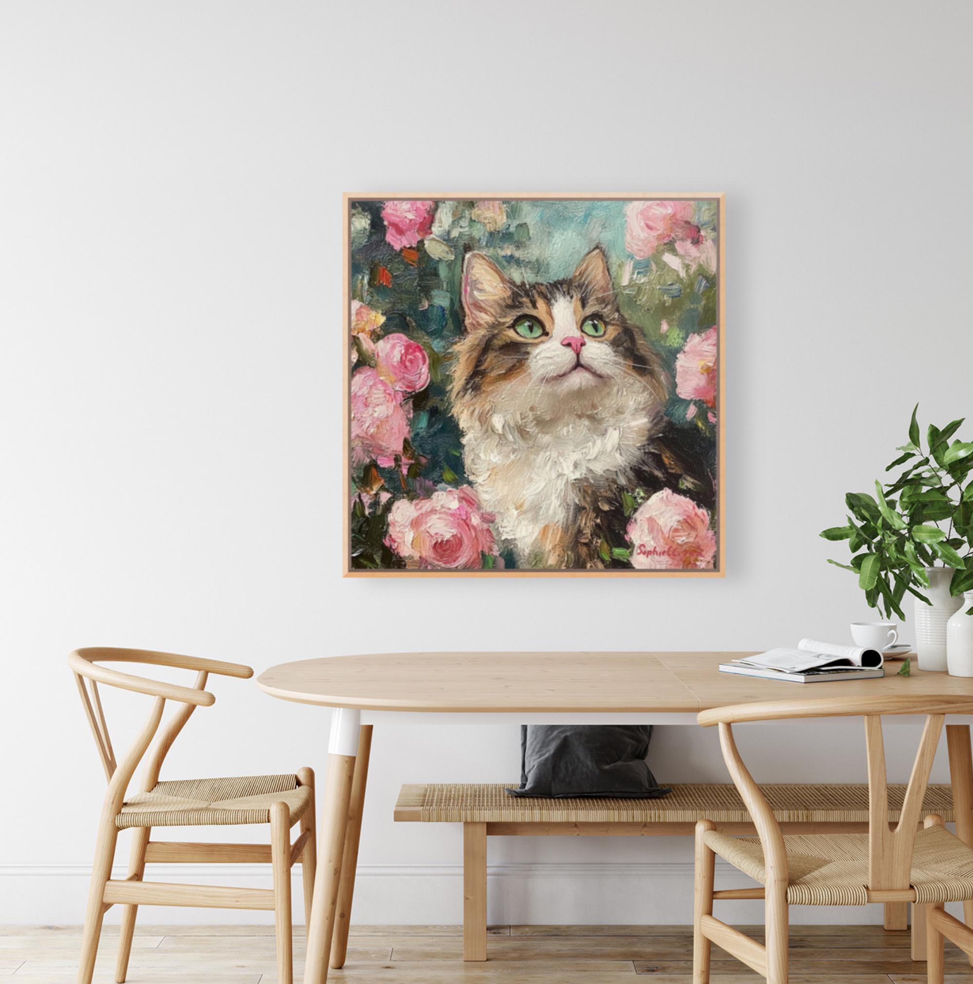 Grandmillennial art, Kitty in a rose garden, whimsical cat art