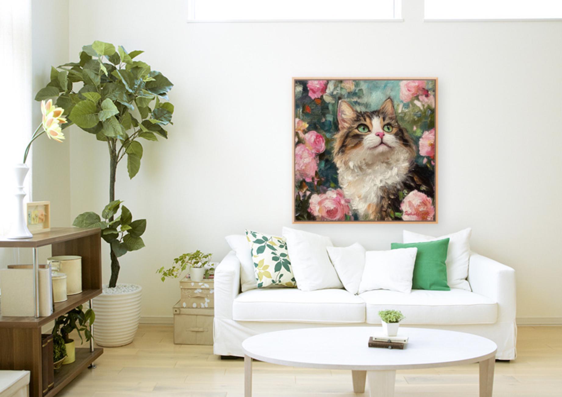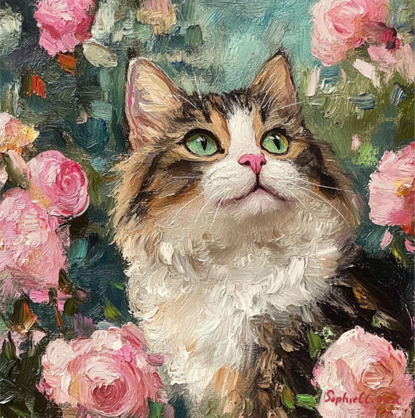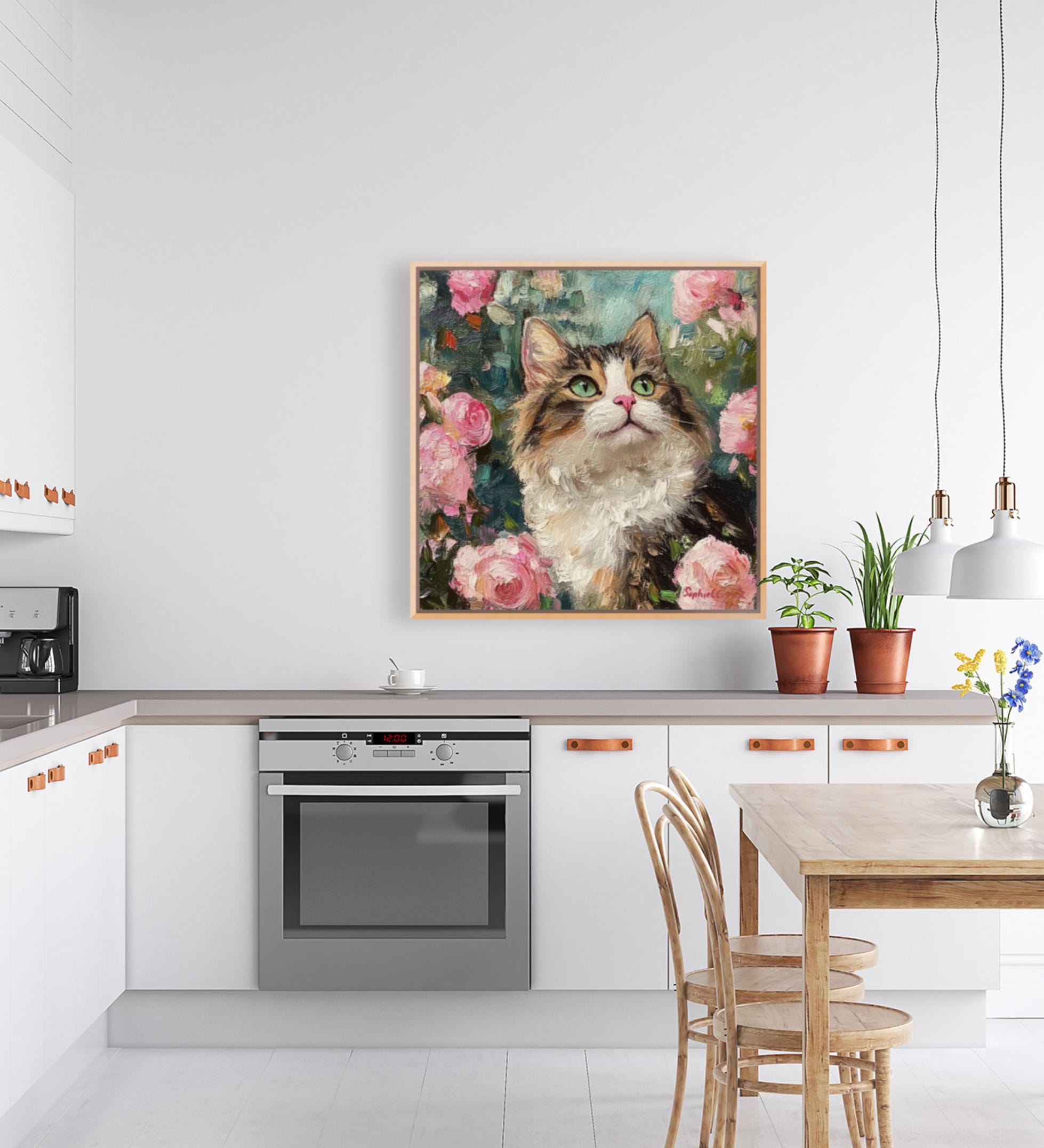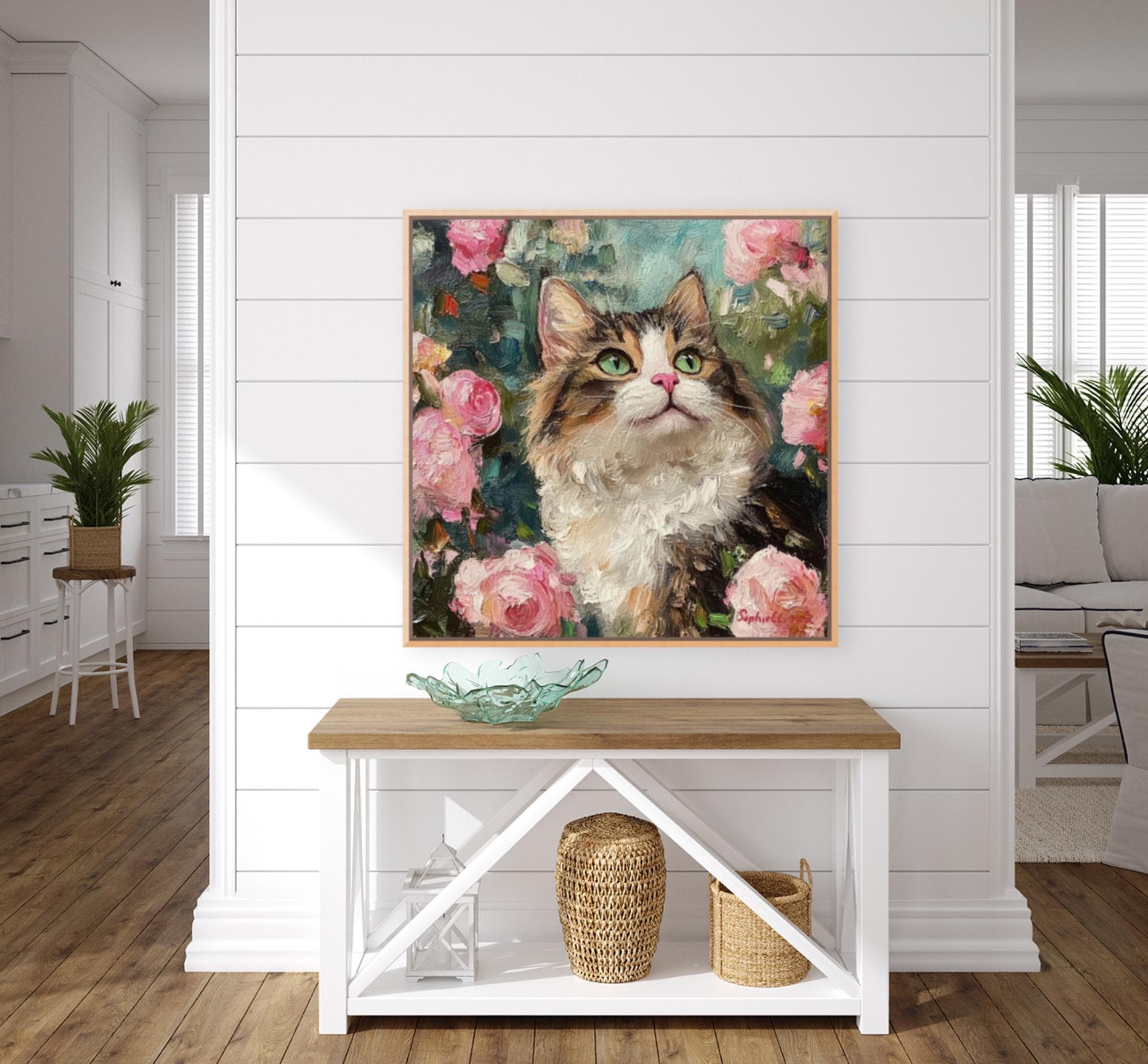 Grandmillennial art, Kitty in a rose garden, whimsical cat art