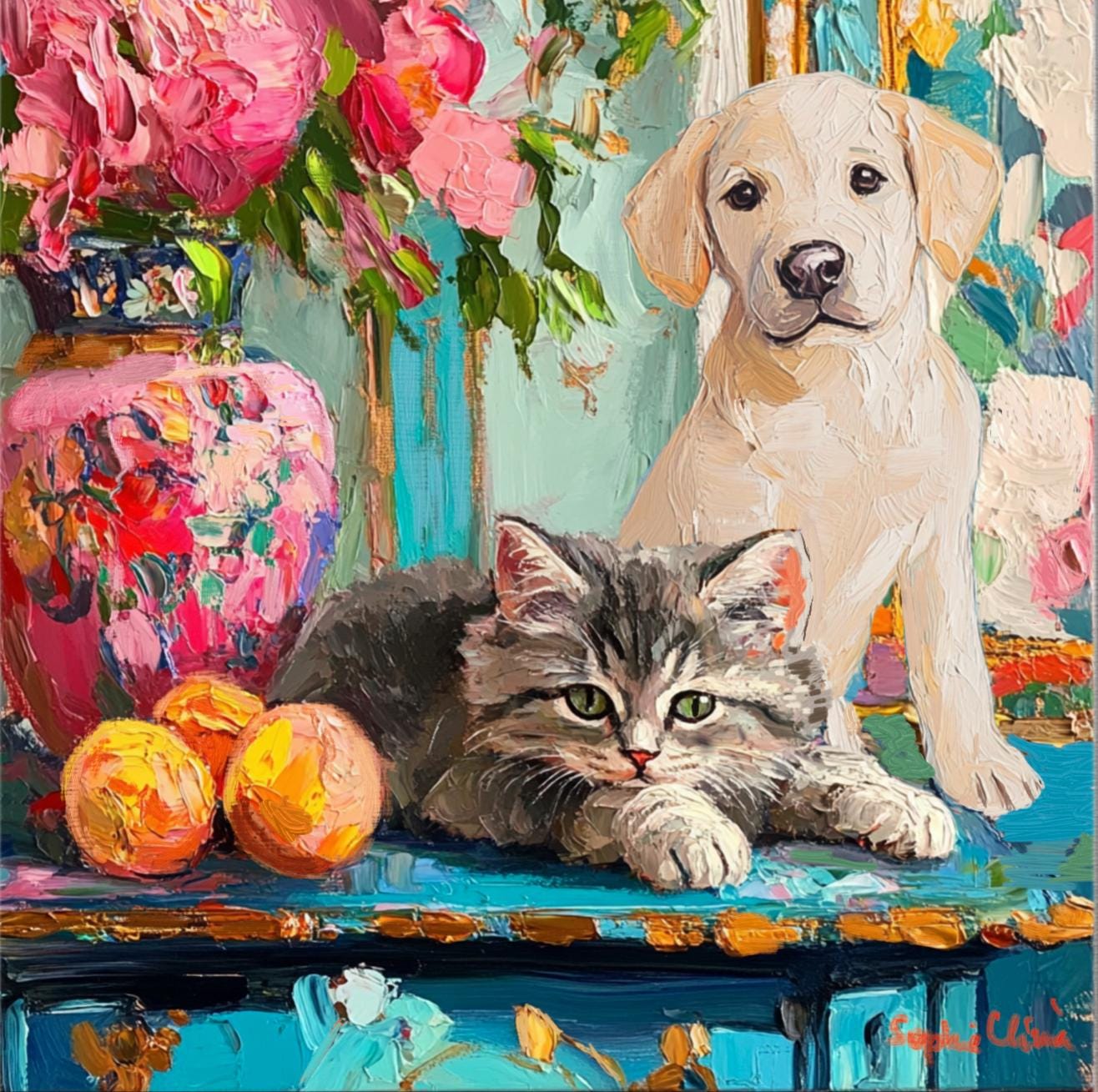 Sophie's art is the modern interpretation of Chinese artistic traditions featuring pagodas, landscapes, blue and white porcelain, ginger jars, pagodas, cheetahs and monkeys. Sophie developed her own recognizable style with bright colors and whimsical details.