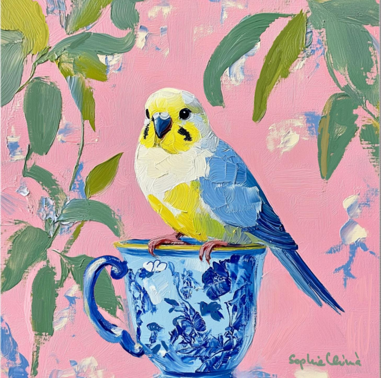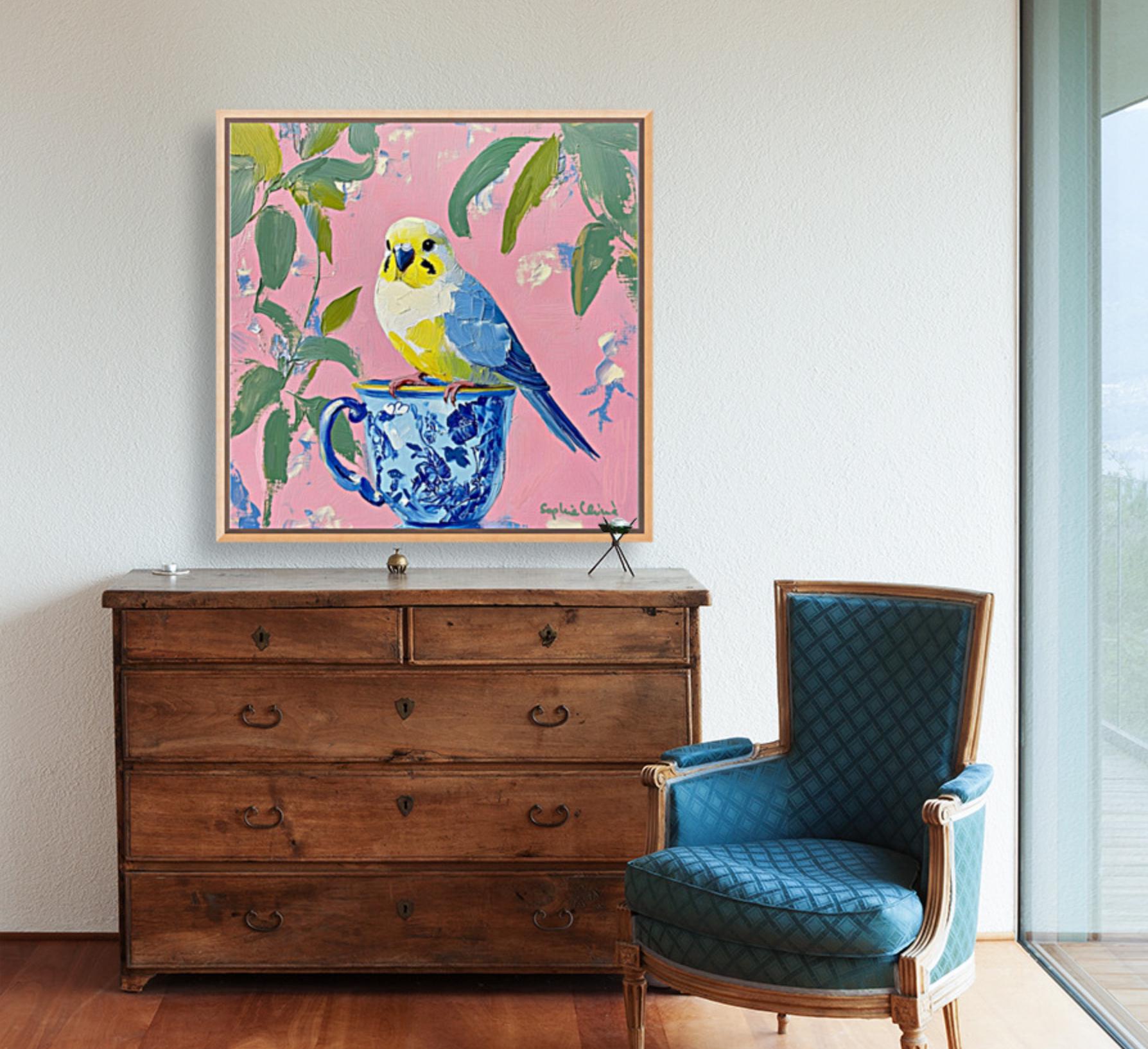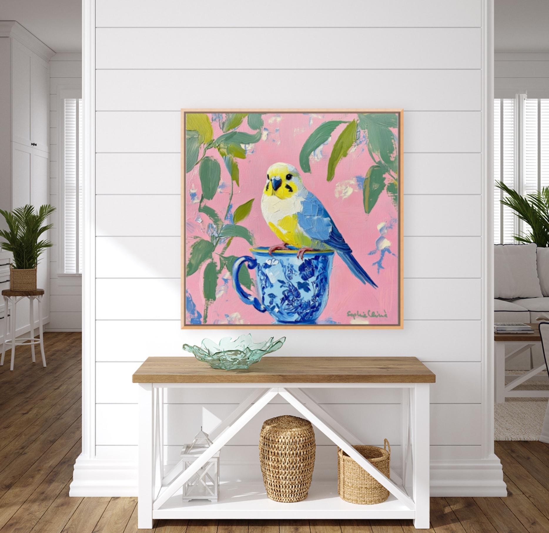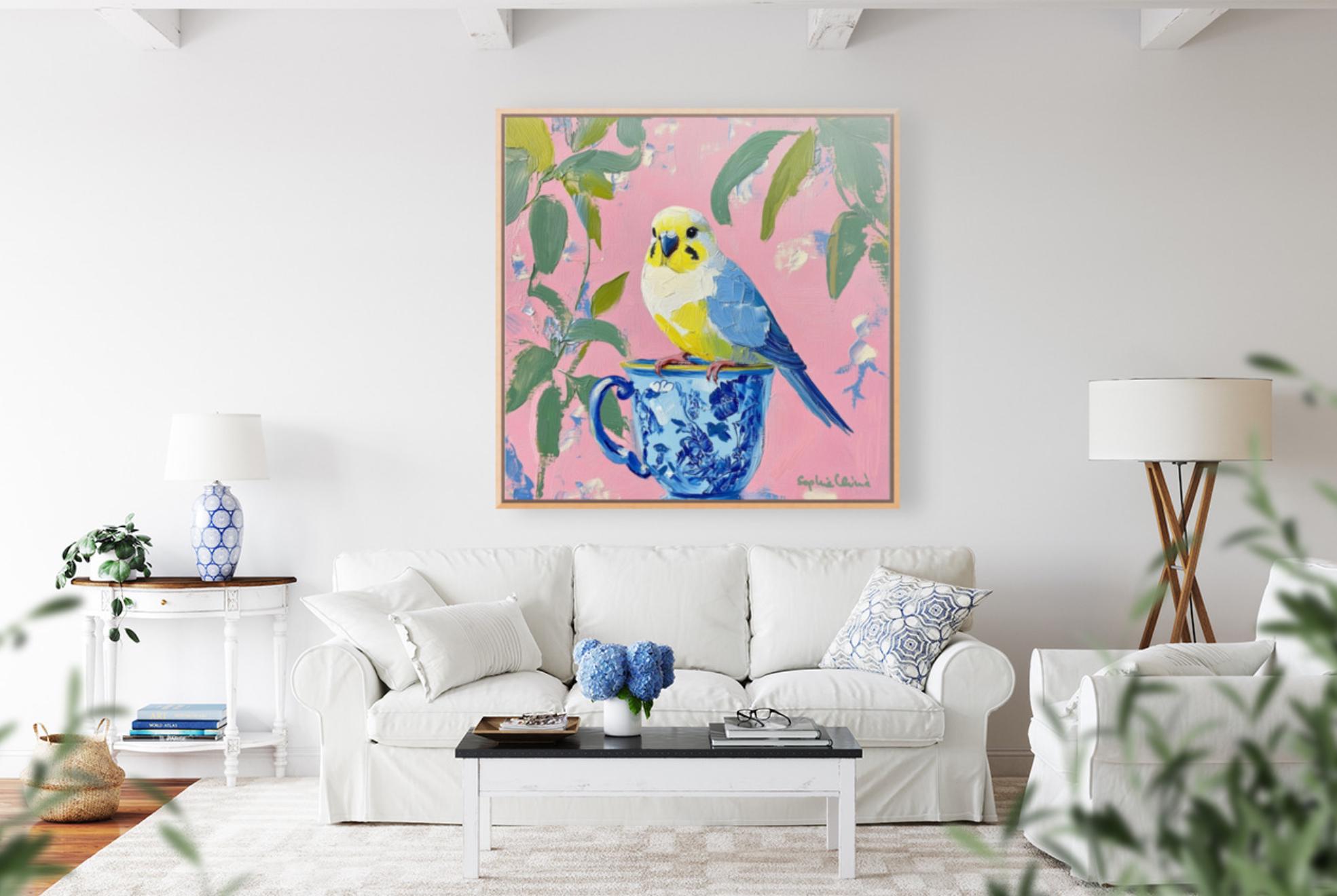Grandmillennial art, blue and yellow budgie on chinoiserie cup, whimsical fine art