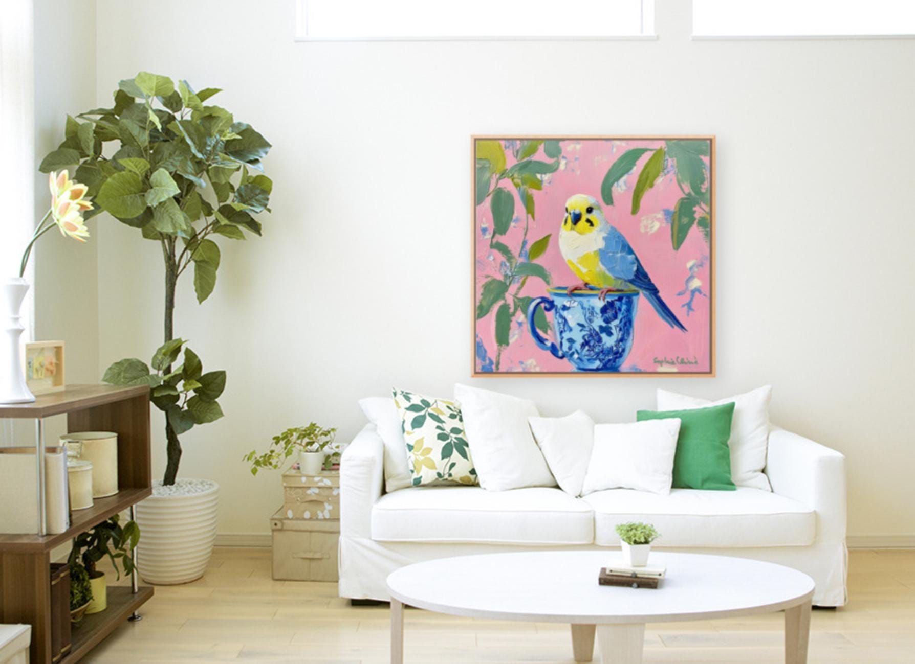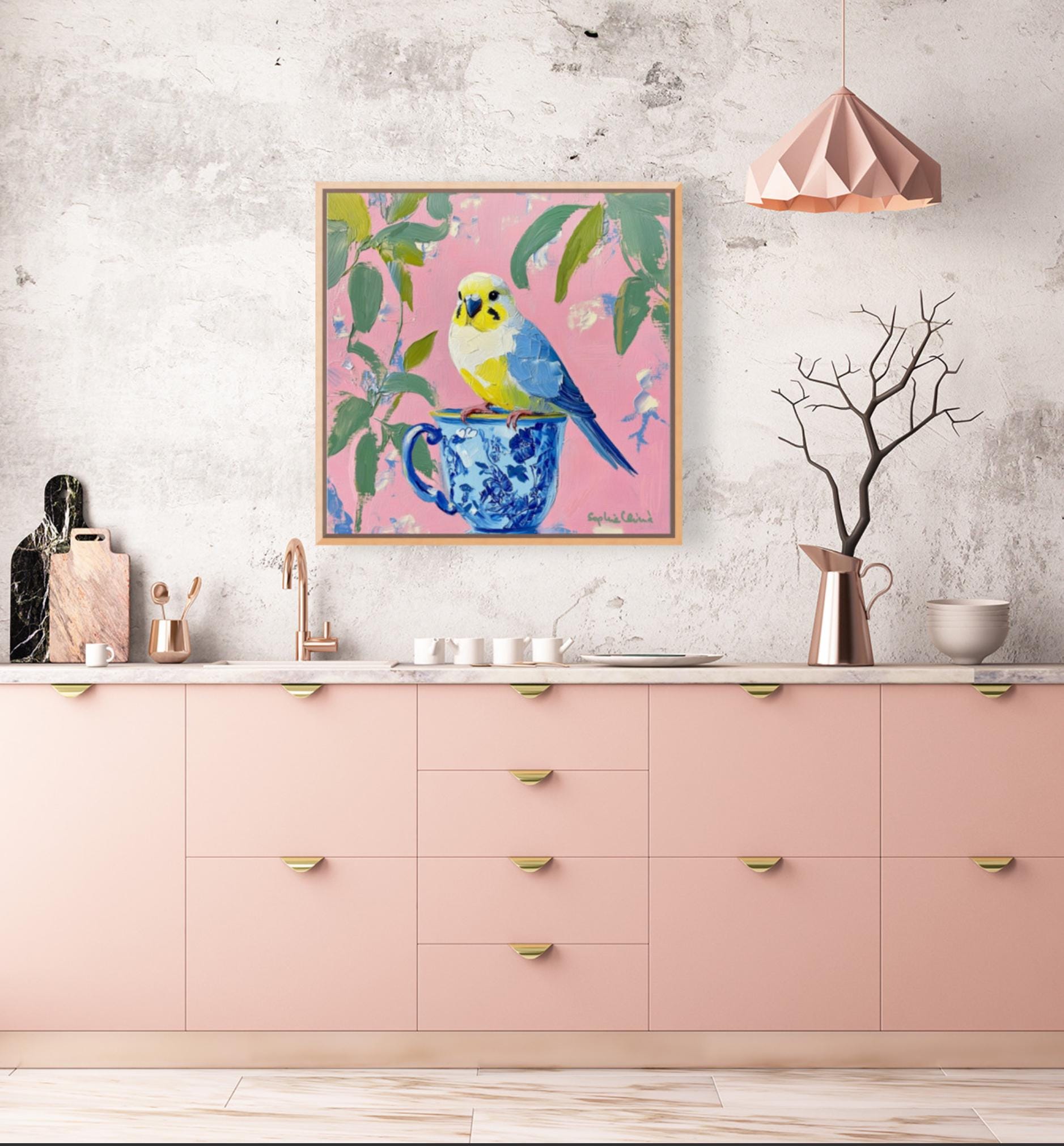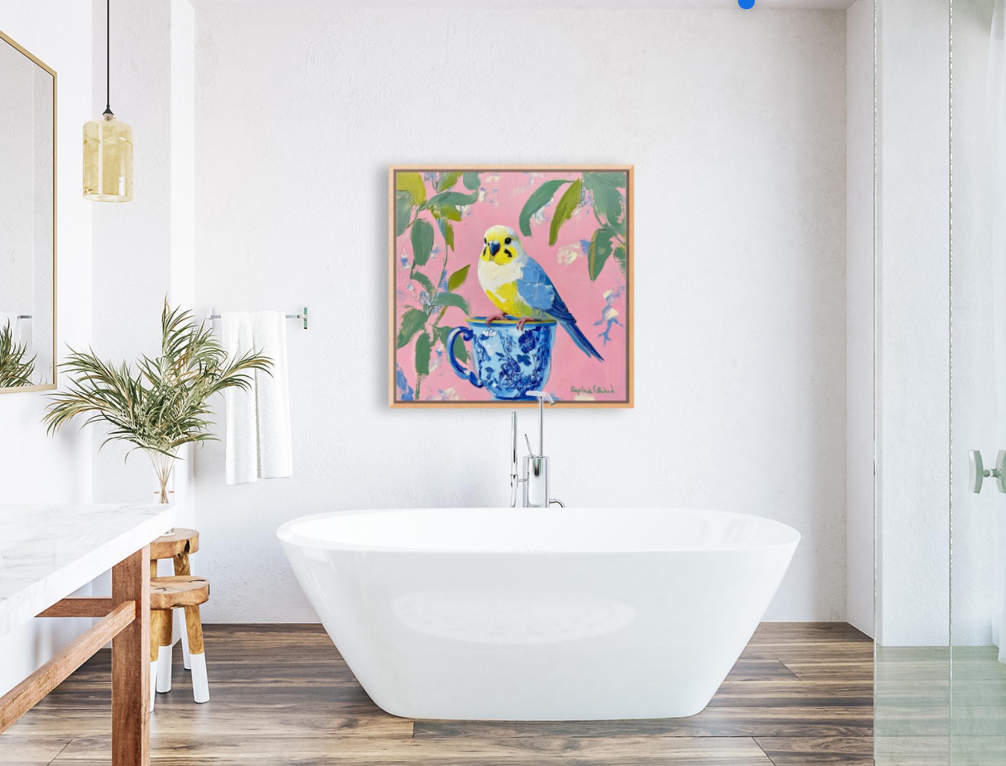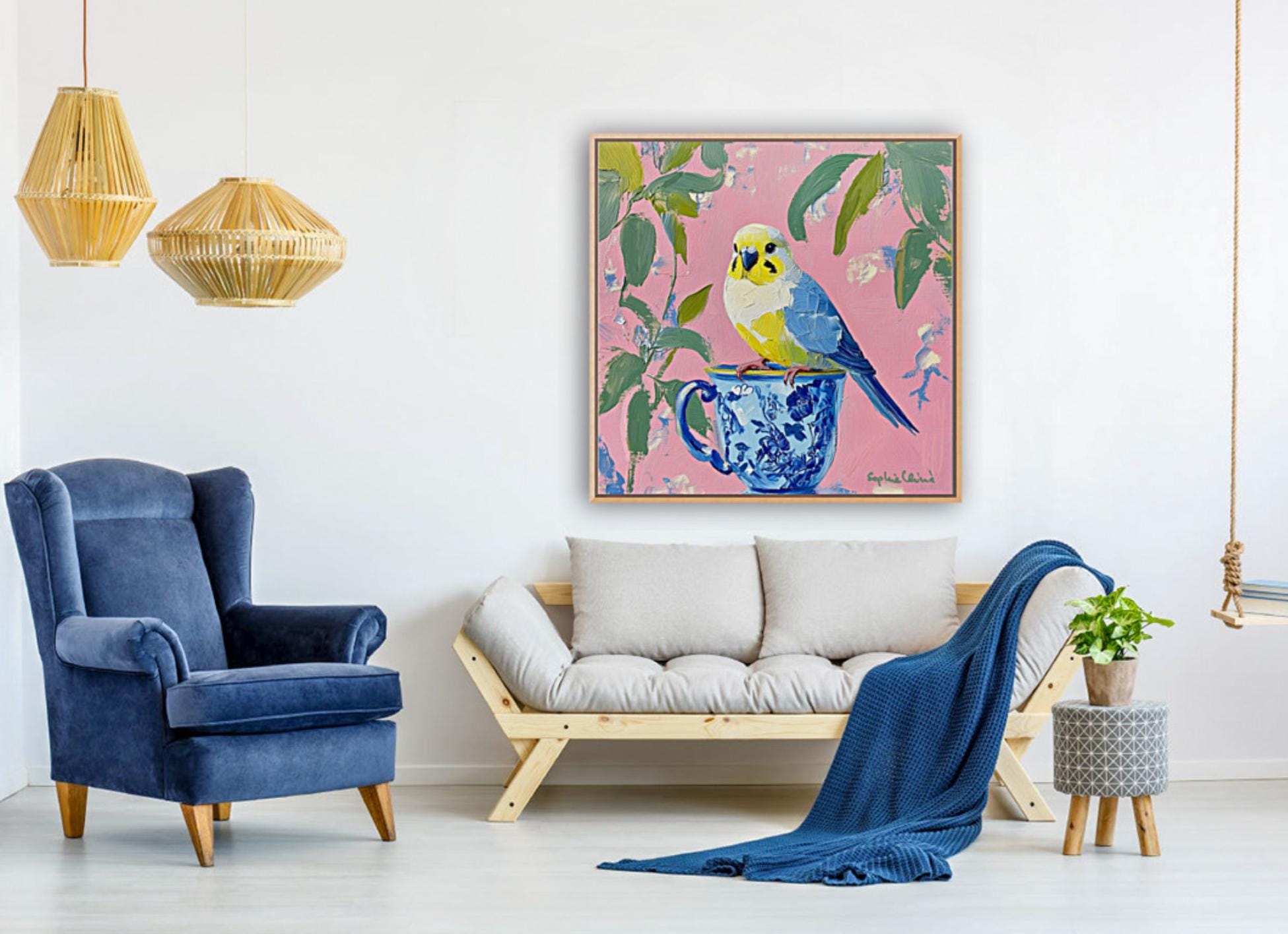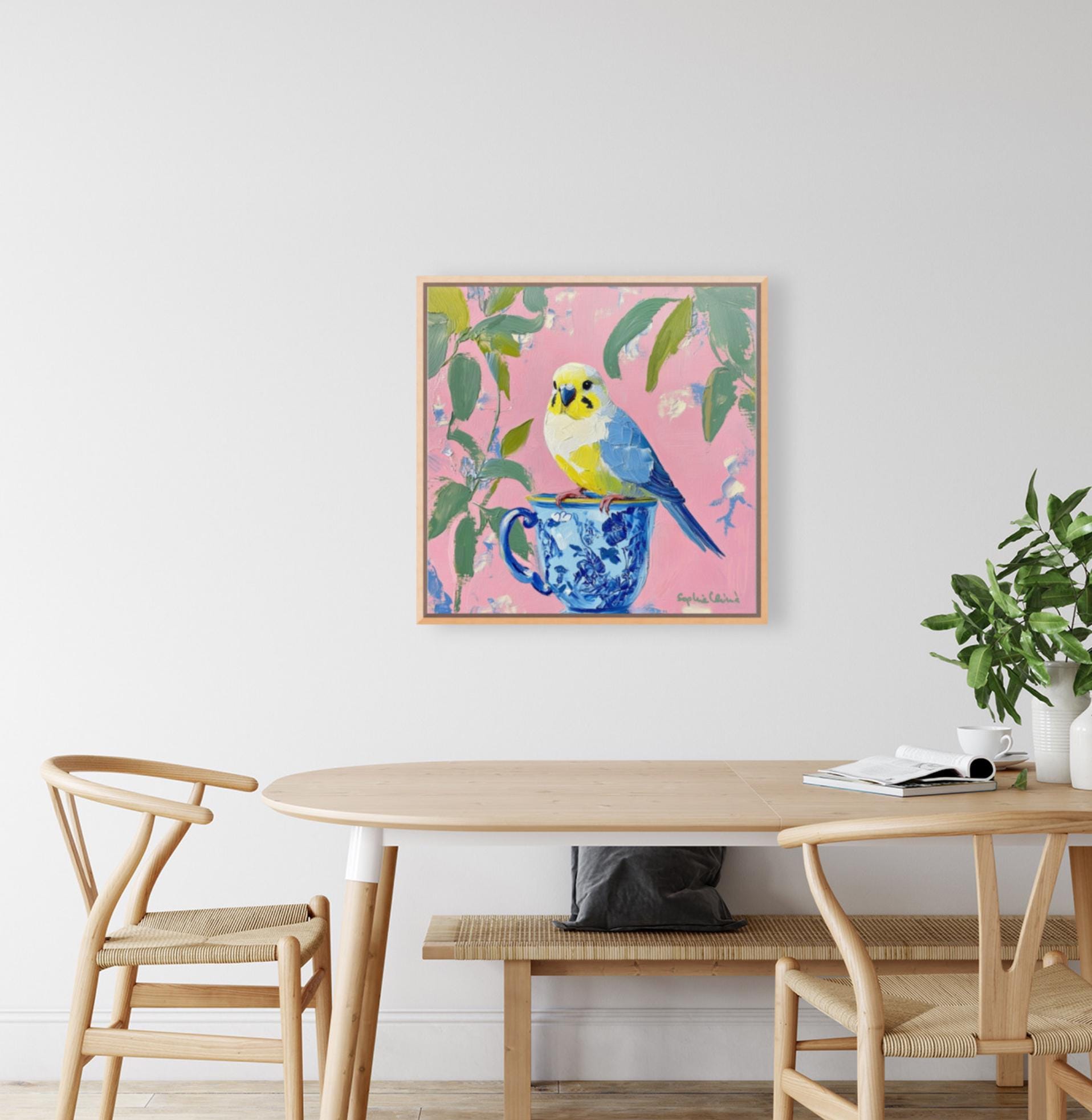 Grandmillennial art, blue and yellow budgie on chinoiserie cup, whimsical fine art