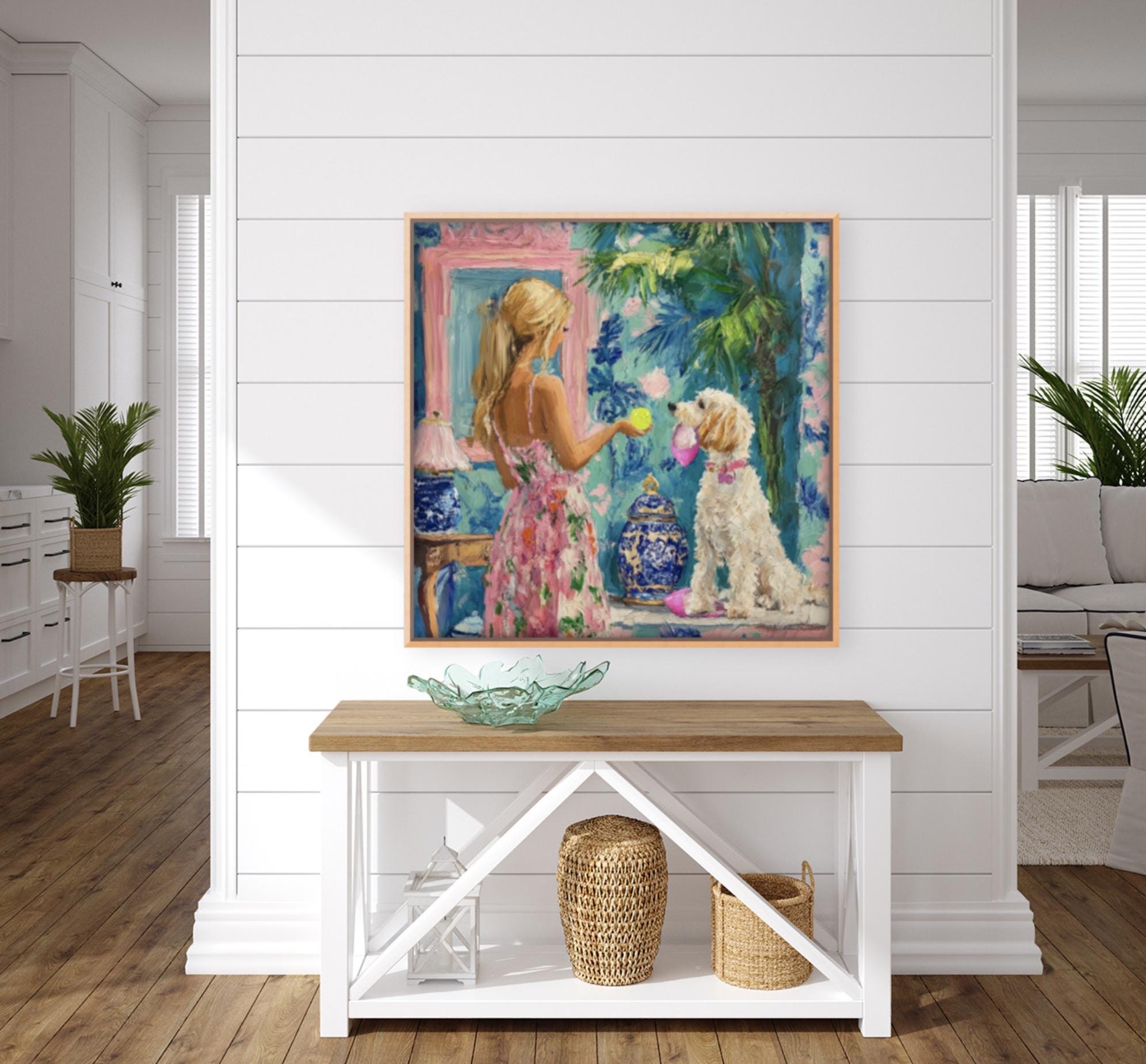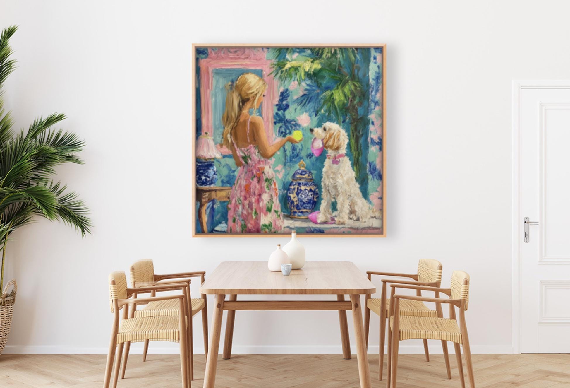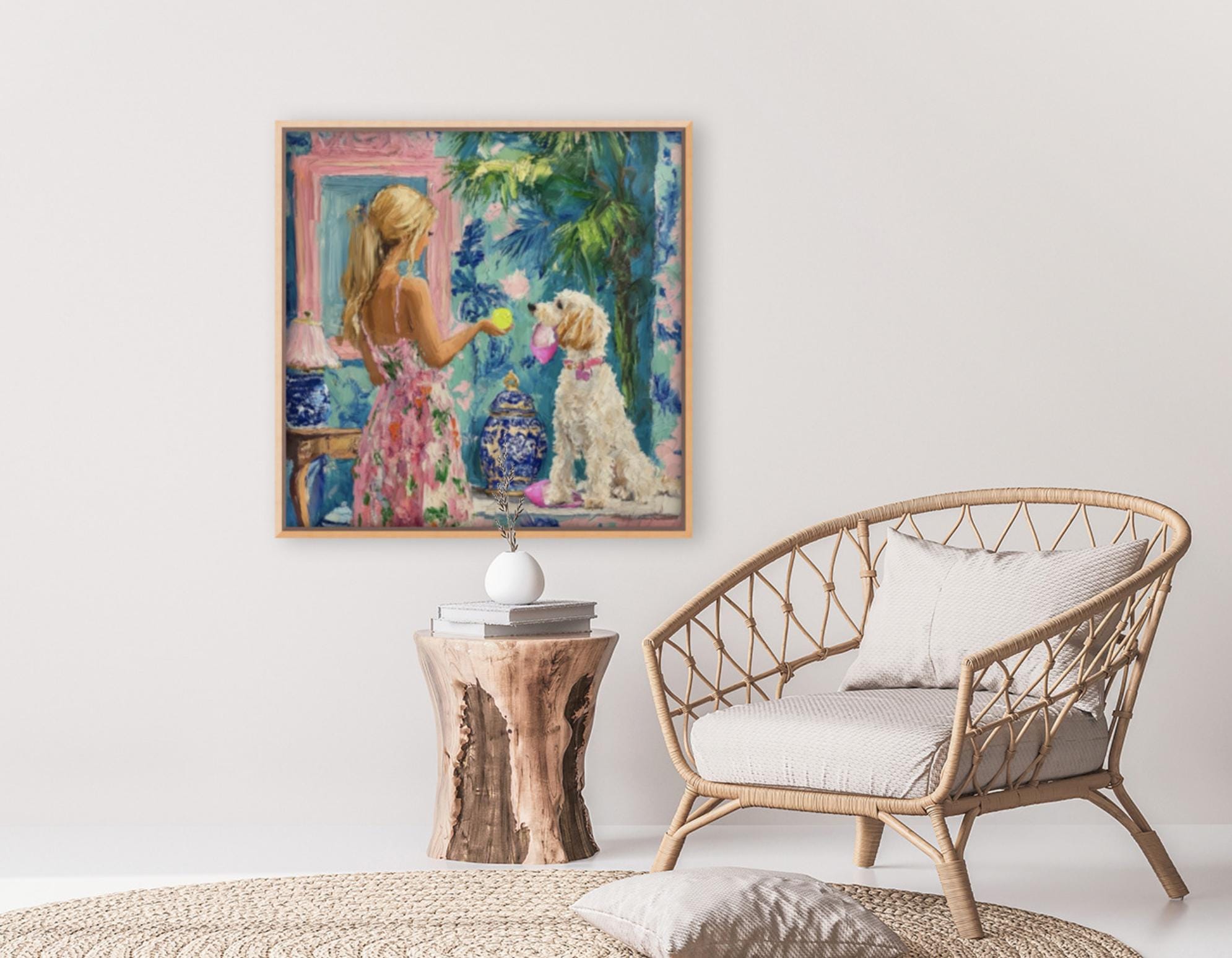 Grandmillennial art, A Fair Deal, preppy whimsical dog oil painting