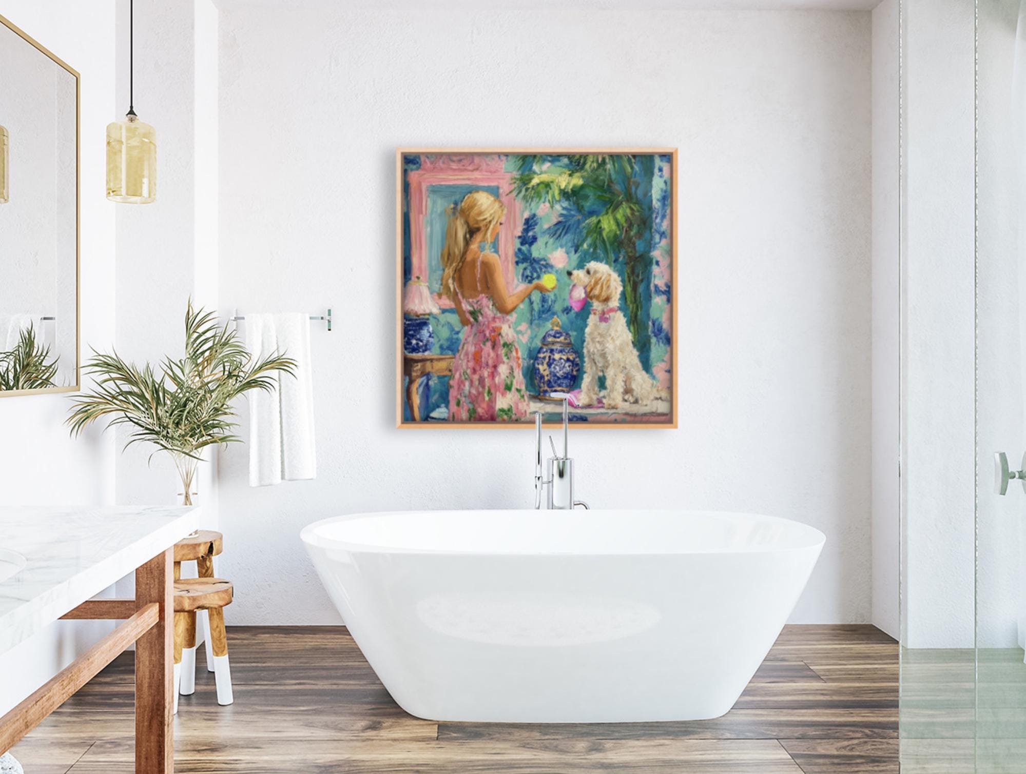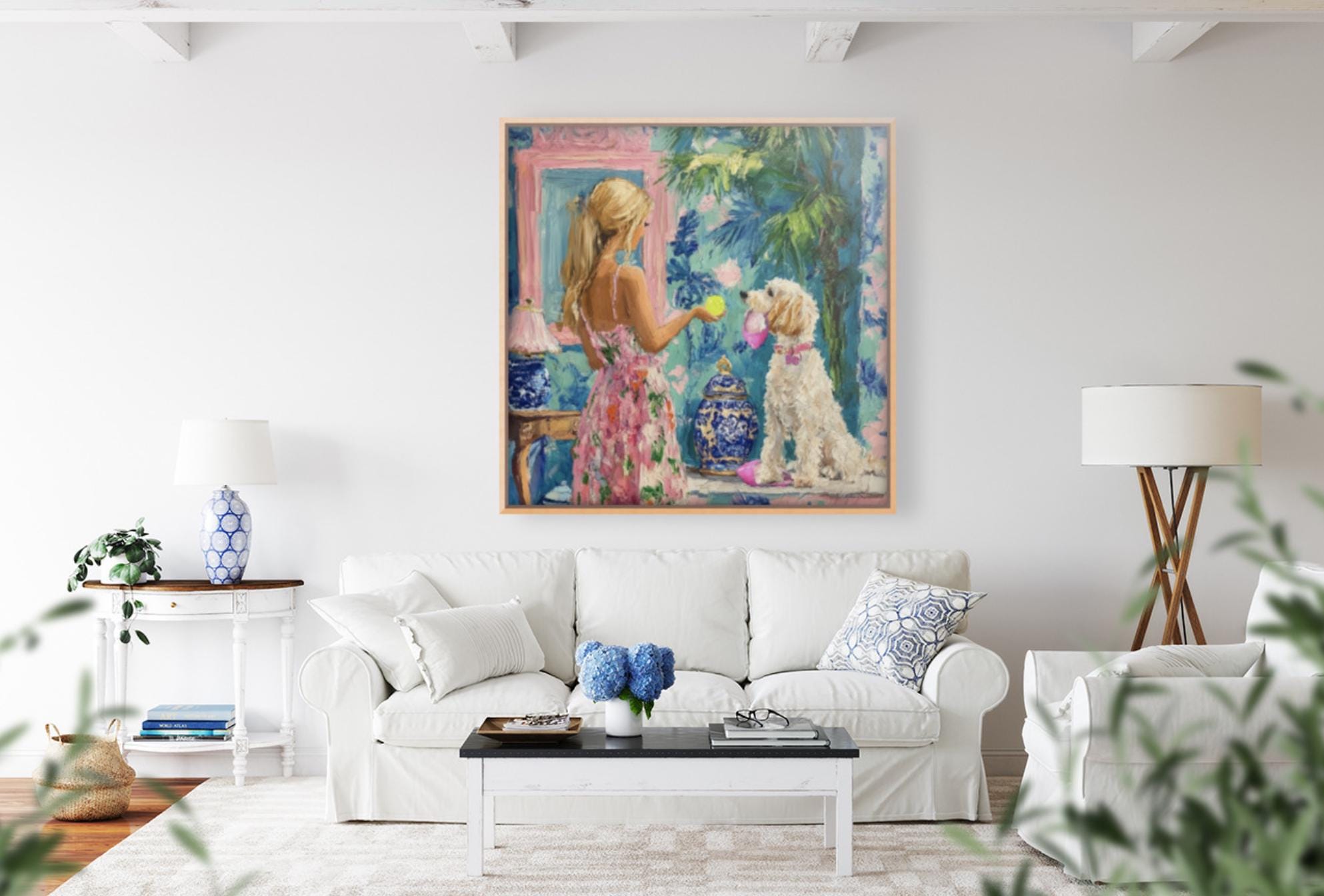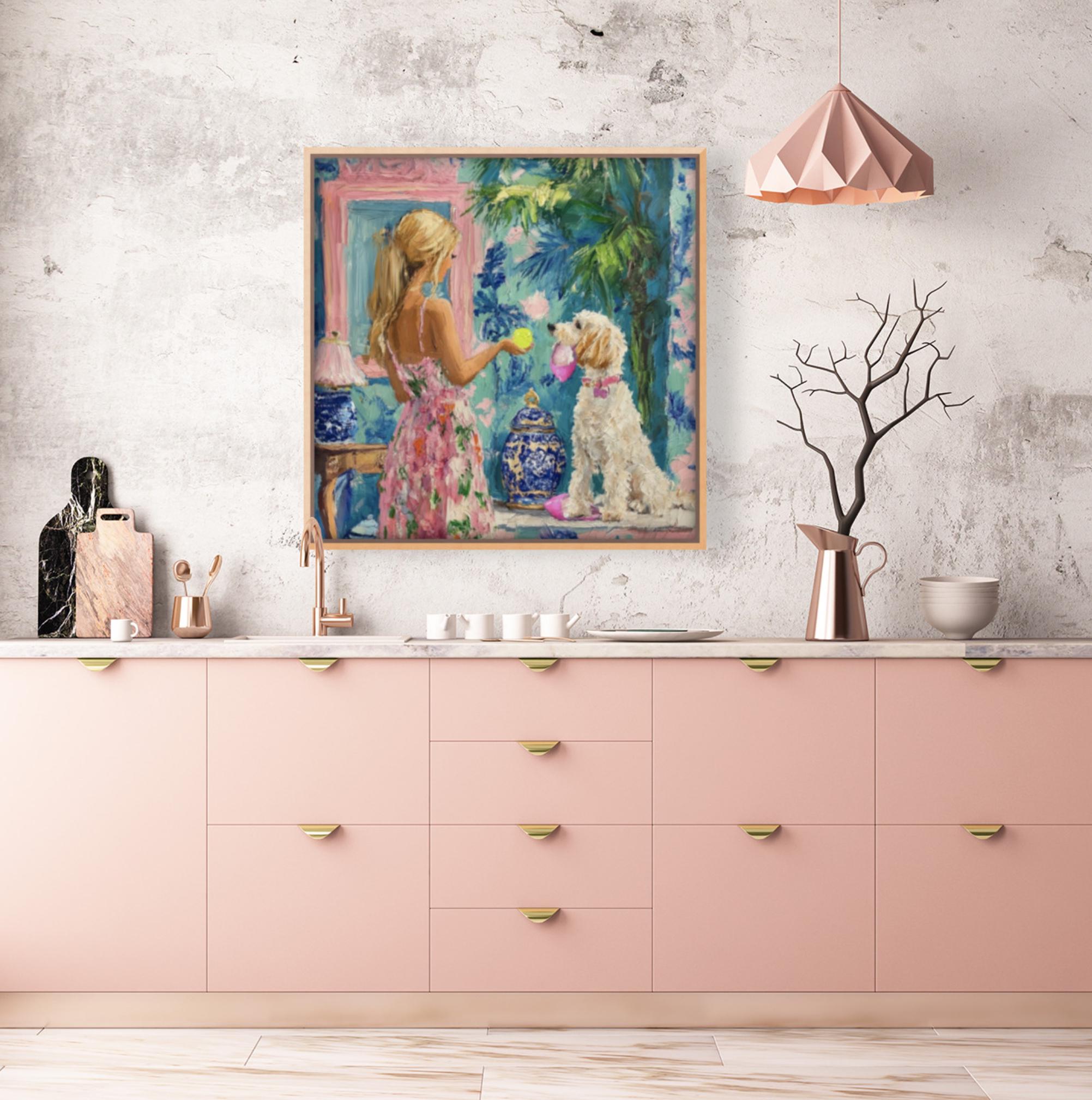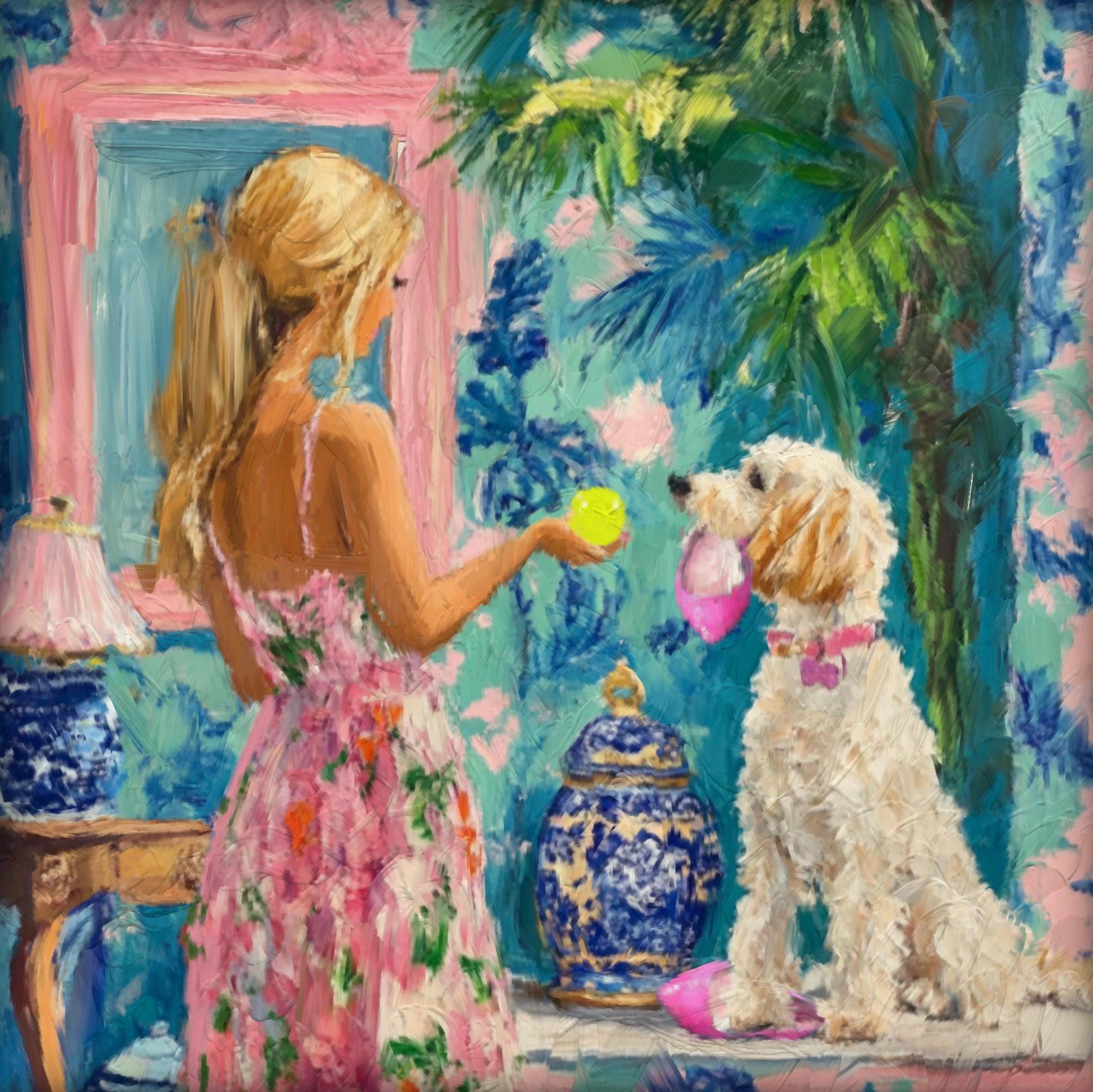 Grandmillennial art, A Fair Deal, preppy whimsical dog oil painting