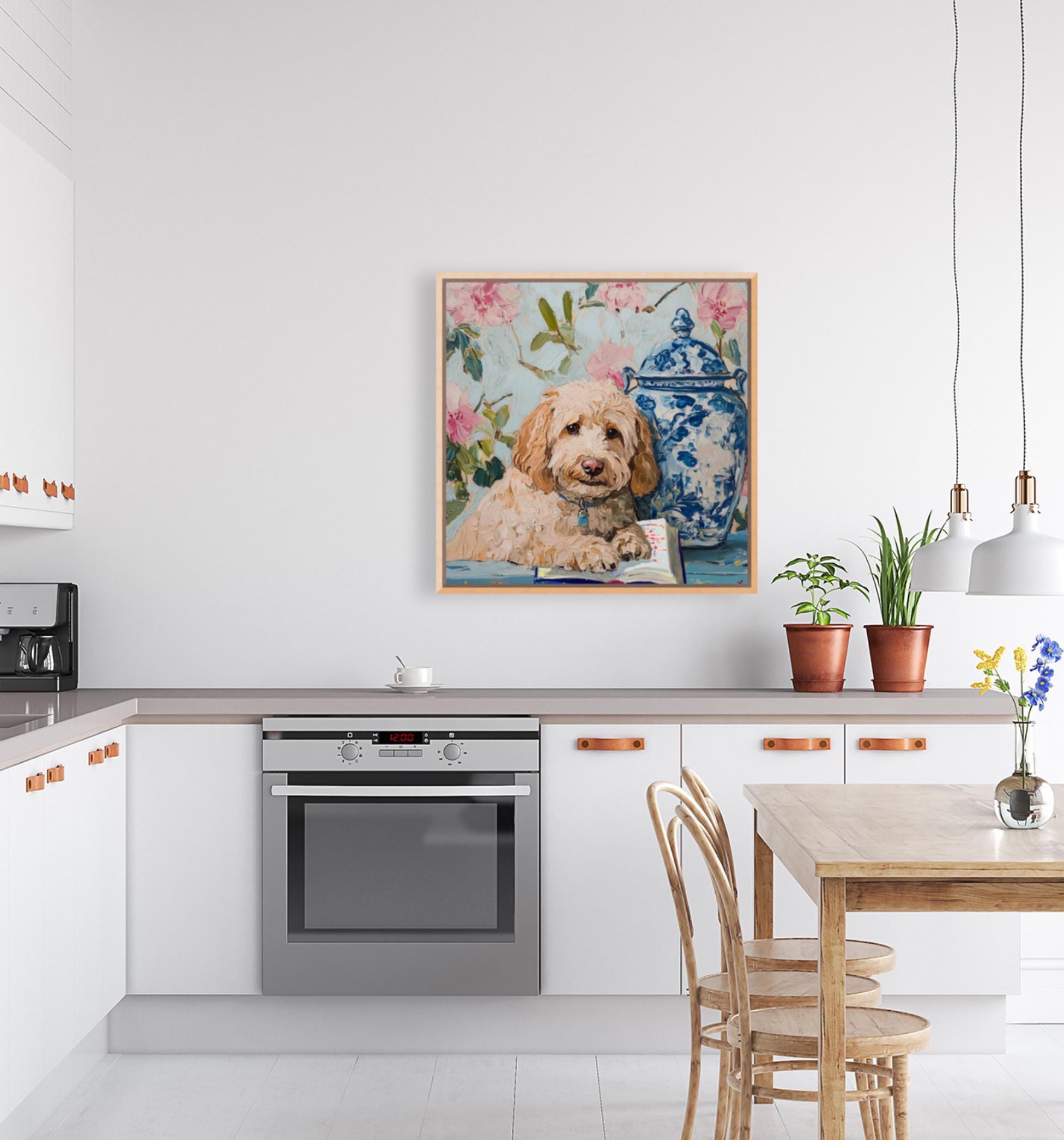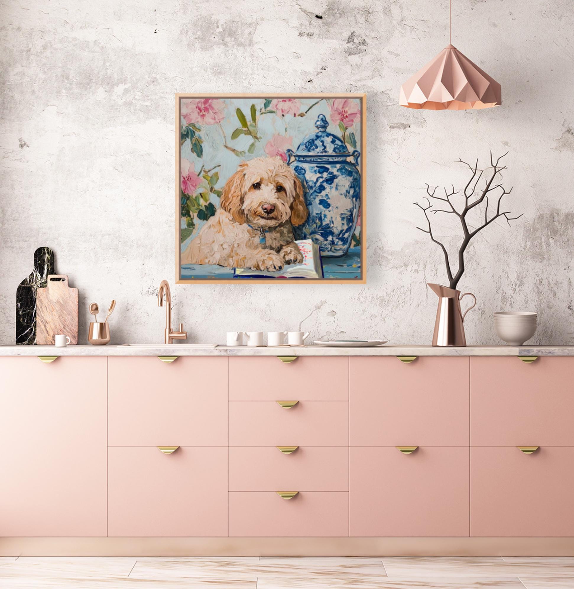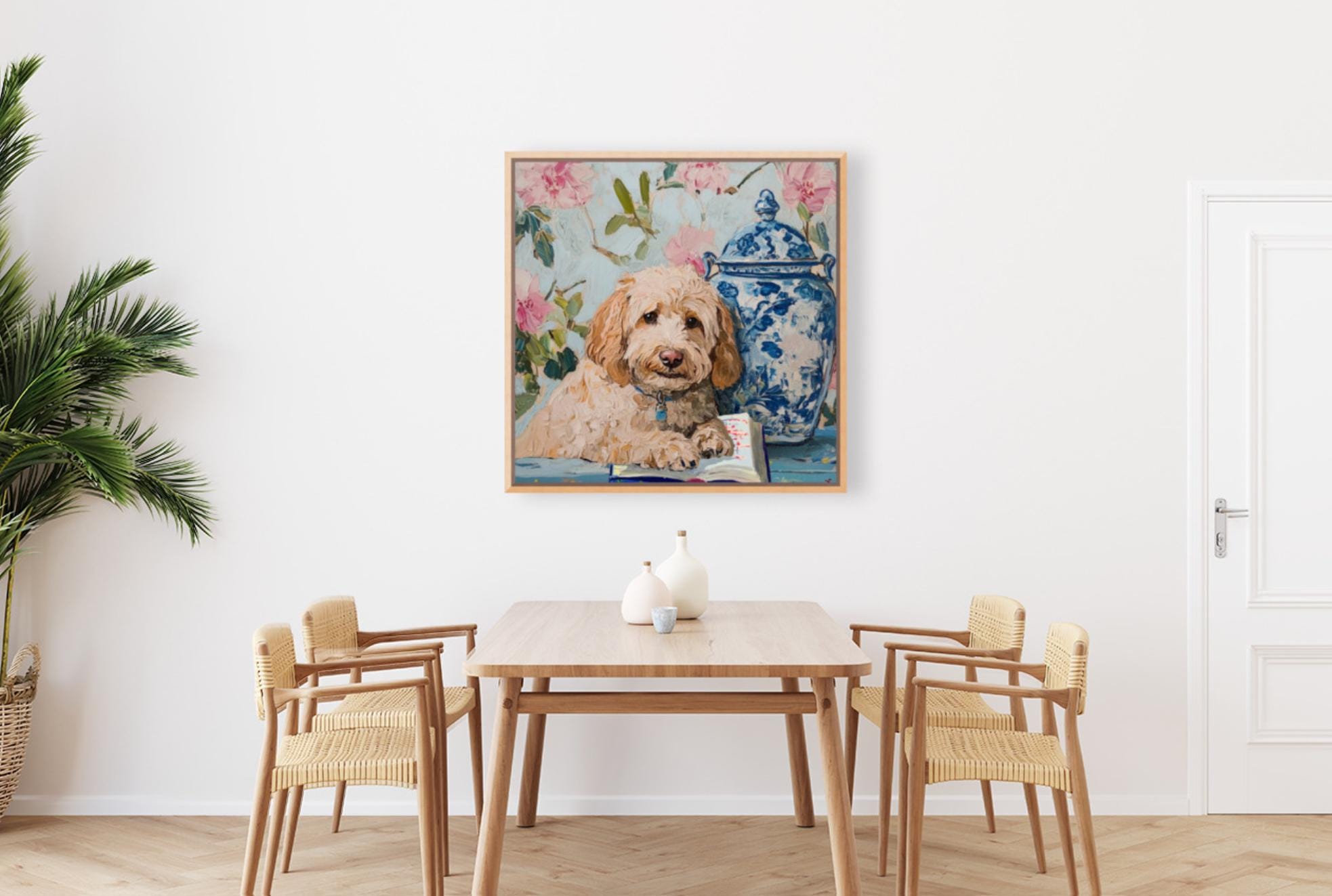 Grandmillennial art, Eating the homework, saving the day, whimsical Labradoodle art