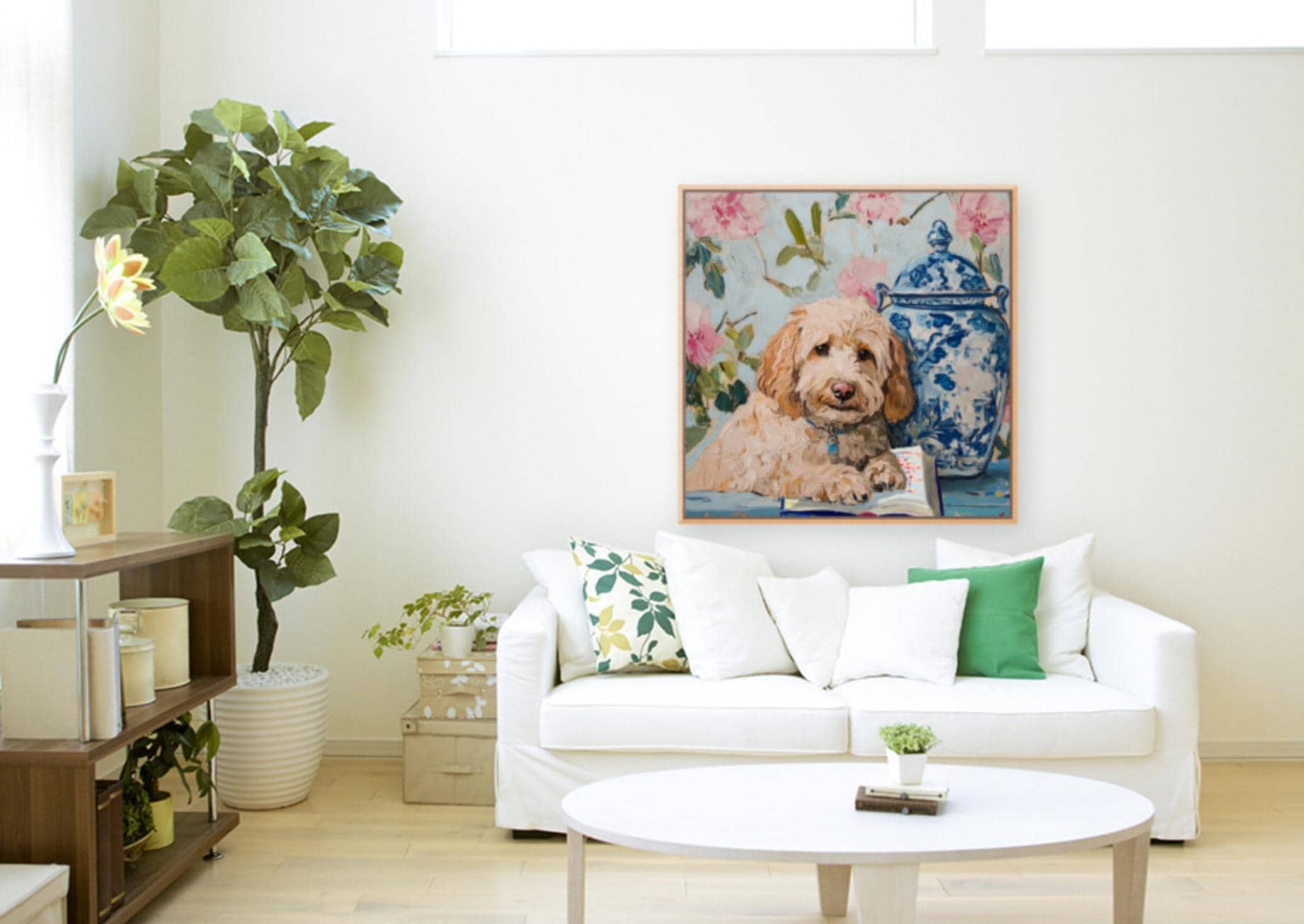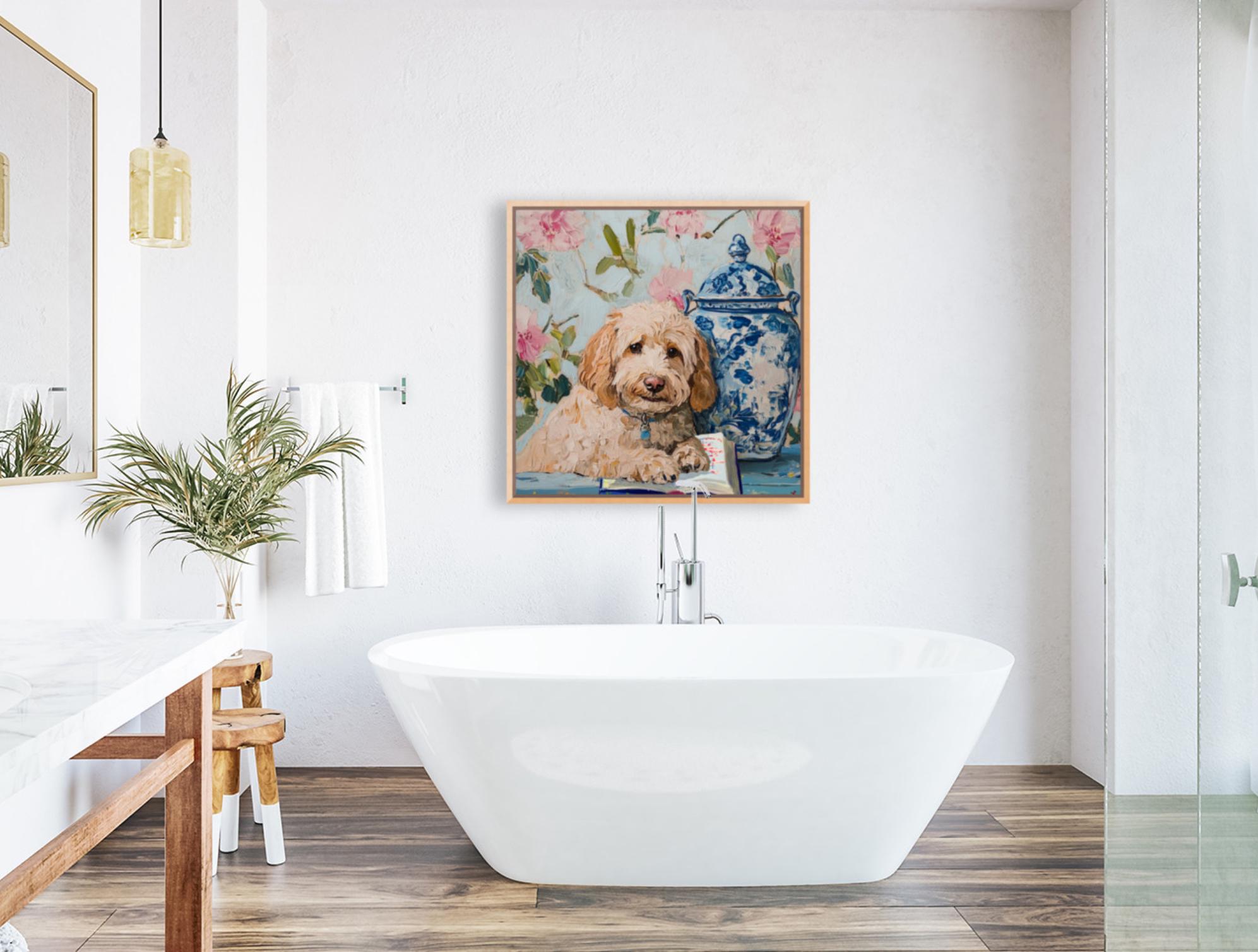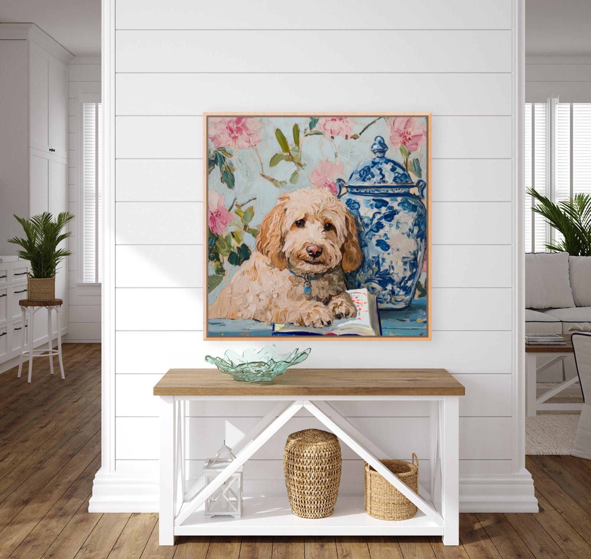 Grandmillennial art, Eating the homework, saving the day, whimsical Labradoodle art