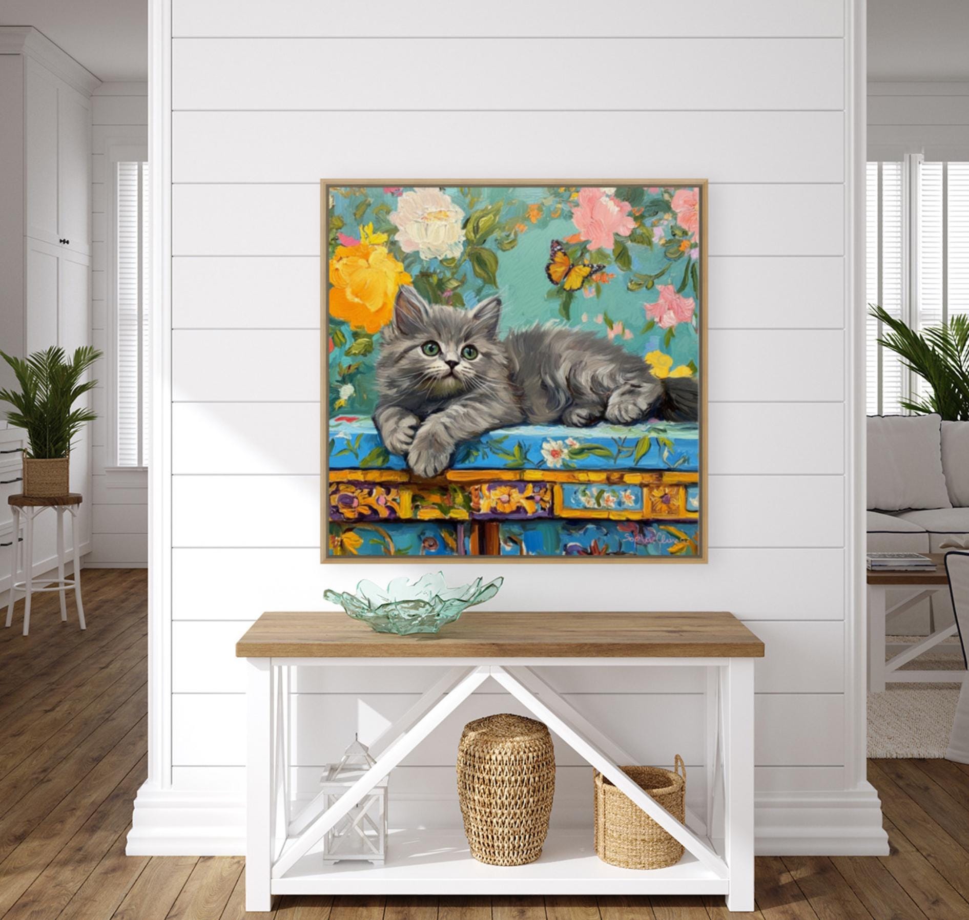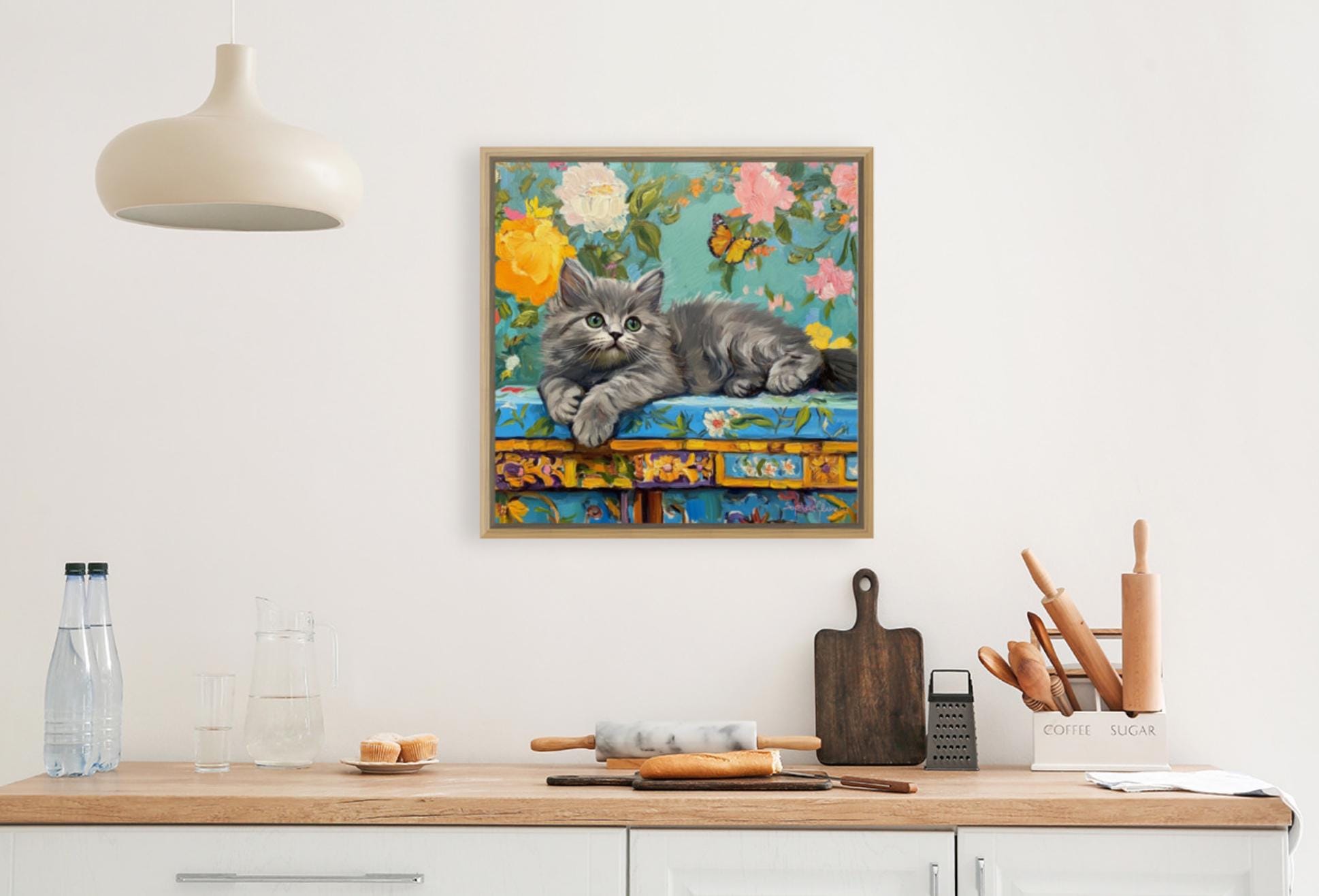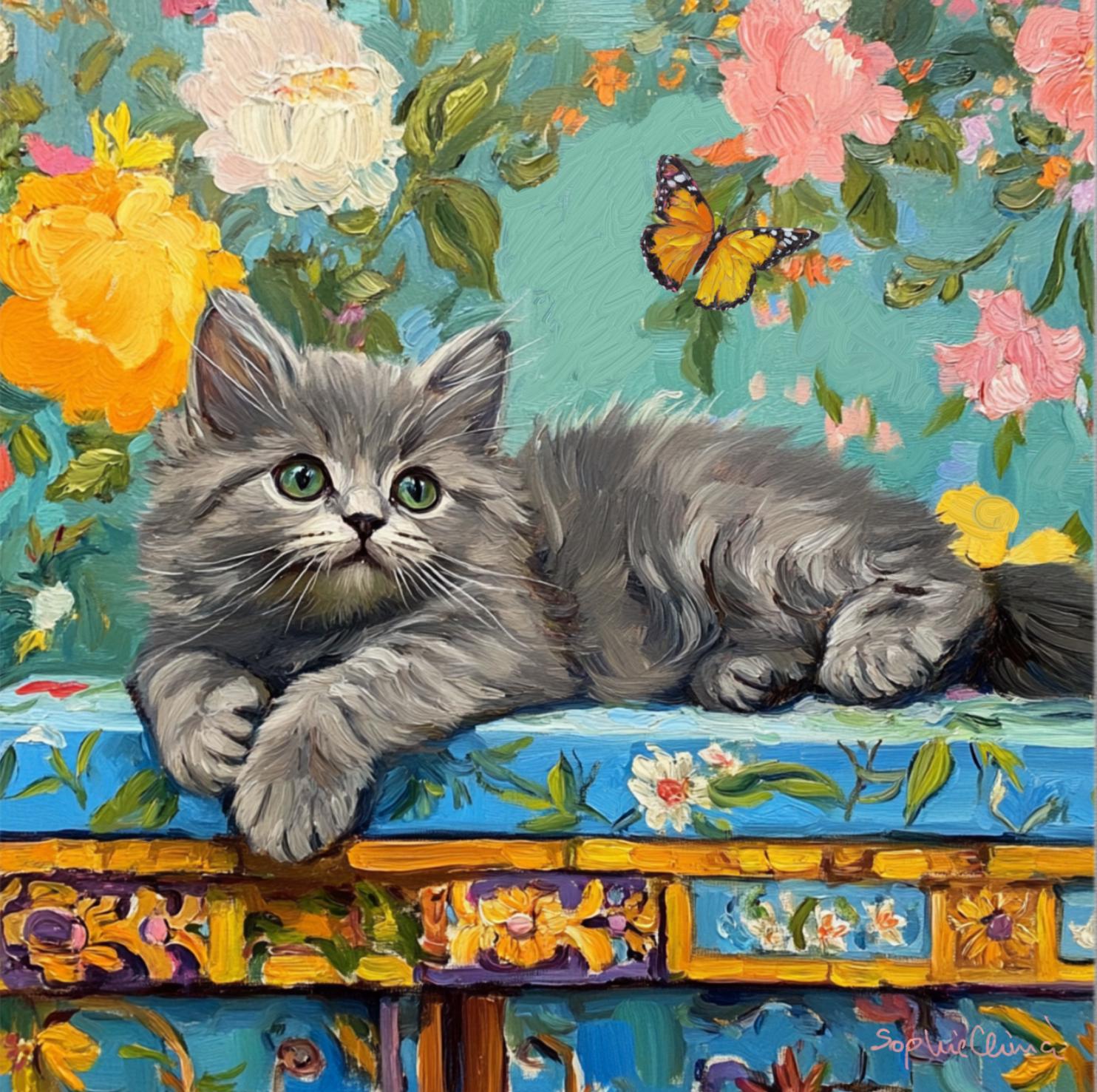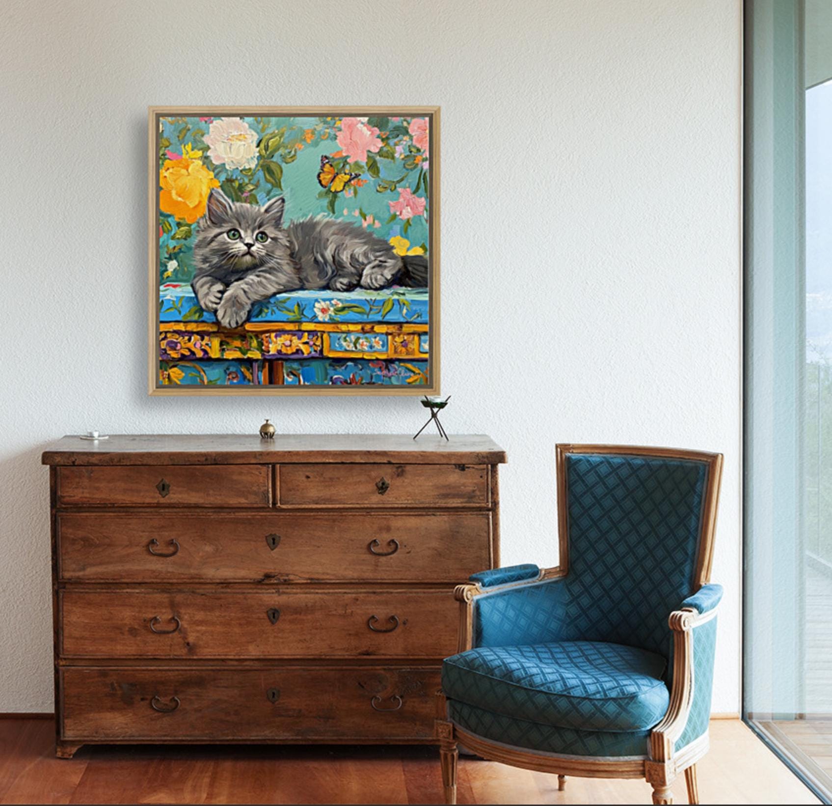 Grandmillennial art, Smoky and a yellow butterfly, whimsical kitten art