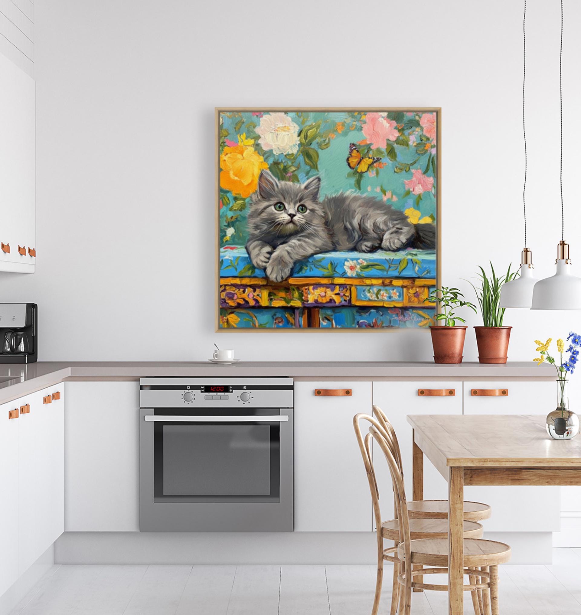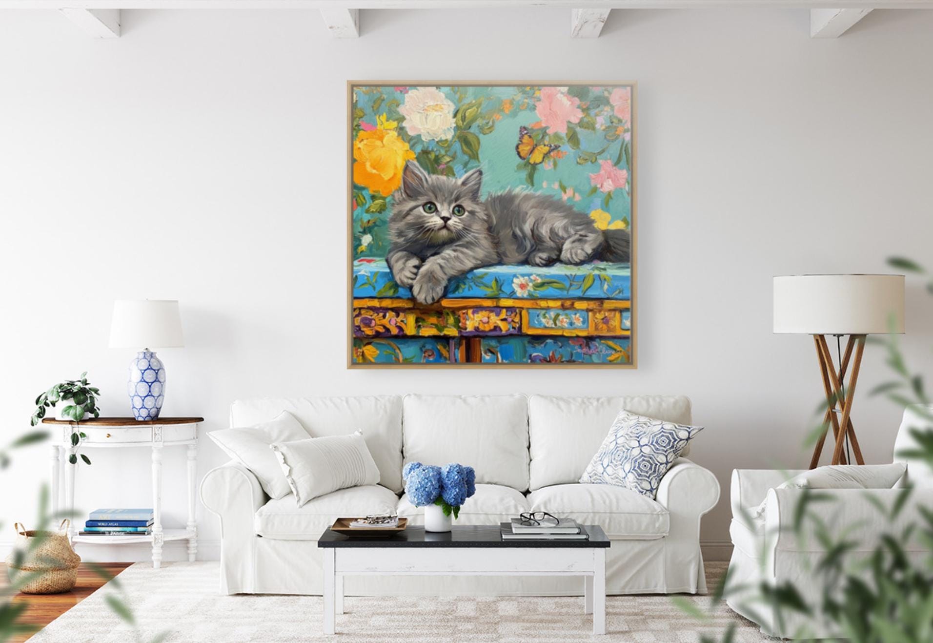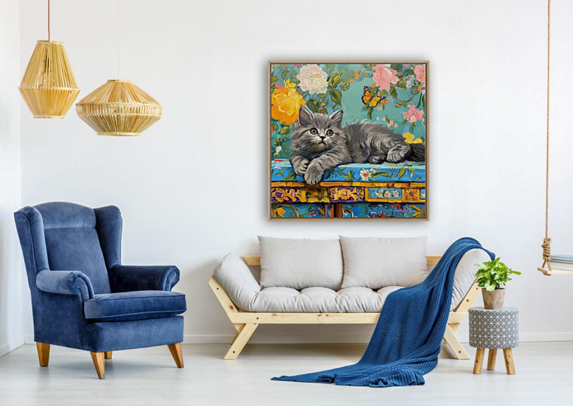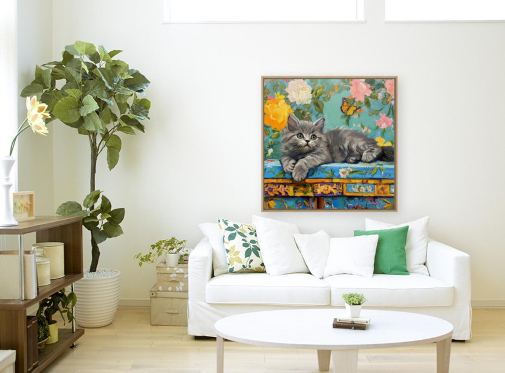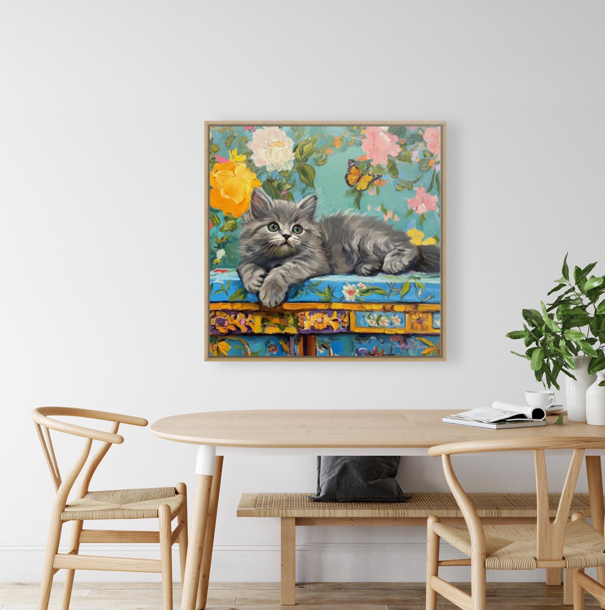 Grandmillennial art, Smoky and a yellow butterfly, whimsical kitten art