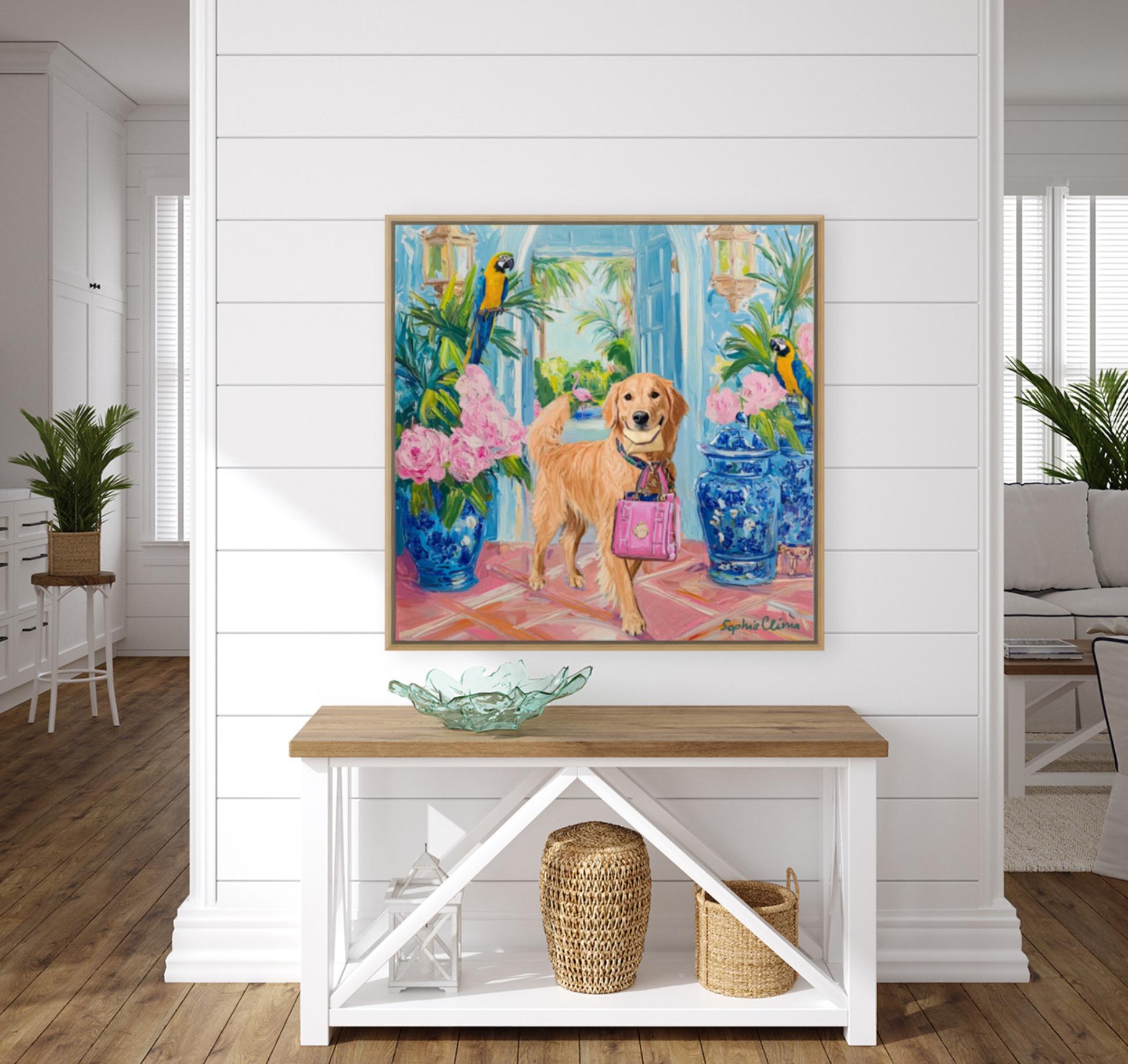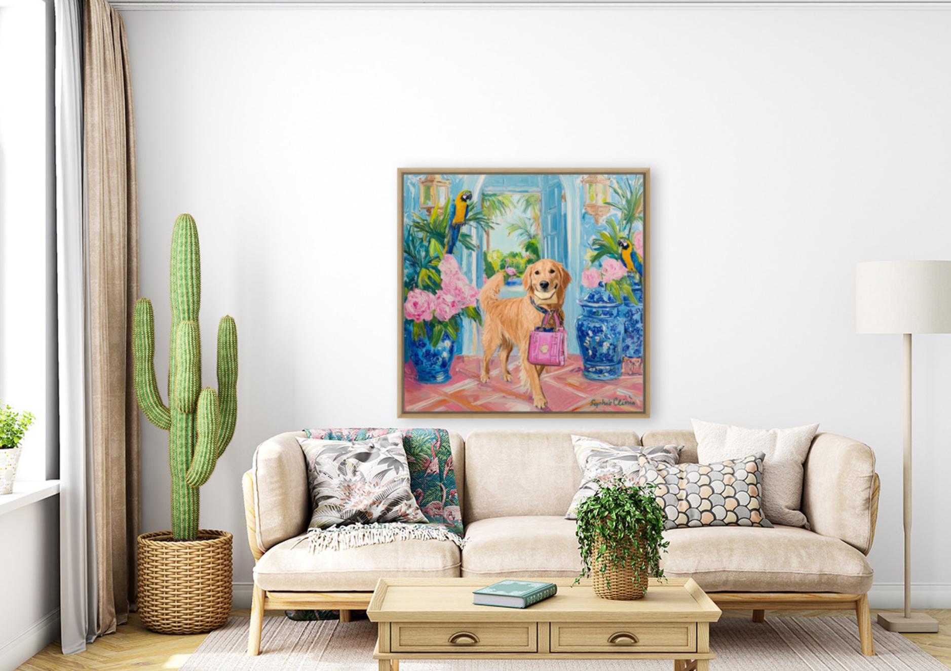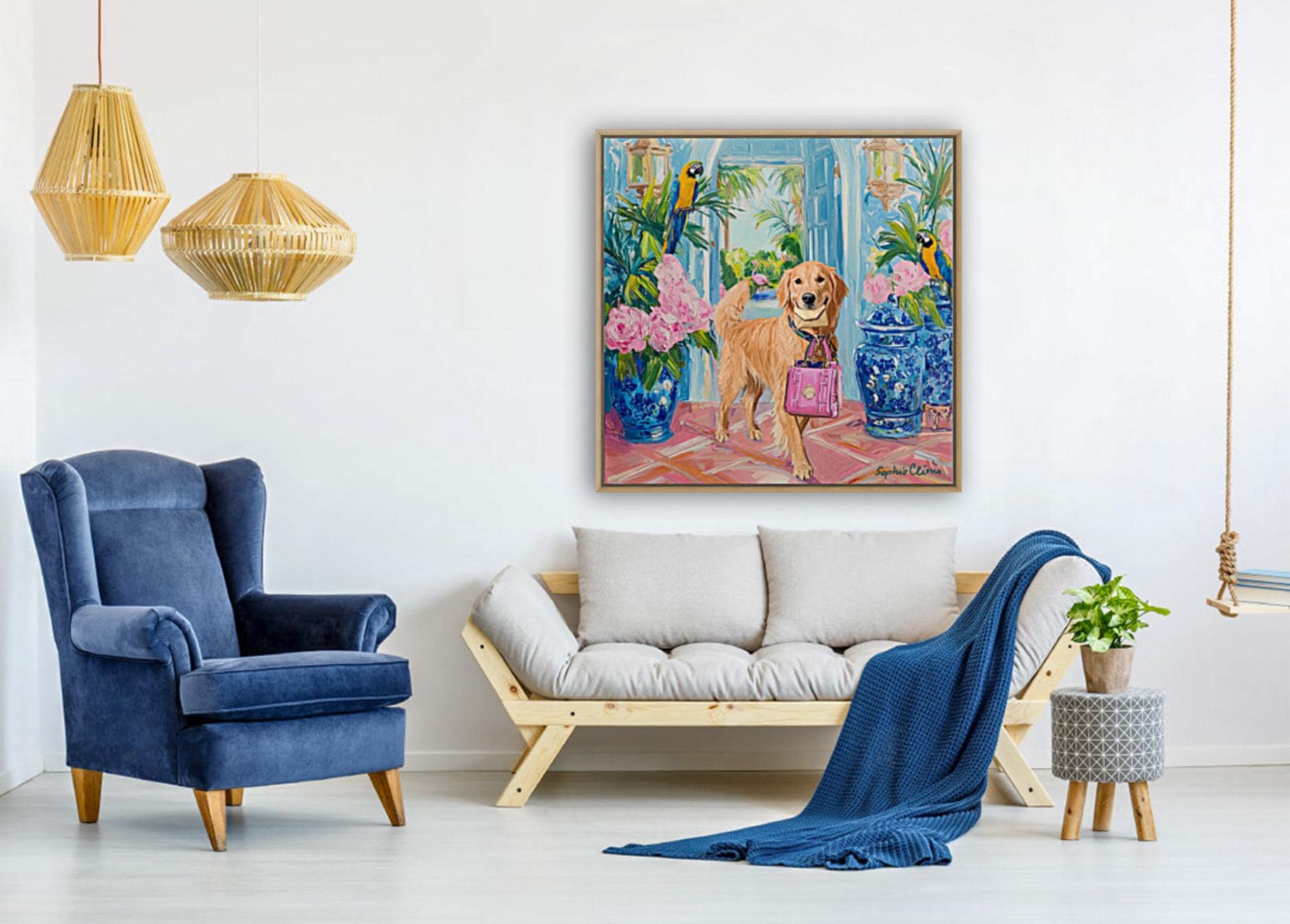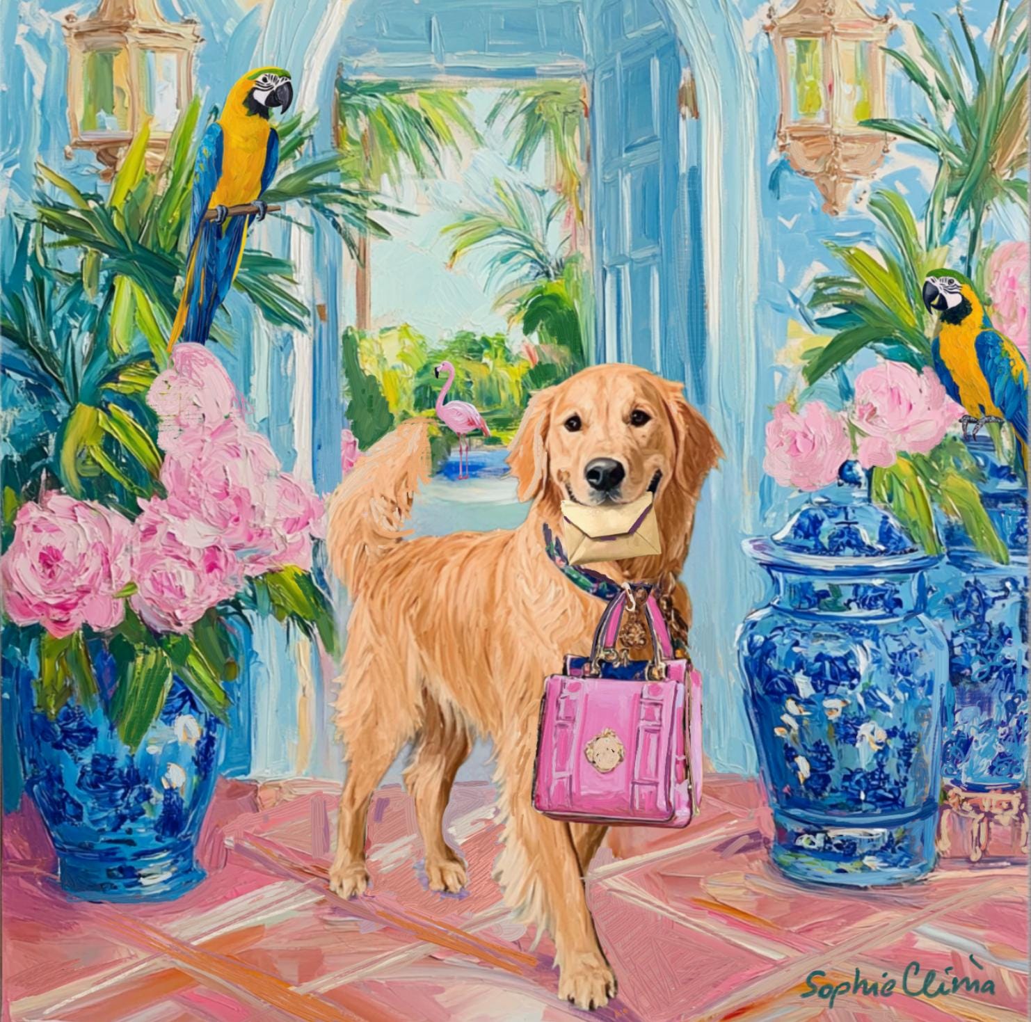 Grandmillennial art, A Messanger, whimsical Golden Retriever art