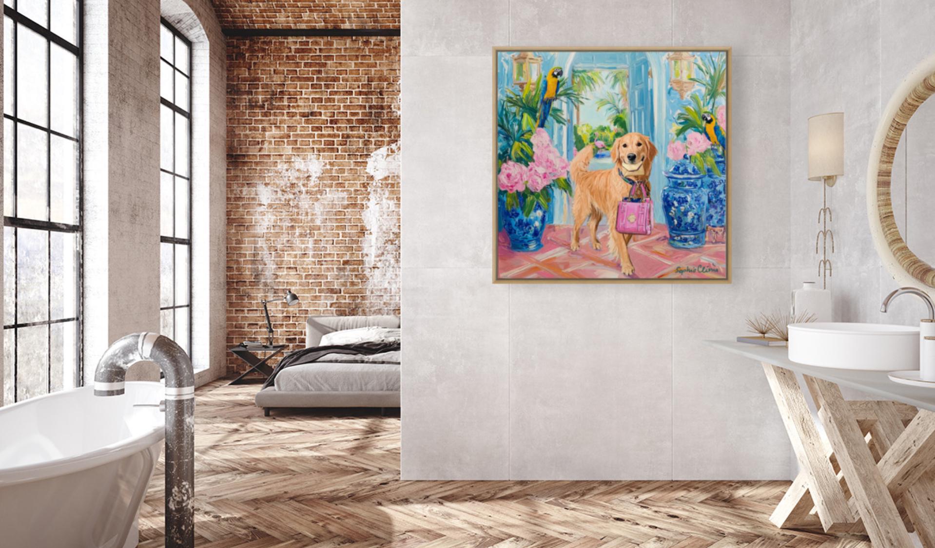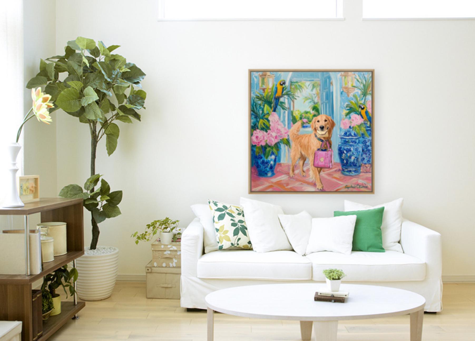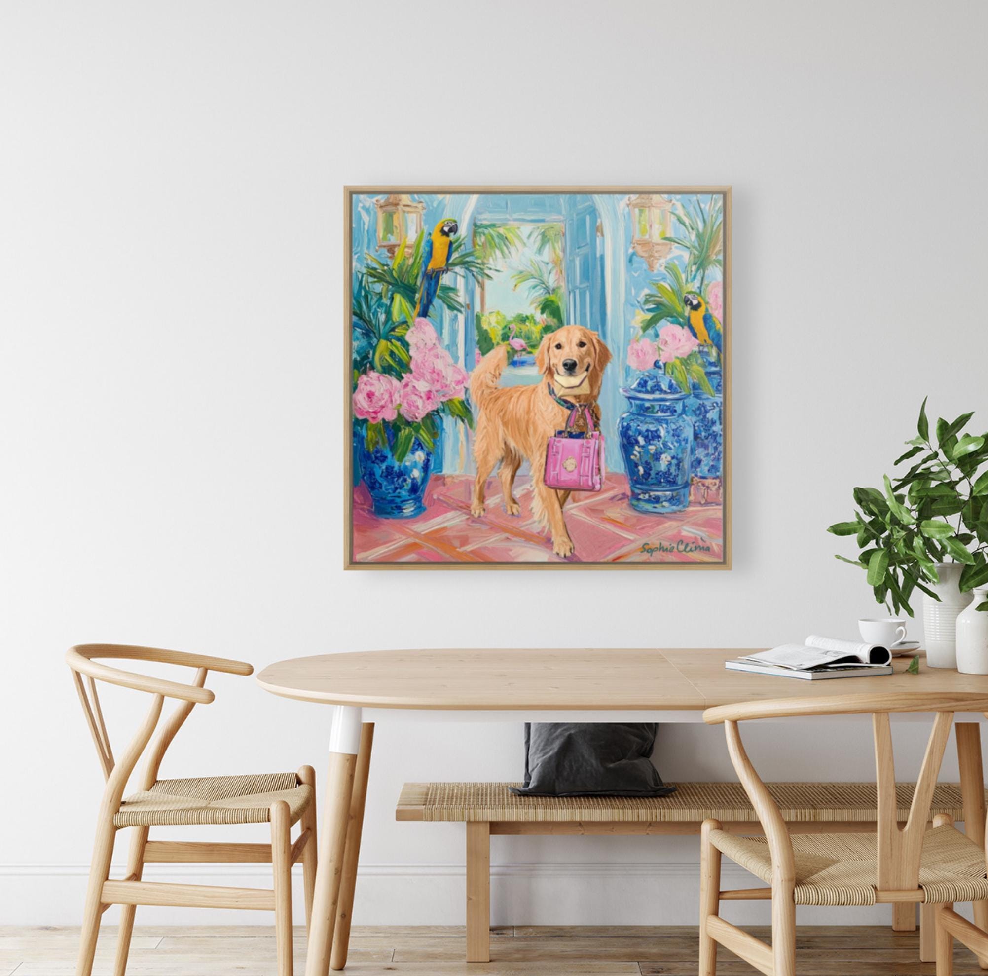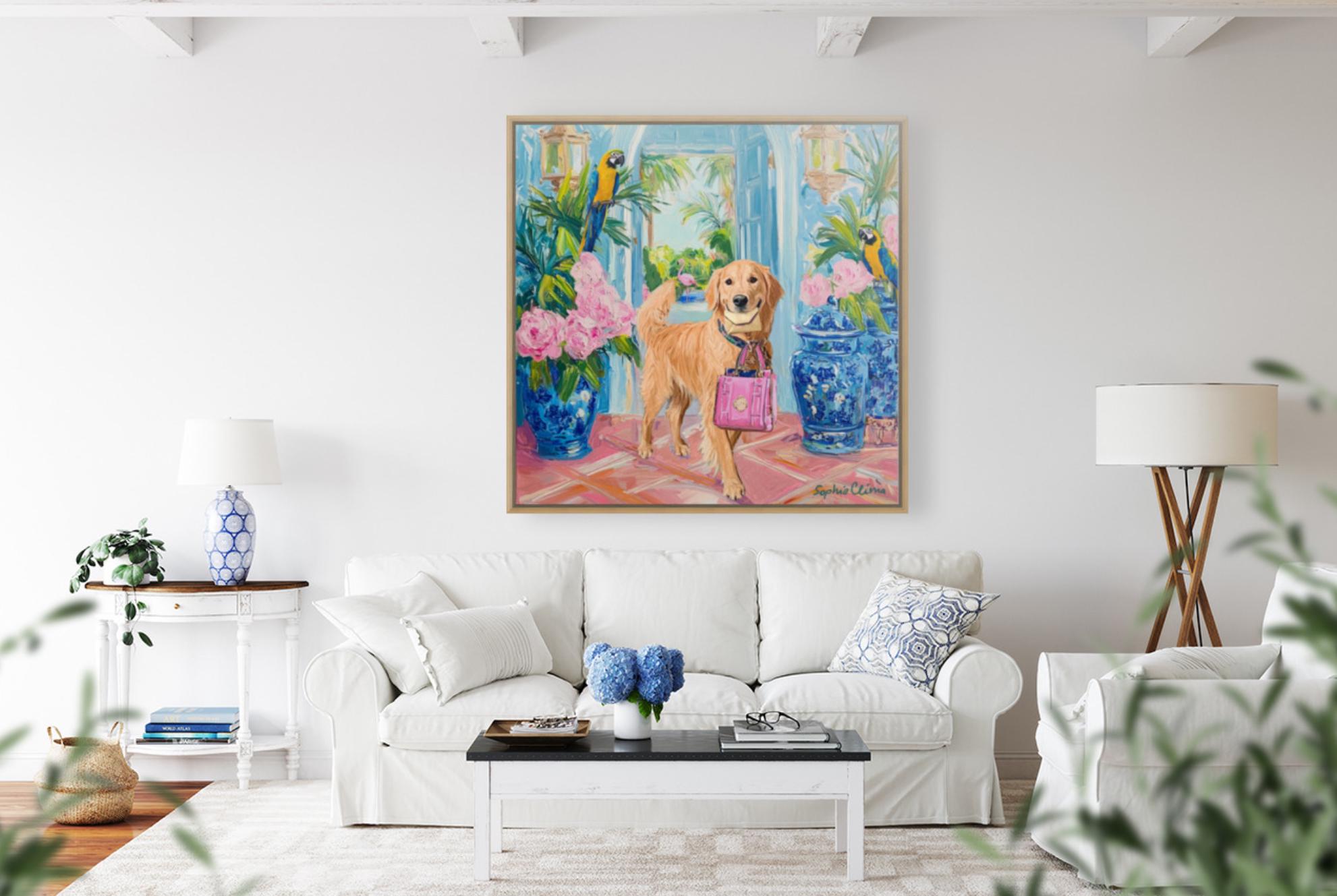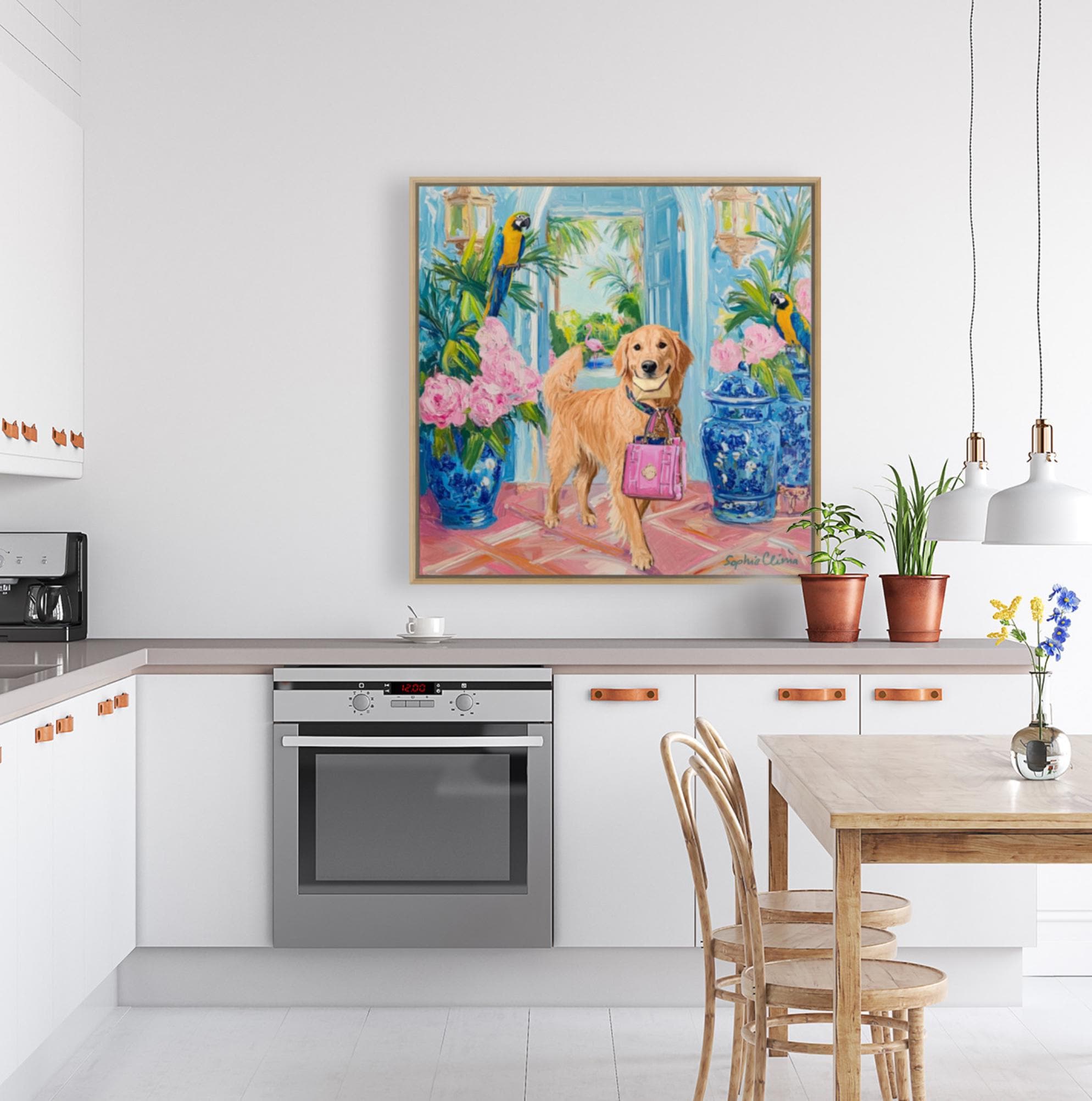 Grandmillennial art, A Messanger, whimsical Golden Retriever art