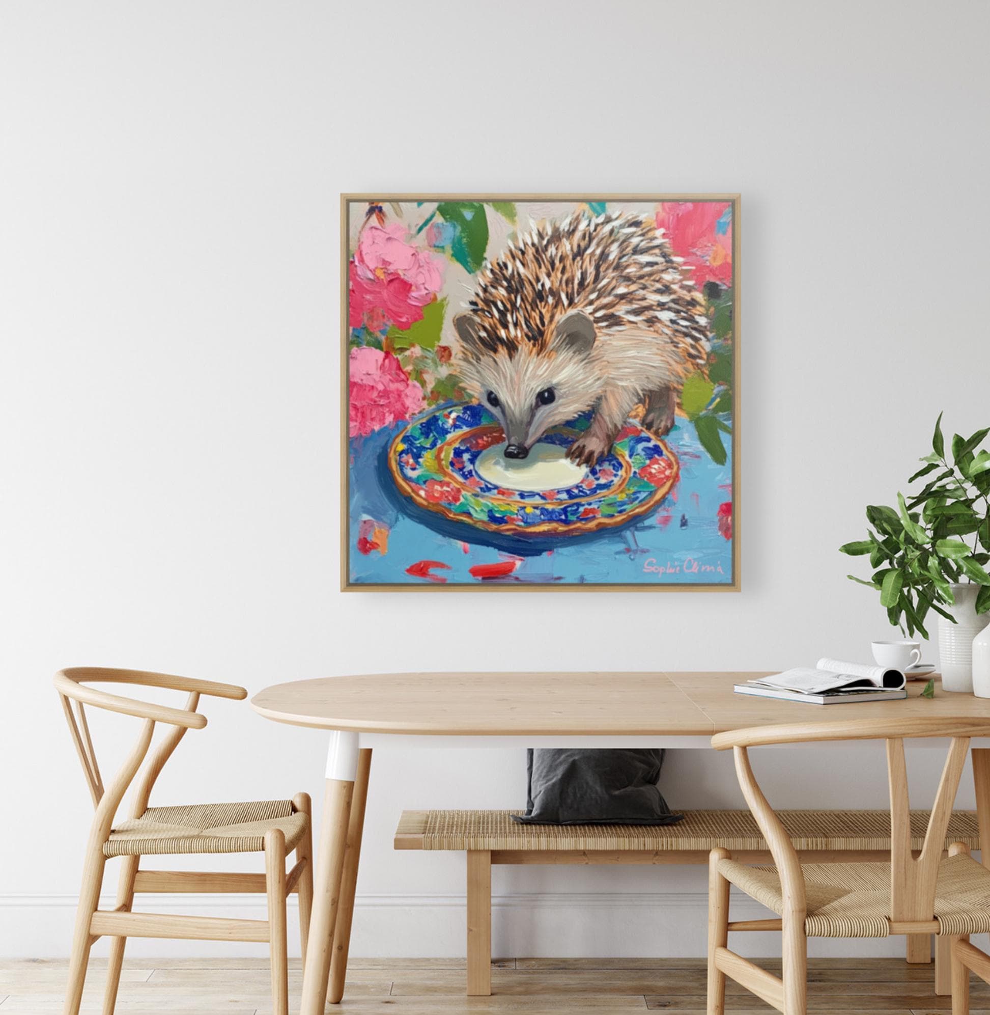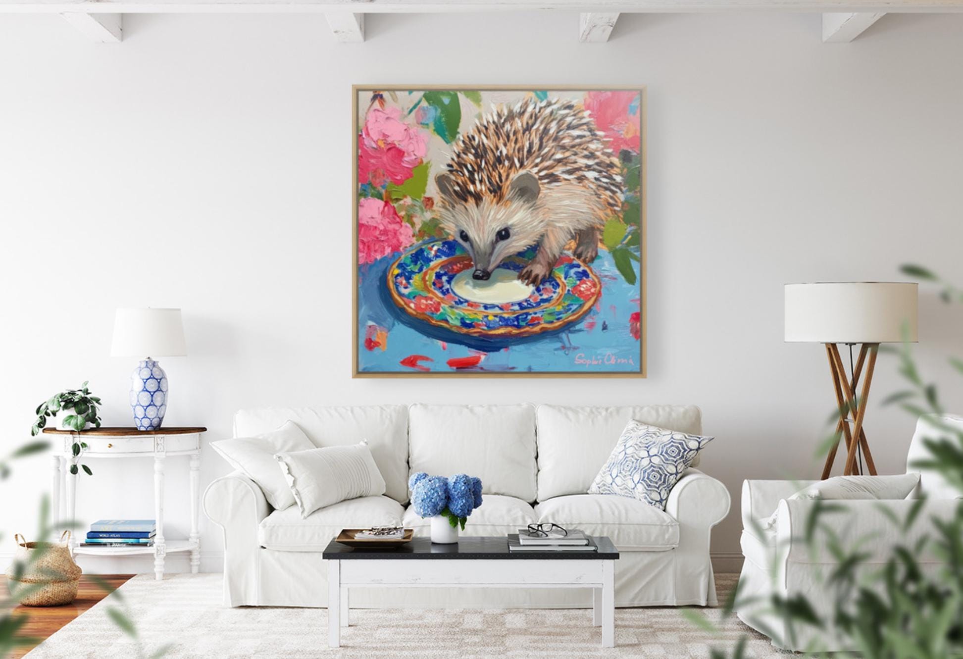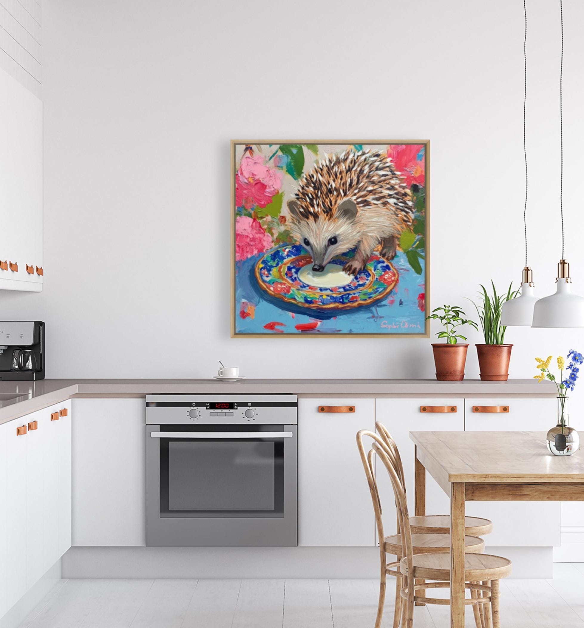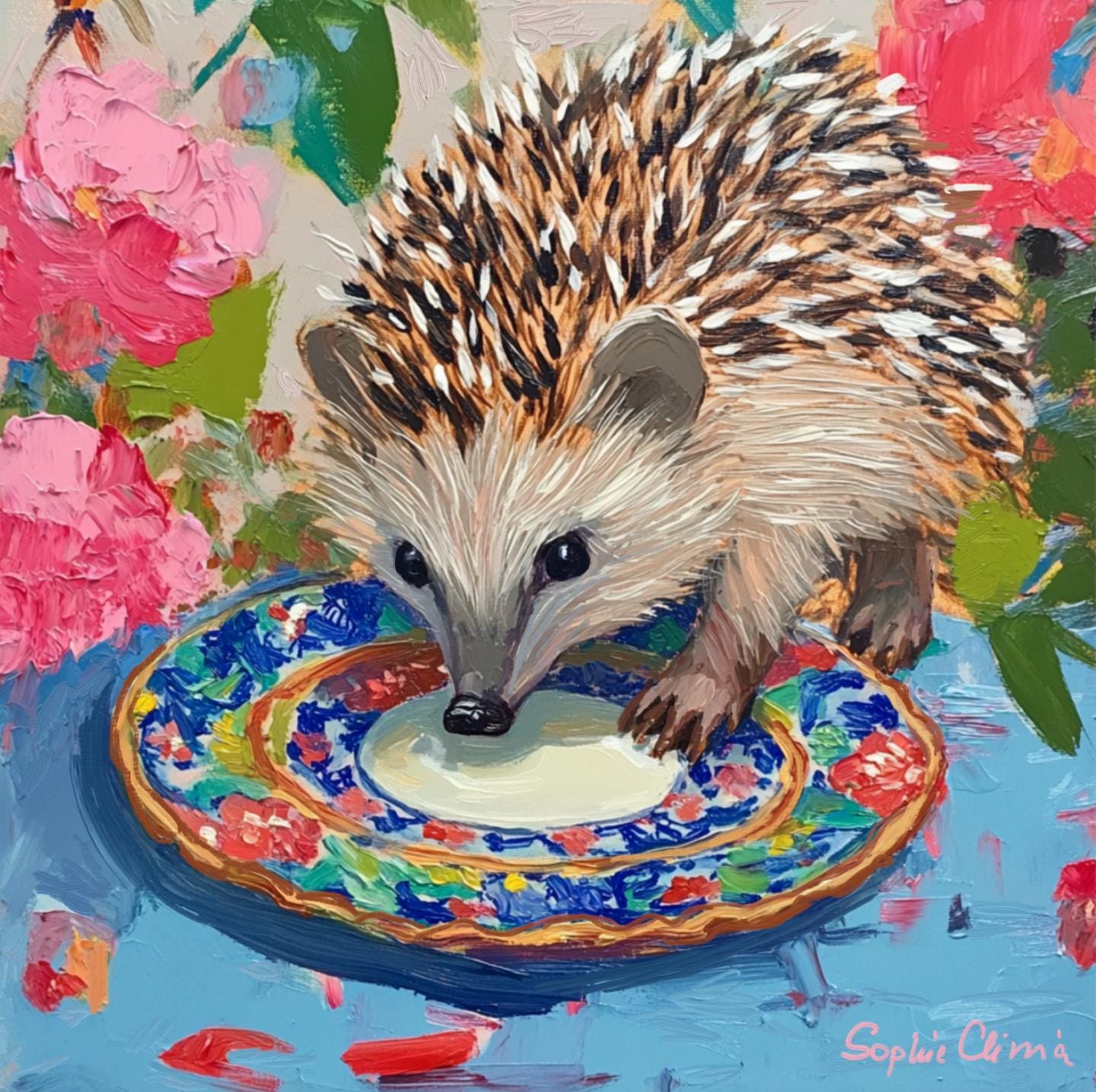 Hedgehog Drinking Milk Art Print: Whimsical Grandmillennial Decor