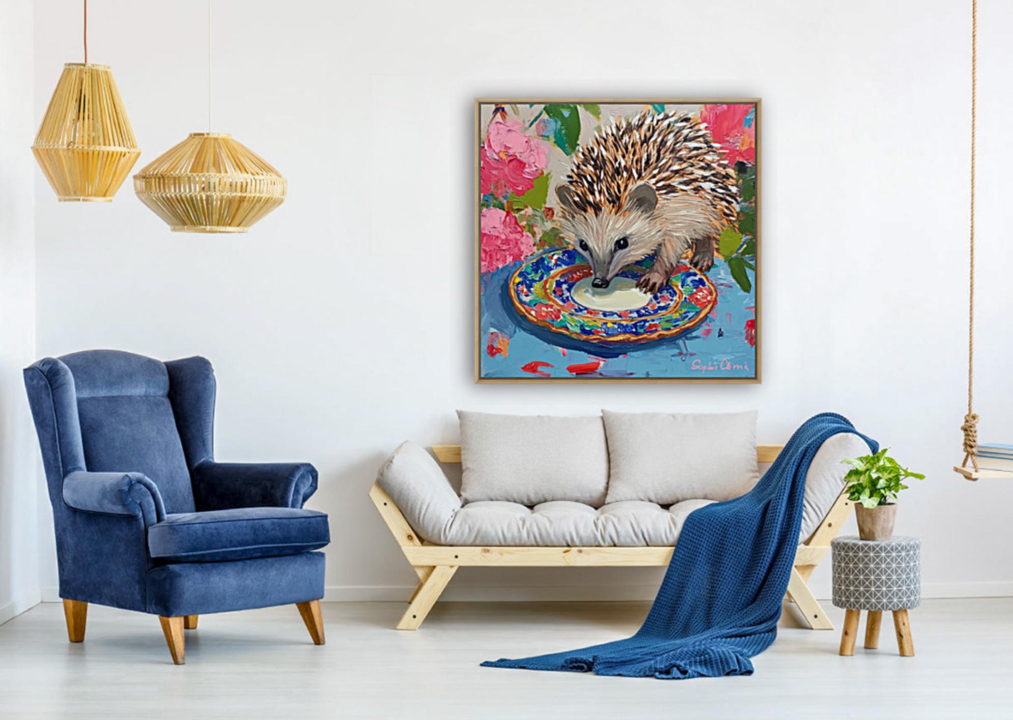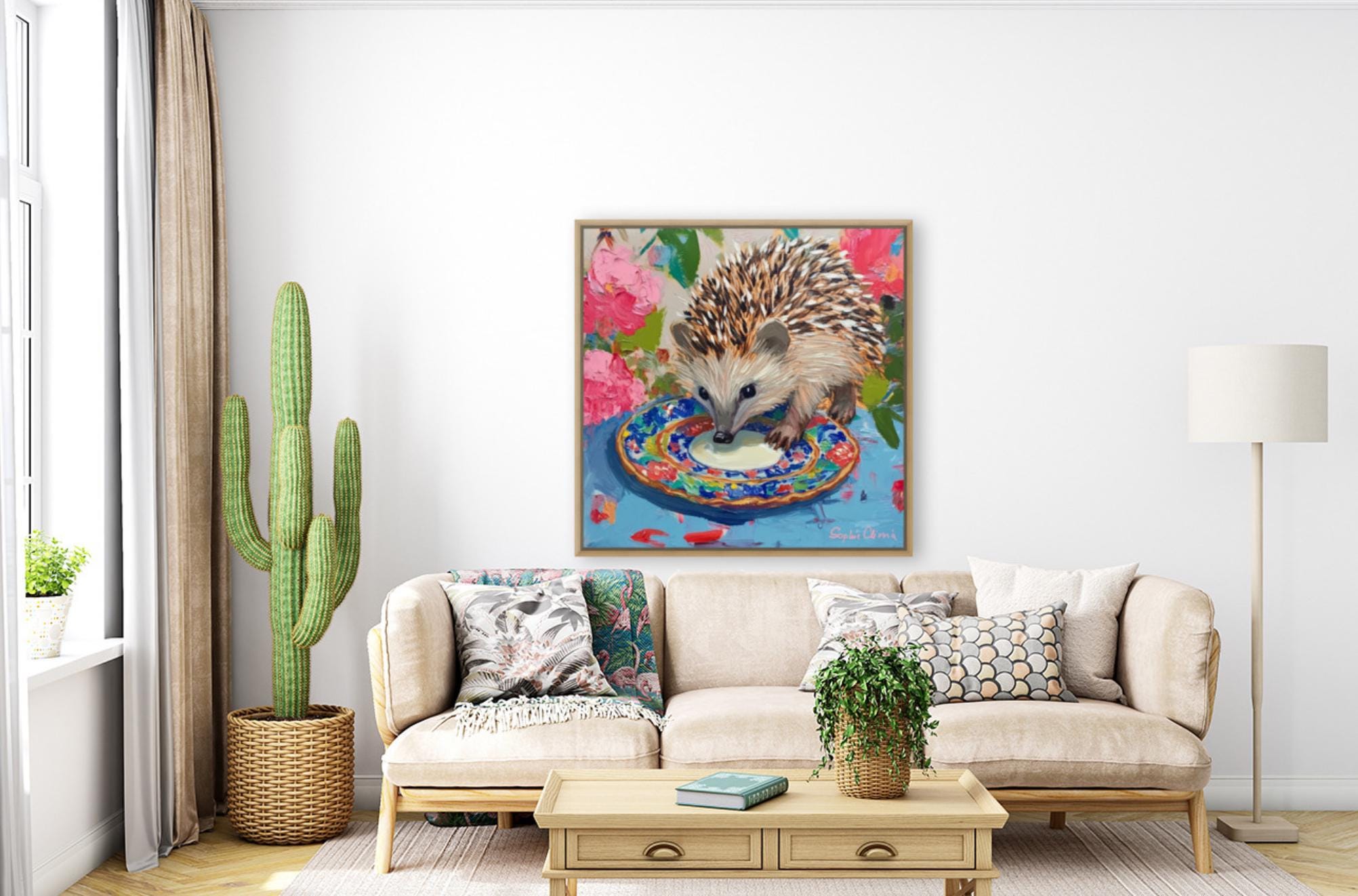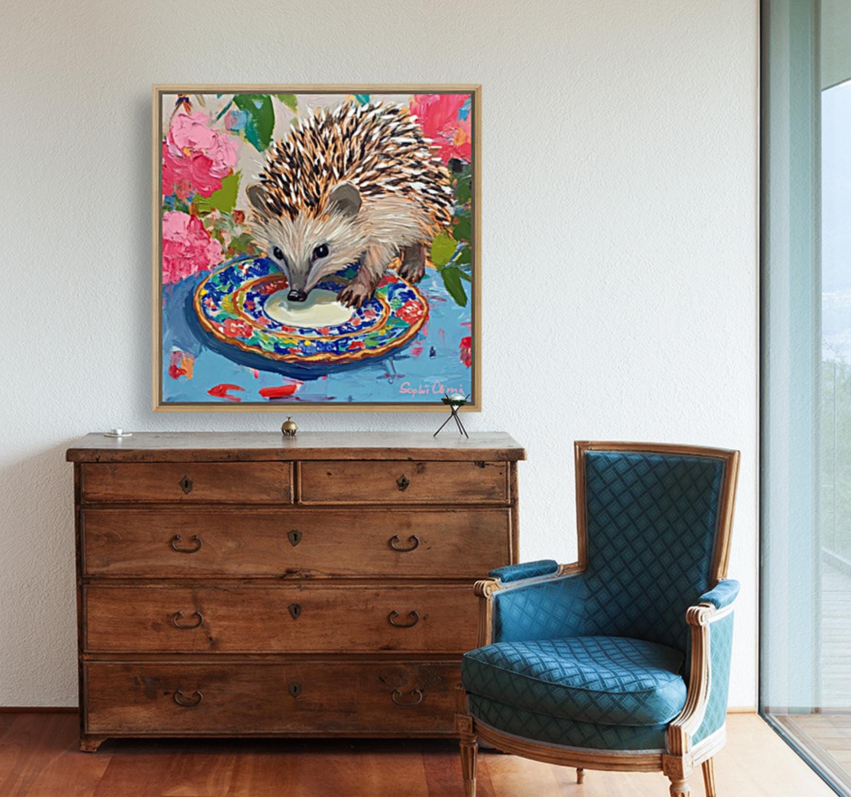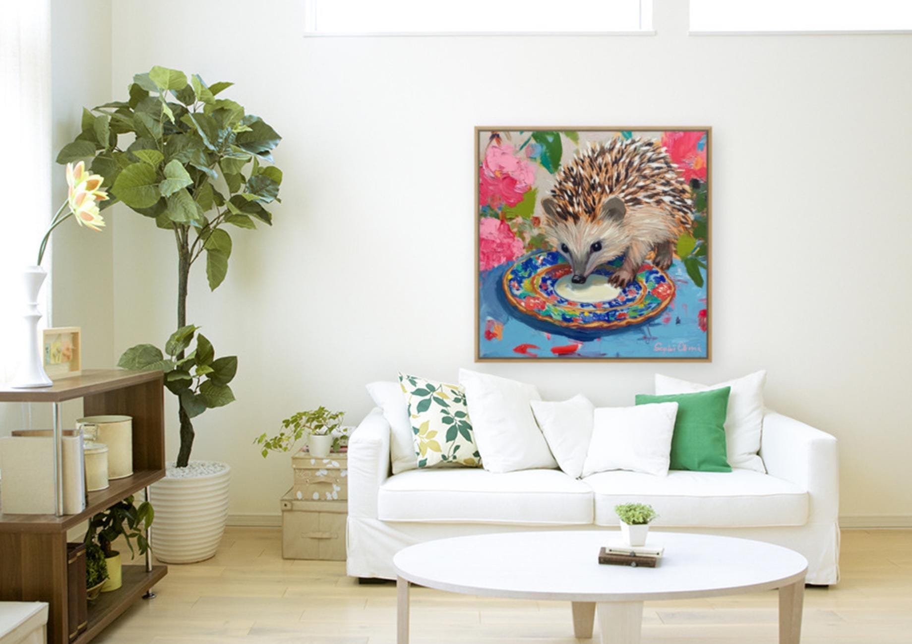 Hedgehog Drinking Milk Art Print: Whimsical Grandmillennial Decor