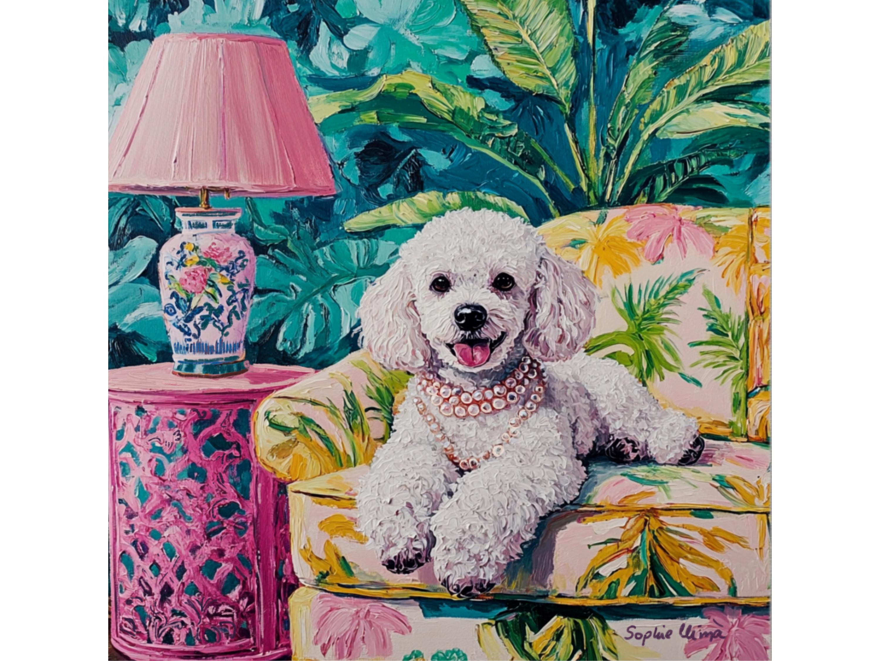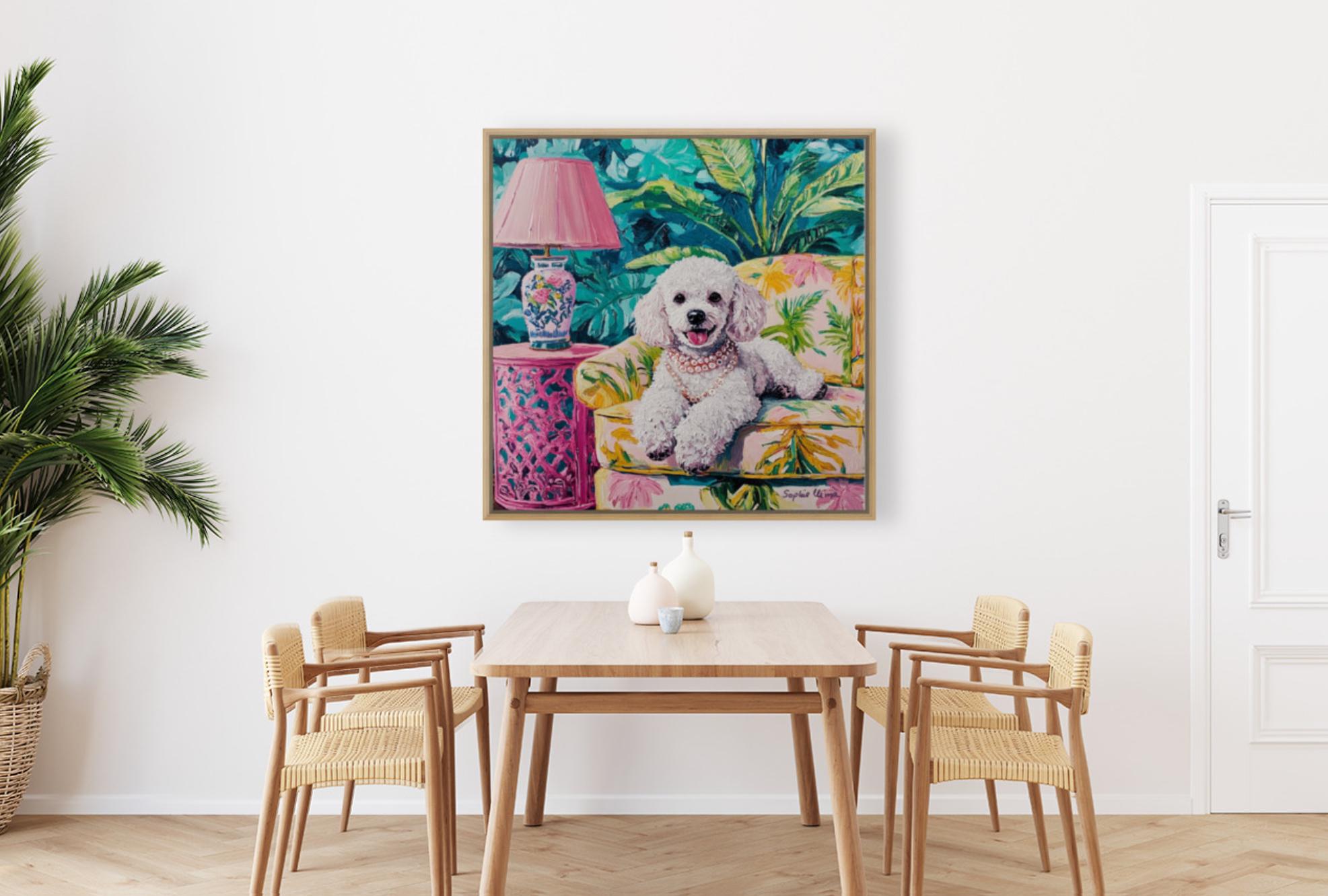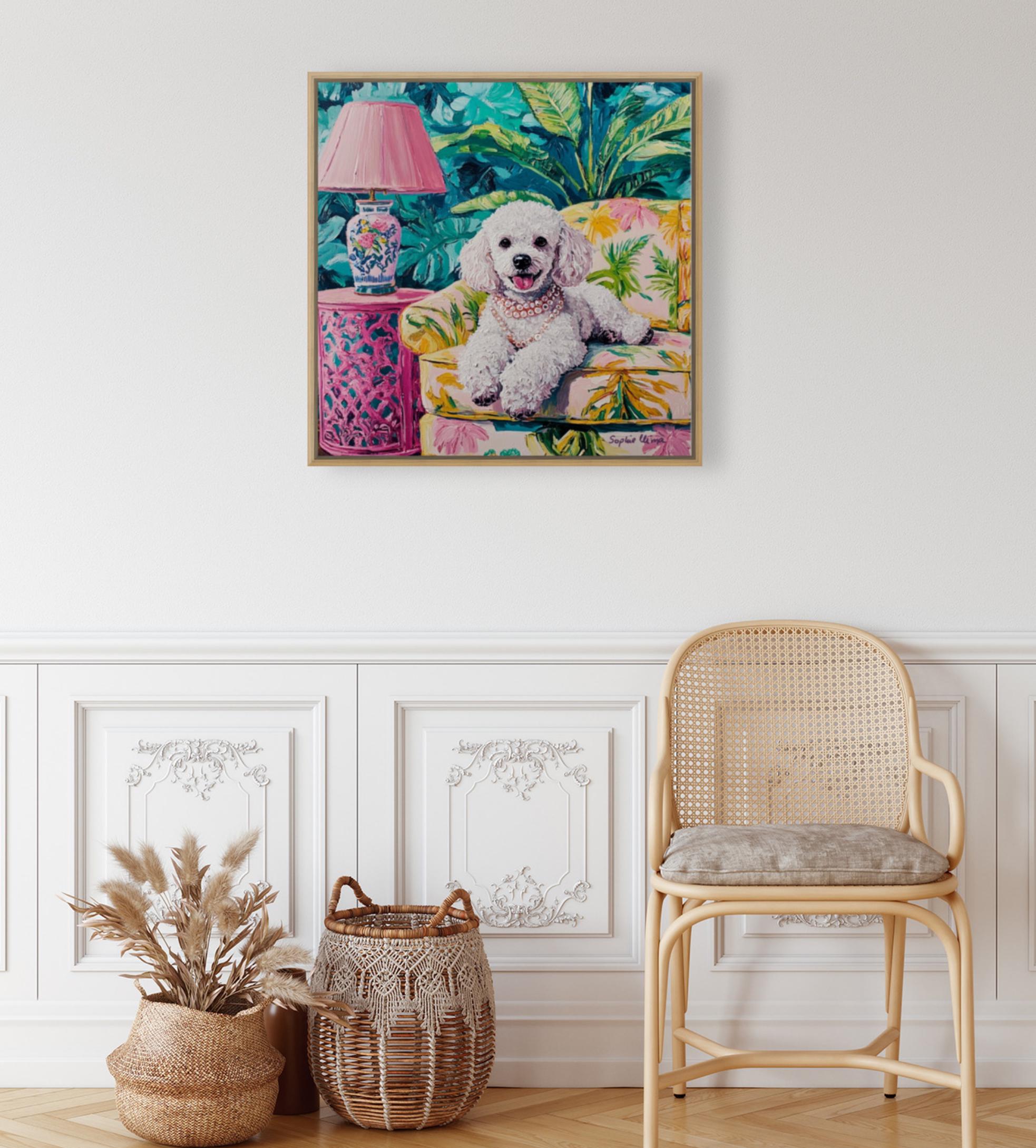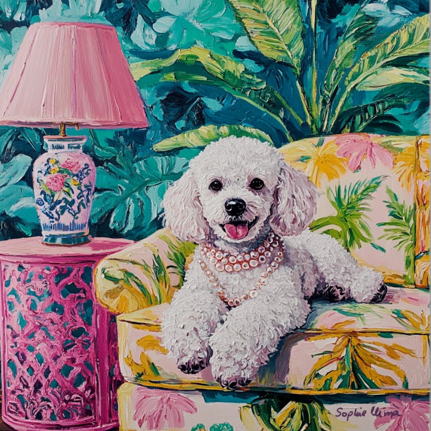 Bring timeless charm and a wink of whimsy to your walls with this fun detailed poodle portrait, lounging in lush Palm Beach drawing room. Inspired by the Grandmillennial aesthetic, this artwork is a celebration of all things elegant, nostalgic, and joyful—from the banana-leaf upholstery to the pearls around her neck 🥰