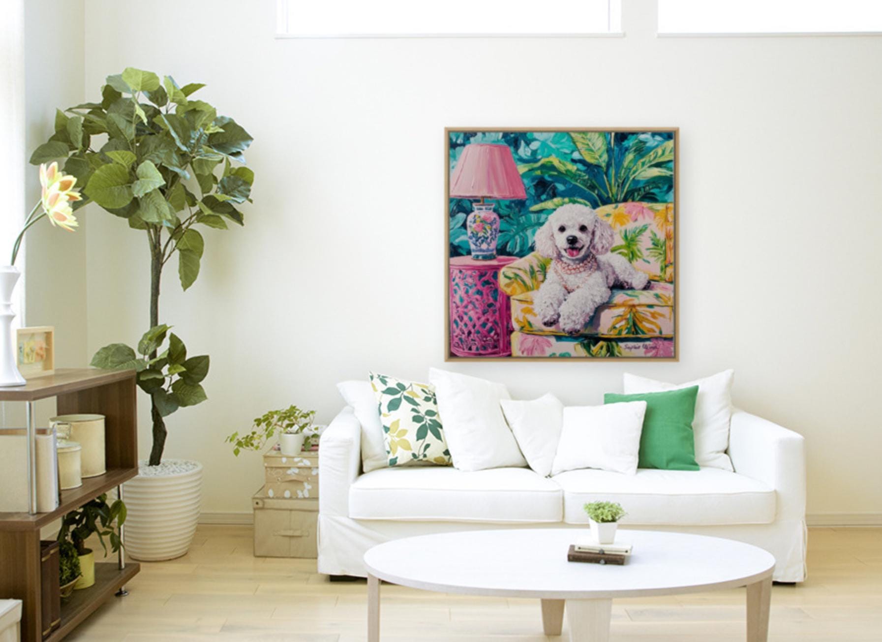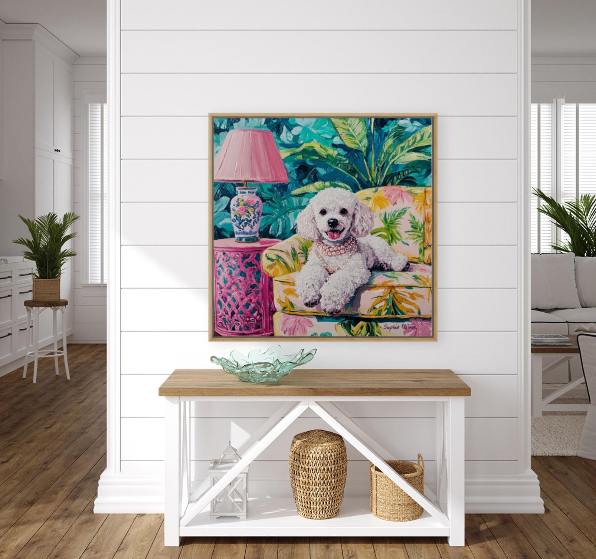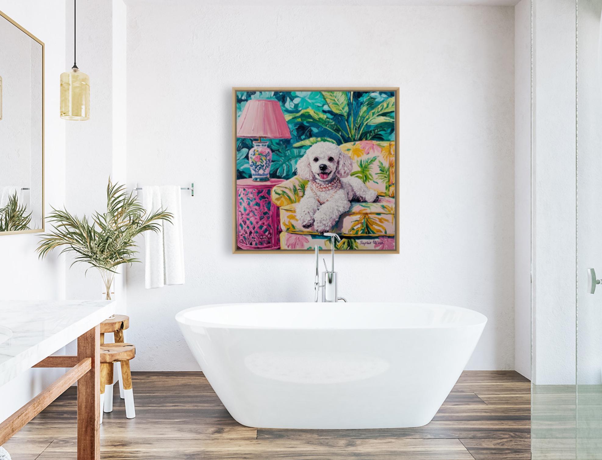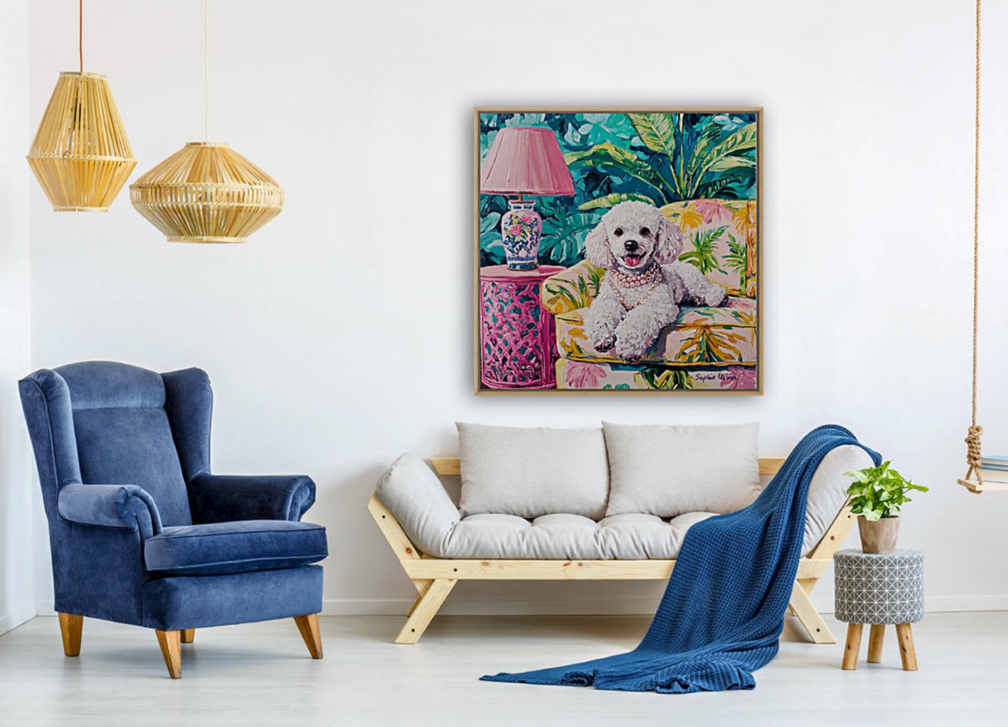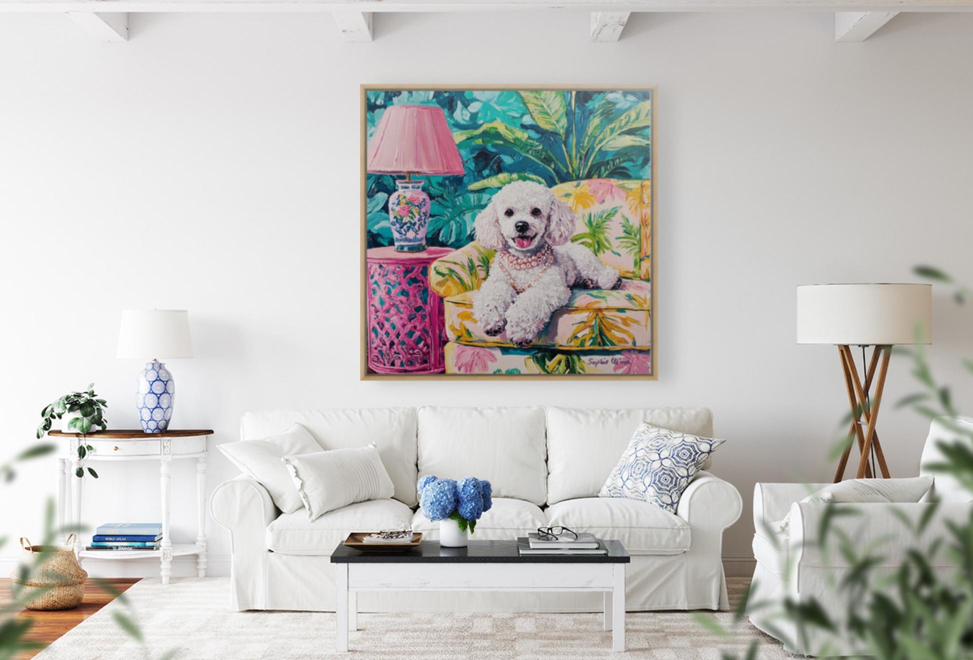 Bring timeless charm and a wink of whimsy to your walls with this fun detailed poodle portrait, lounging in lush Palm Beach drawing room. Inspired by the Grandmillennial aesthetic, this artwork is a celebration of all things elegant, nostalgic, and joyful—from the banana-leaf upholstery to the pearls around her neck 🥰