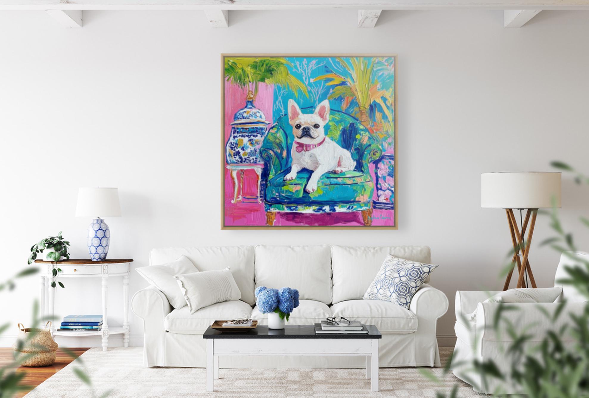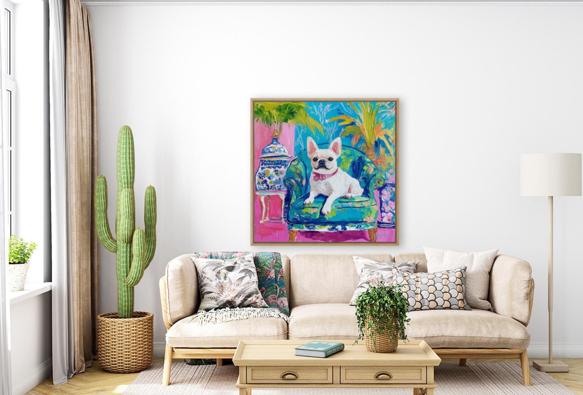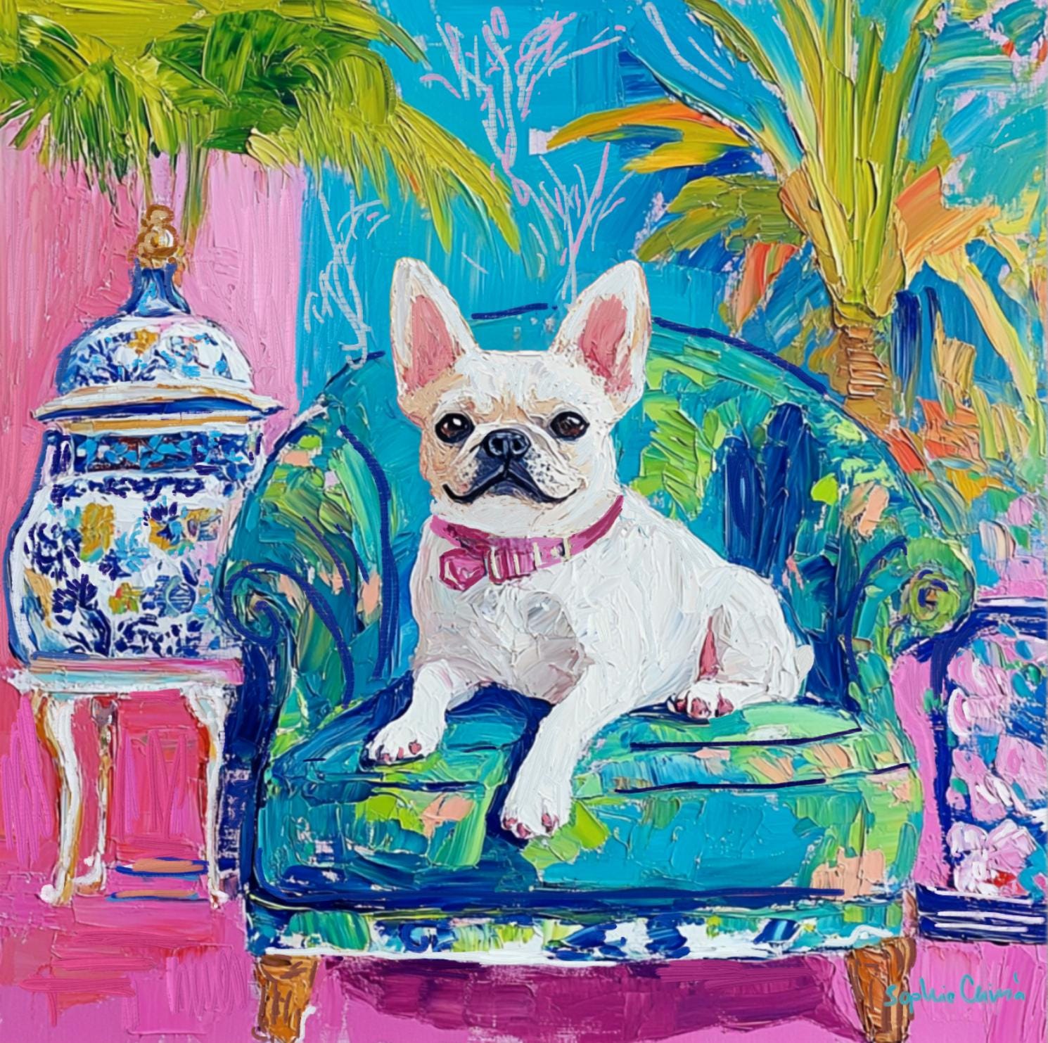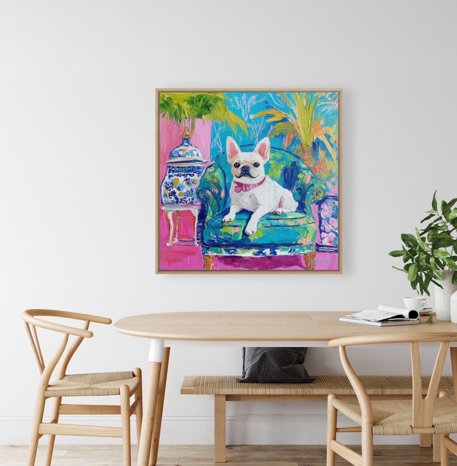 Grandmillennial art, Preppy French Bulldog on Turquoise chair, whimsical dogs art