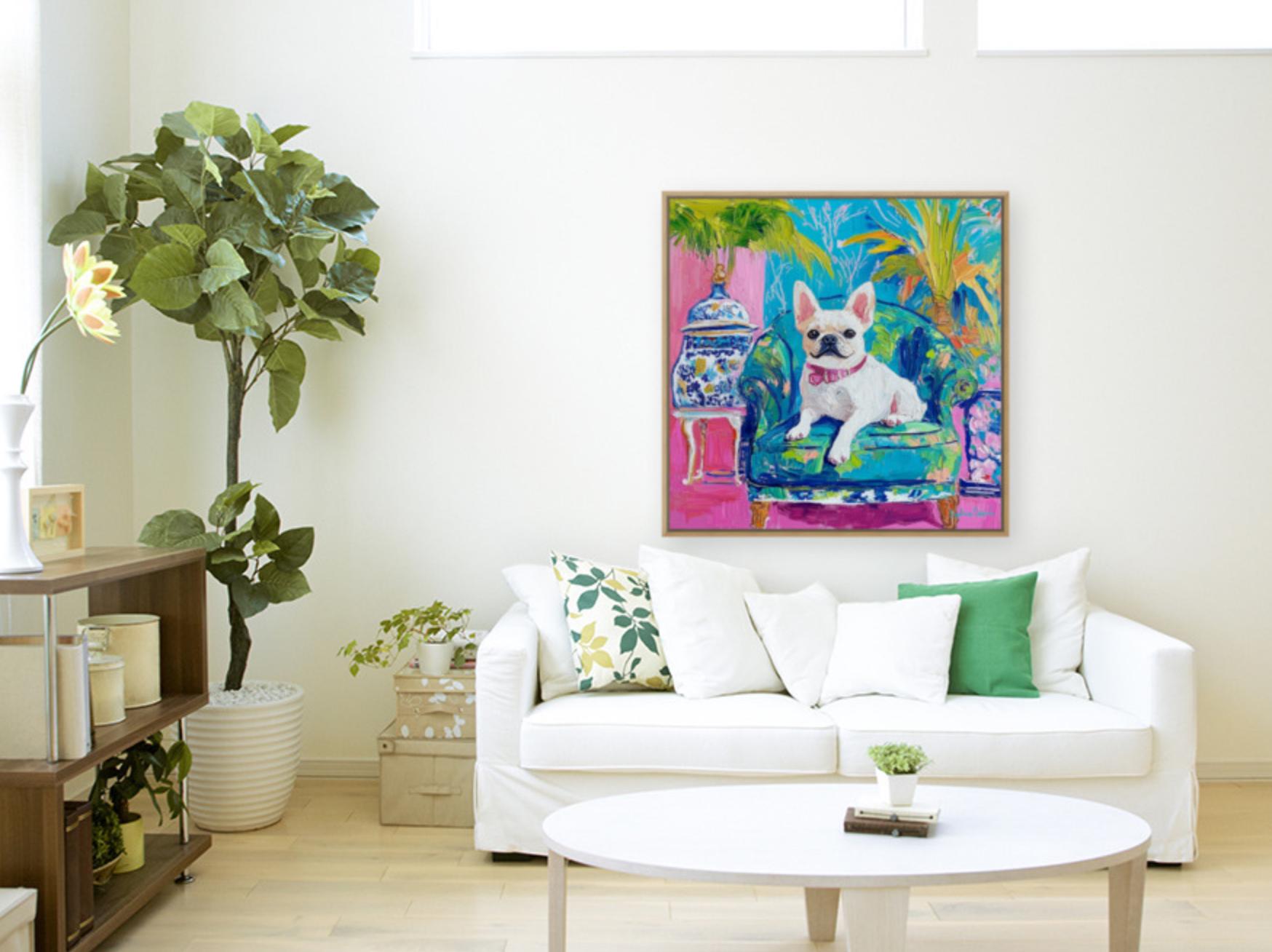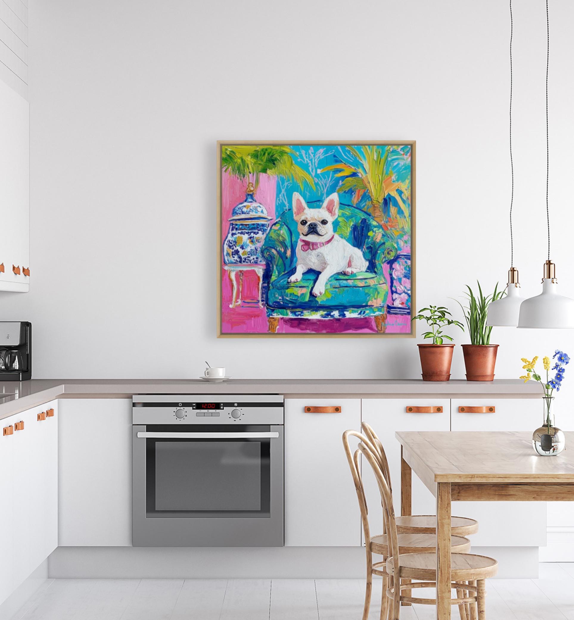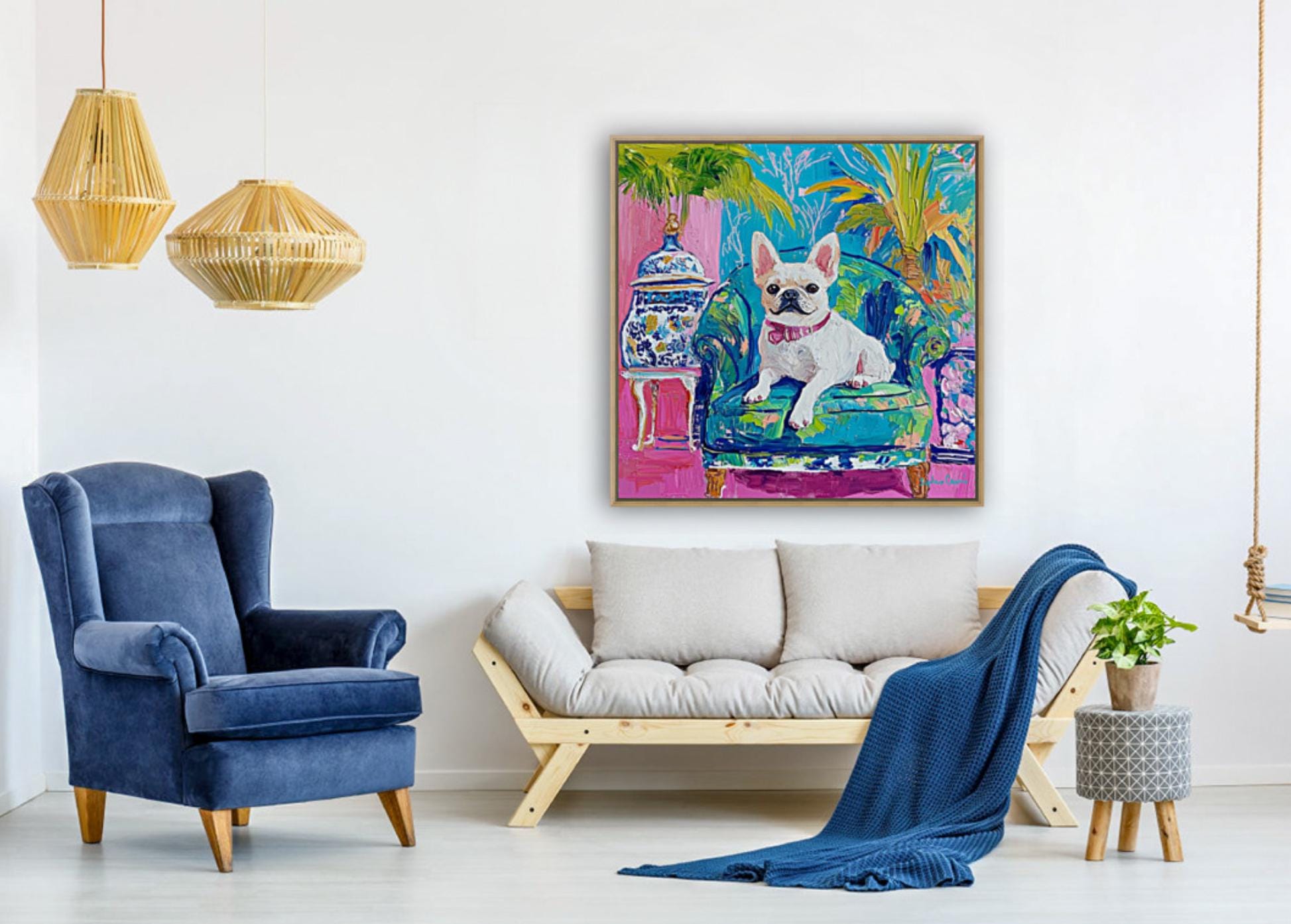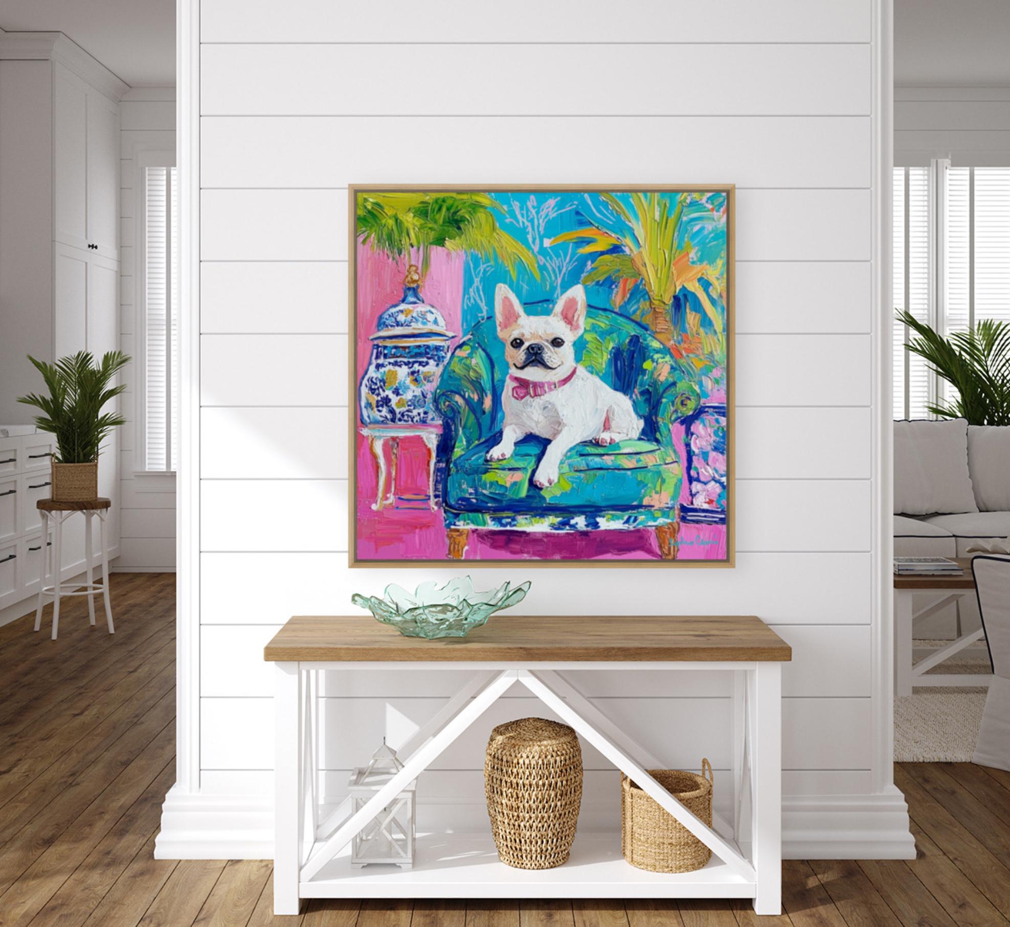 Grandmillennial art, Preppy French Bulldog on Turquoise chair, whimsical dogs art