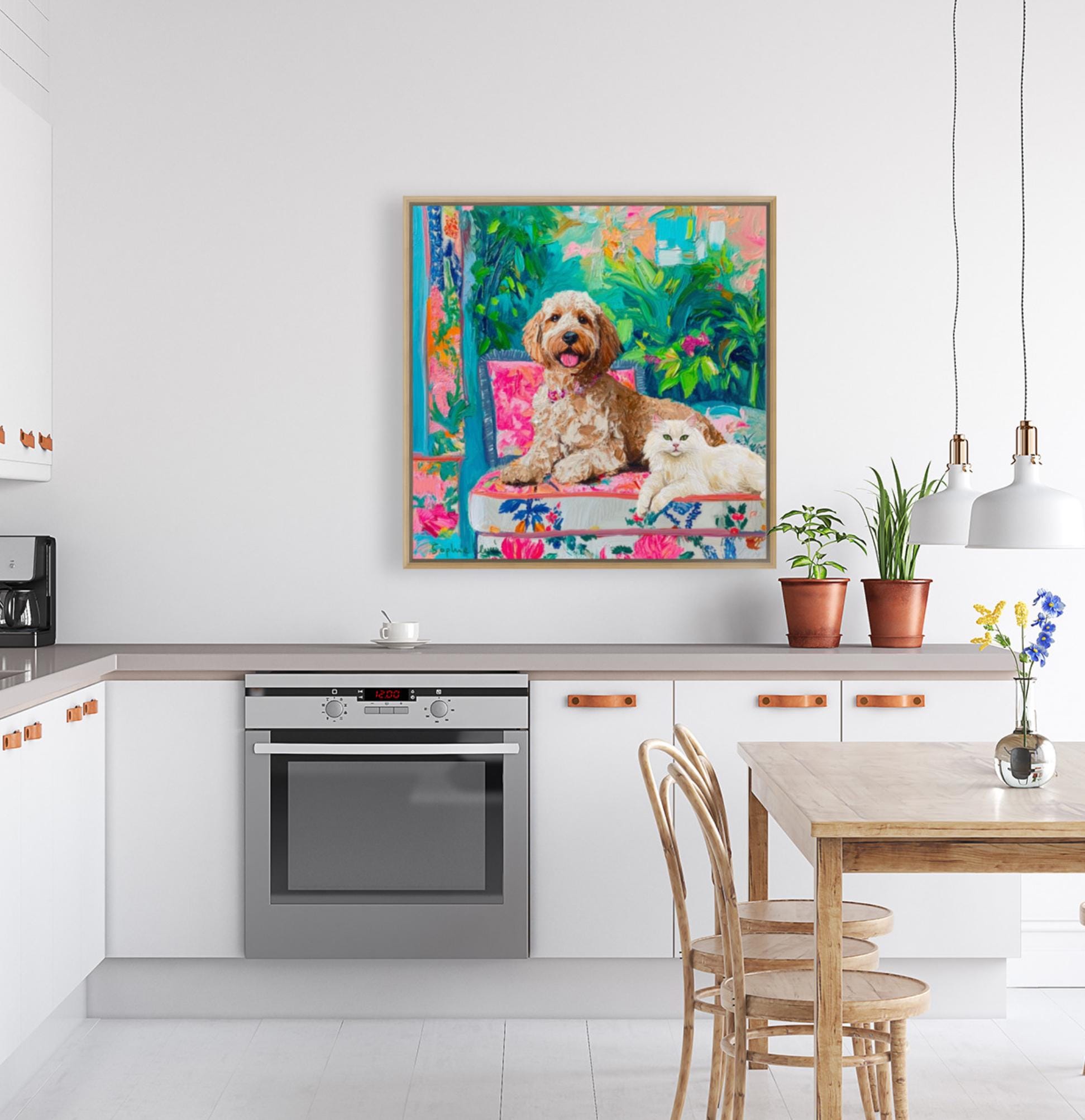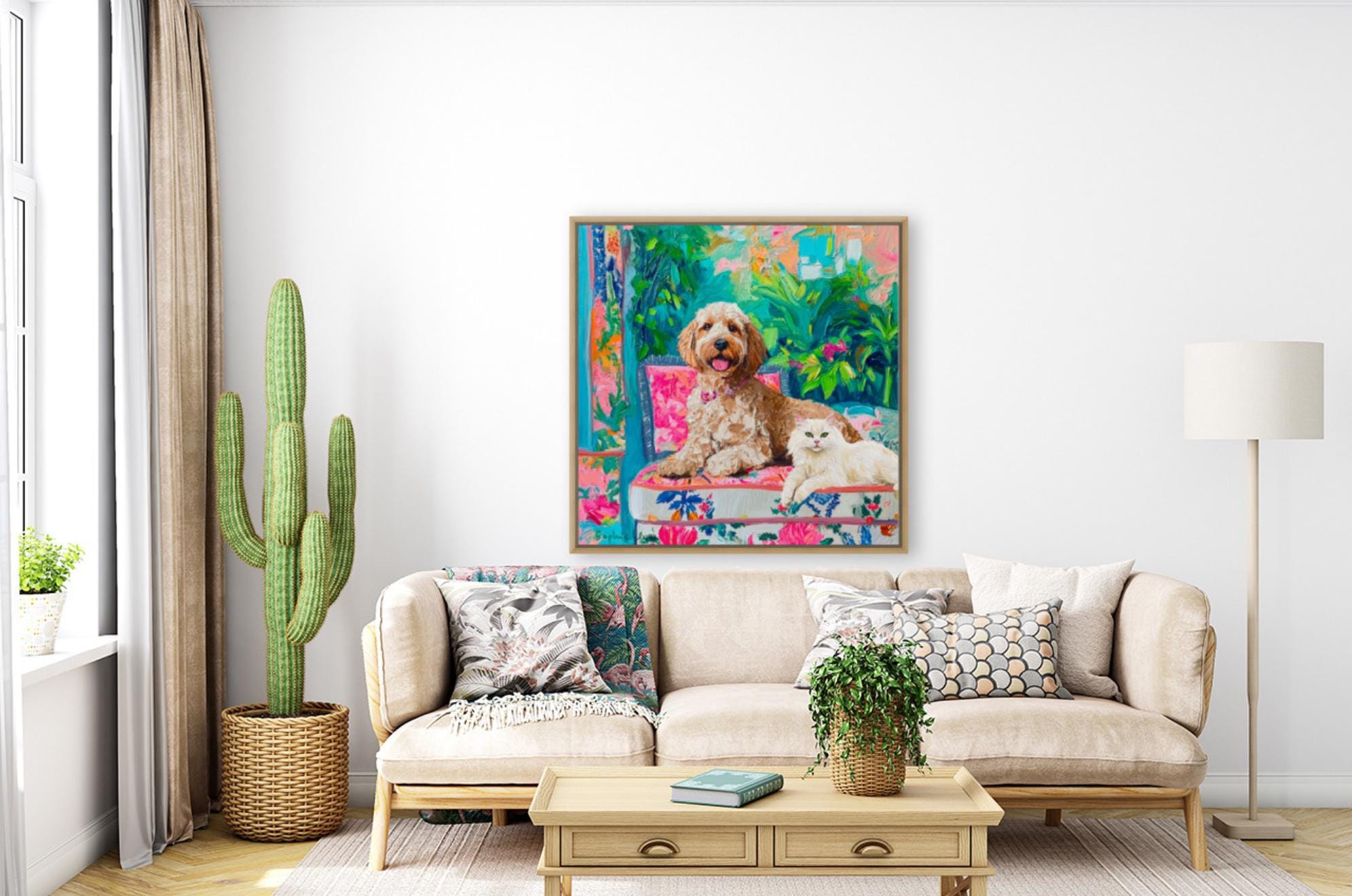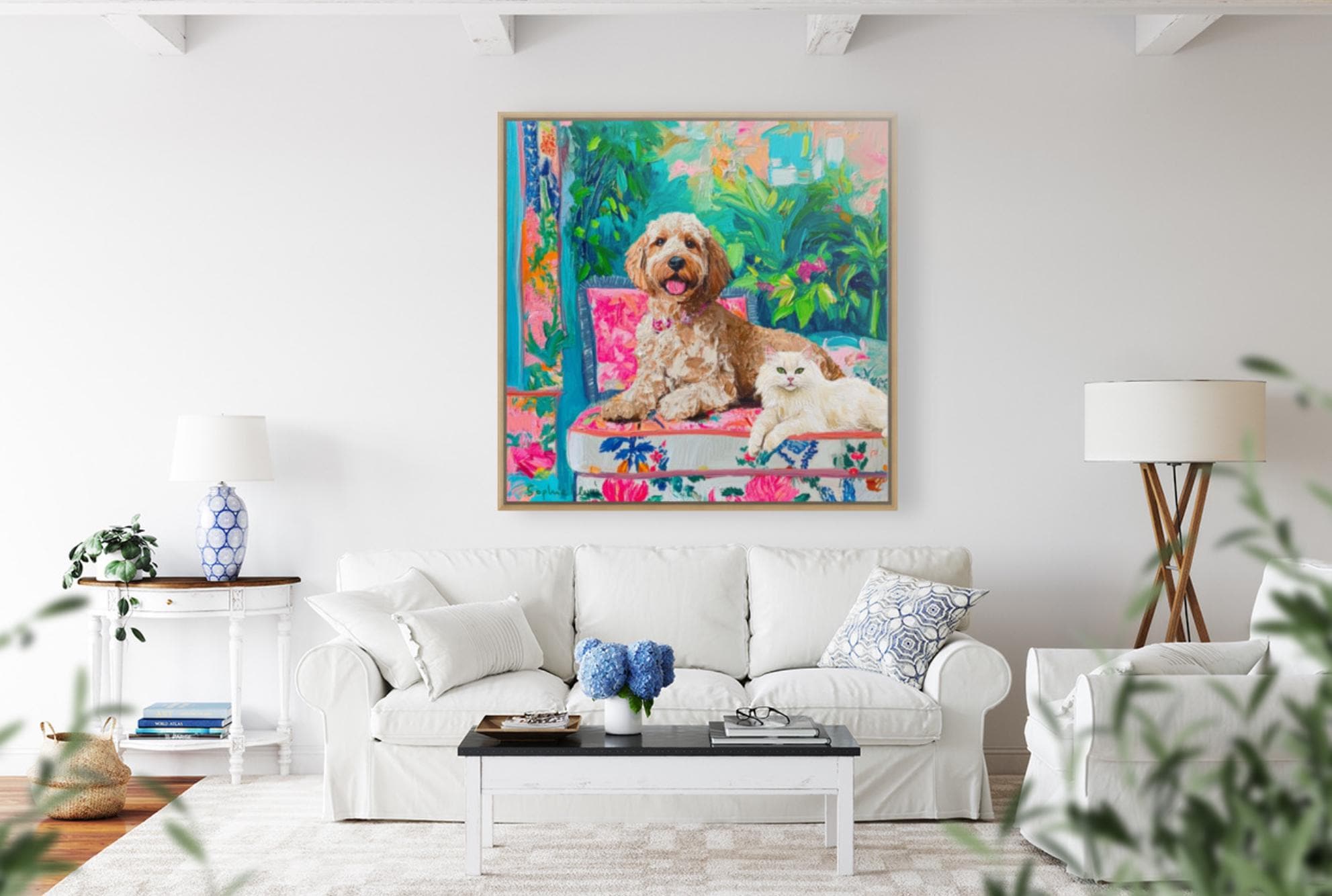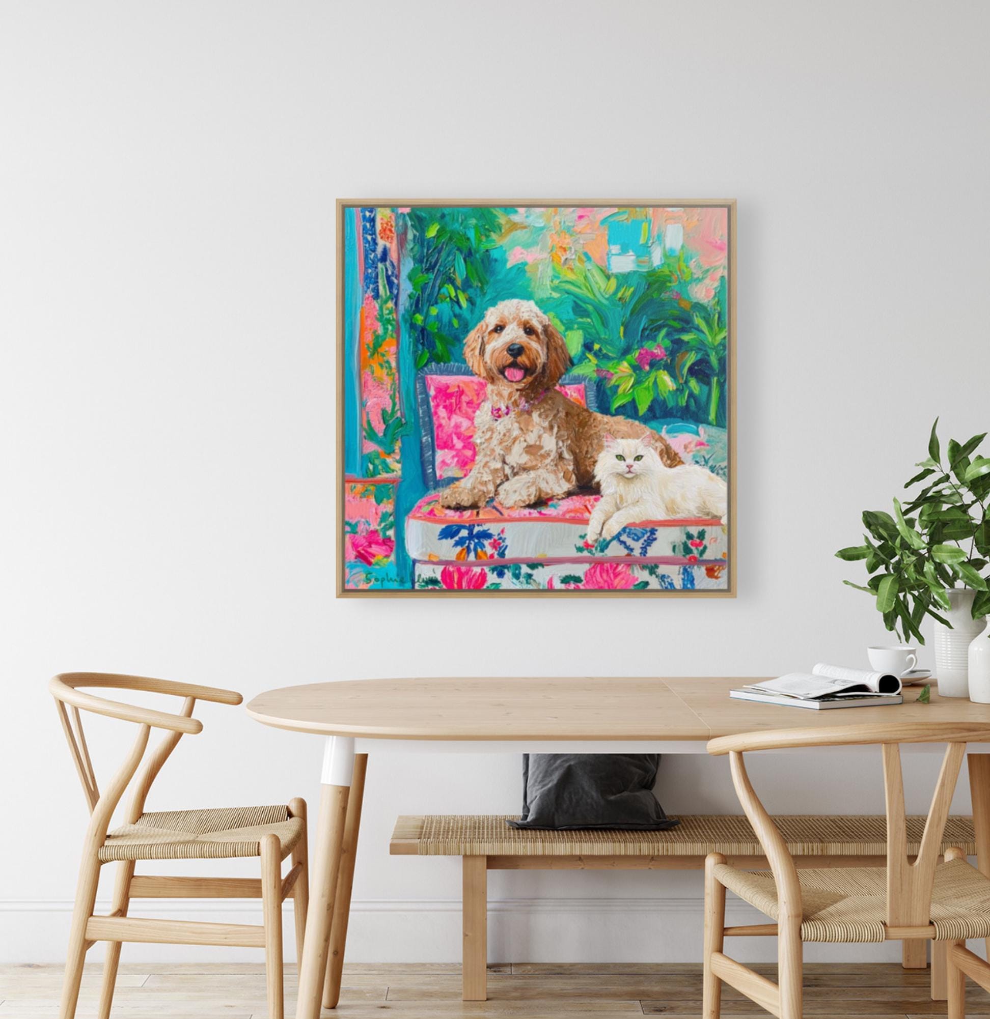Whimsical Labradoodle & White Cat Art Print: Grandmillennial Style