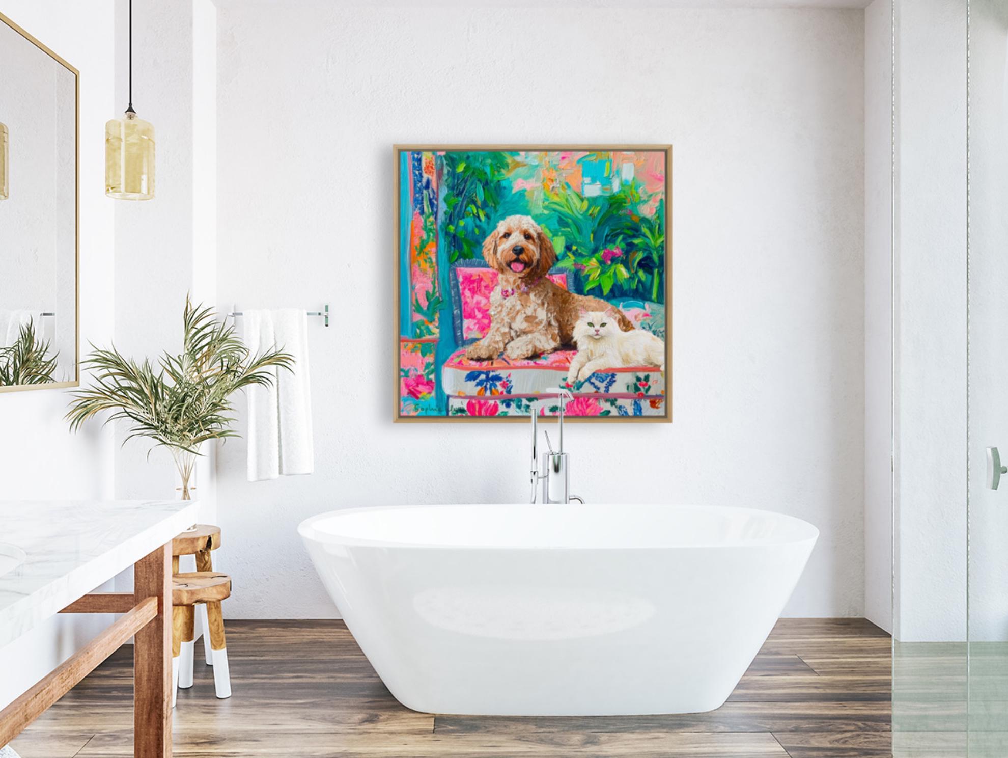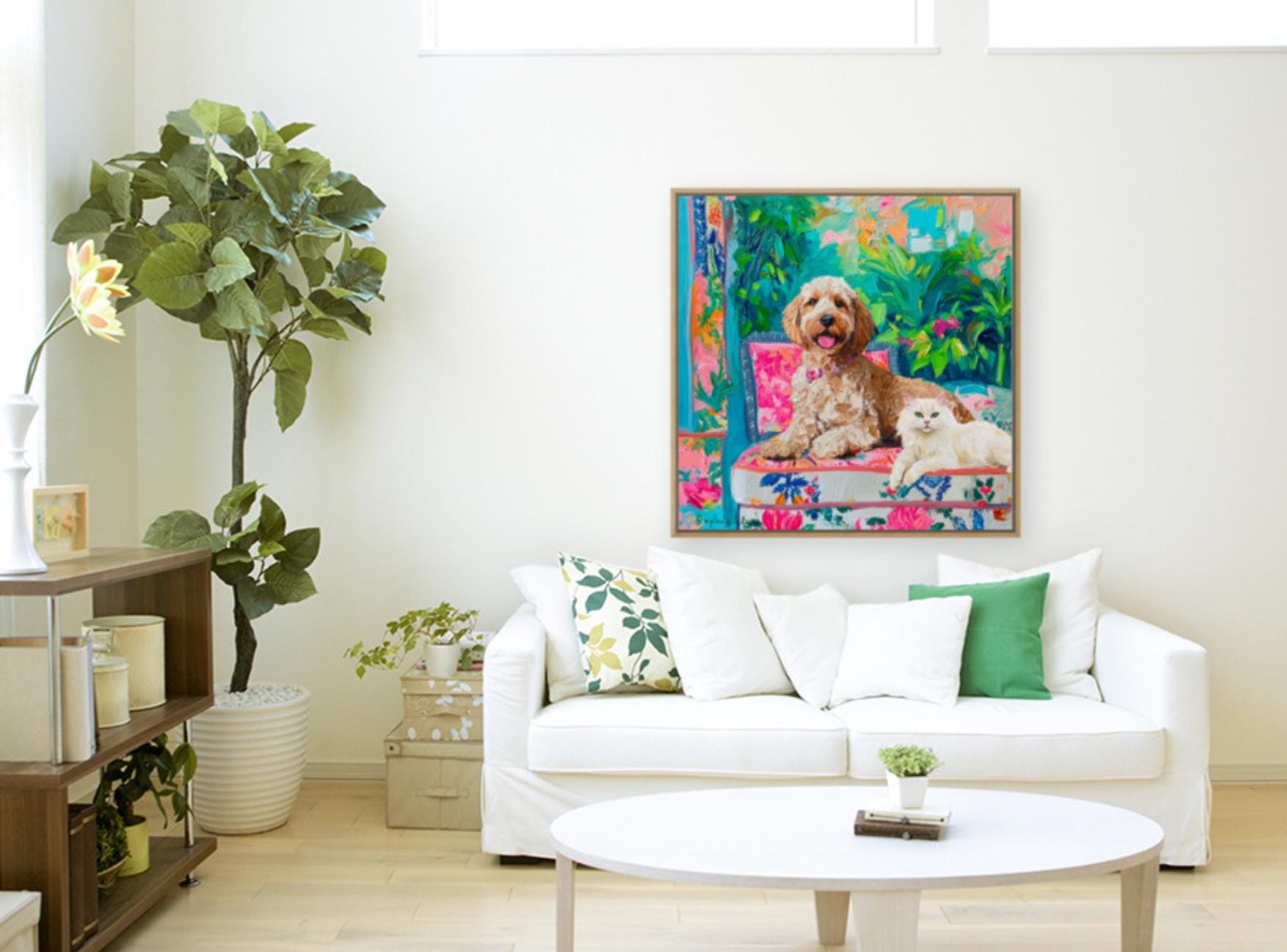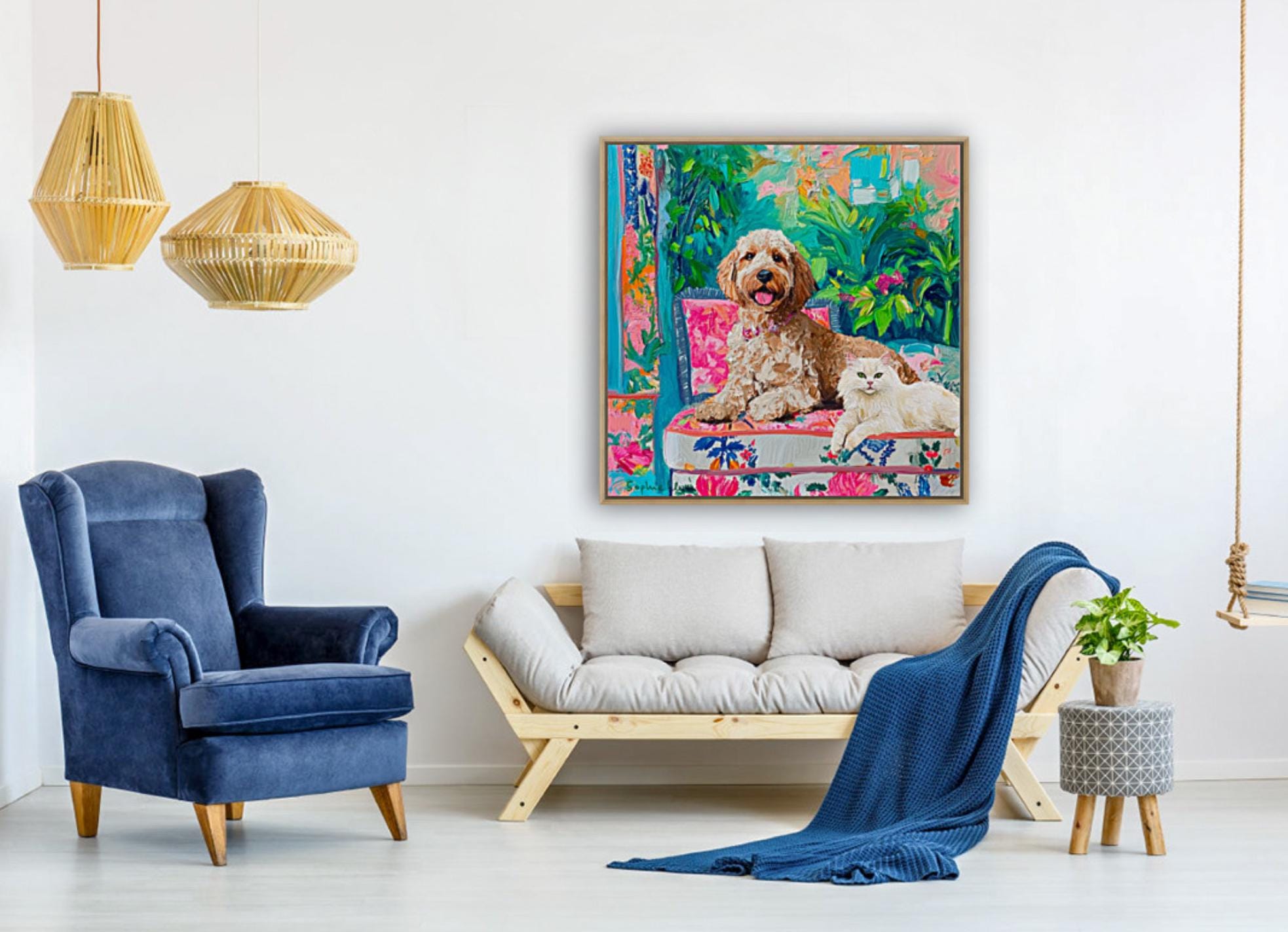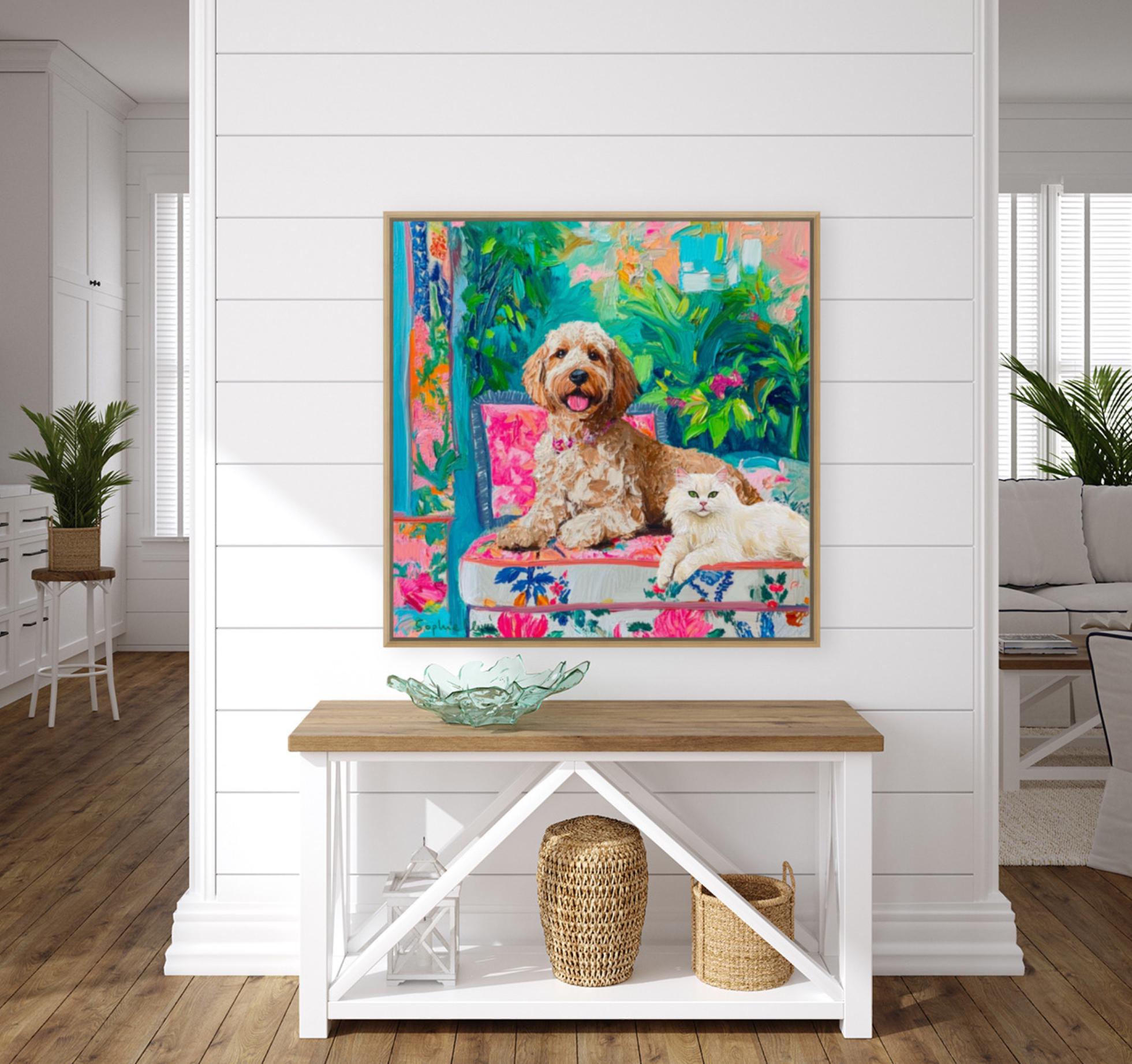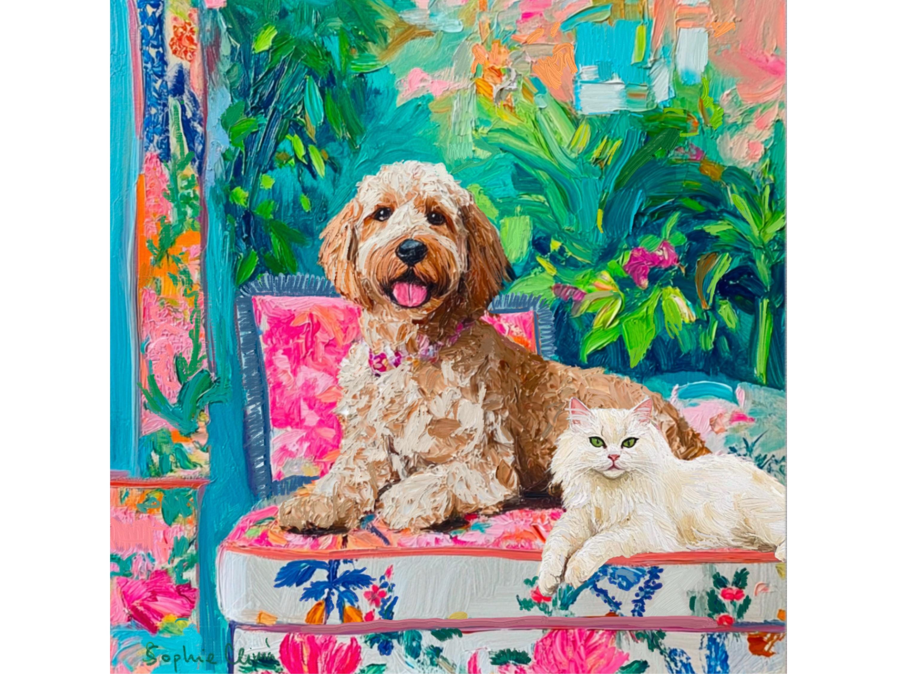 Whimsical Labradoodle & White Cat Art Print: Grandmillennial Style