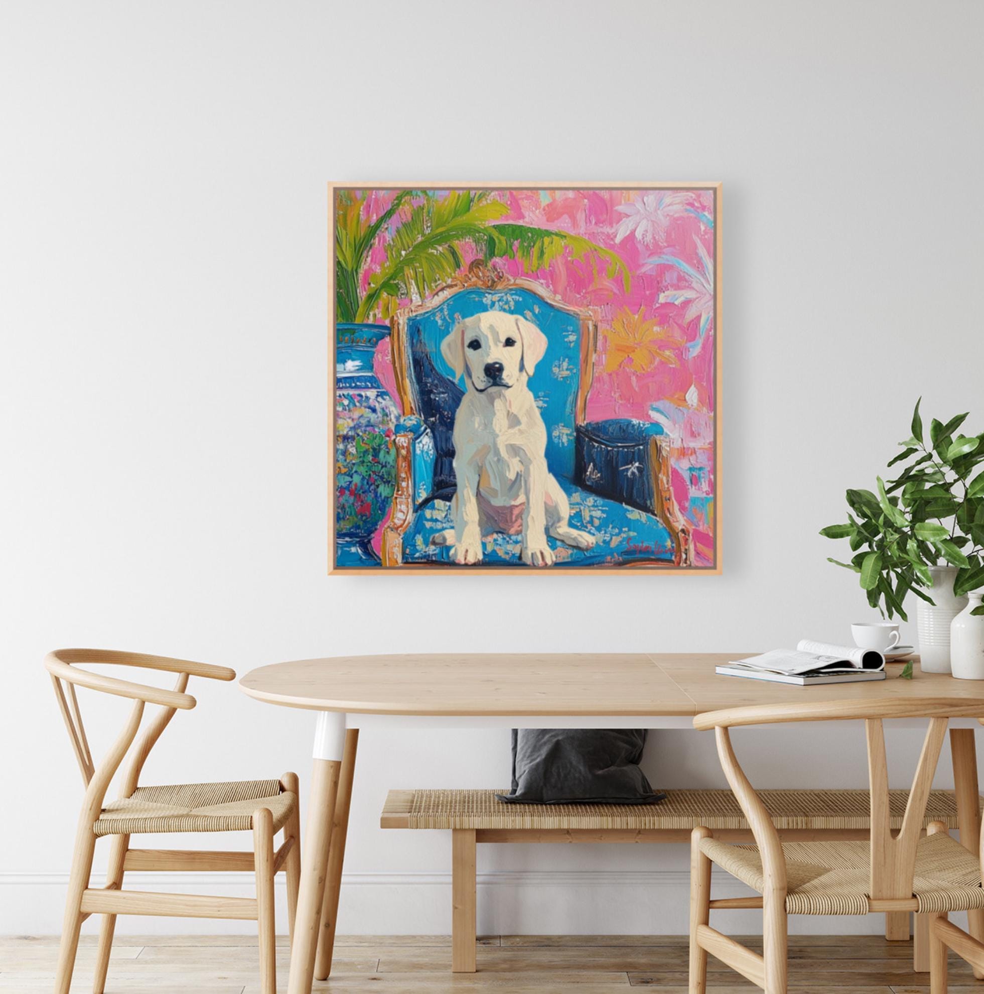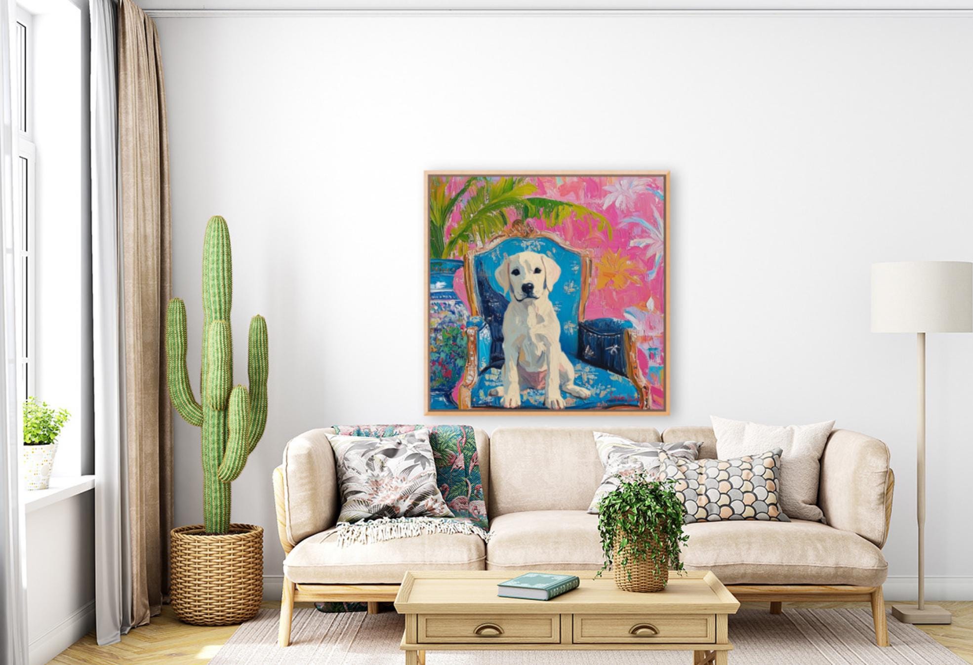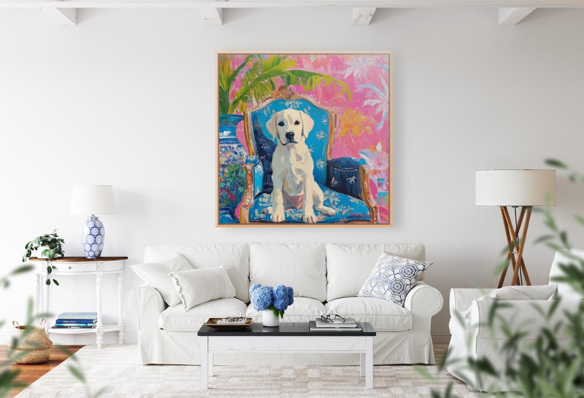 Grandmillennial art, Labrador puppy on a blue chair, whimsical fine art
