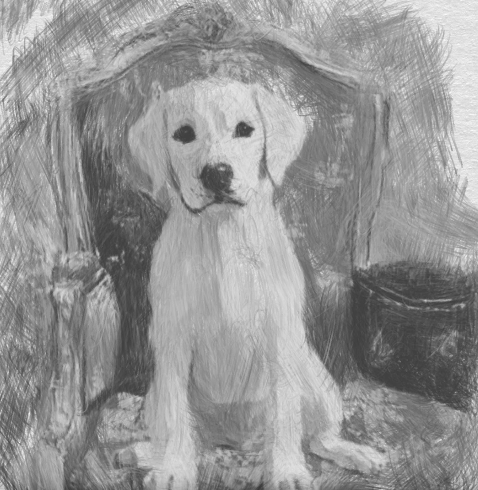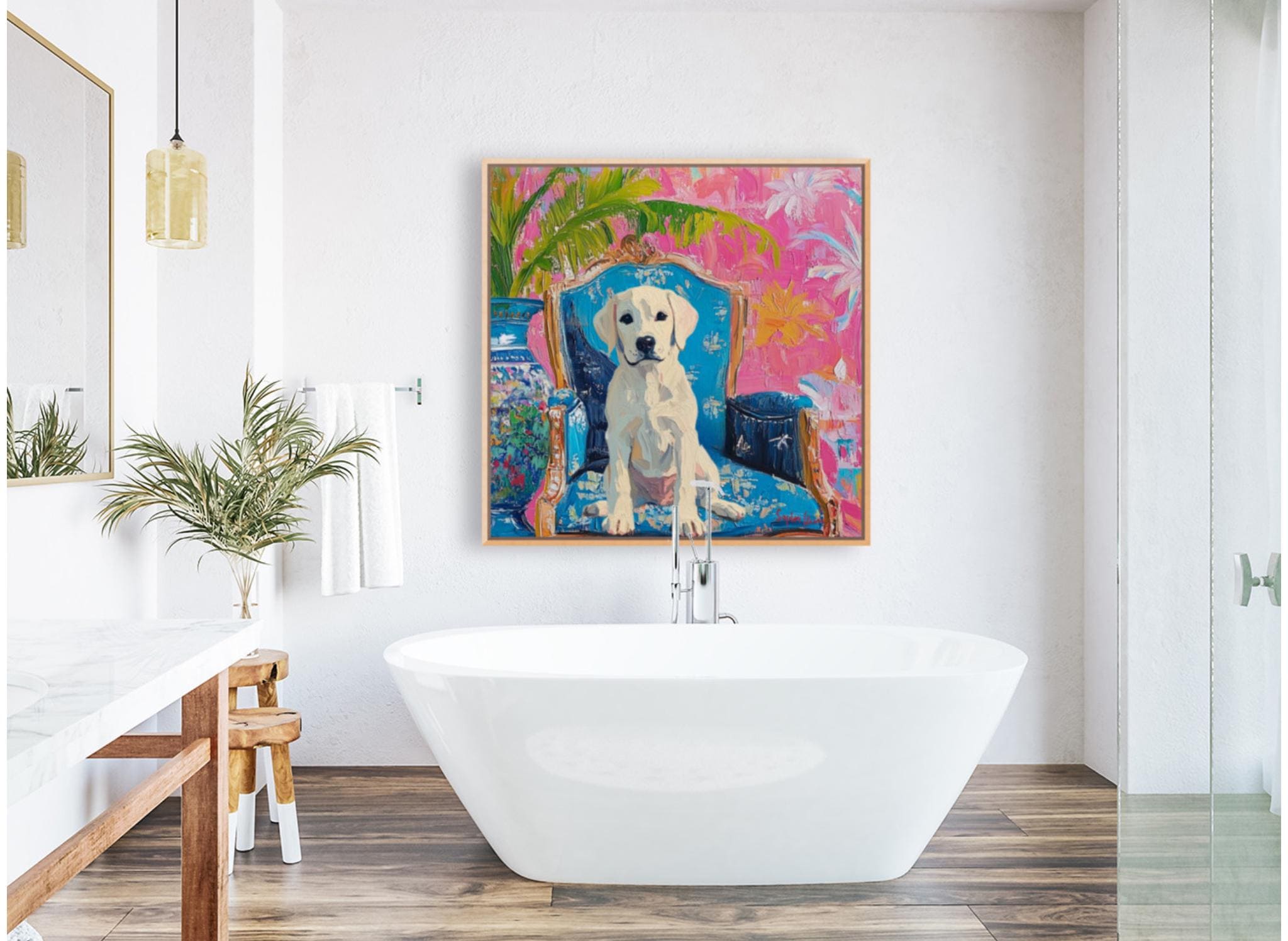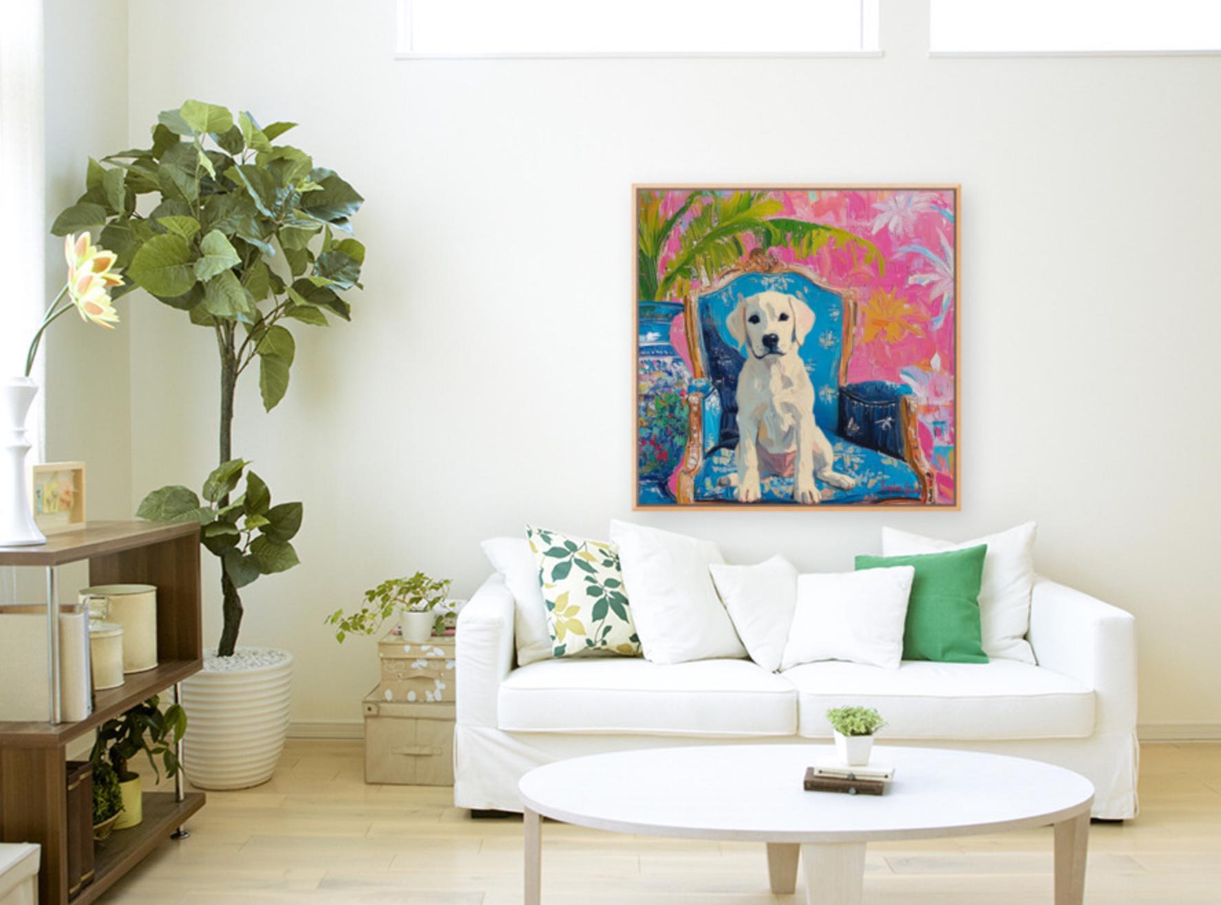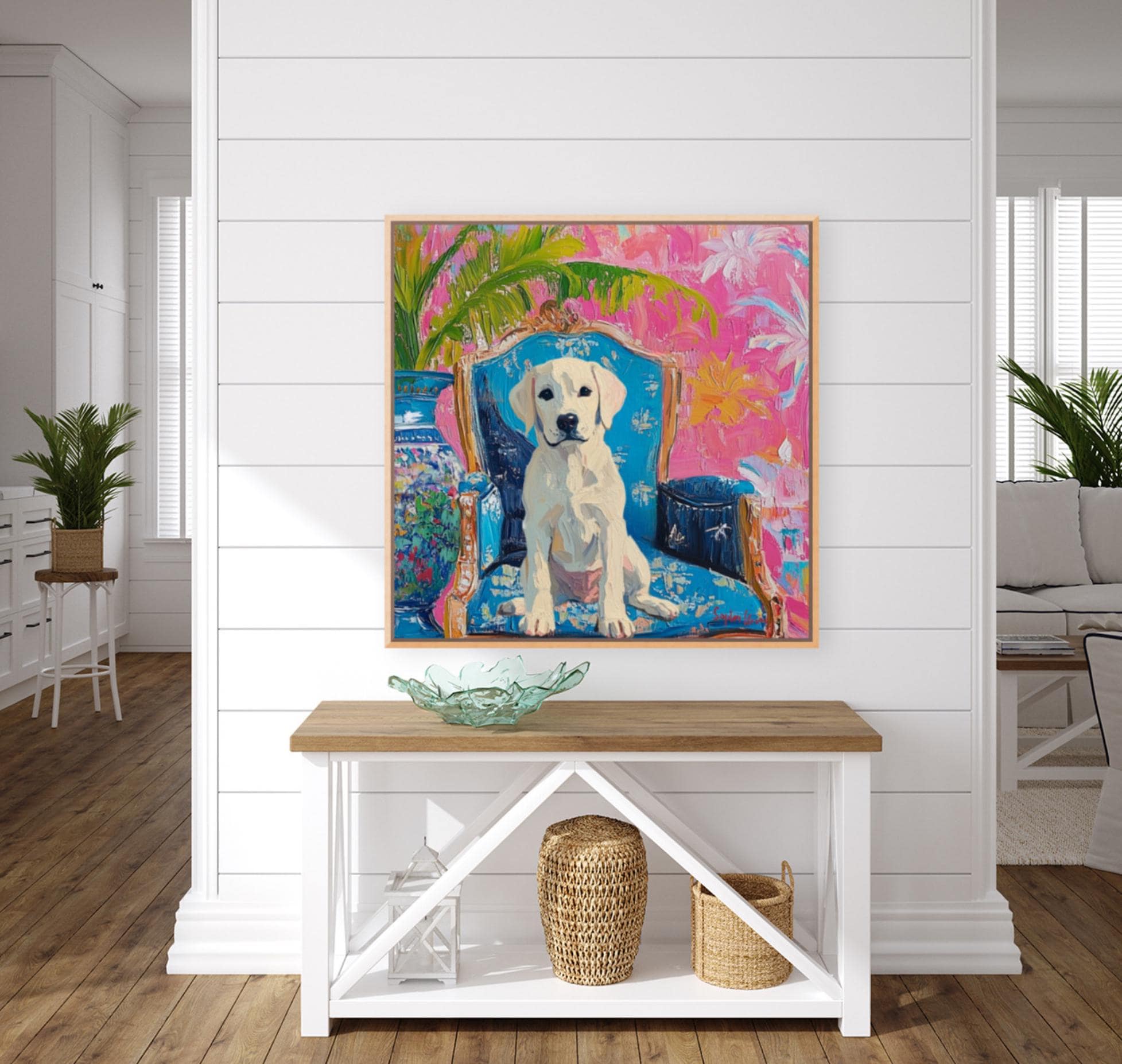 Grandmillennial art, Labrador puppy on a blue chair, whimsical fine art