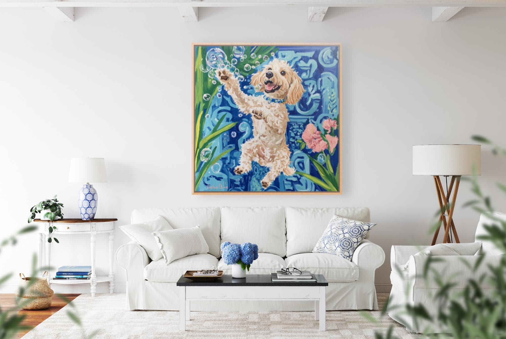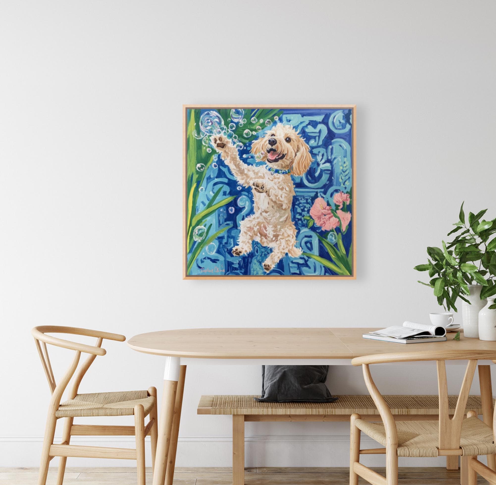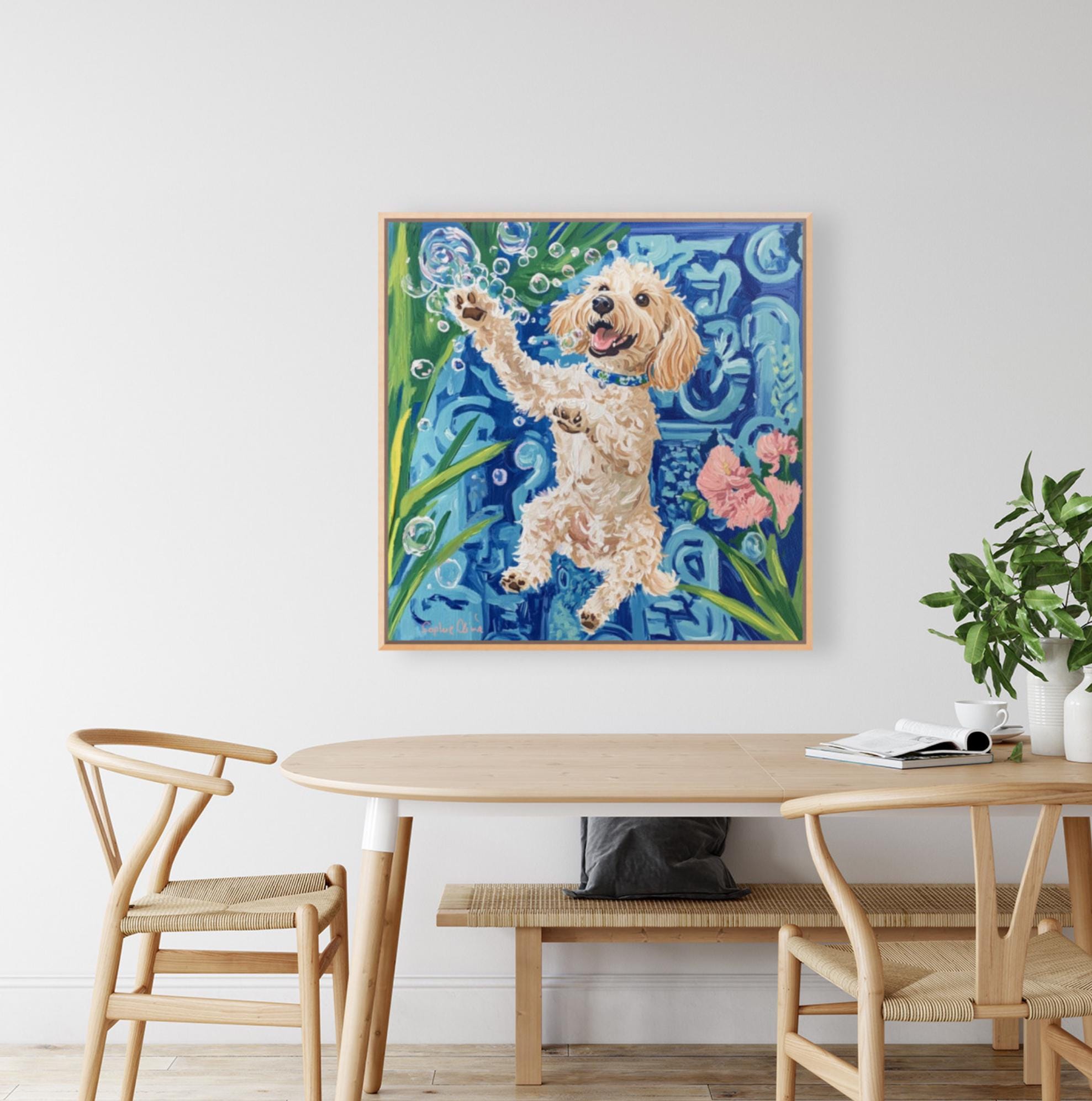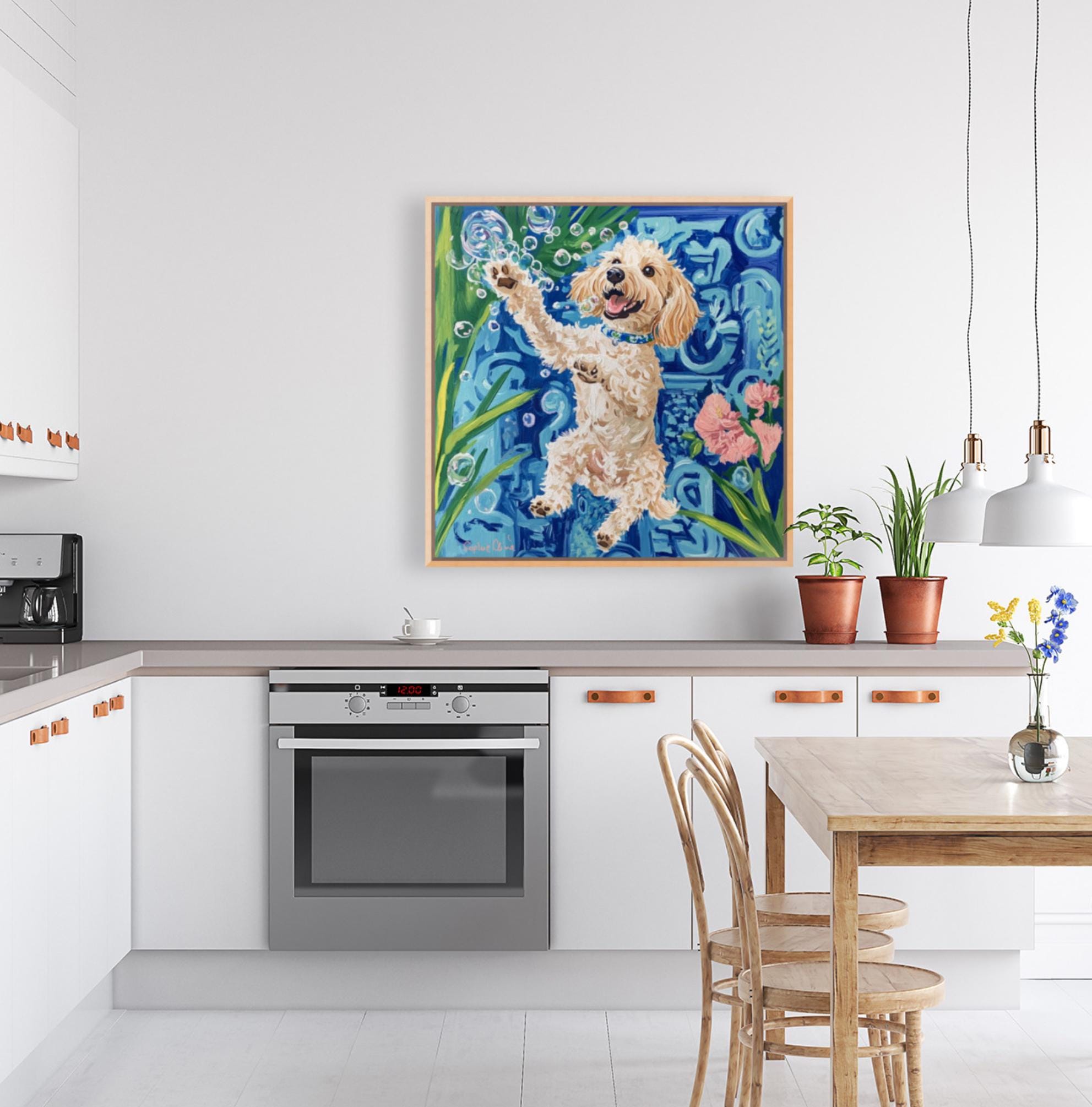 Grandmillennial art, Bubble Billy, whimsical Labradoodle art