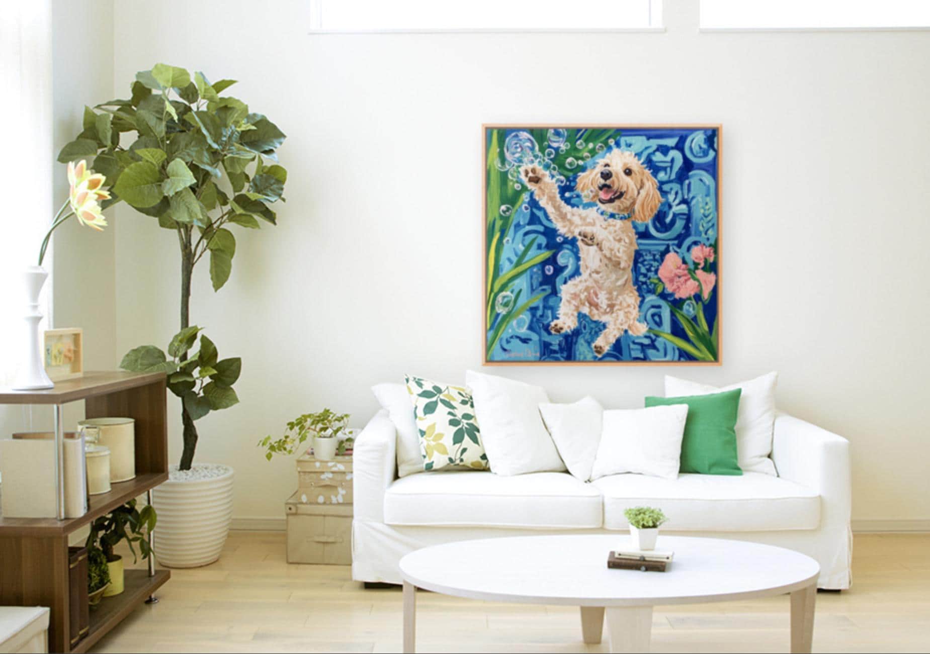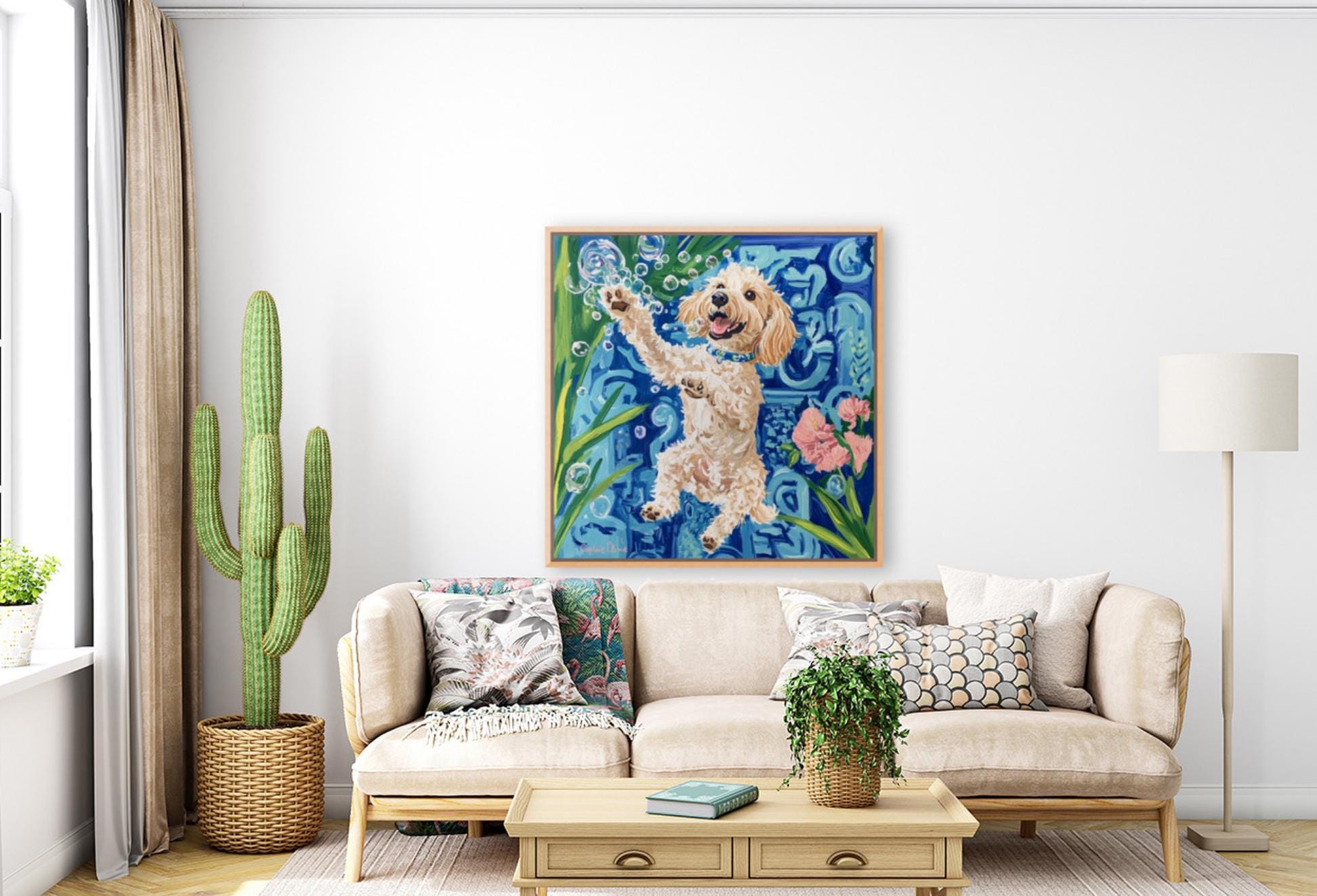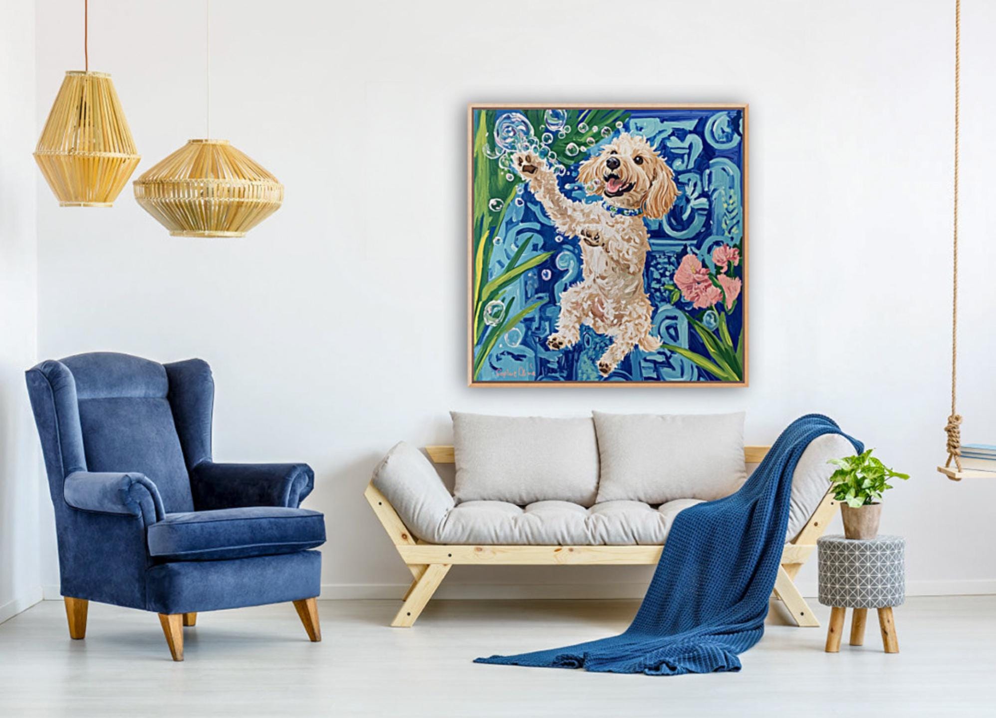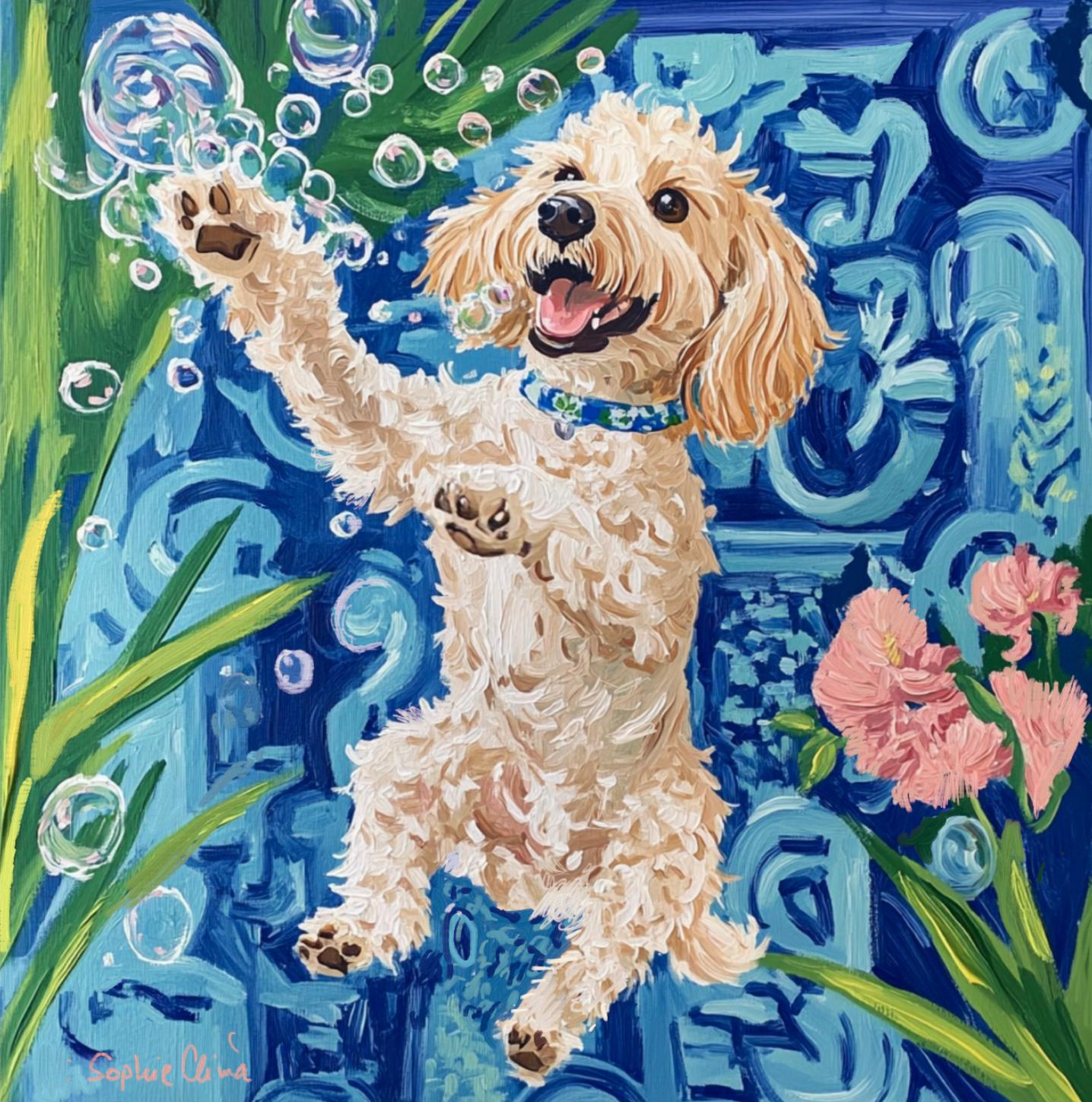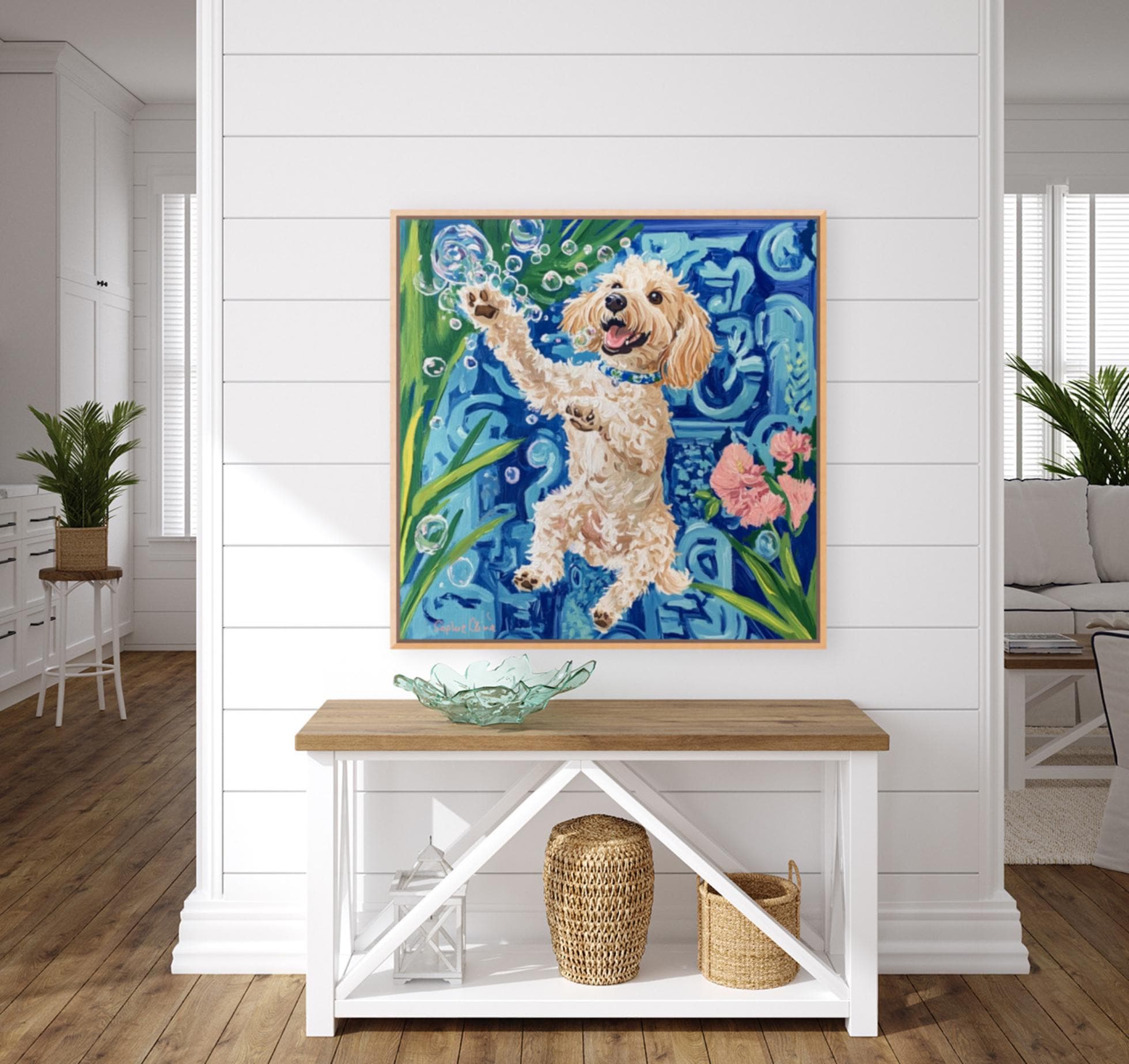 Grandmillennial art, Bubble Billy, whimsical Labradoodle art