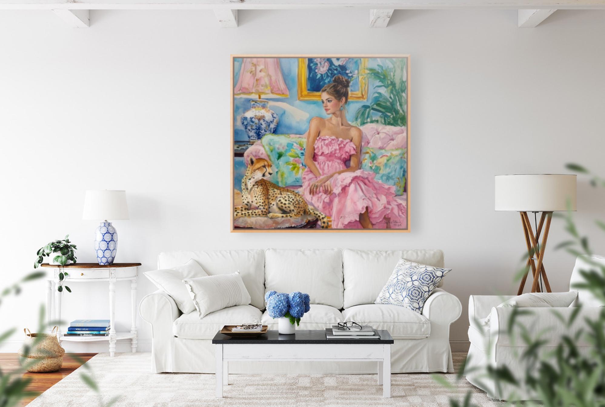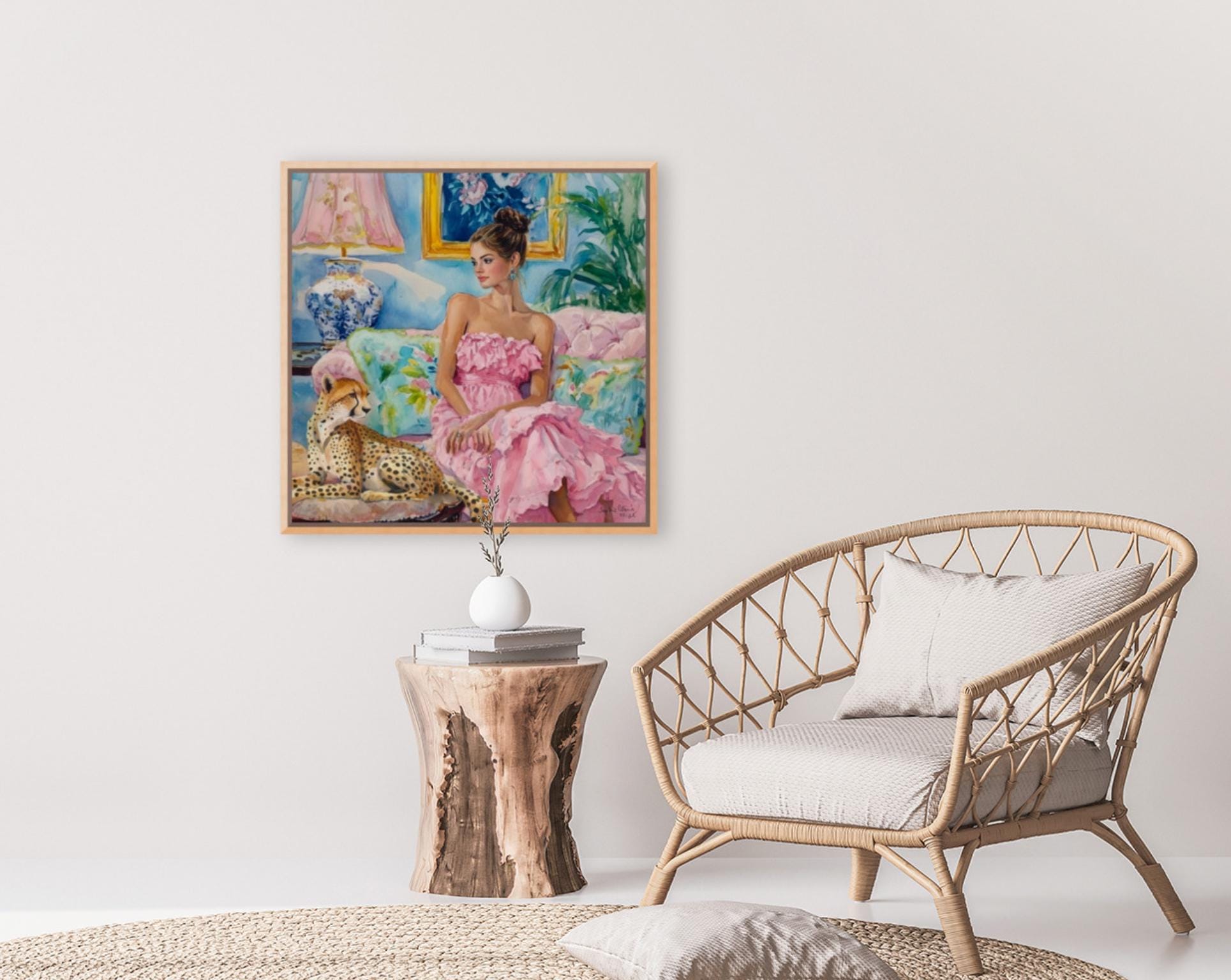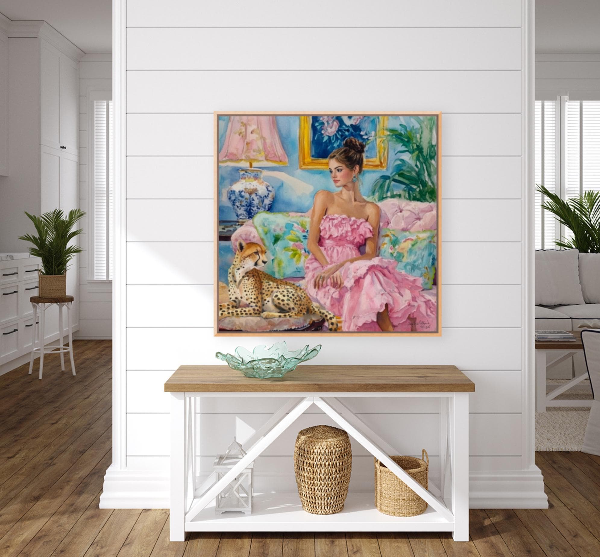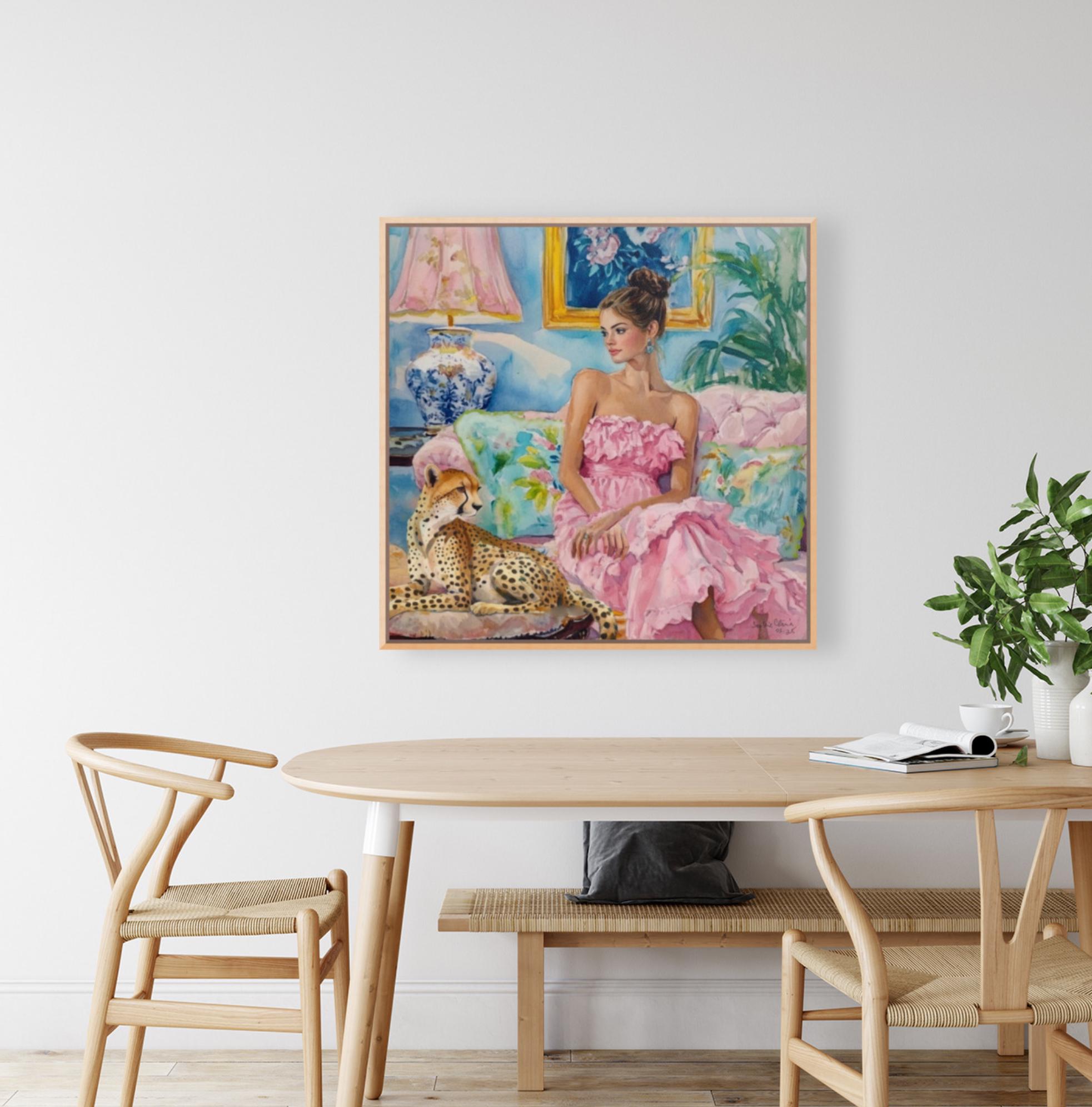 Grandmillennial art, Girl in pink dress with a sitting cheetah, whimsical watercolor art
